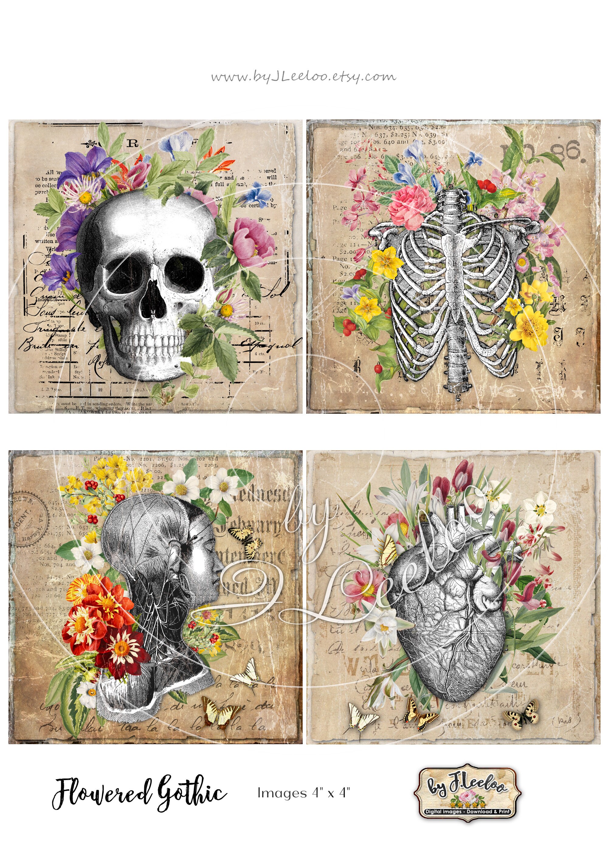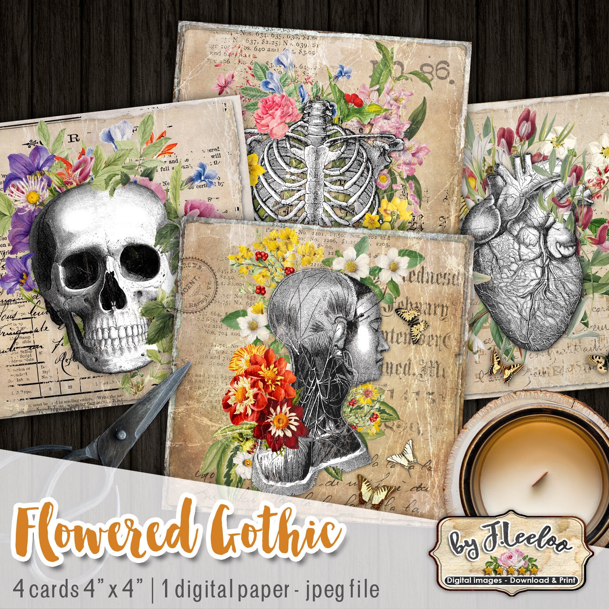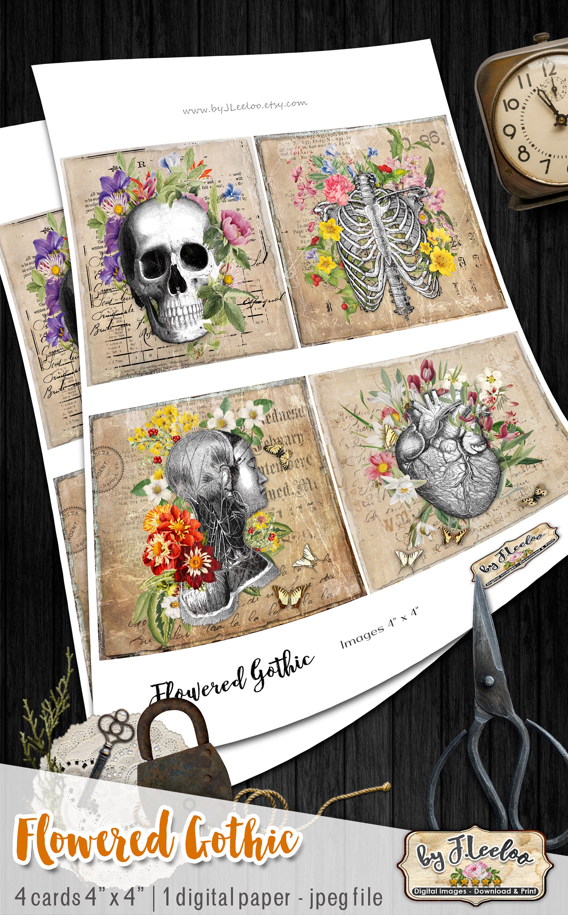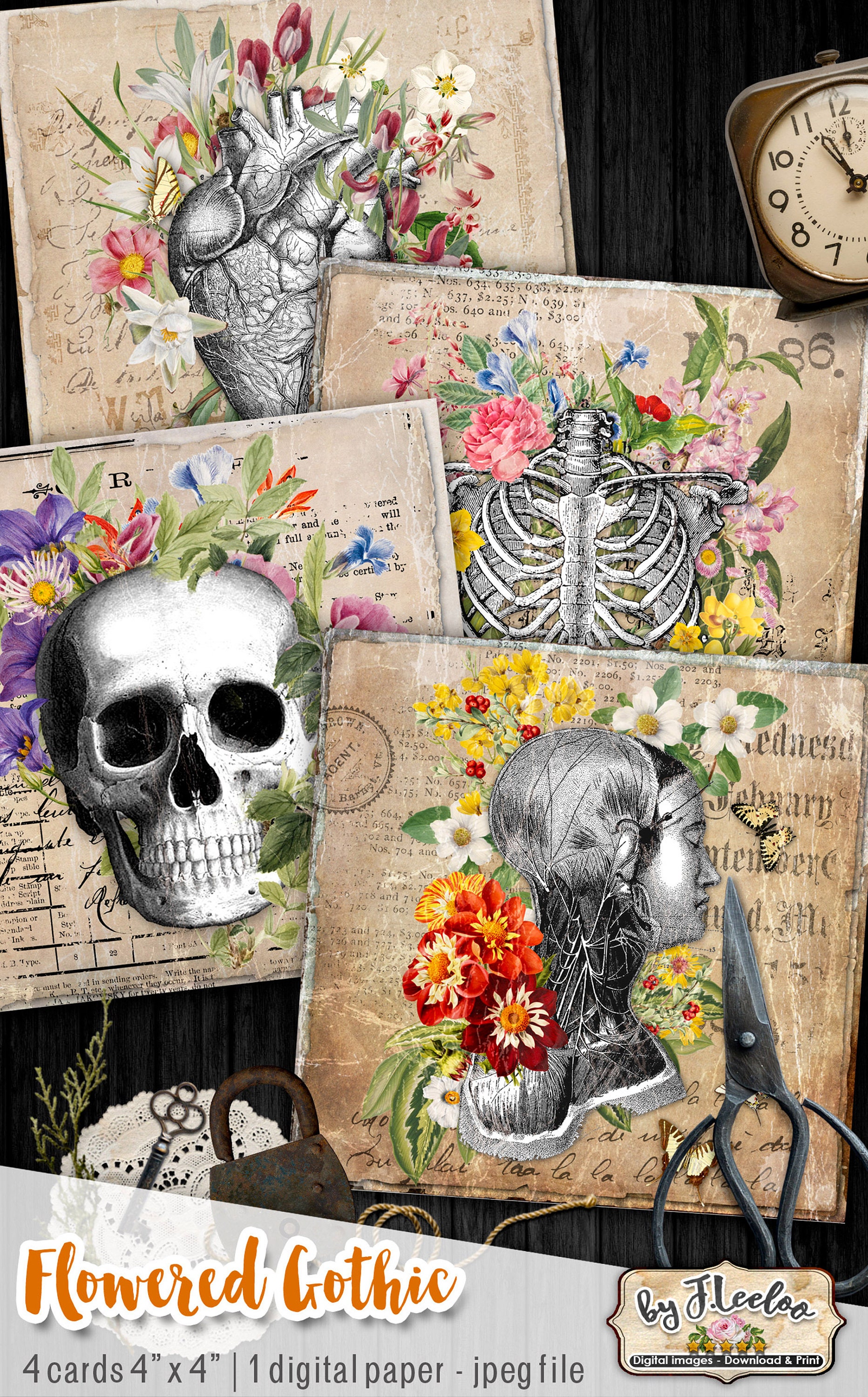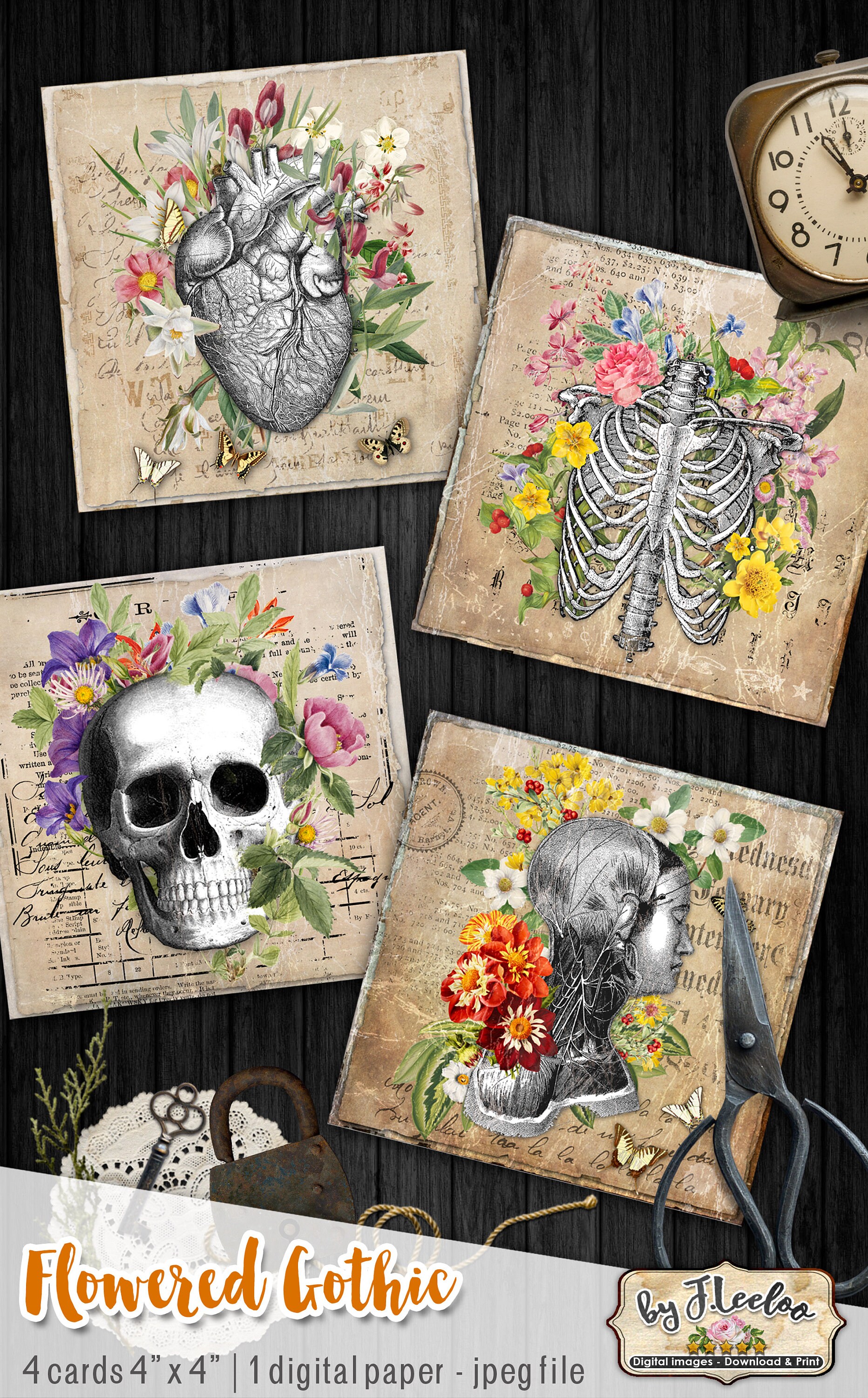 FLOWERED GOTHIC cards 4x4 inch victorian Halloween anatomy table Digital collage sheet coaster sticker hang tags for invite, labels, coaster, jewelry, glass cabochons, bottle caps, stickers, hang tags and all your artwork.