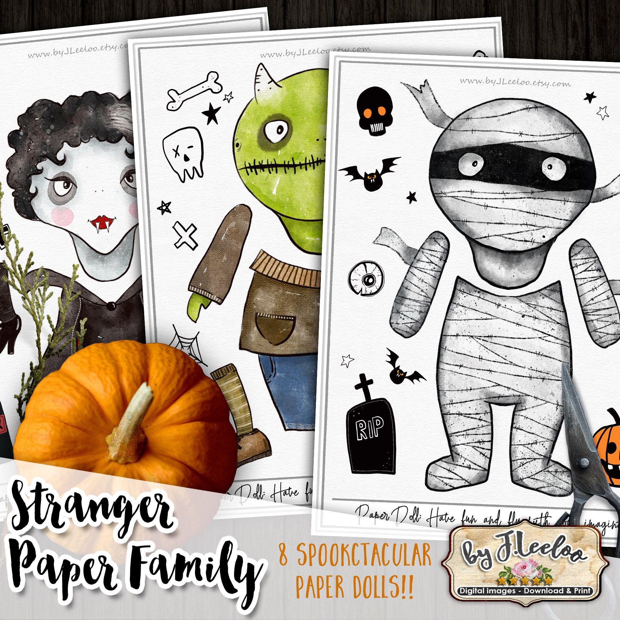 STRANGE PAPER FAMILY Halloween Paper Dolls HAND DRAWN Watercolors - Digital paper: printable halloween paper doll for your artwork and crafting project - Altered art, steampunk, scrapbook, vintage project etc... free your imagination!