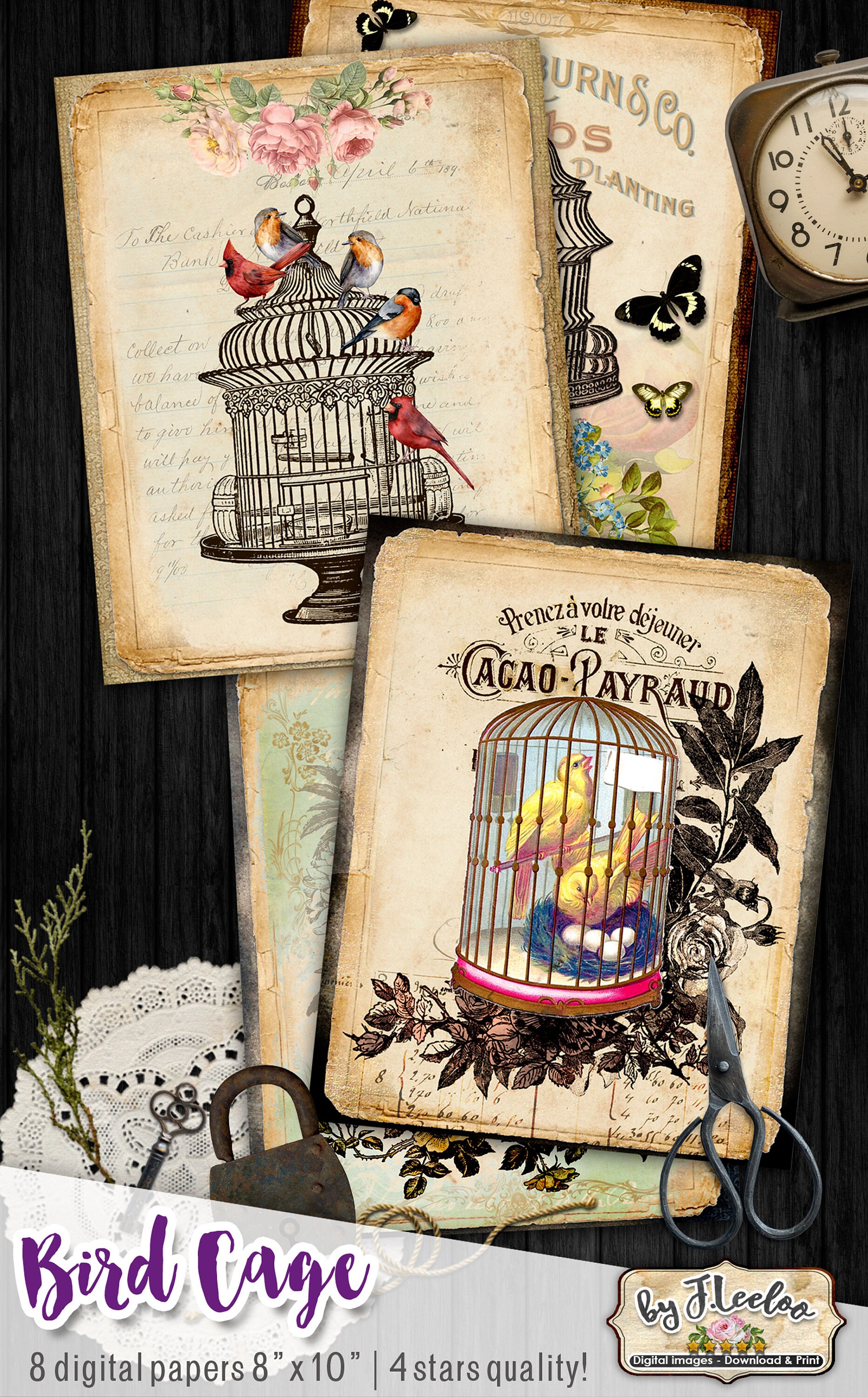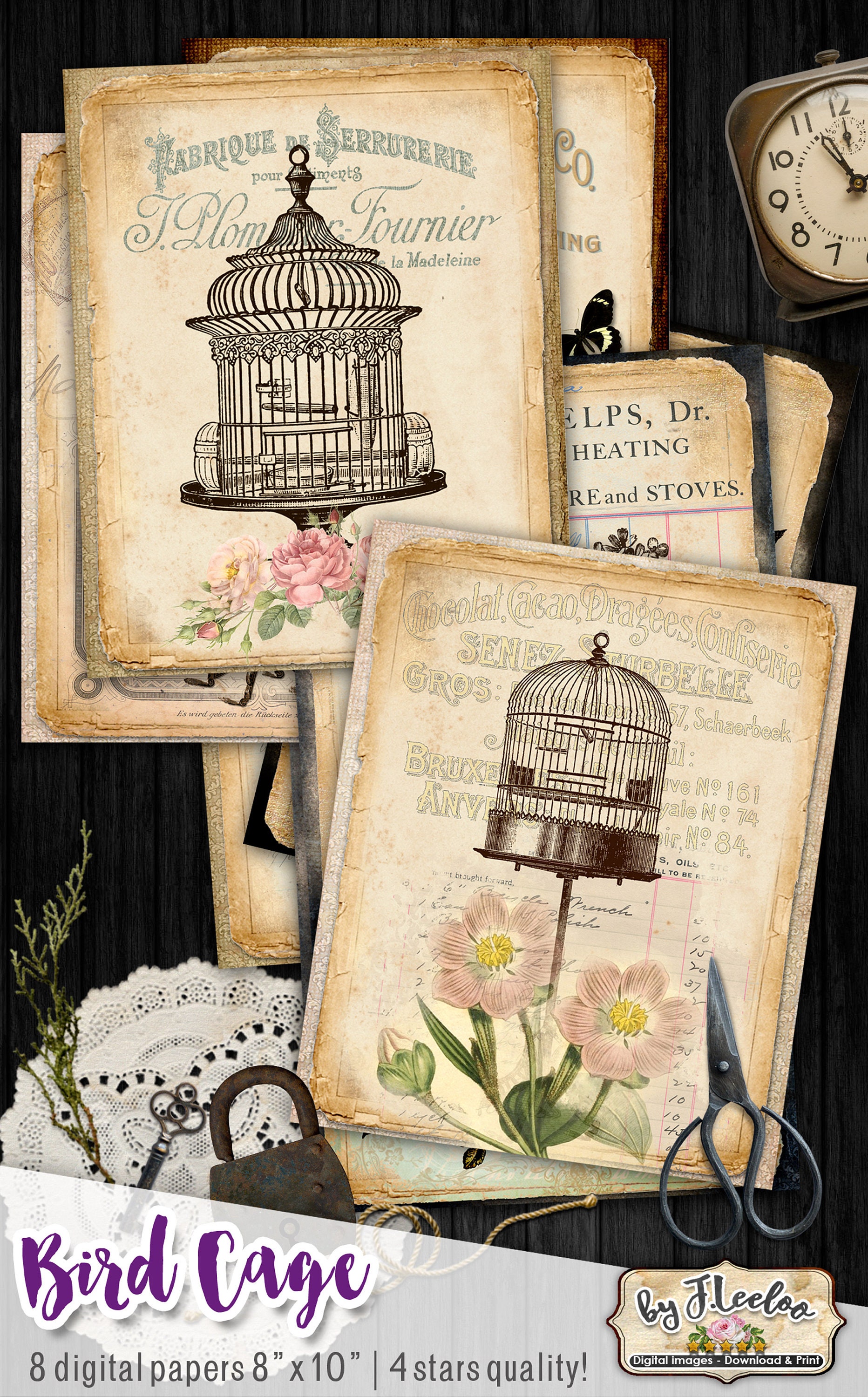 BIRD CAGE Digital collage sheet - Victorian Vintage digital papers: images for your diary, artwork, postcards, hang tags, invitations, greeting cards, announcements, scrapbook, backing cards.... all for your crafting project!