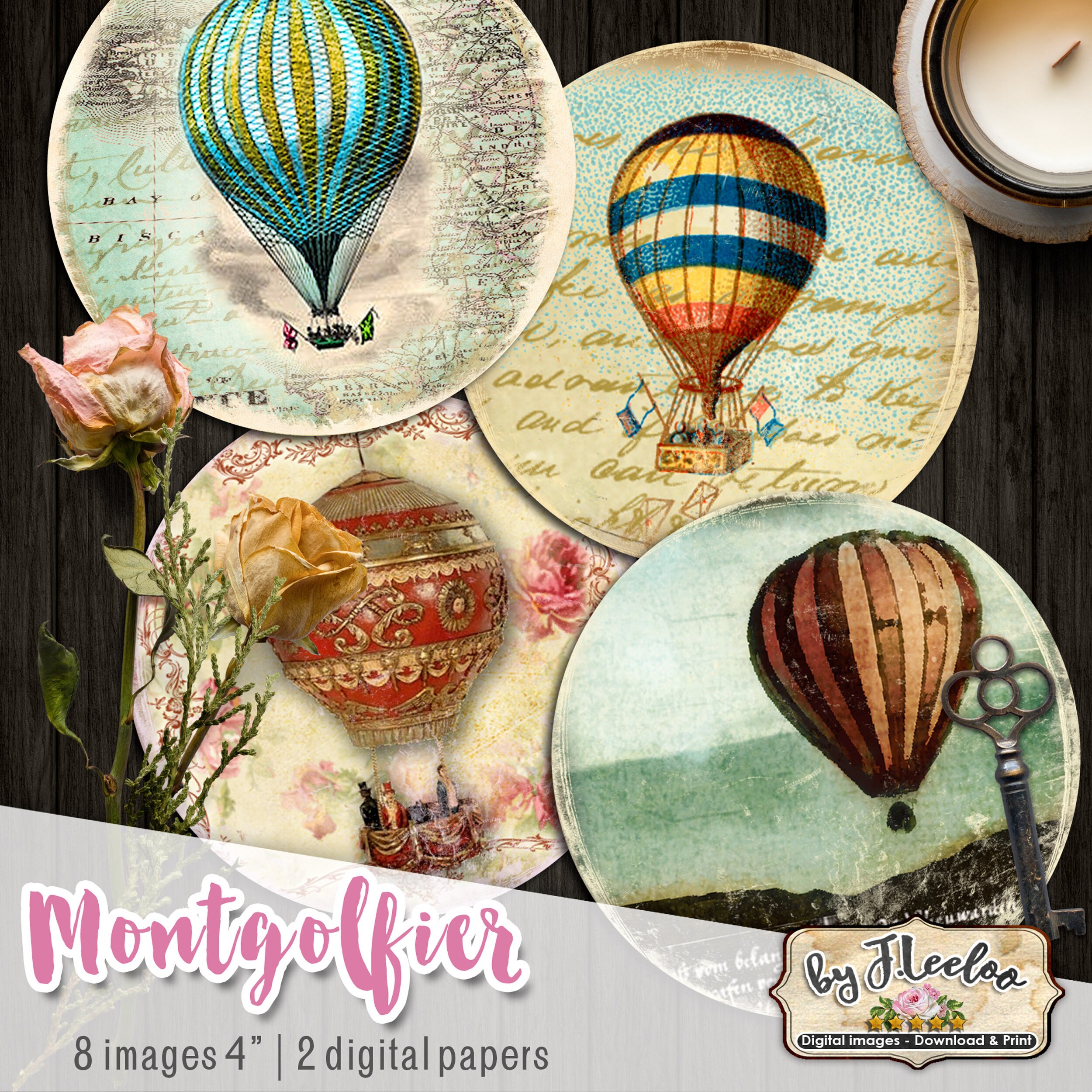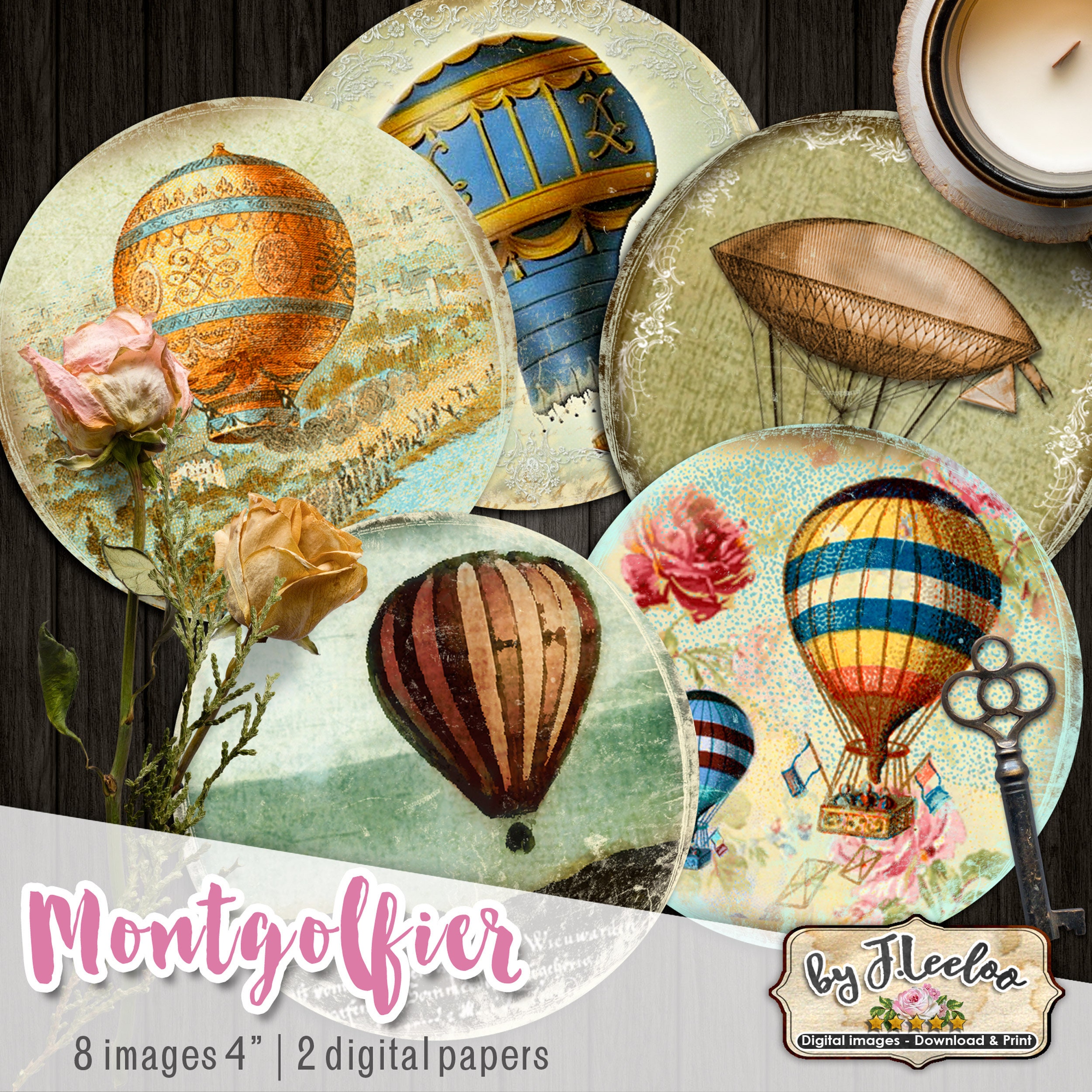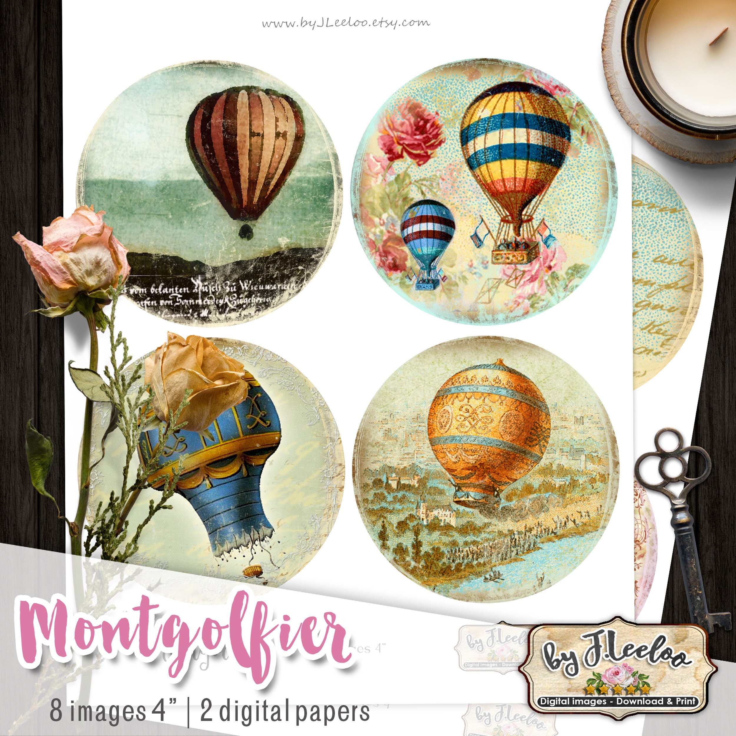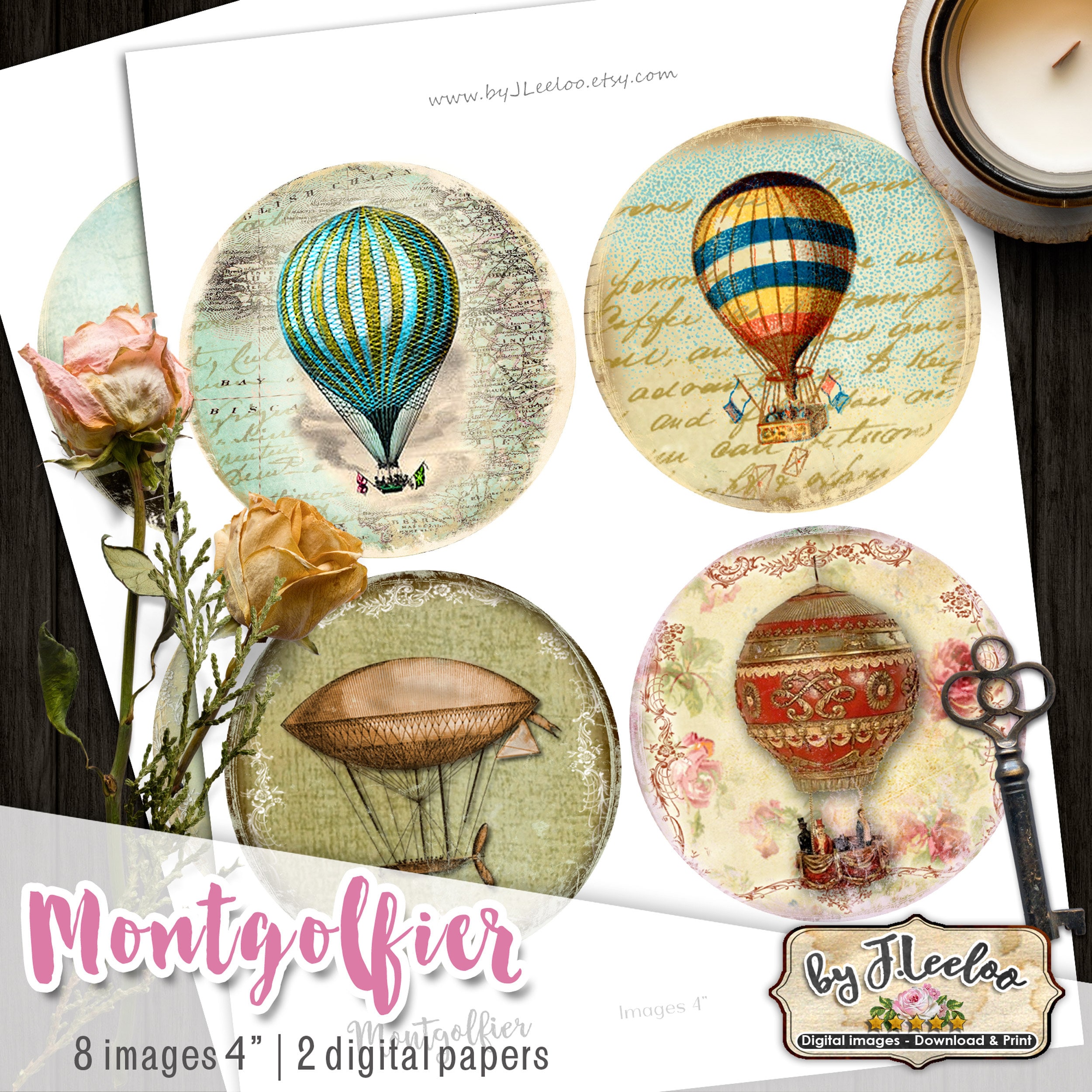 MONGOLFIER Instant Download - Digital collage sheets - Round printable images for coaster, jewelry, glass cabochons, bottle caps, stickers, hang tags and all your artwork.