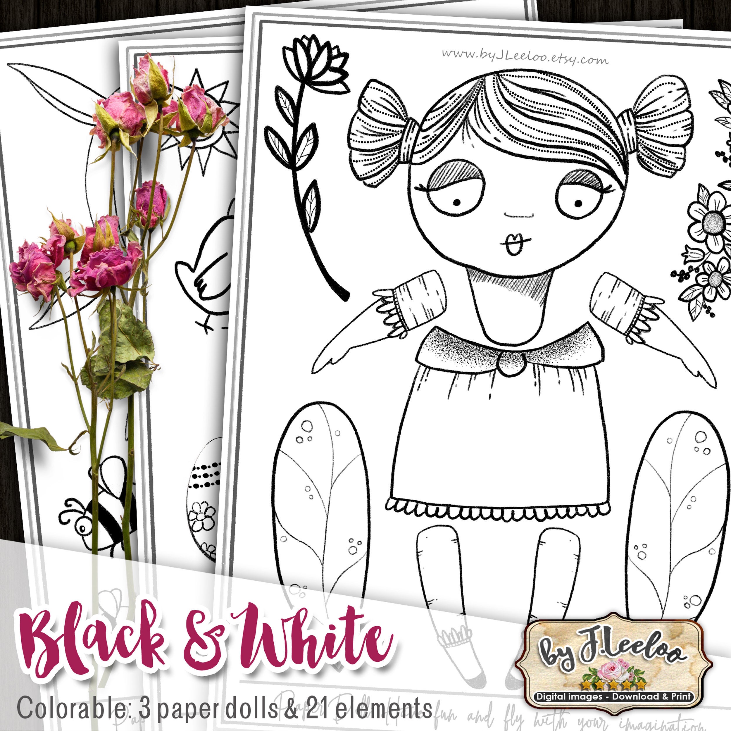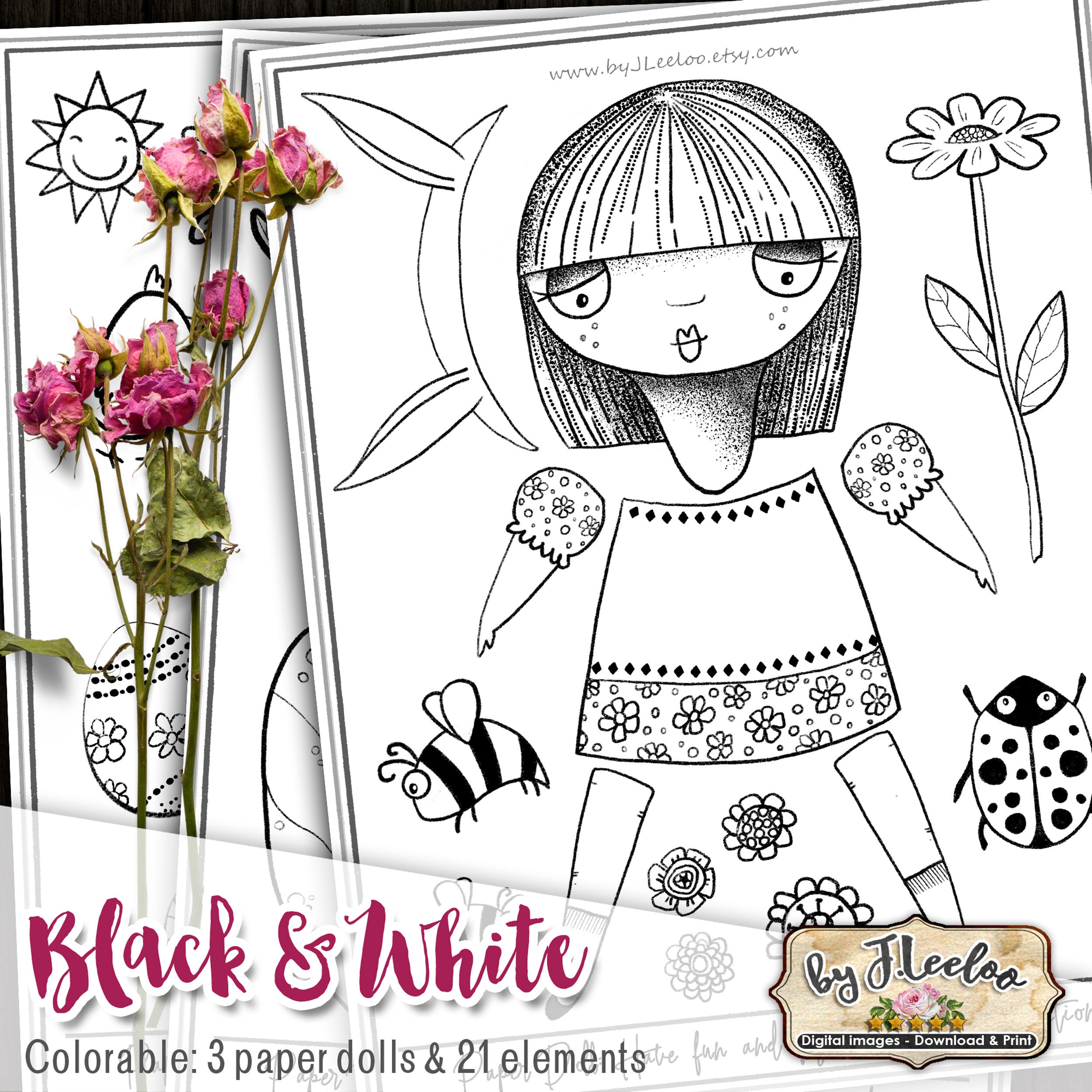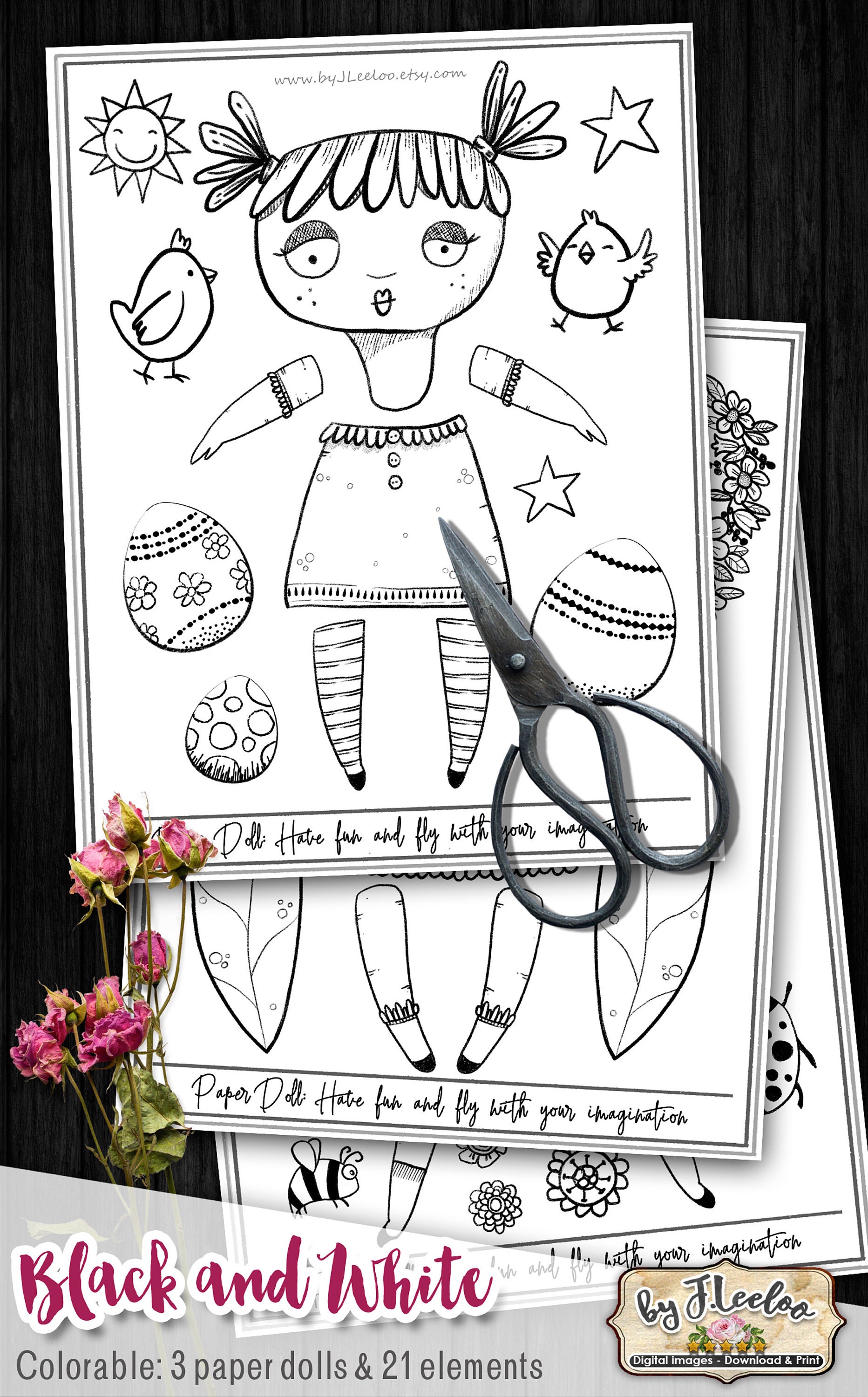 BLACK & WHITE Coloring Digital collage sheet doll - Digital Easter papers: coloring paper doll for kids and for your artwork and crafting project - Altered art, steampunk, scrpbook, vintage project etc... free your imagination!