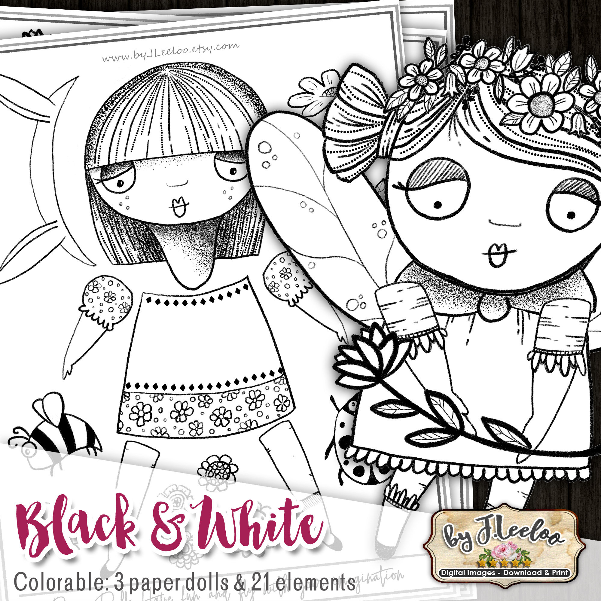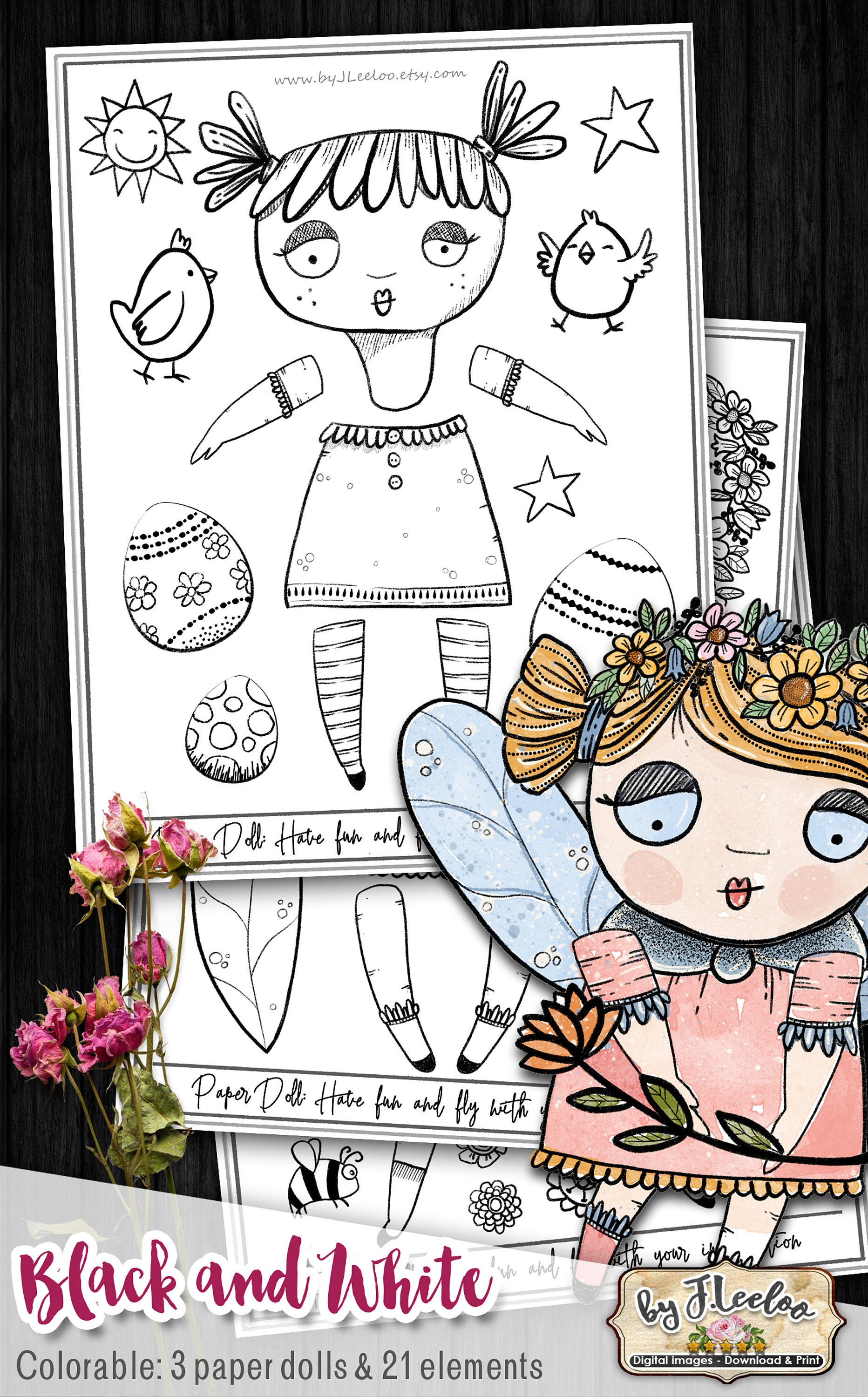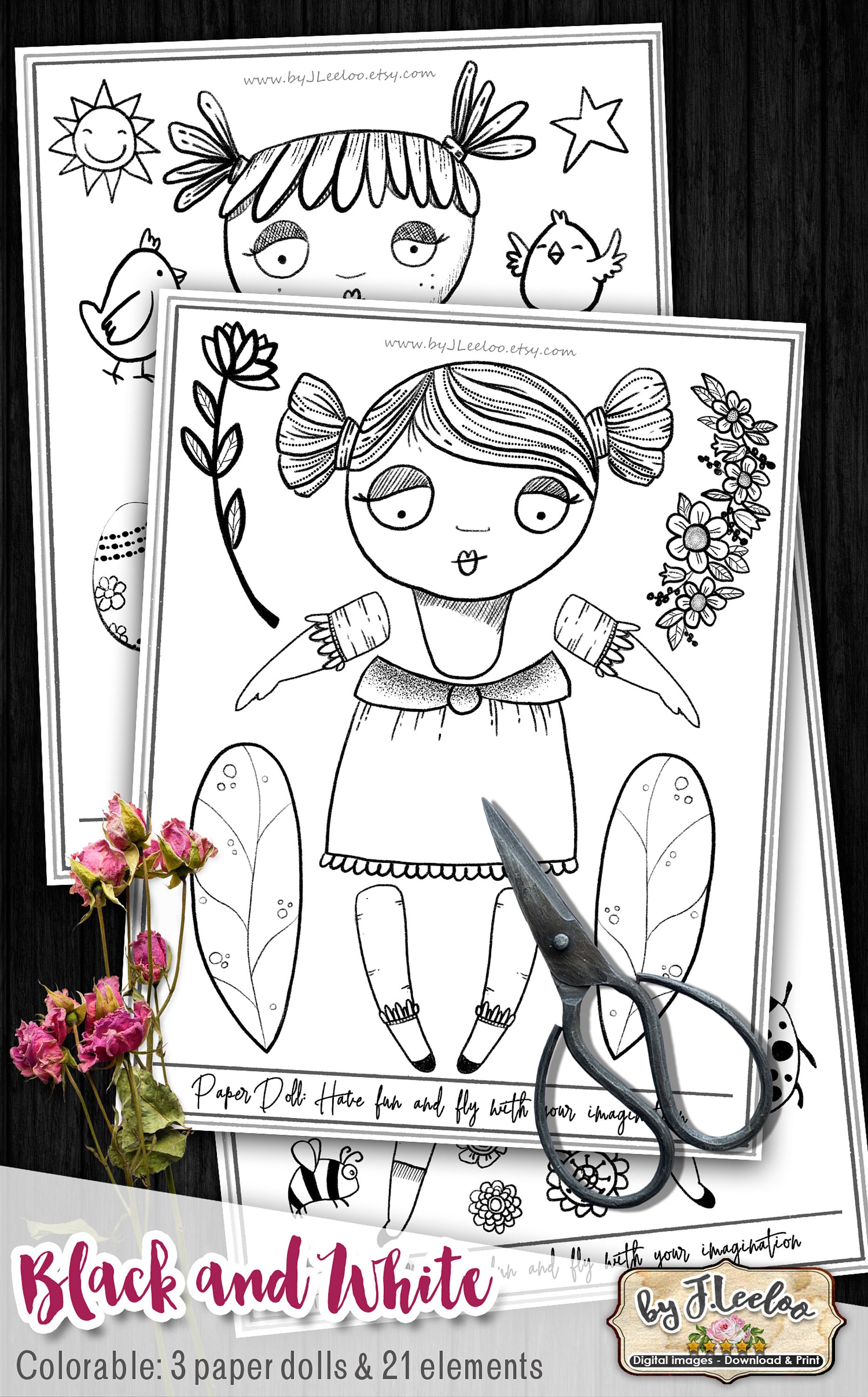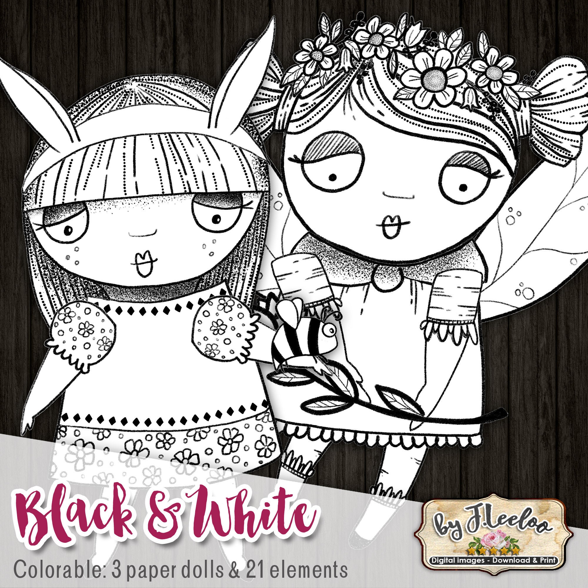 BLACK & WHITE Coloring Digital collage sheet doll - Digital Easter papers: coloring paper doll for kids and for your artwork and crafting project - Altered art, steampunk, scrpbook, vintage project etc... free your imagination!