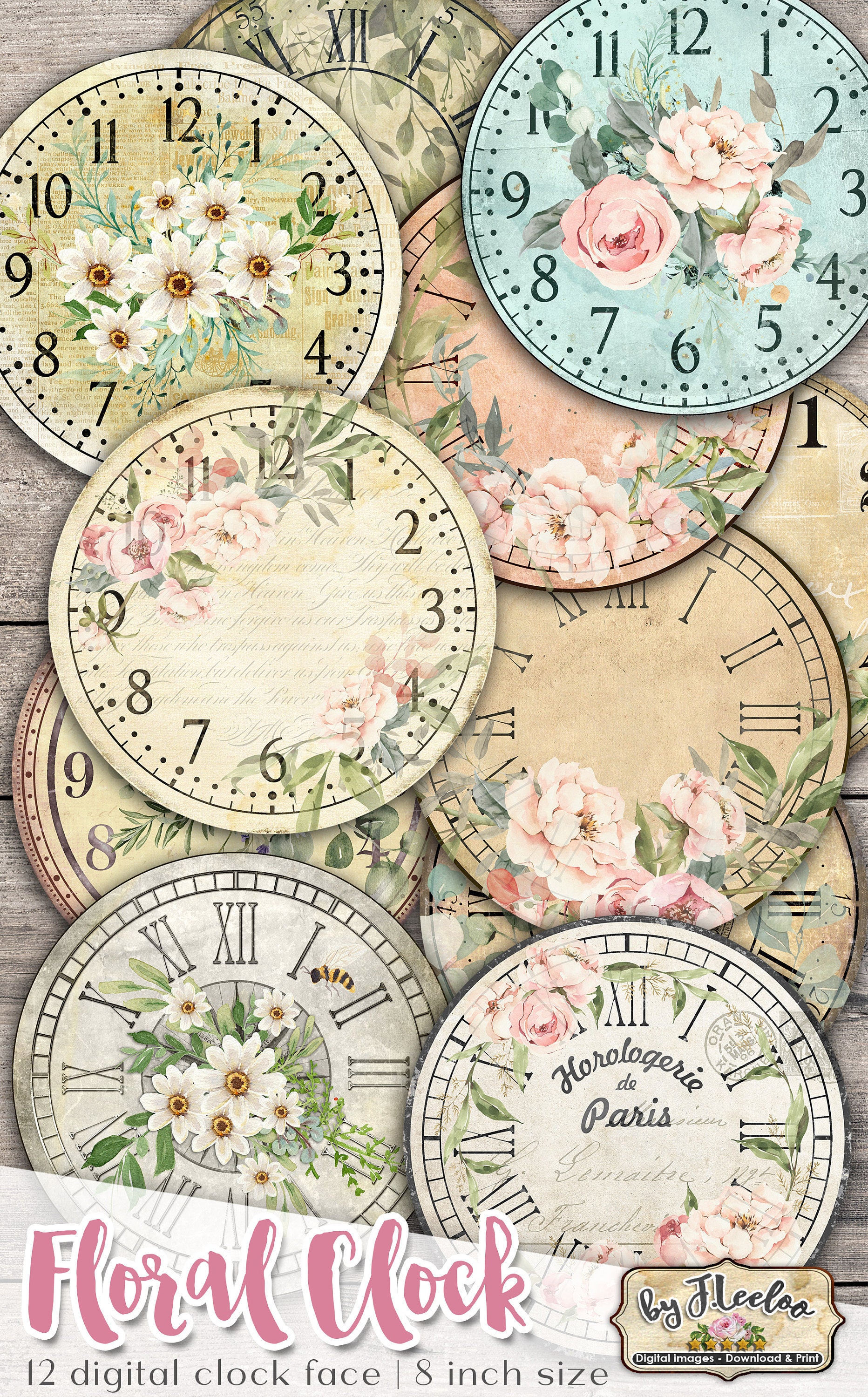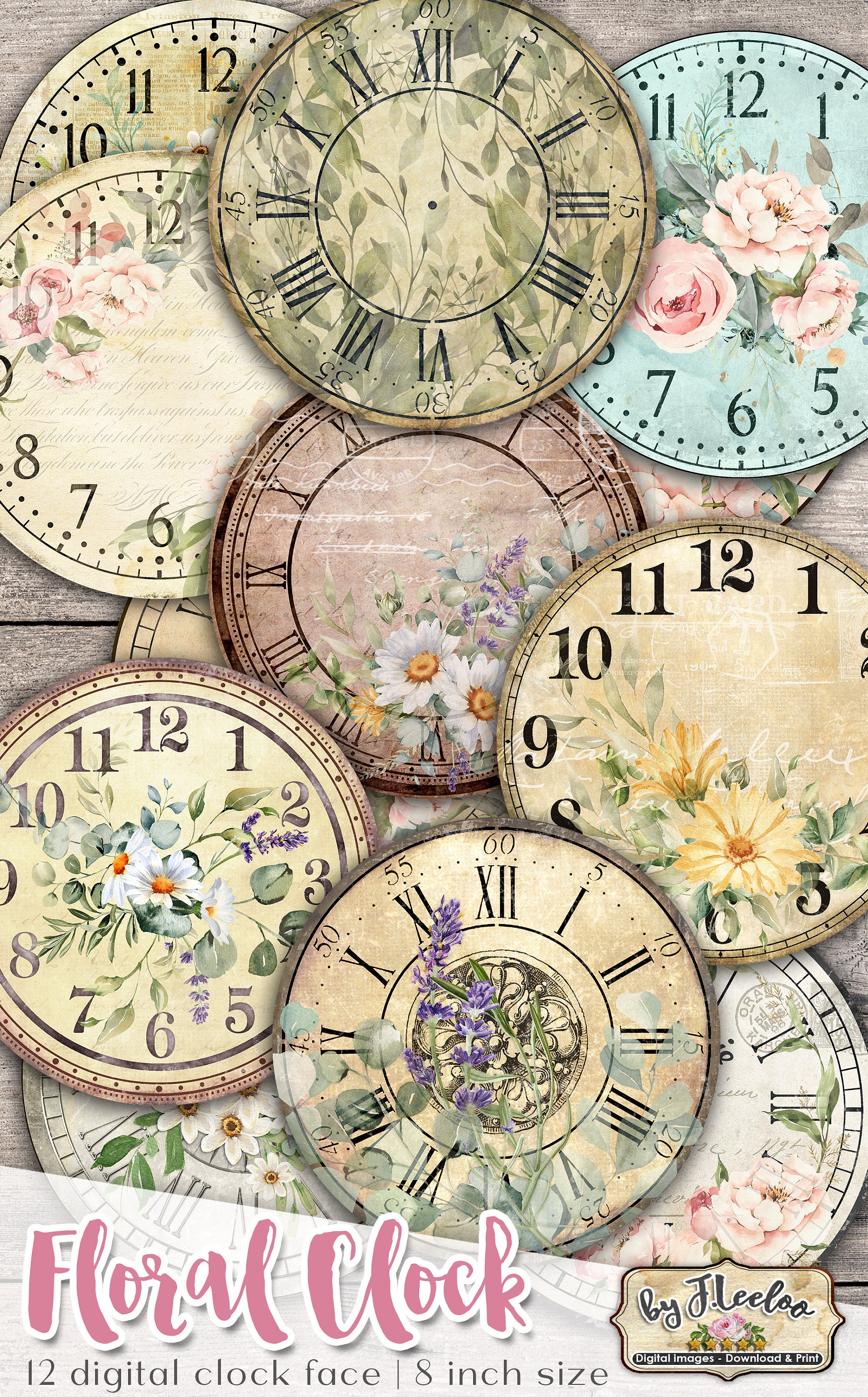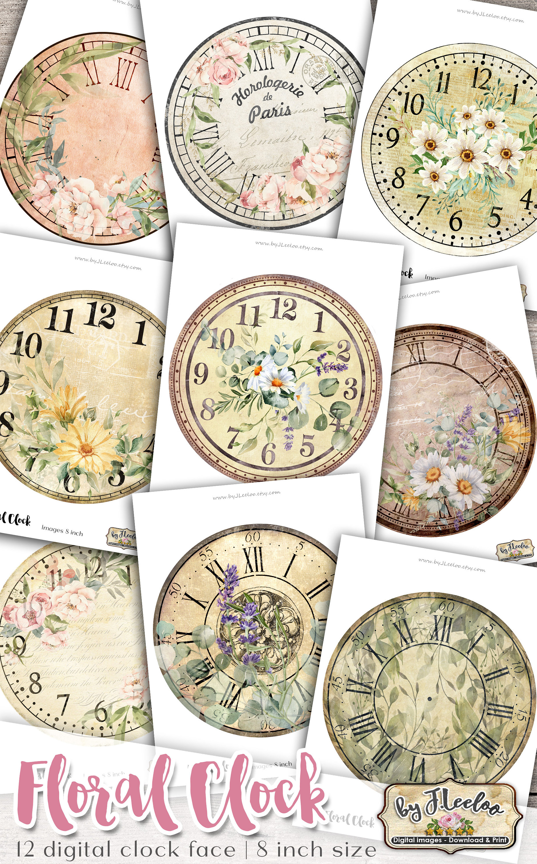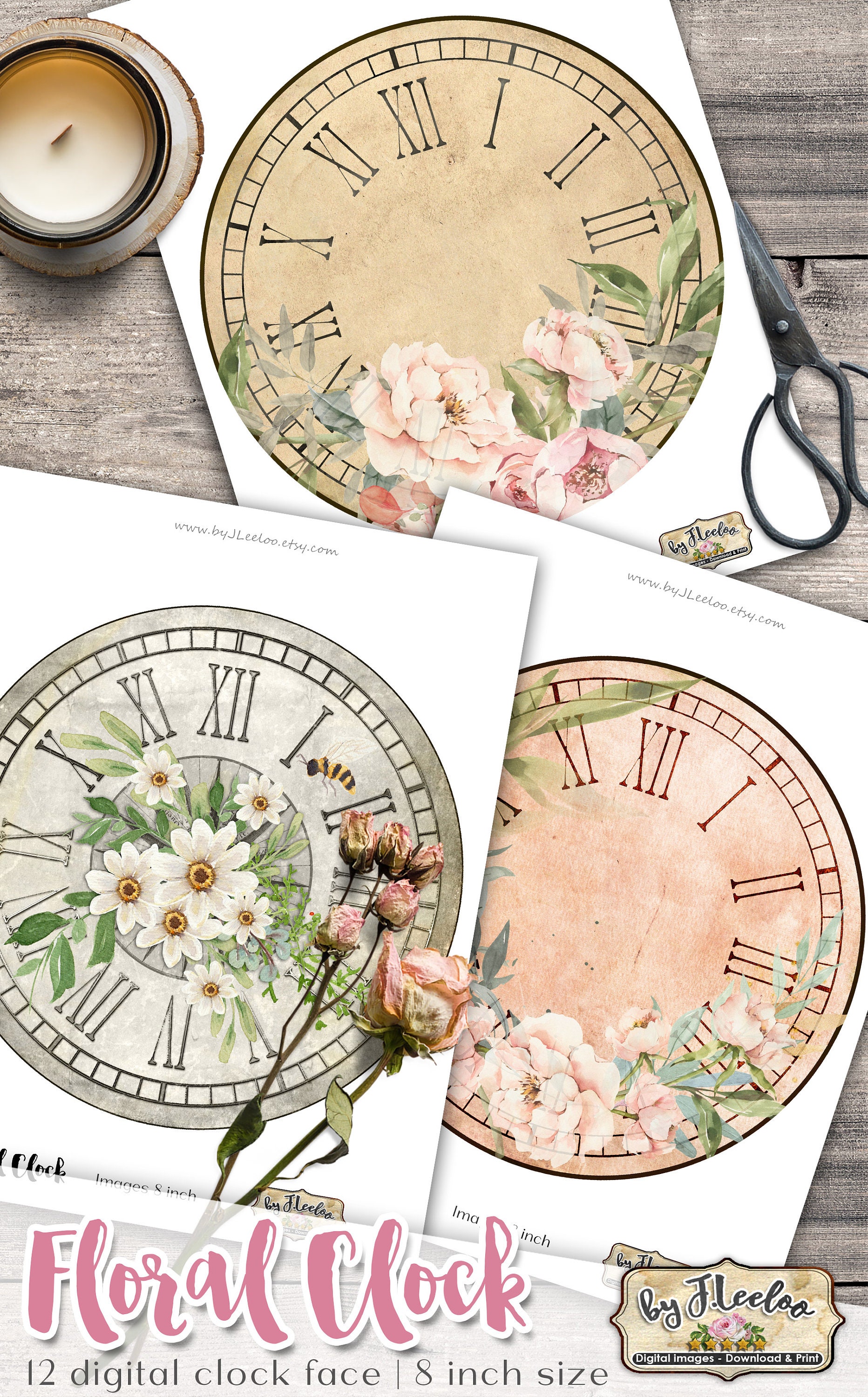 FLORAL CLOCK Digital printable collage sheets - Clock face large images instant download ready to print for home decor, magnets, stickers, scrapbook and your others craft project.