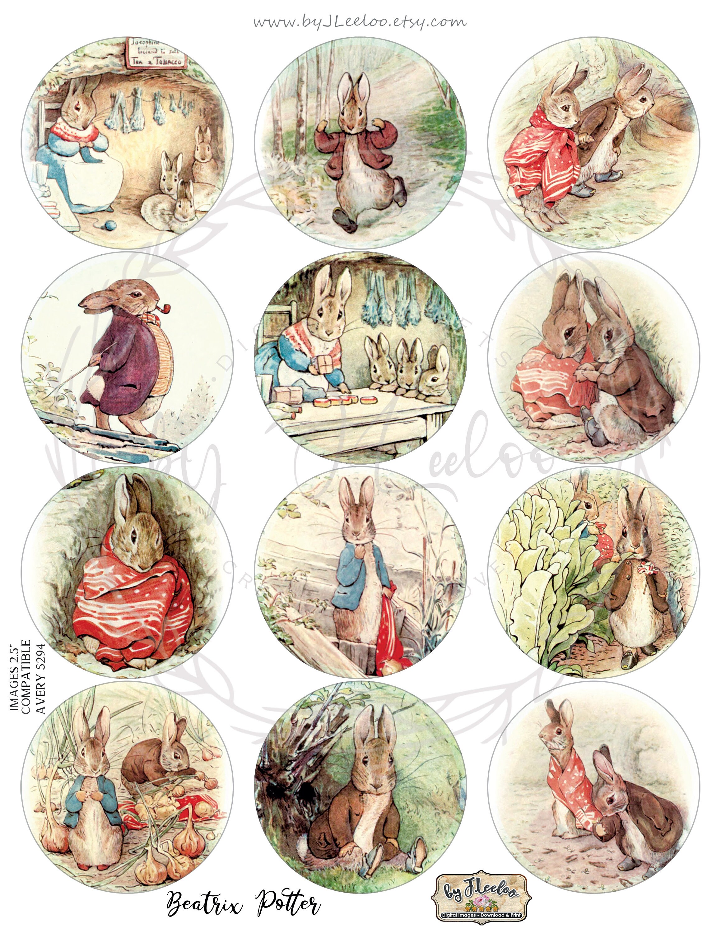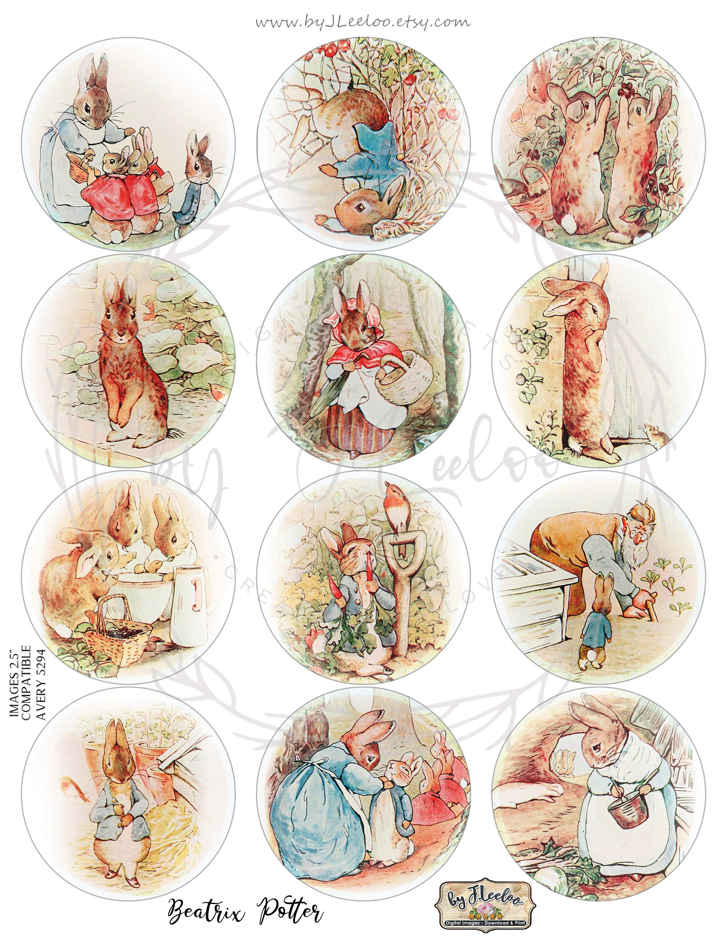BEATRIX POTTER - 2.5 inch circle printable clocks bottle caps stickers for pendants magnets coaster graphic digital collage sheet