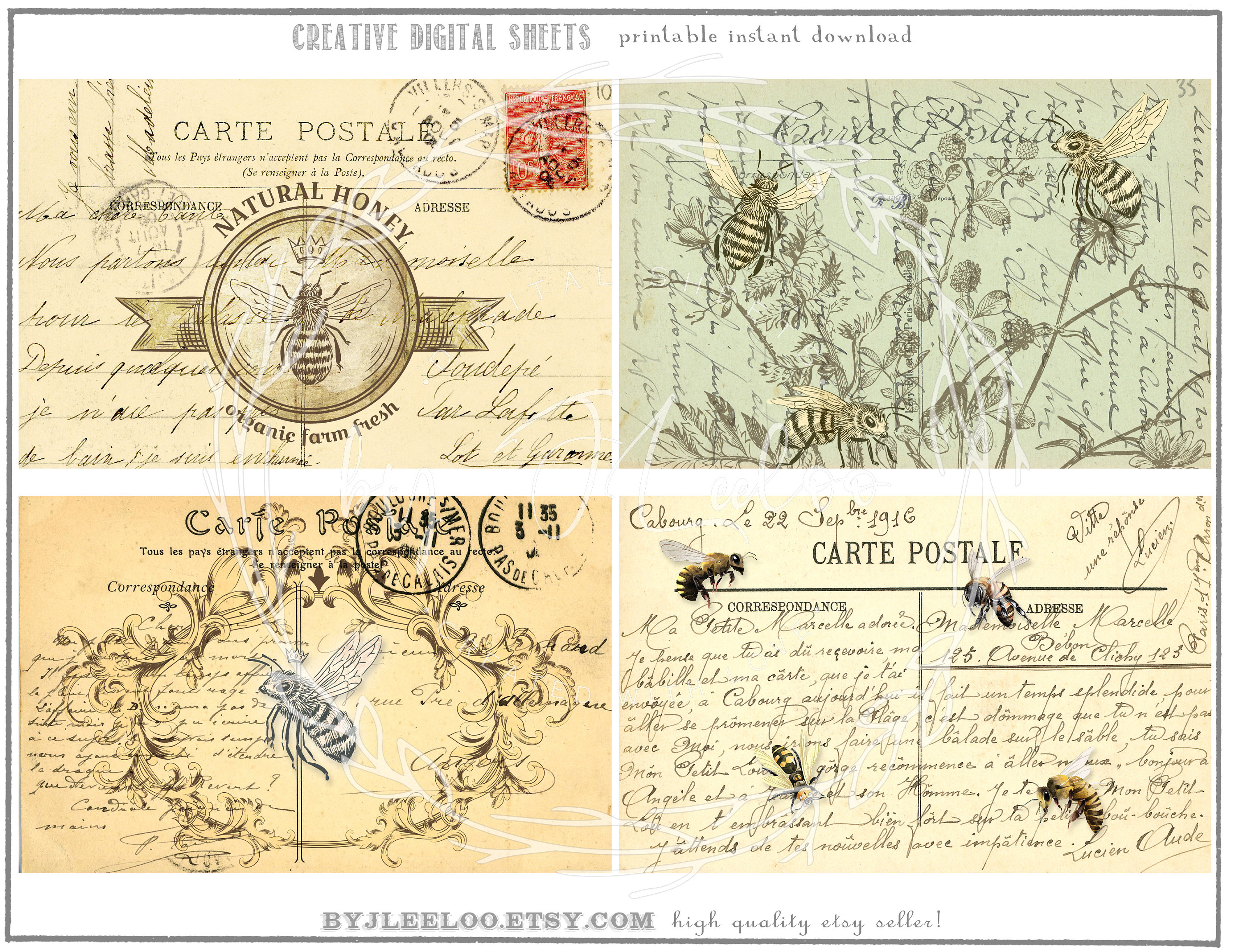 BEE POSTCARD crafting collage sheet printable paper for ATC card digital hang tags invitations greeting cards annuncements scrapbook backing cards.... all for your crafting project!