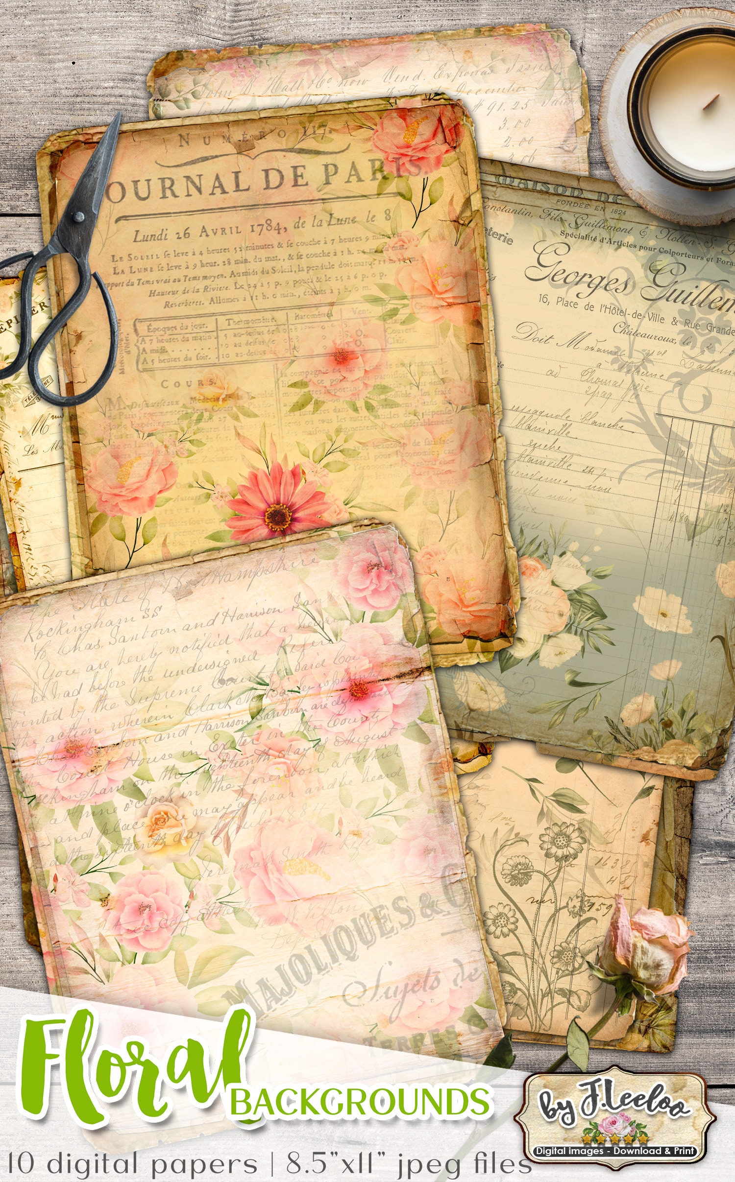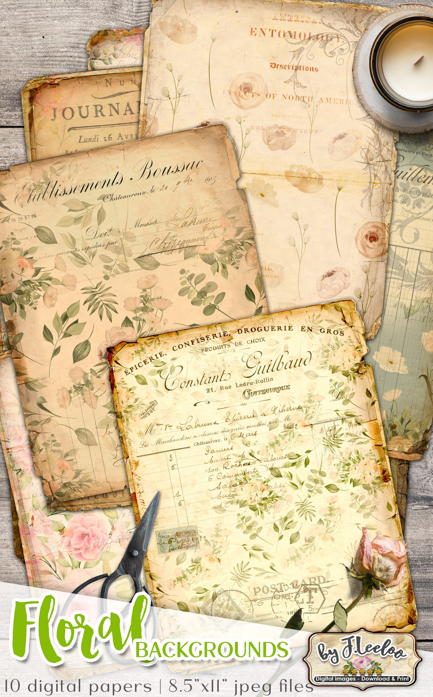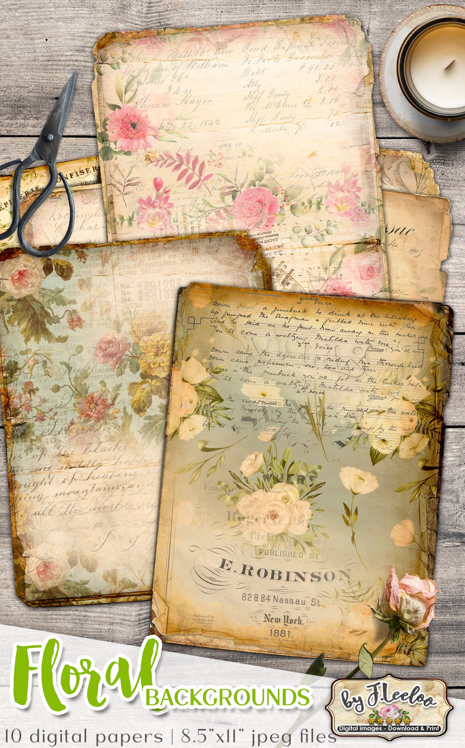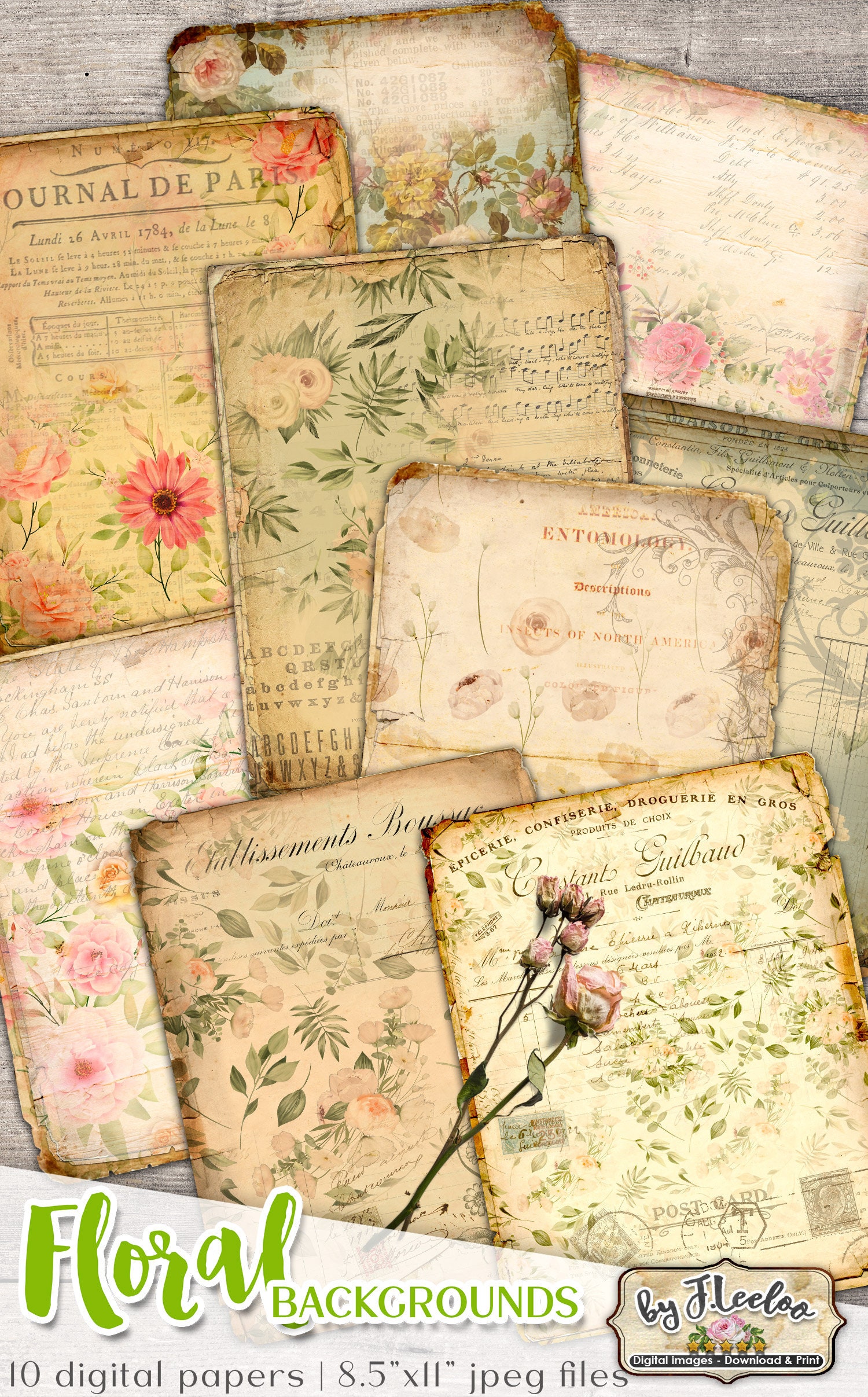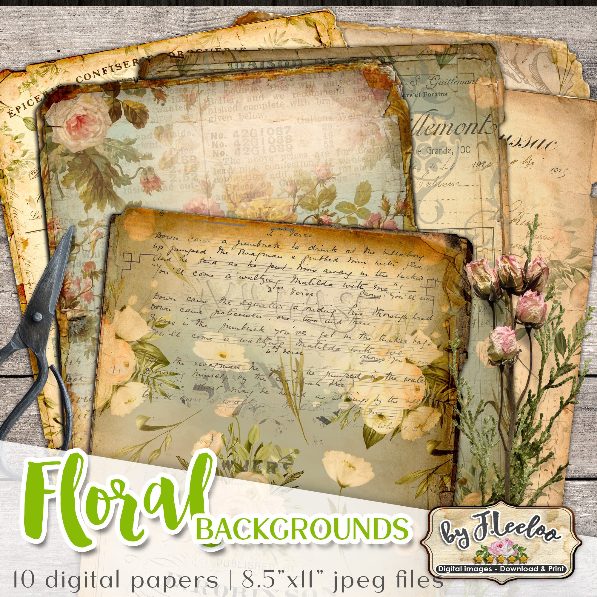 FLORAL BACKGROUNDS Digital Vintage Ephemera for Junk Journals - Grunge Floral Ephemera - Digital Floral Papers Download for your crafting projects: scrapbook, background, diary, iron-on transfer, card making.... print it as many time as you want.