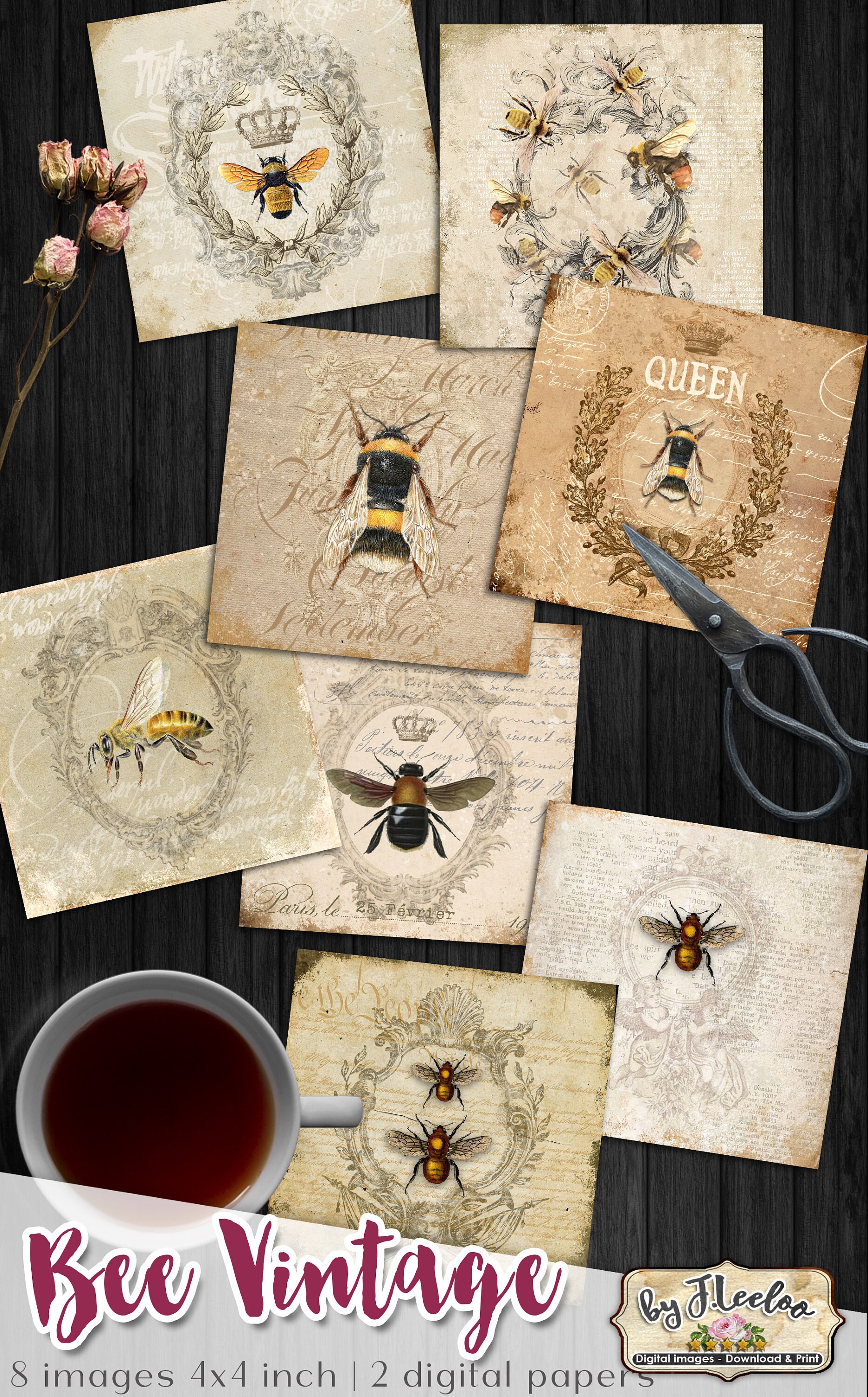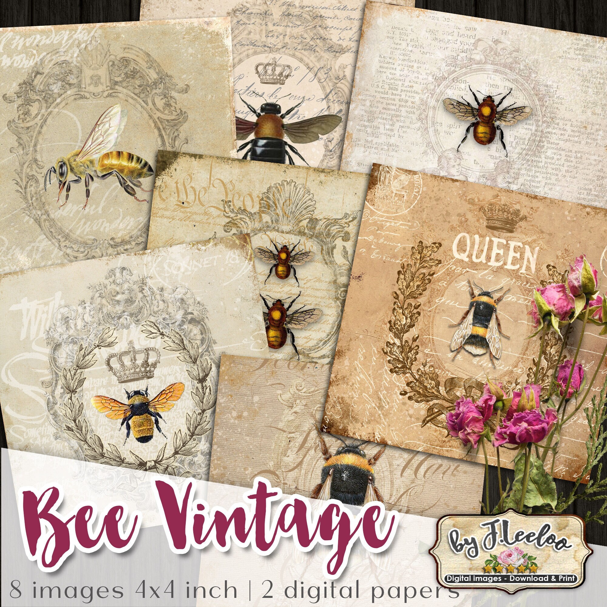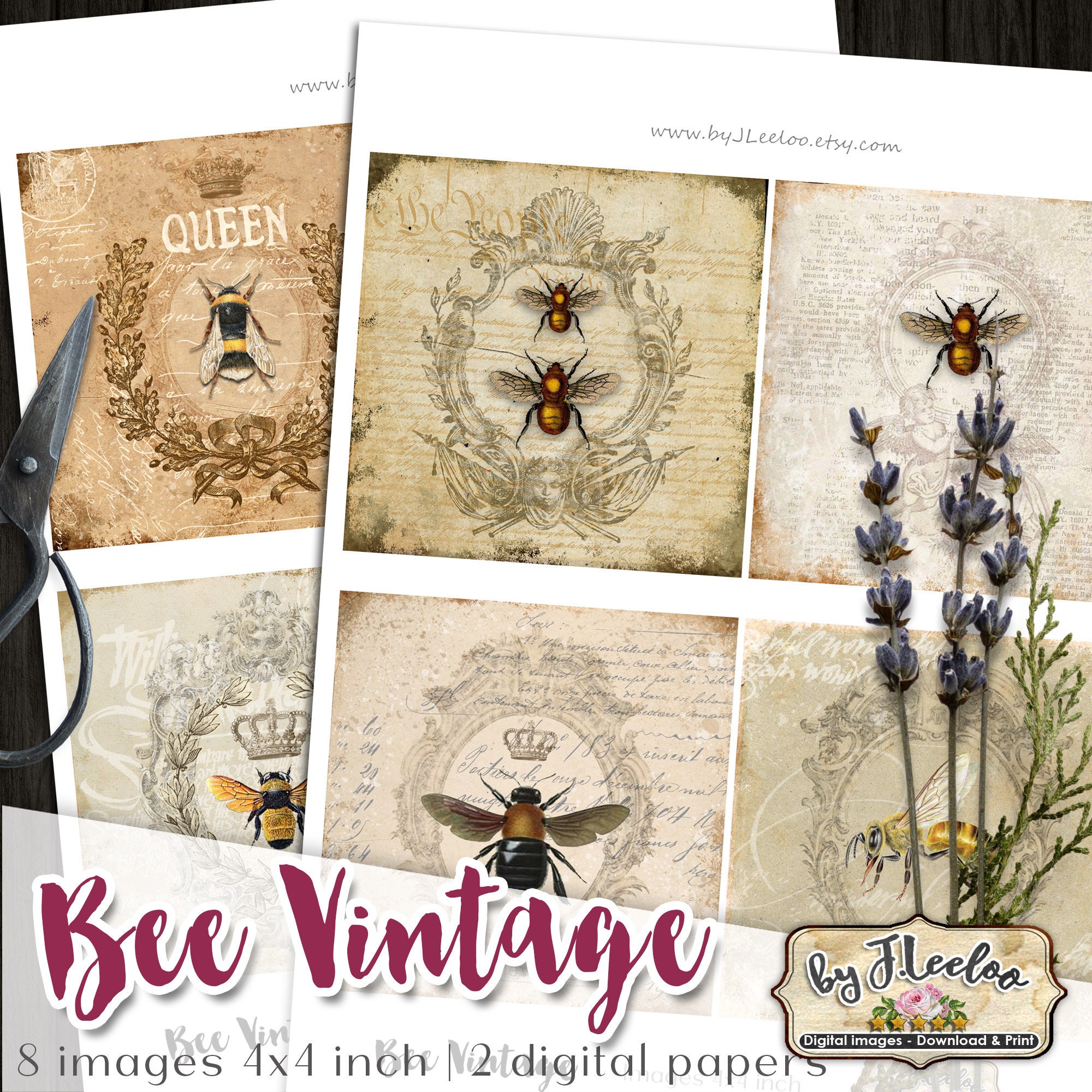 BEE VINTAGE Digital collage sheets - Square images instant download ready to print for coaster, thank you cards or hang tags, your jewelry making, resin pendants, rings, earrings and button, for magnets, stickers, scrapbook and your others craft project.