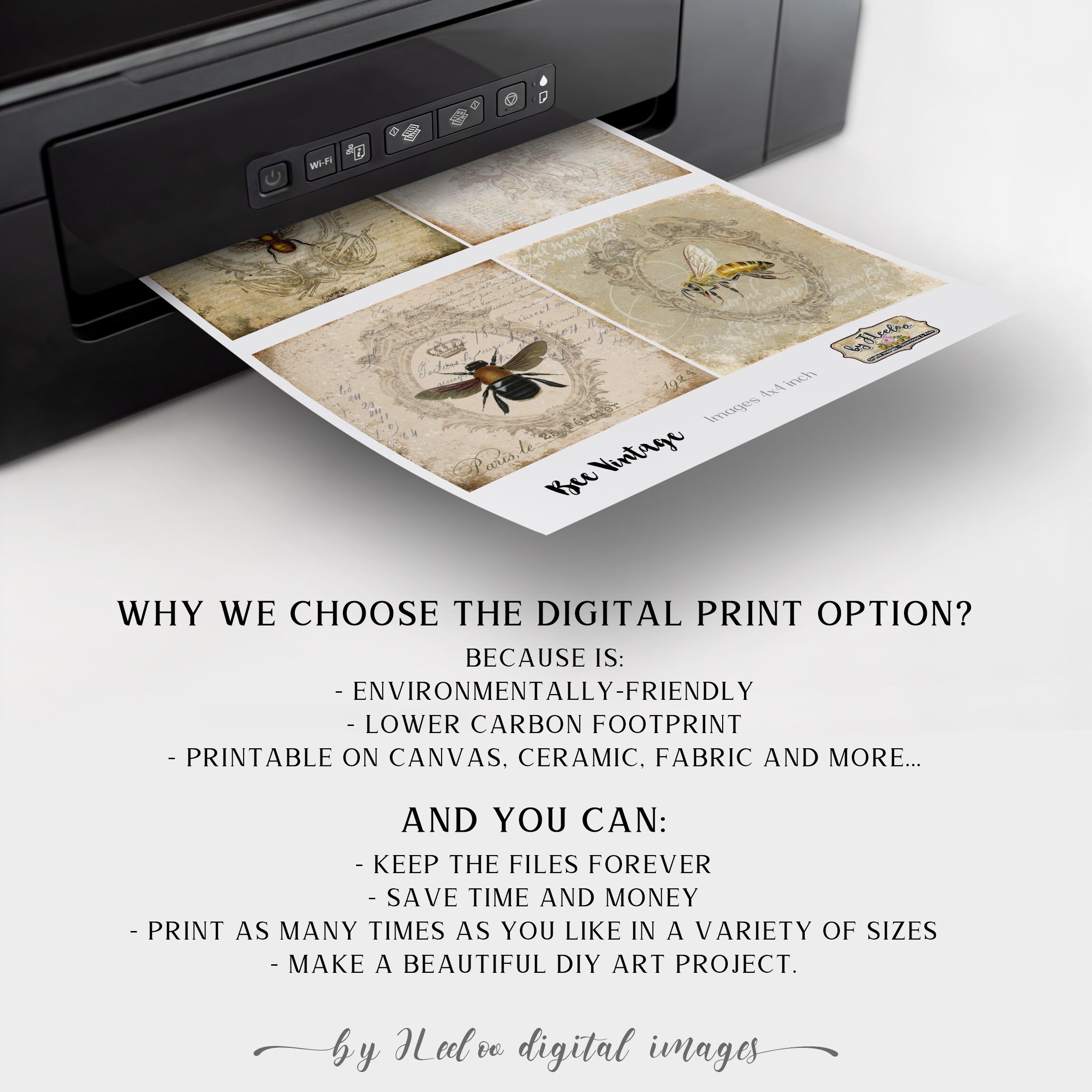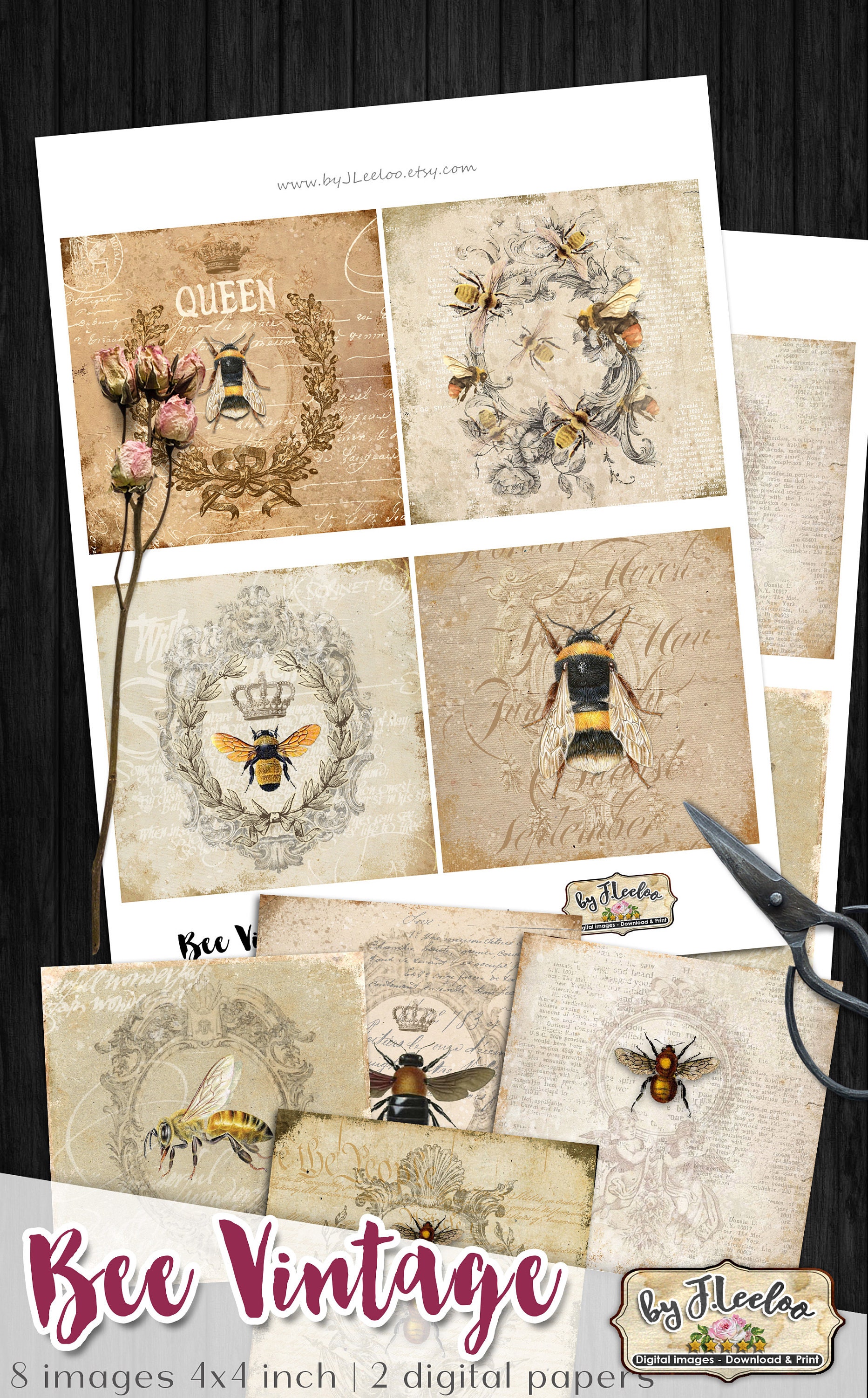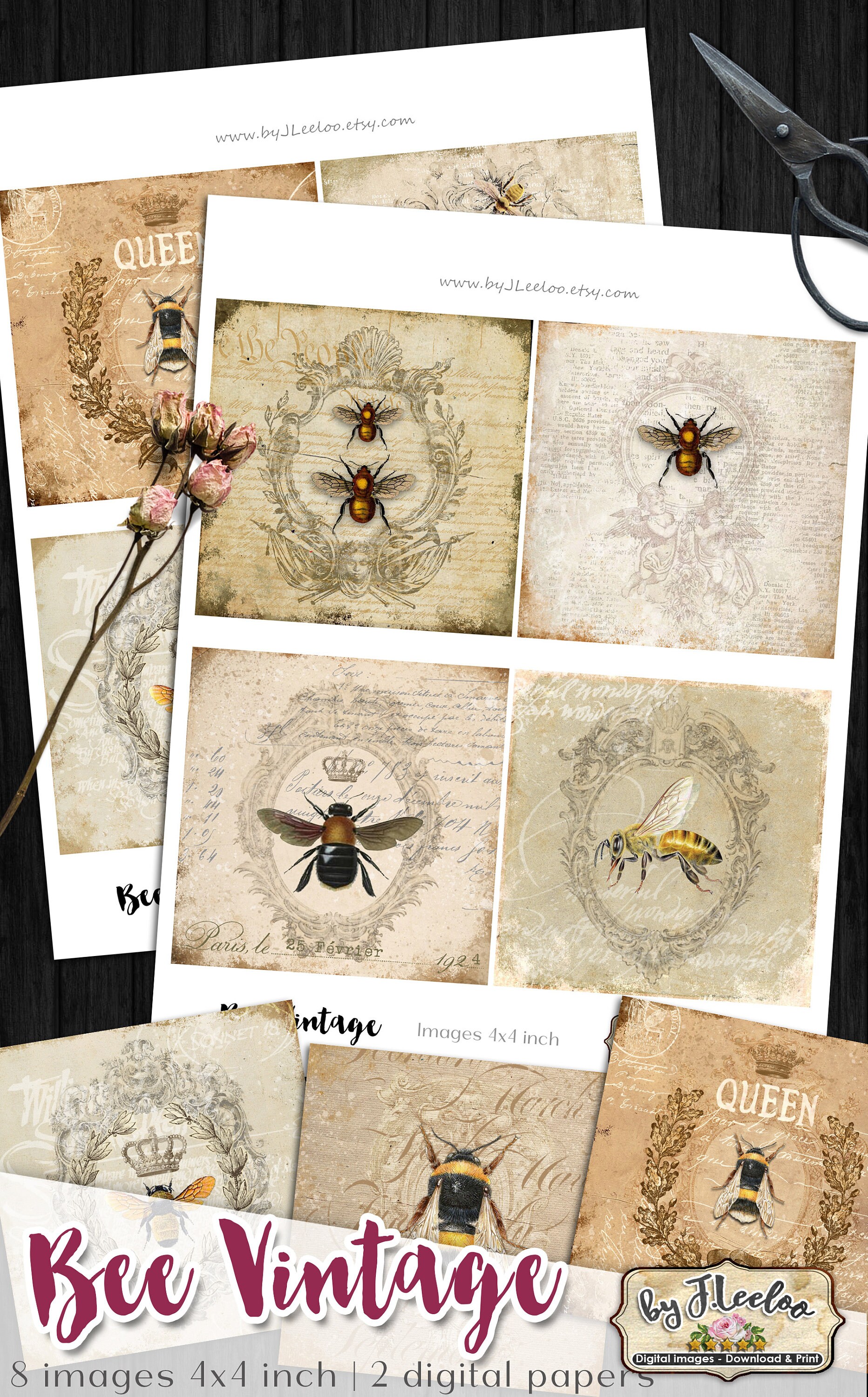 BEE VINTAGE Digital collage sheets - Square images instant download ready to print for coaster, thank you cards or hang tags, your jewelry making, resin pendants, rings, earrings and button, for magnets, stickers, scrapbook and your others craft project.