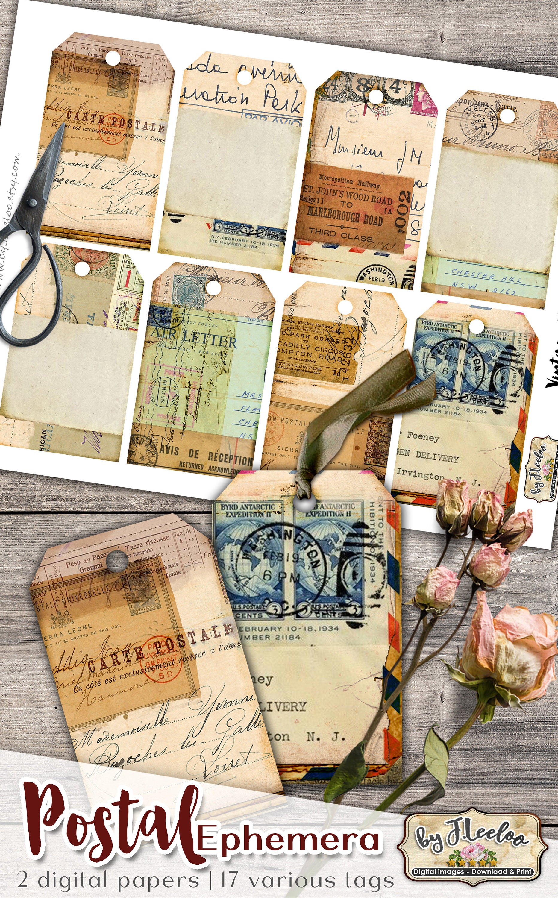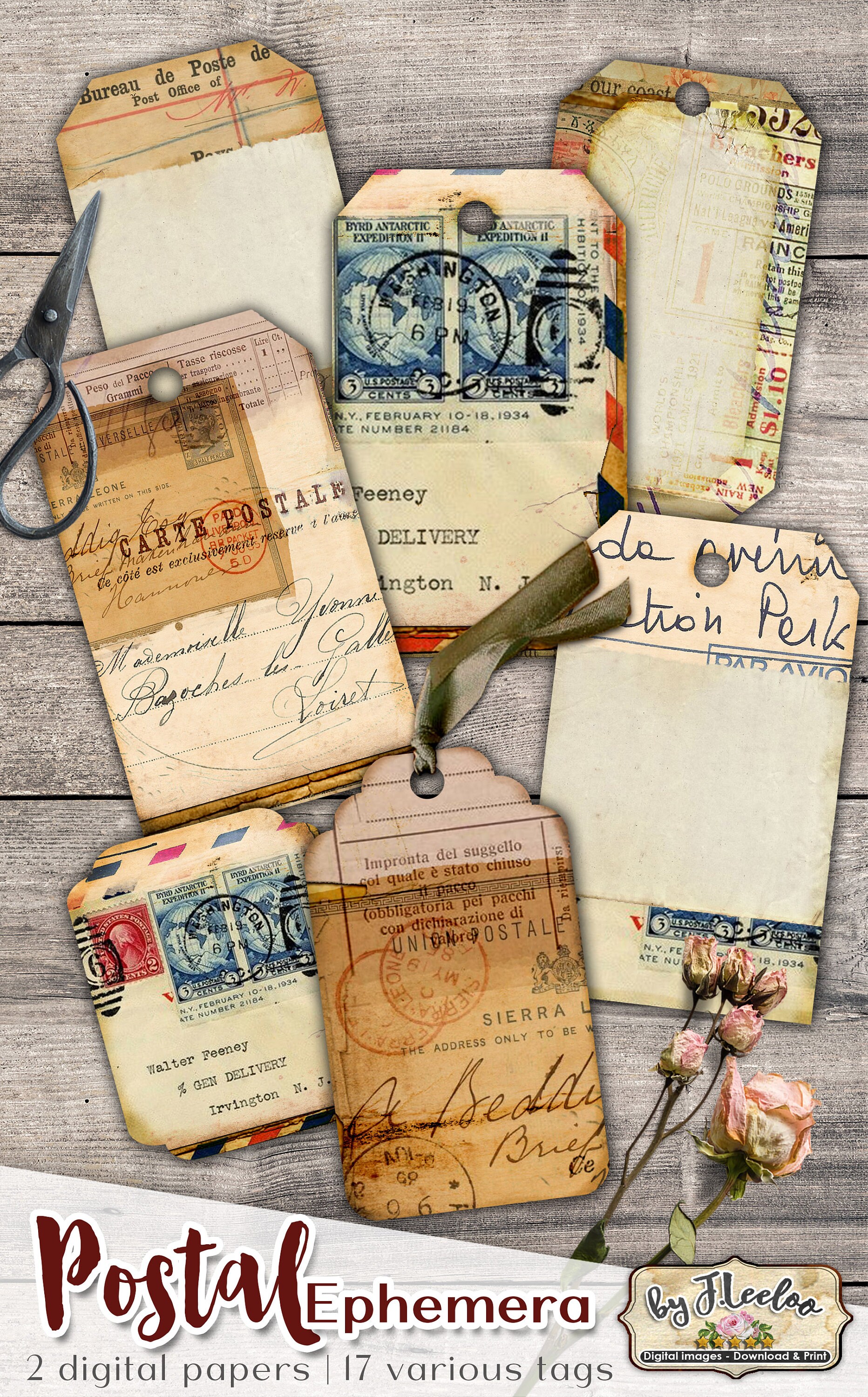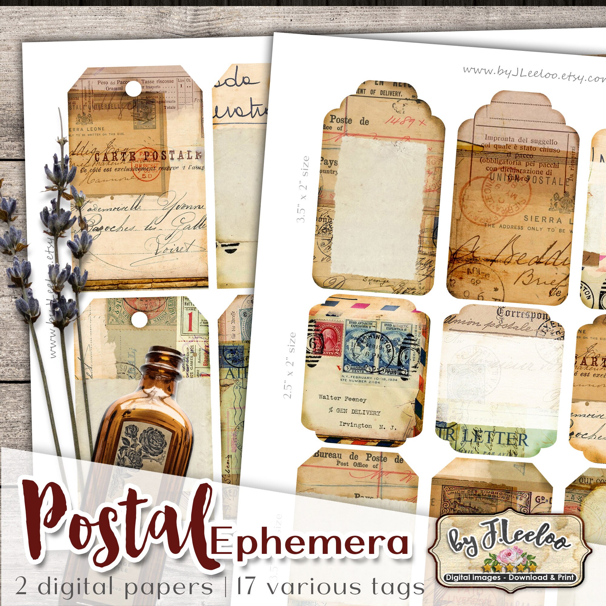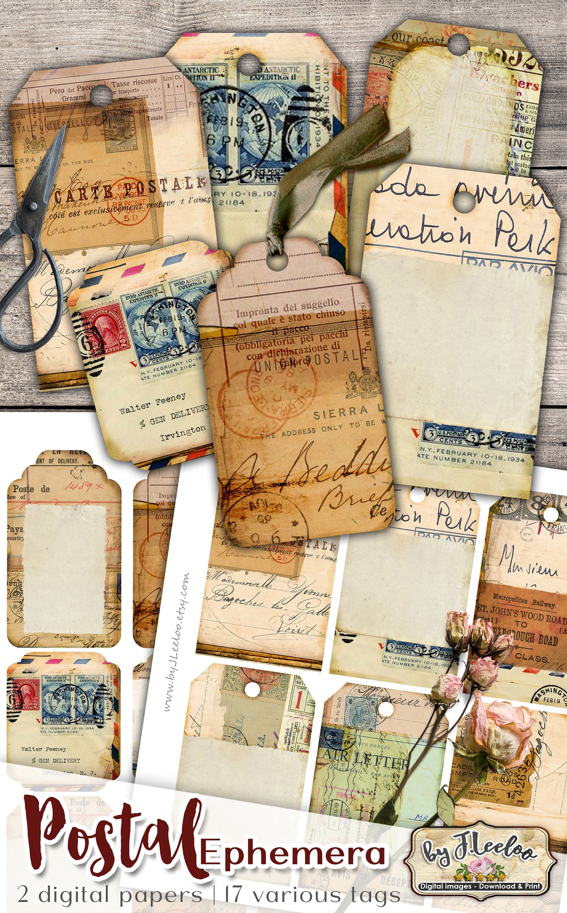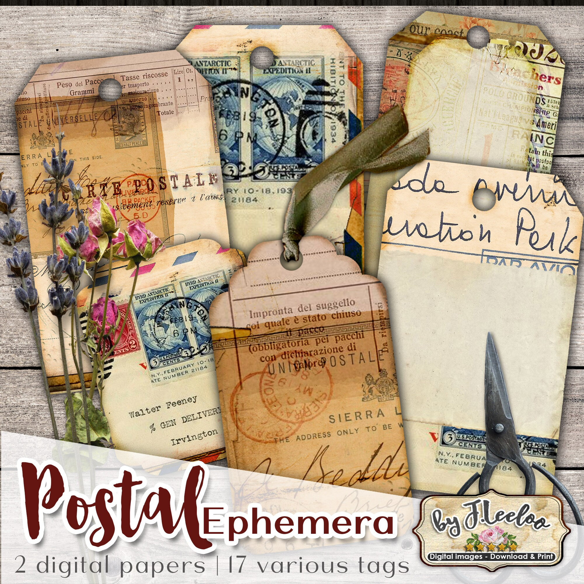 Etichette per EPHEMERA POSTALI Vintage Grunge Journal - Documento antico con cartolina stampabile: scarica e stampa per cartellini, etichette, album, portagioielli, biglietti e altri progetti artigianali.