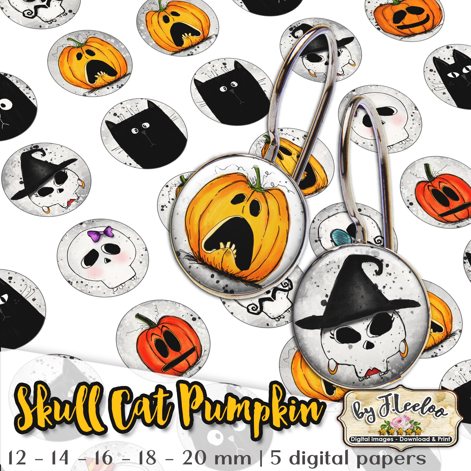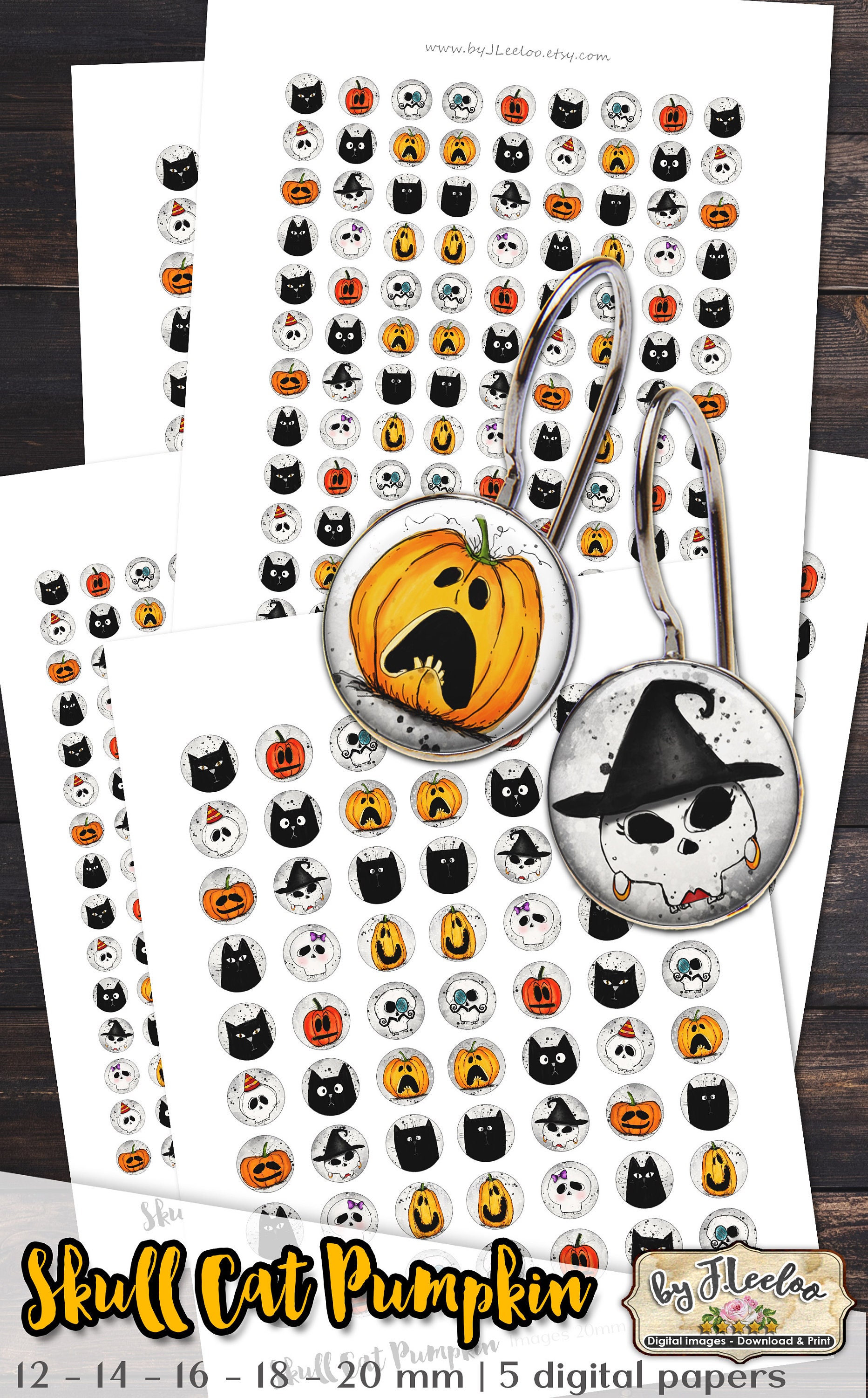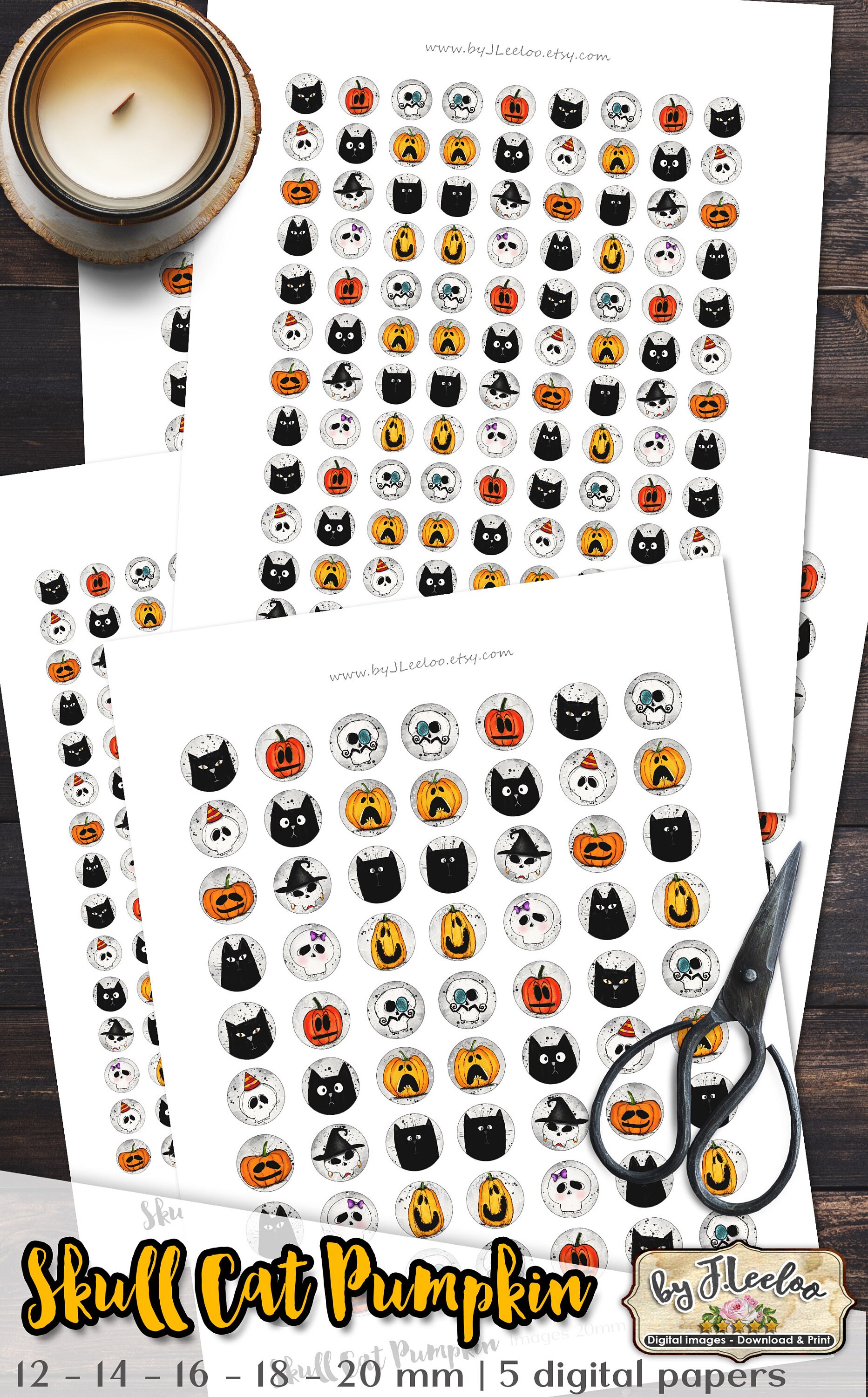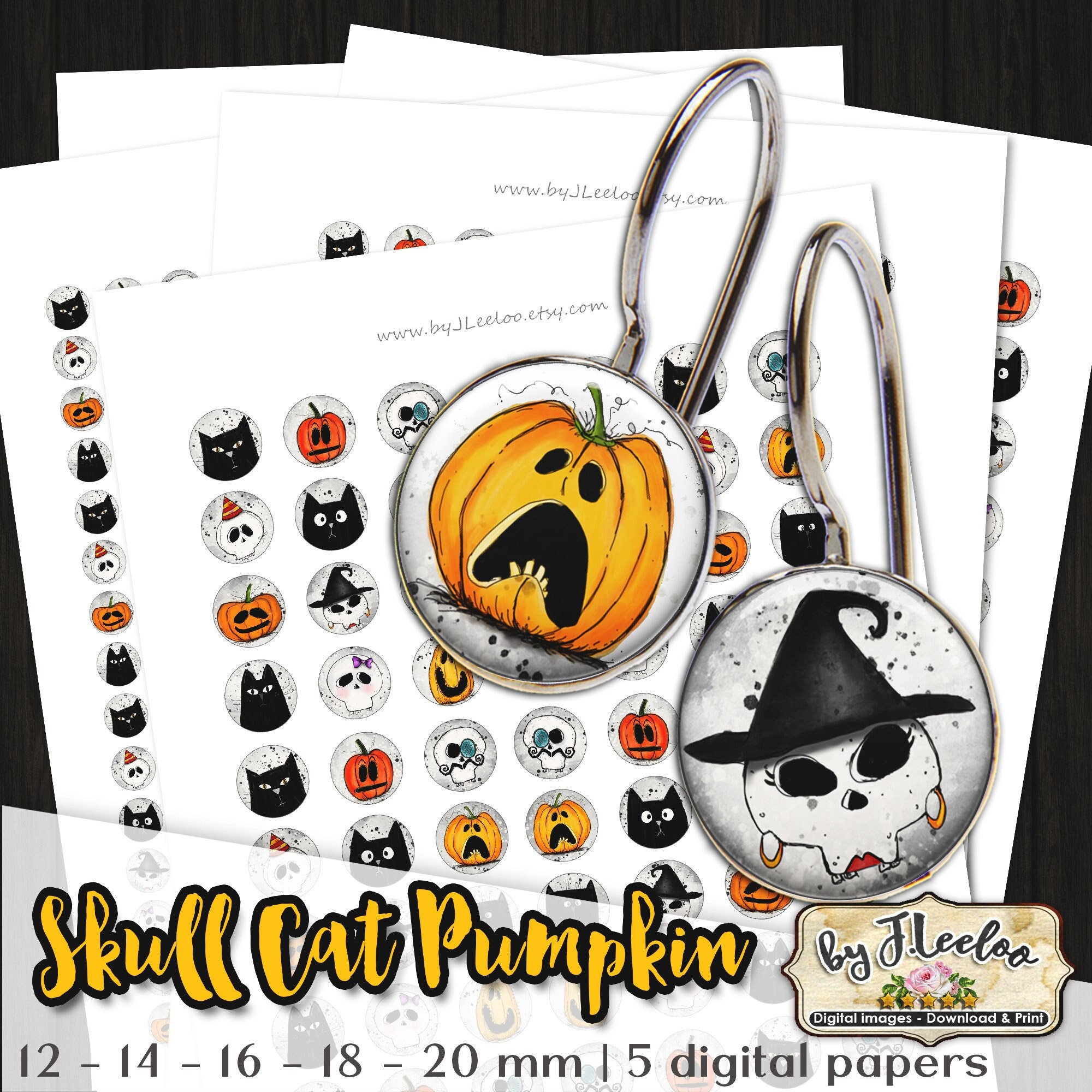 SKULL CAT PUMPKIN - Halloween Digital collage sheets - Circles images instant download ready to print for your jewelry making, resin pendants, rings, earrings and button, for magnets, stickers, scrapbook and your others craft project.