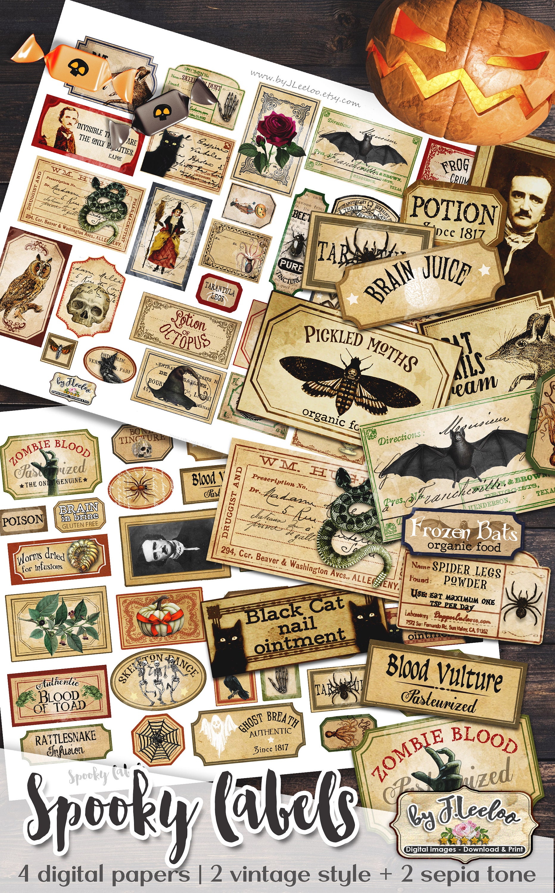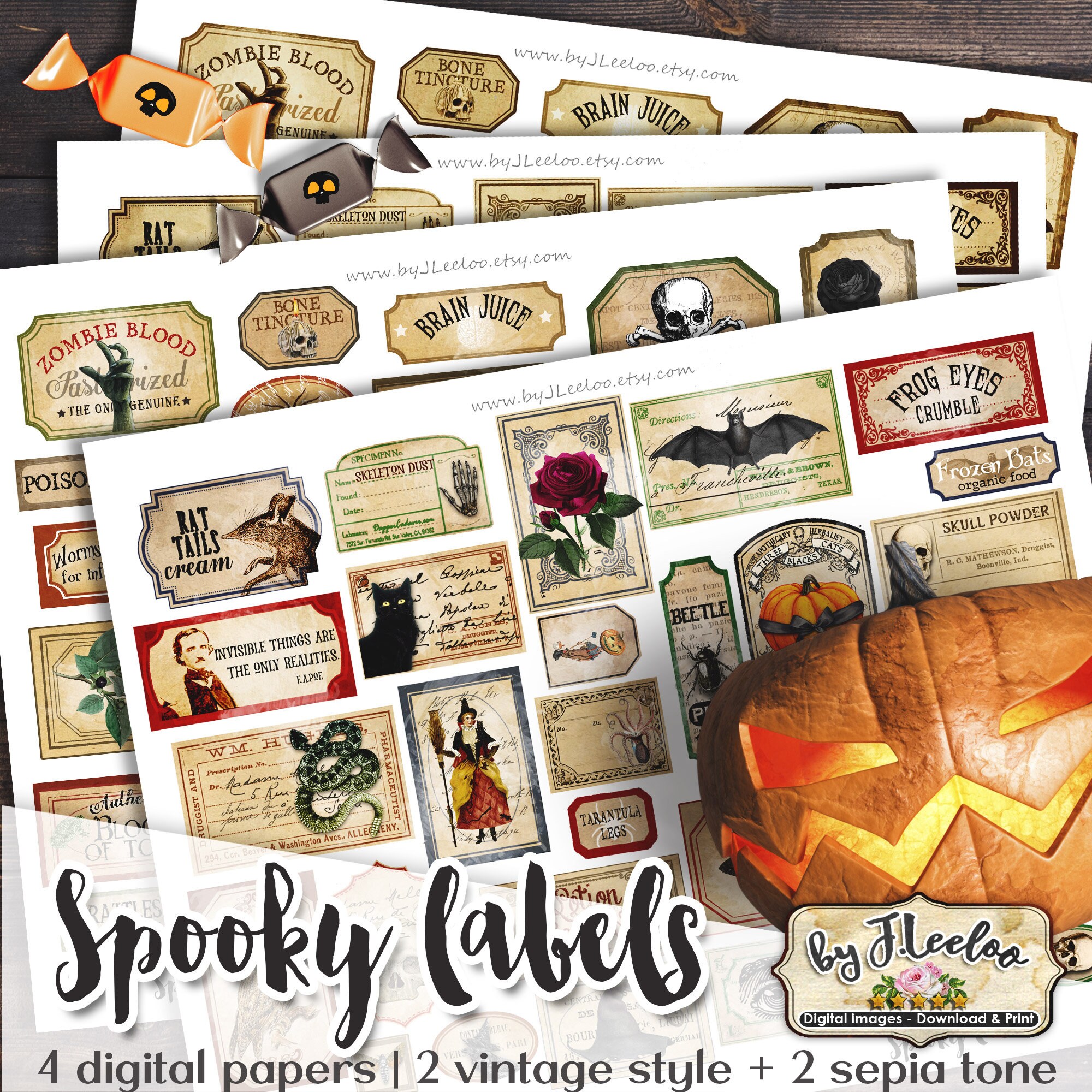 SPOOKY LABELS vintage kit apothecary Witch Halloween bottle junk journal stickers potion poison labels Digital Download