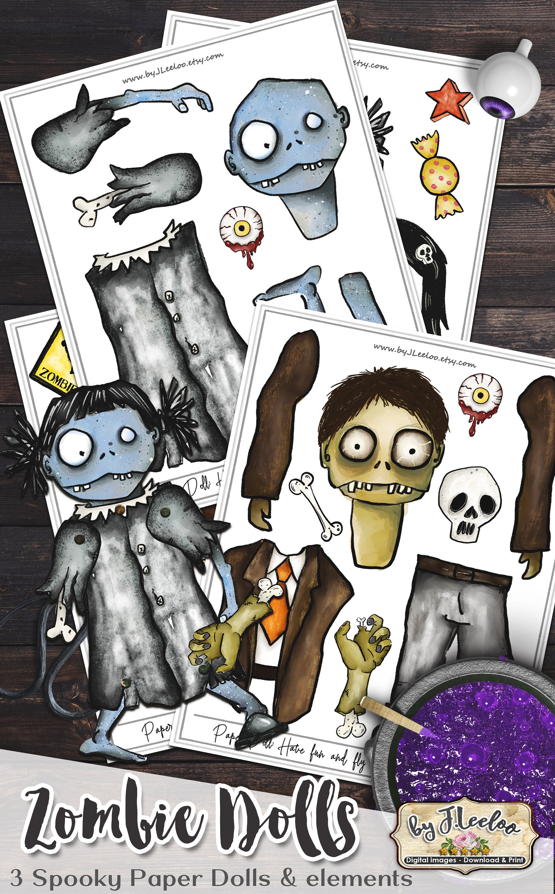 ZOMBIE PAPER DOLL HALLOWEEN Digital collage sheet HAND DRAWN - Digital paper: printable halloween paper dolls for your artwork and crafting project - Altered art, steampunk, scrapbook, vintage project etc... free your imagination!