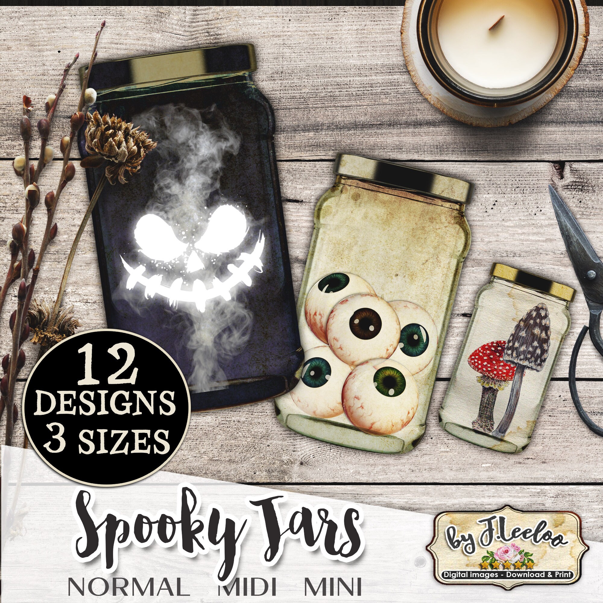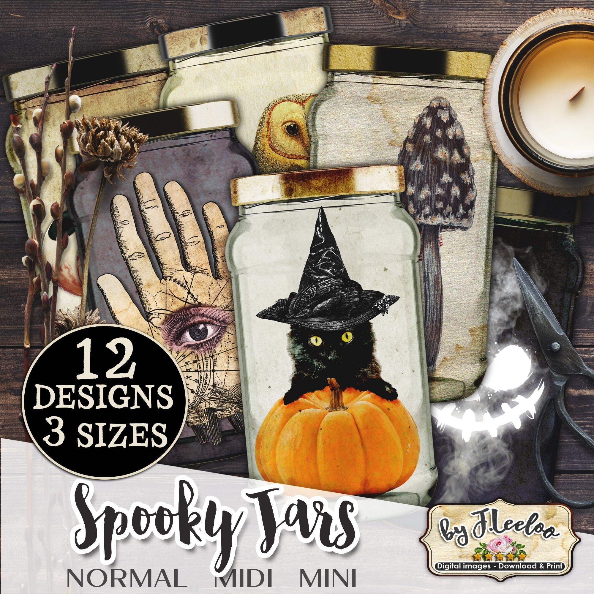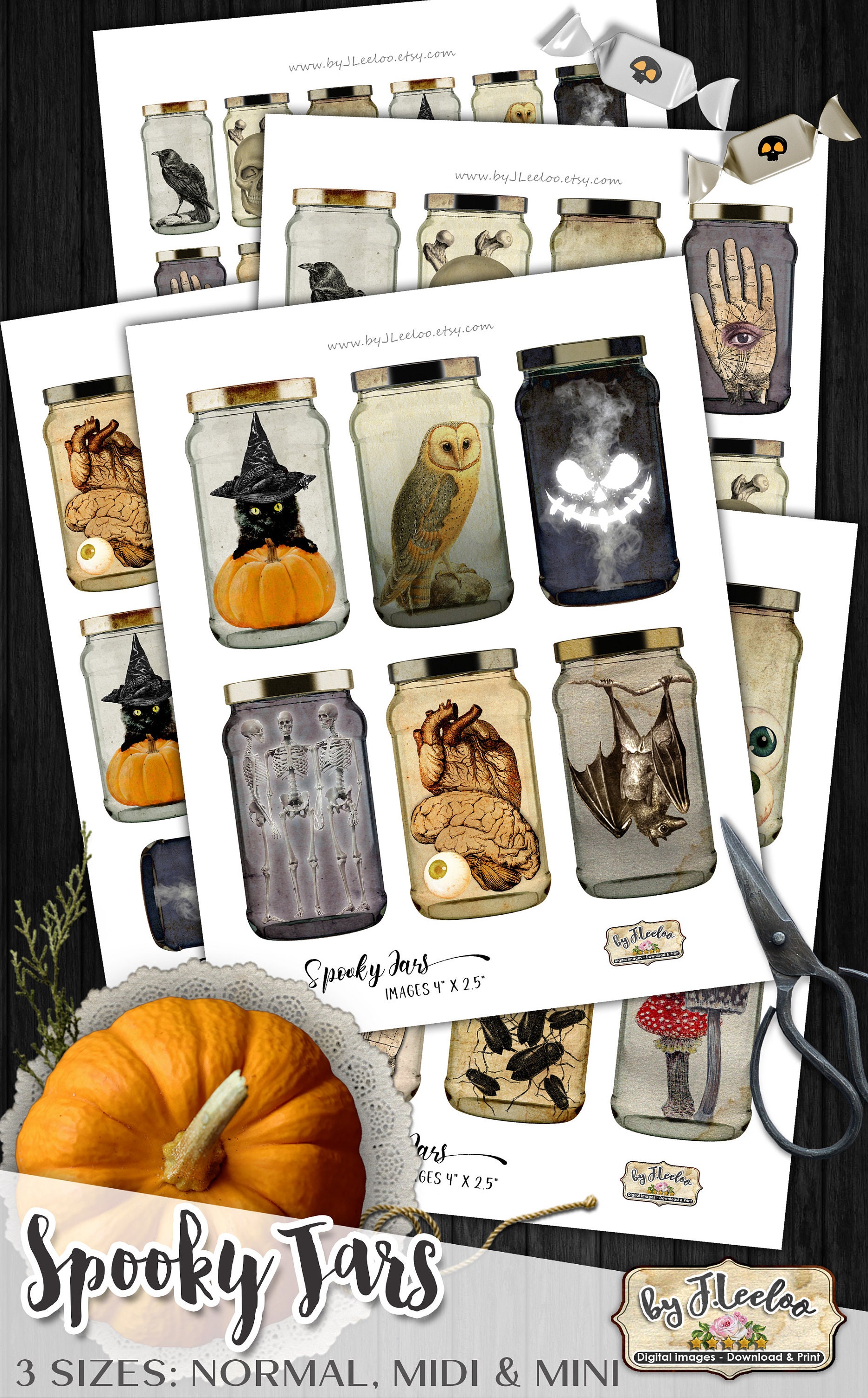 SPOOKY JARS stampabile Halloween barattolo di vetro effimero fornisce tag spazzatura giornale vintage festa santificato gotico e gli altri progetti artigianali.