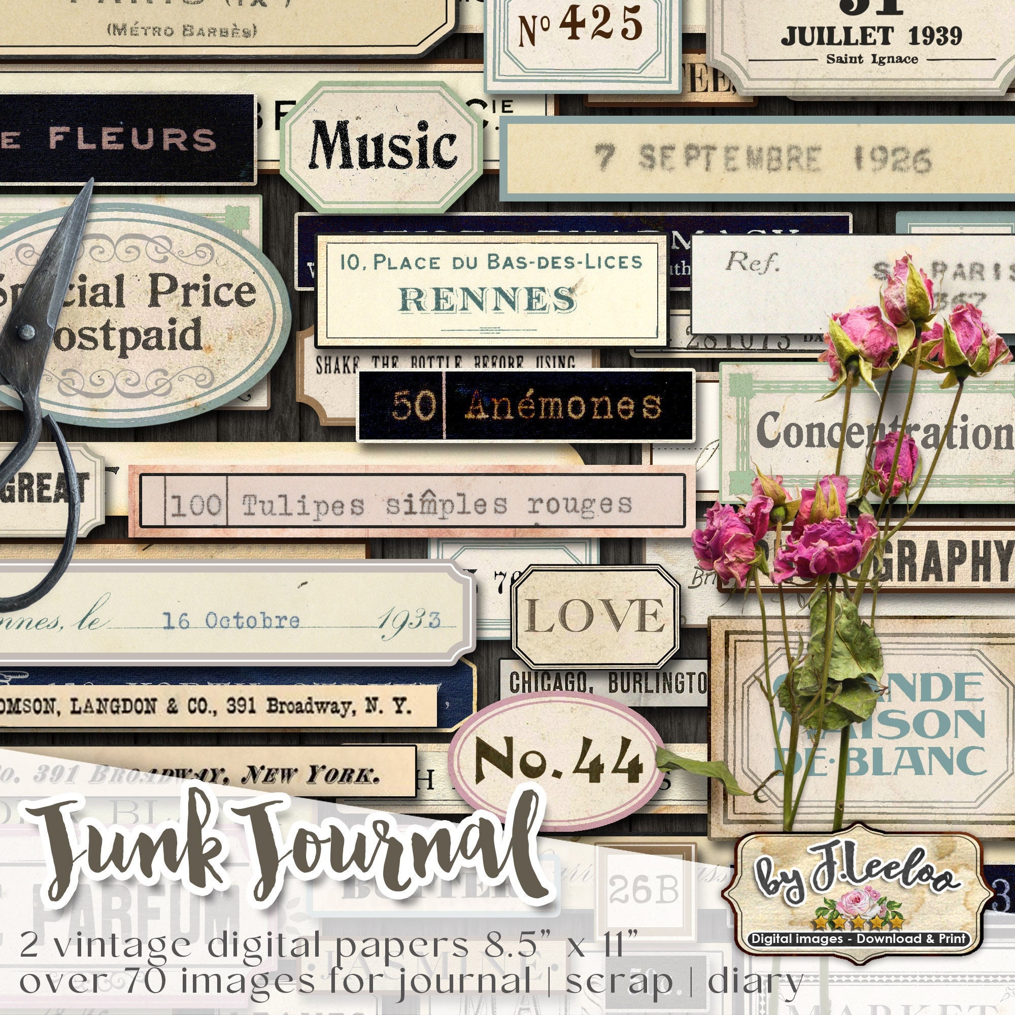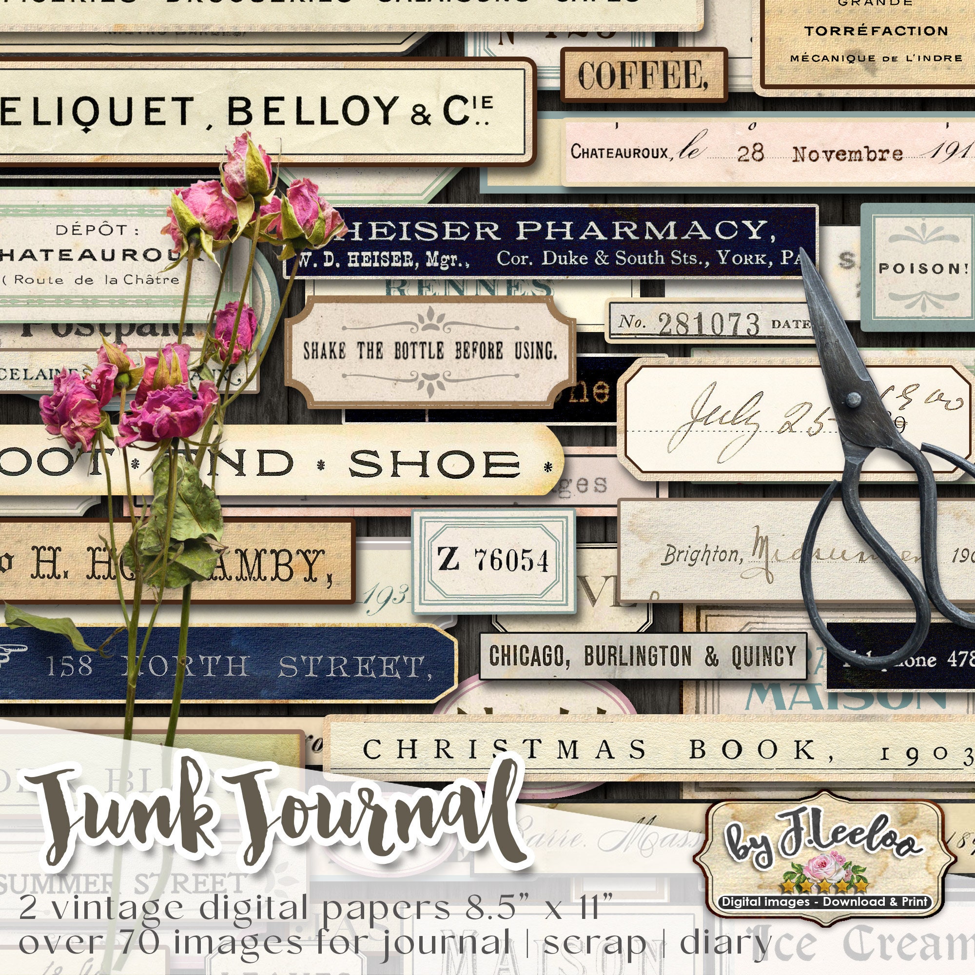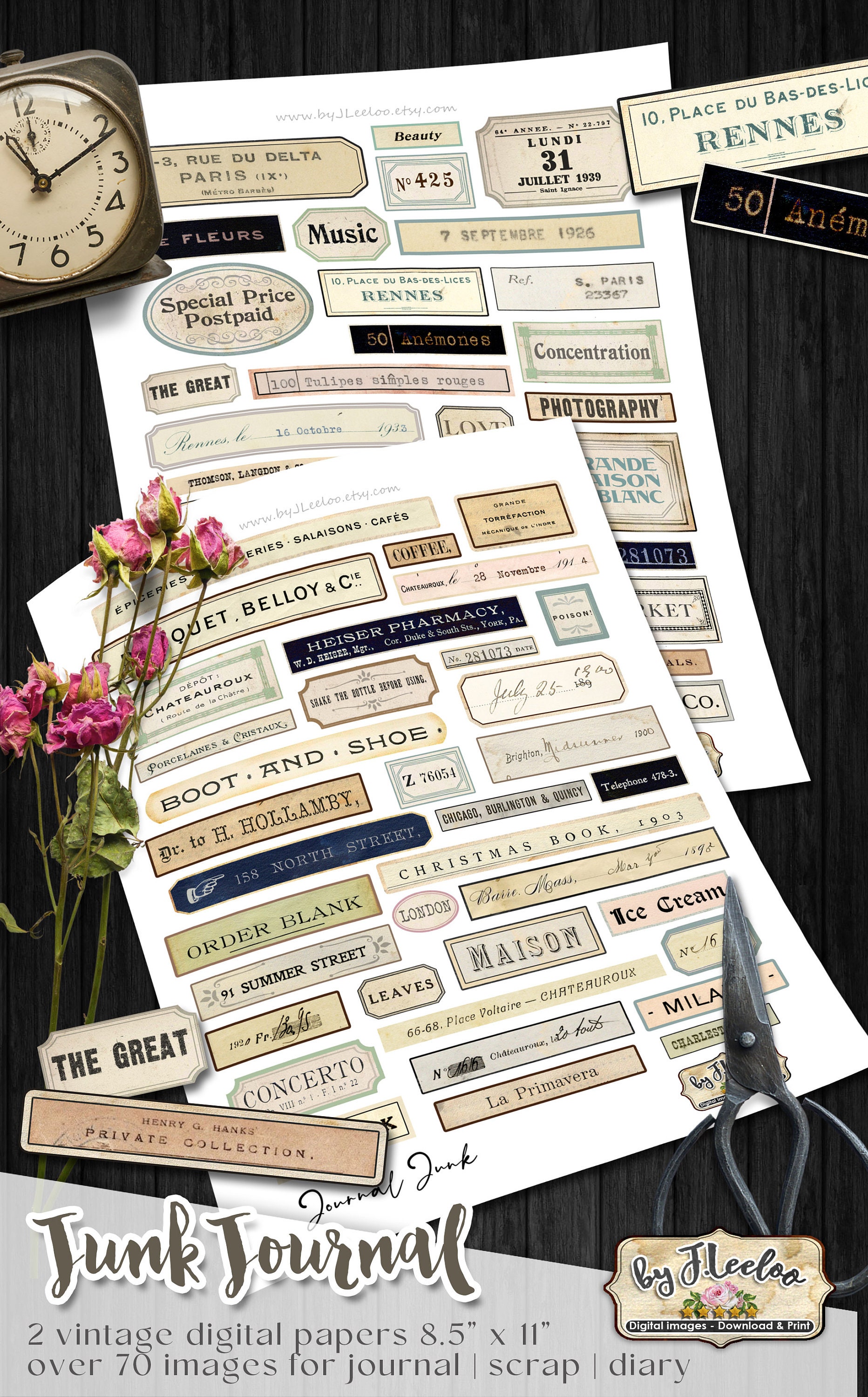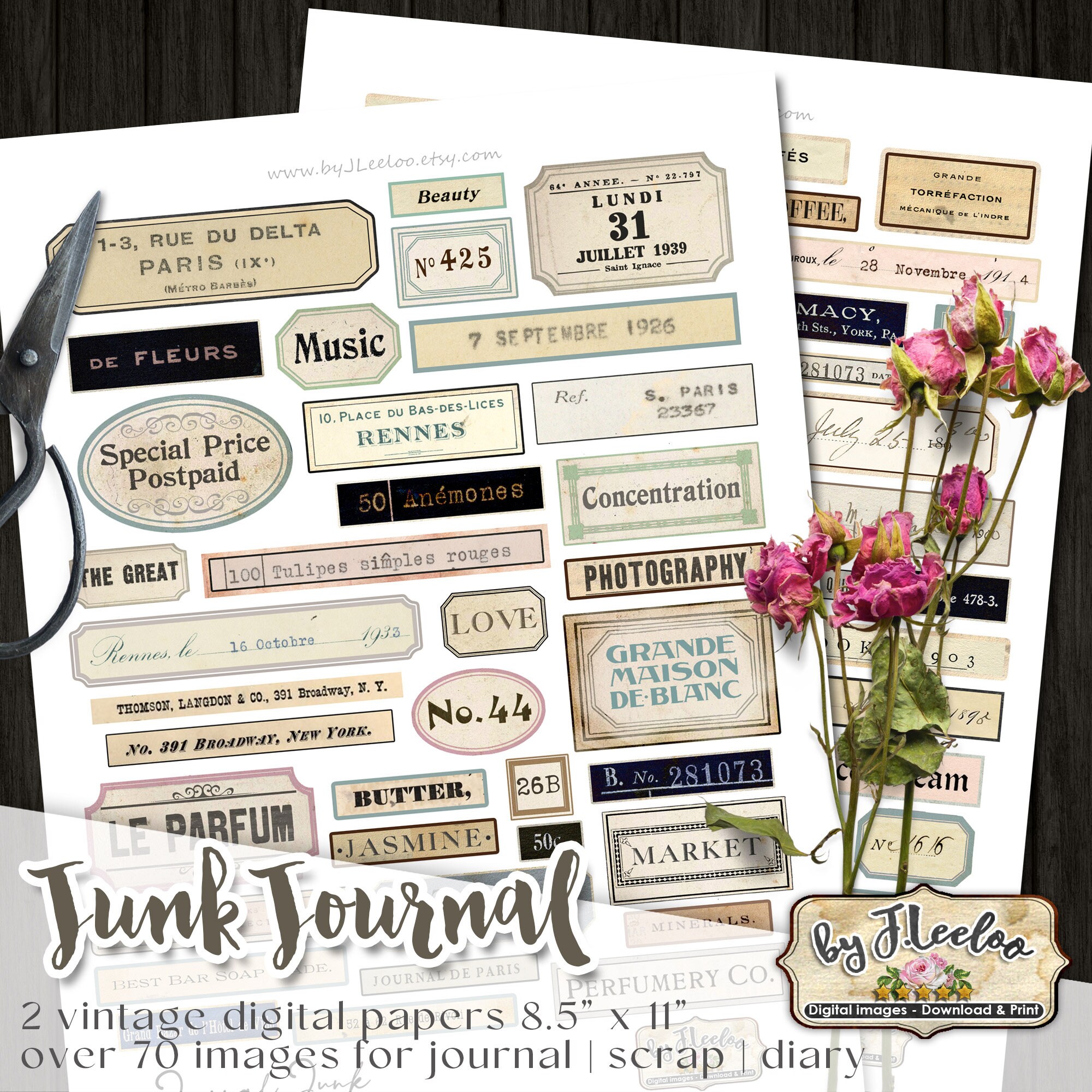 JOURNAL JUNK labels kit printable vintage ephemera diary supplies paper crafts tags instant download digital collage sheet