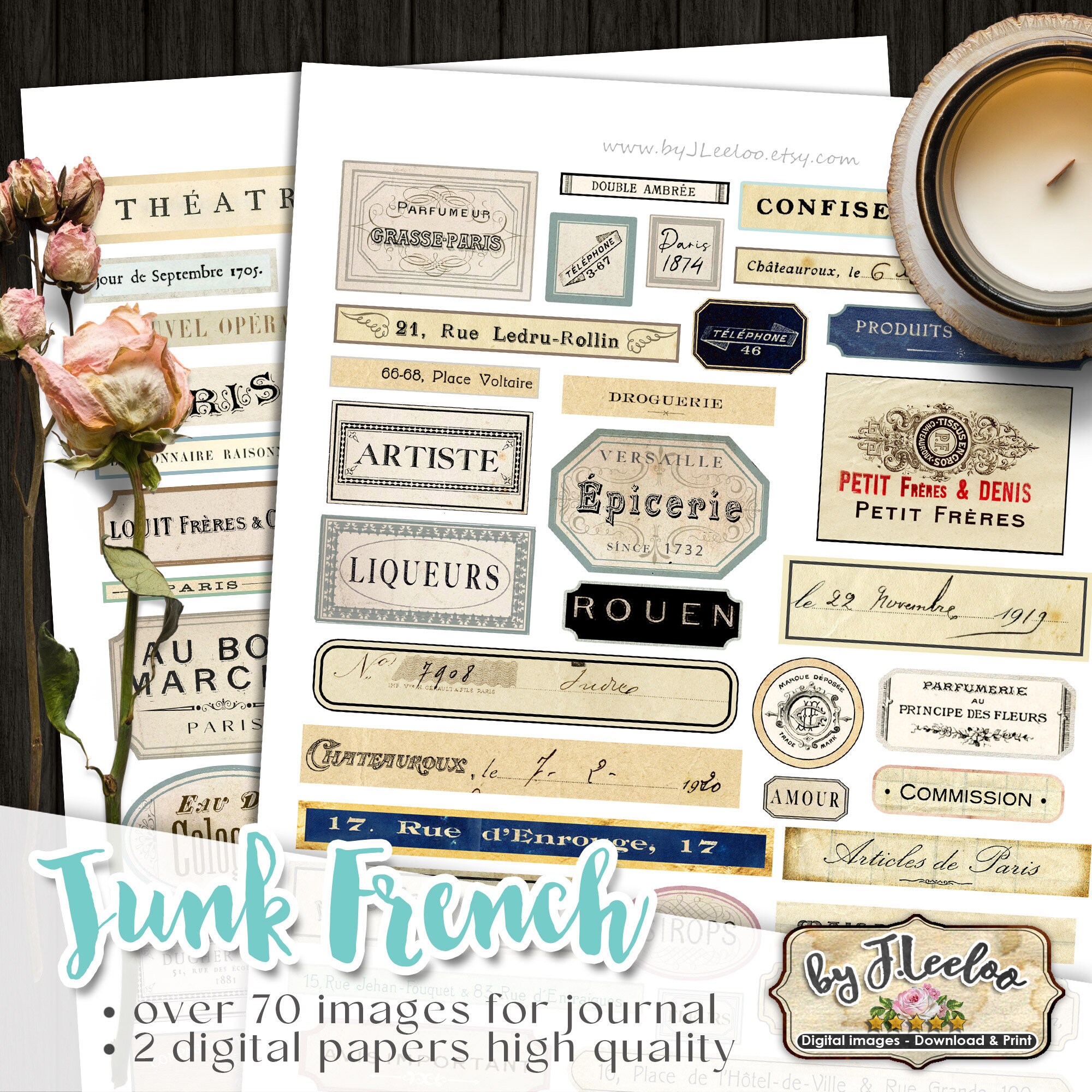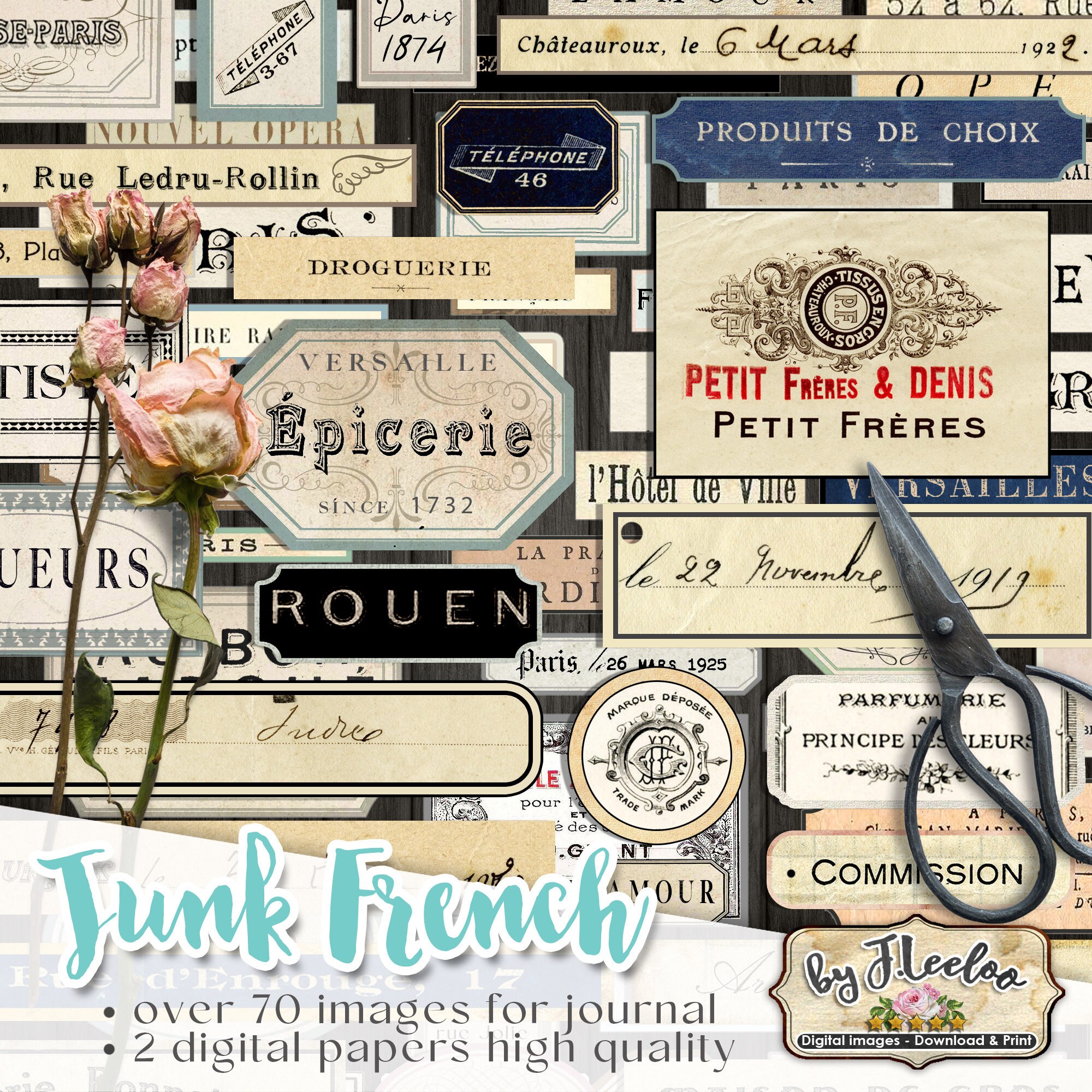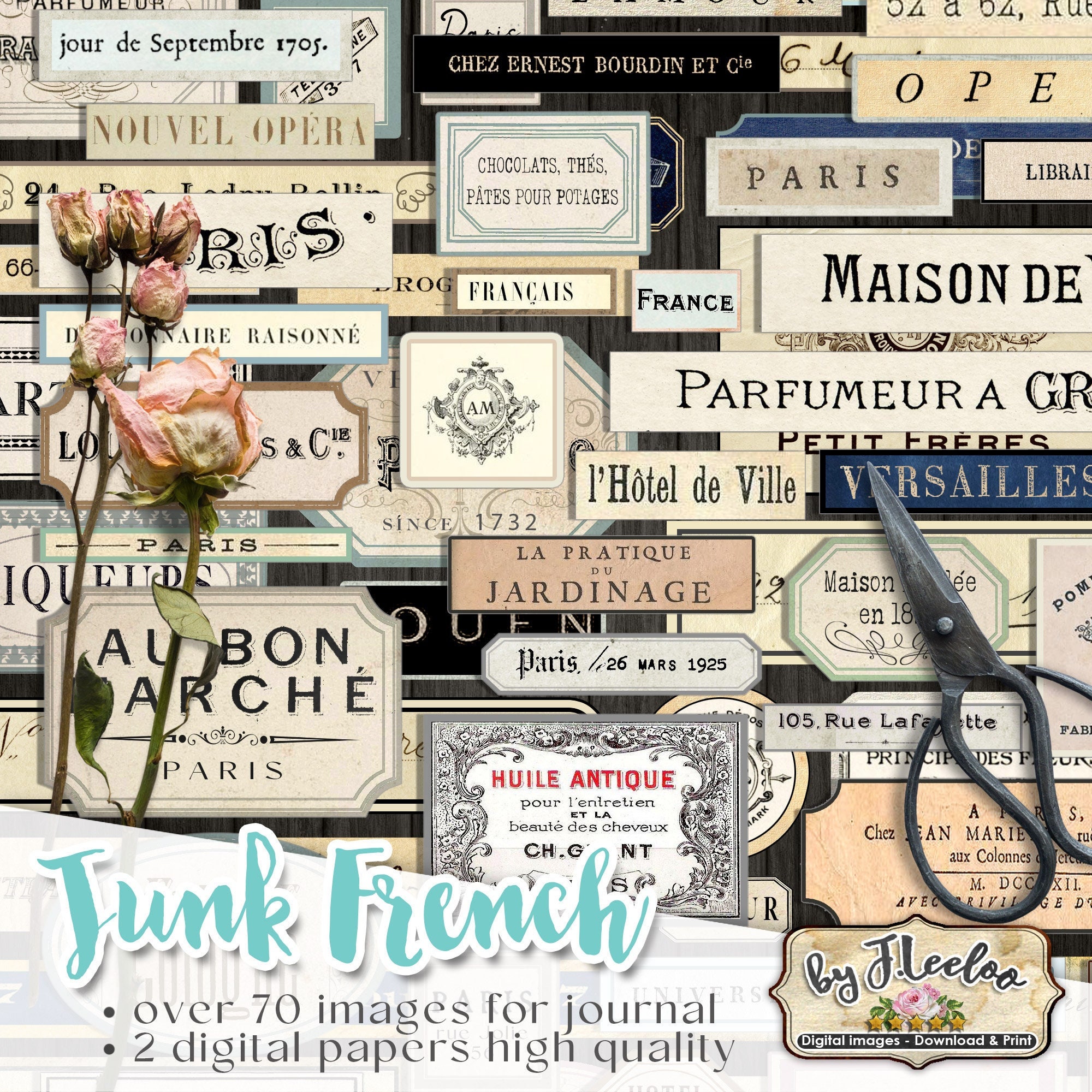JUNK FRENCH Journal labels kit printable vintage ephemera journal supplies paper crafts tags instant download digital collage sheet