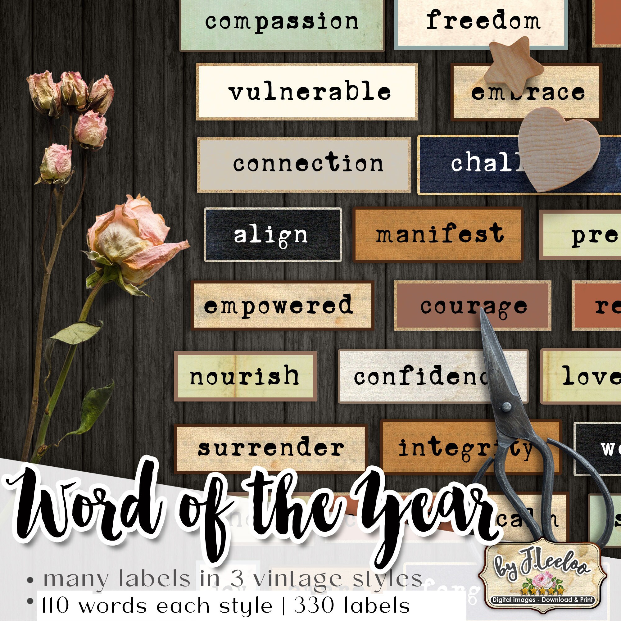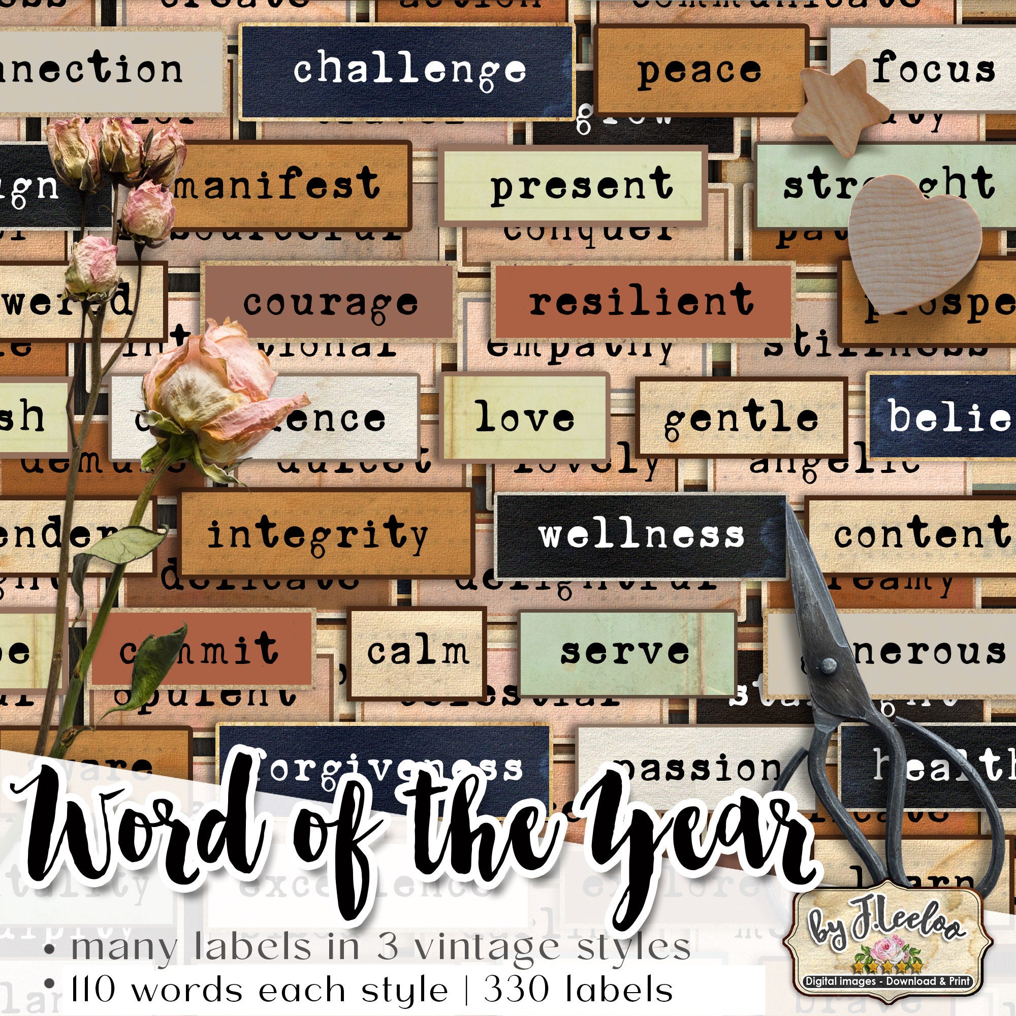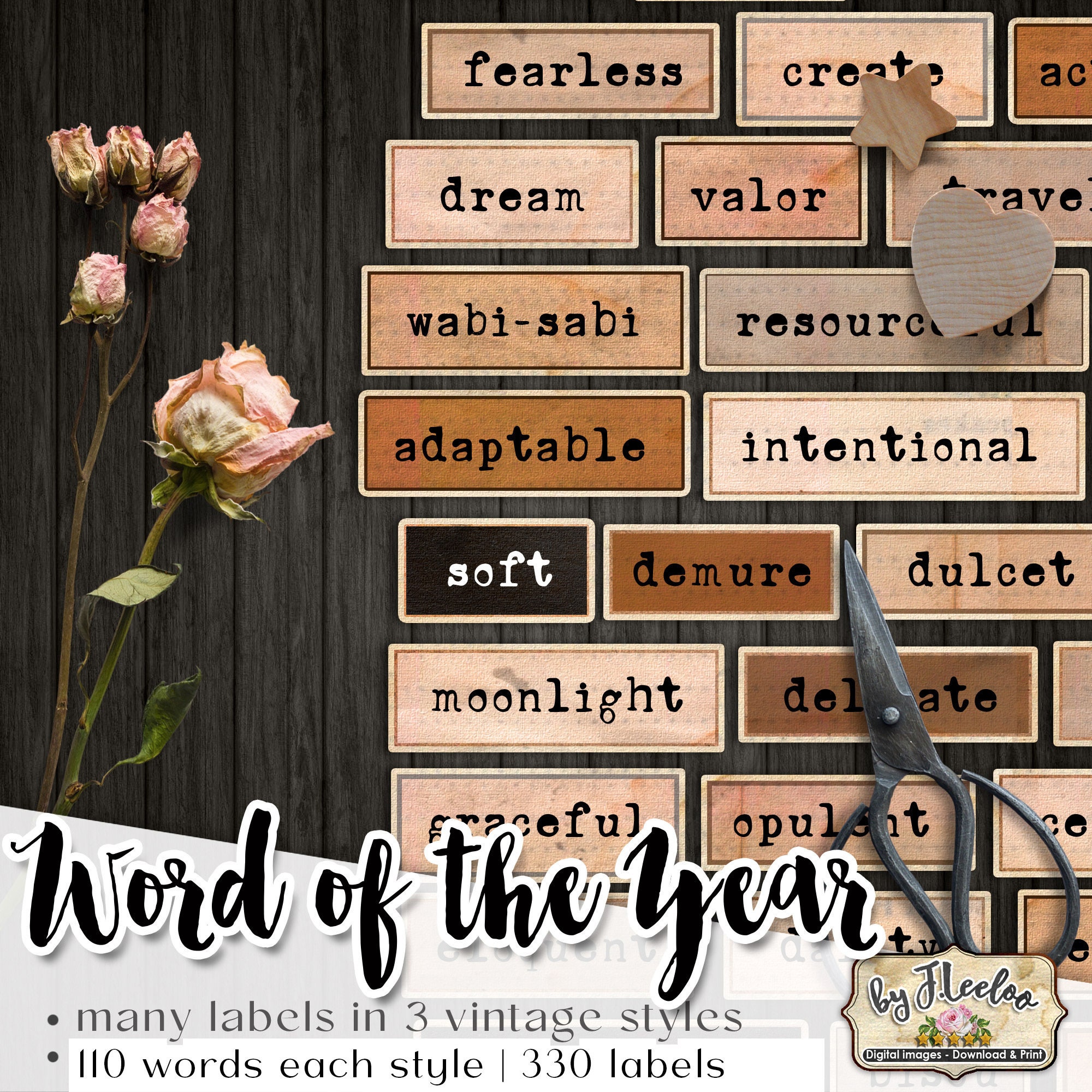 WORD Of The YEAR labels printable positive word vintage ephemera junk journal diary boho colors instant download images digital collage sheet