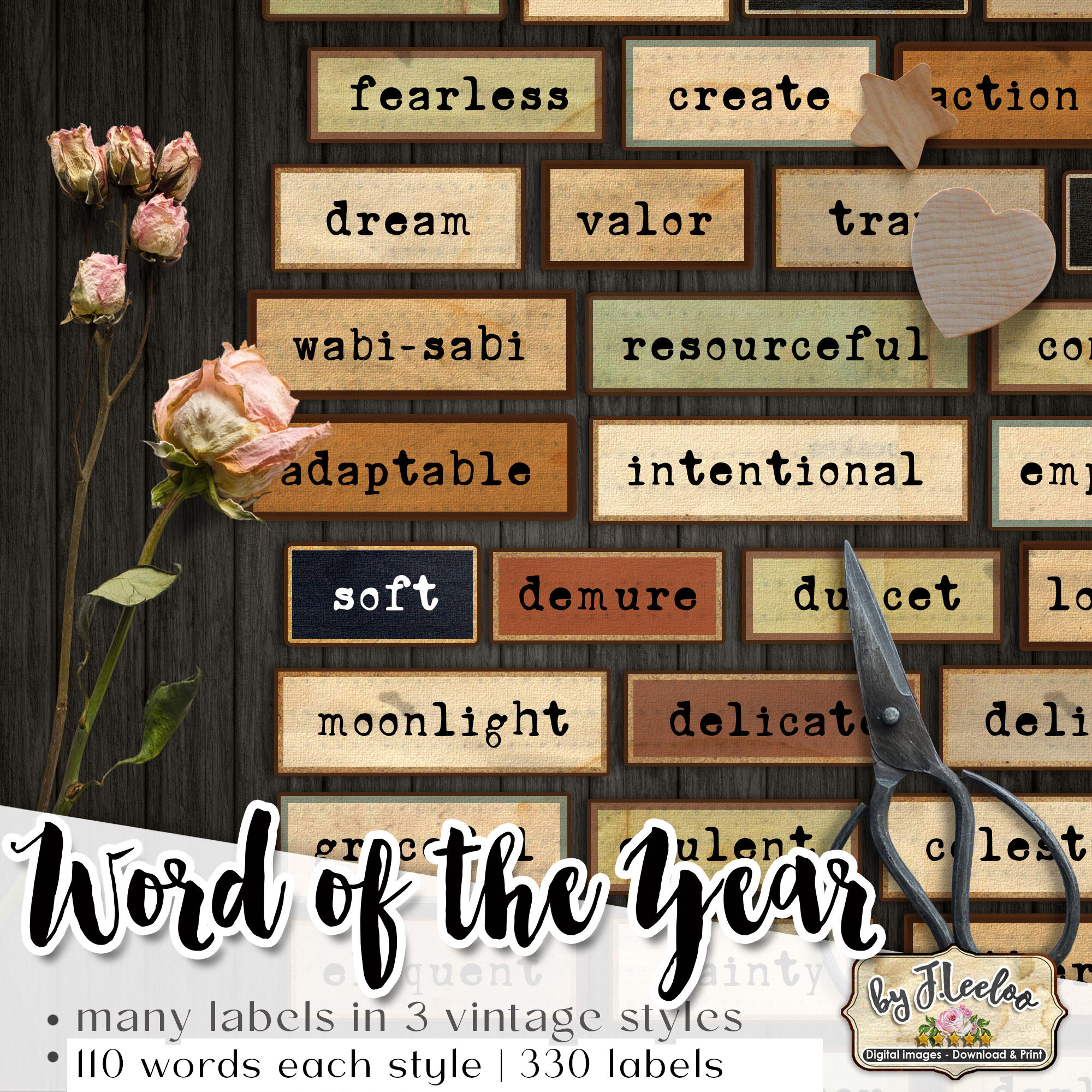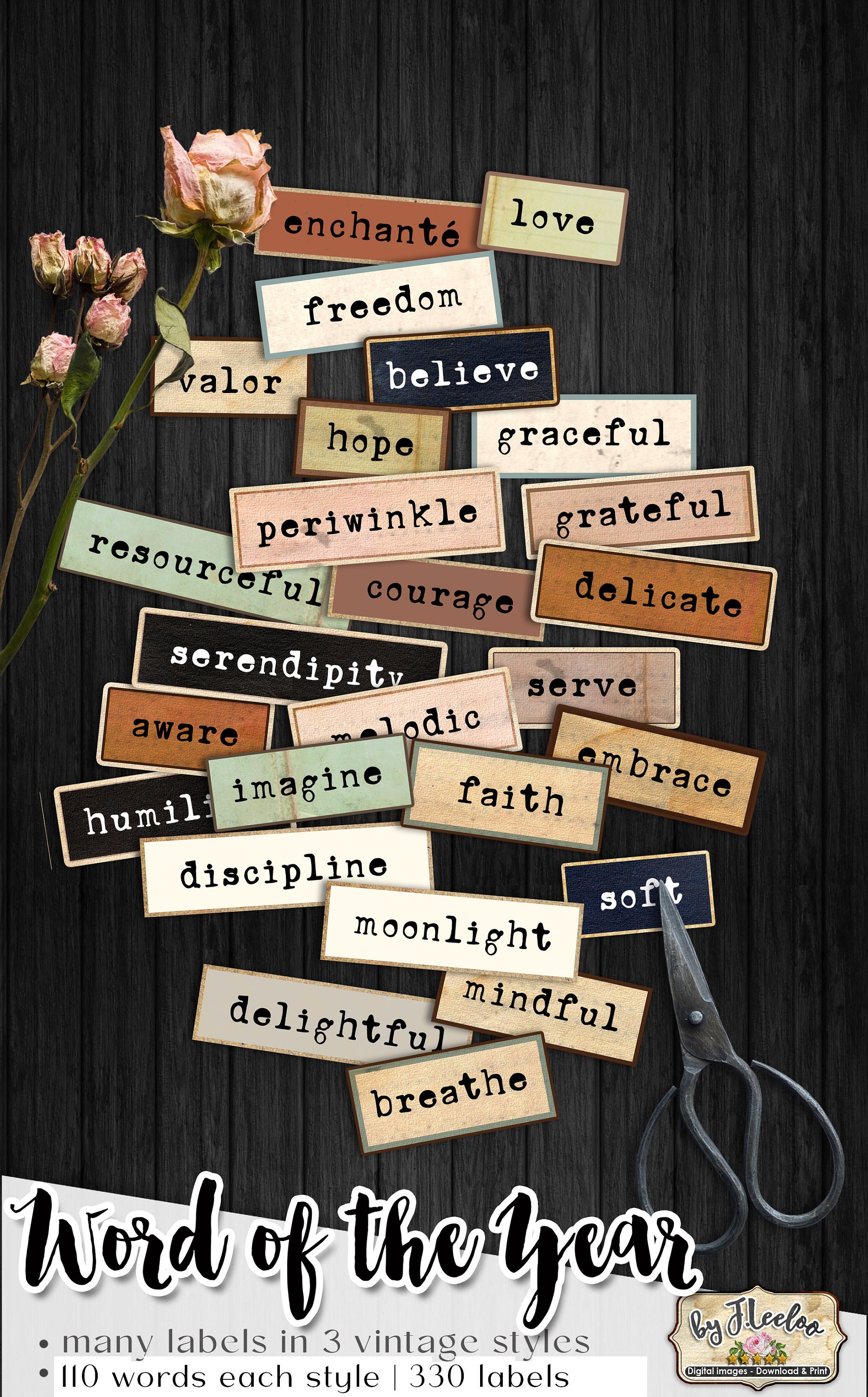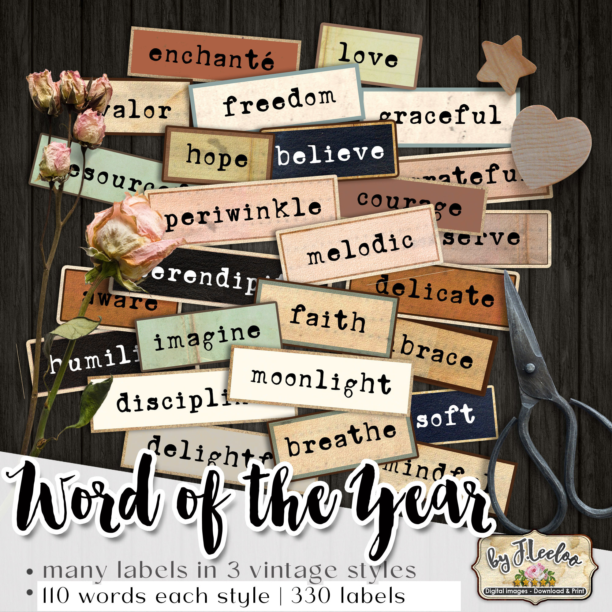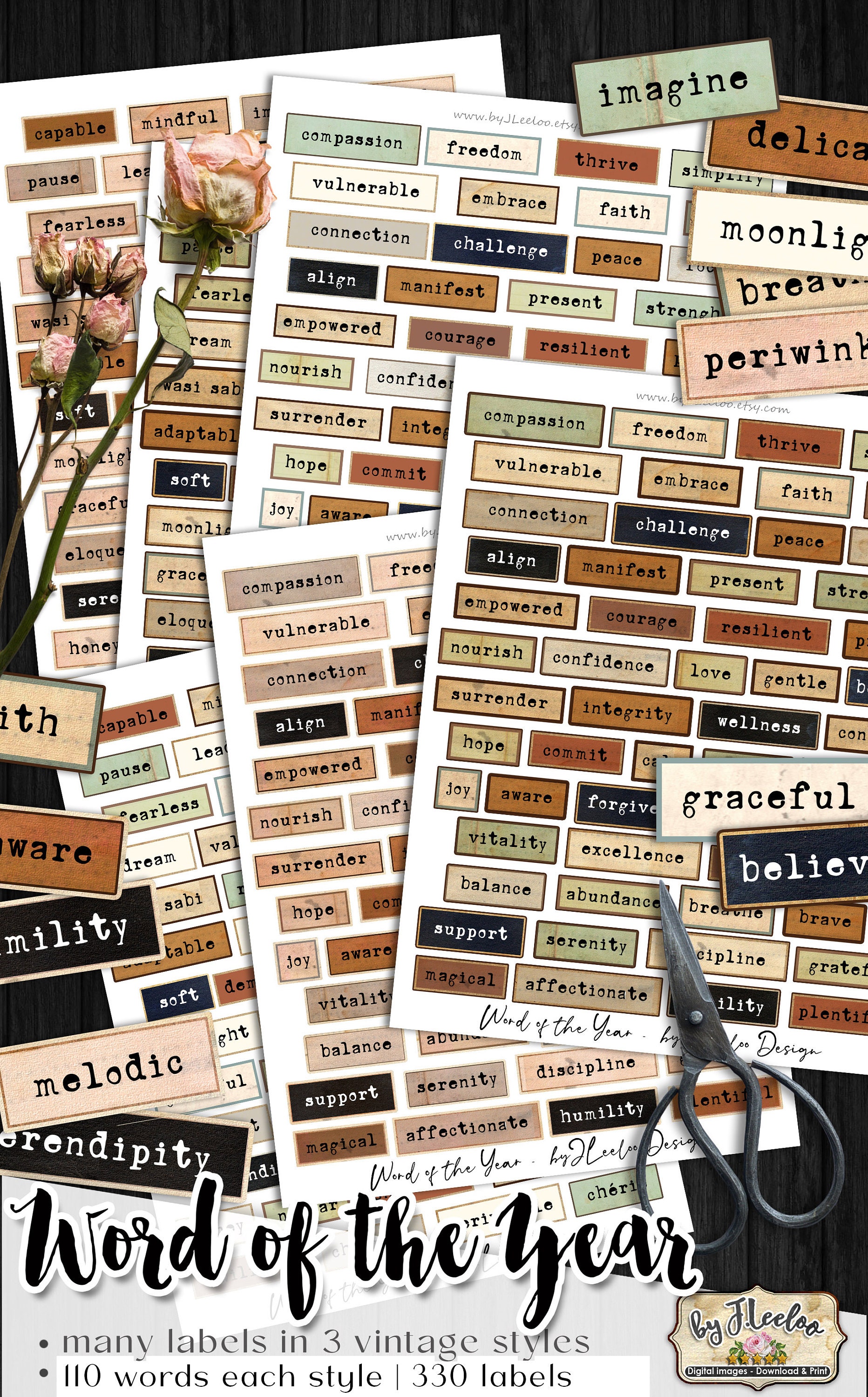 WORD Of The YEAR labels printable positive word vintage ephemera junk journal diary boho colors instant download images digital collage sheet
