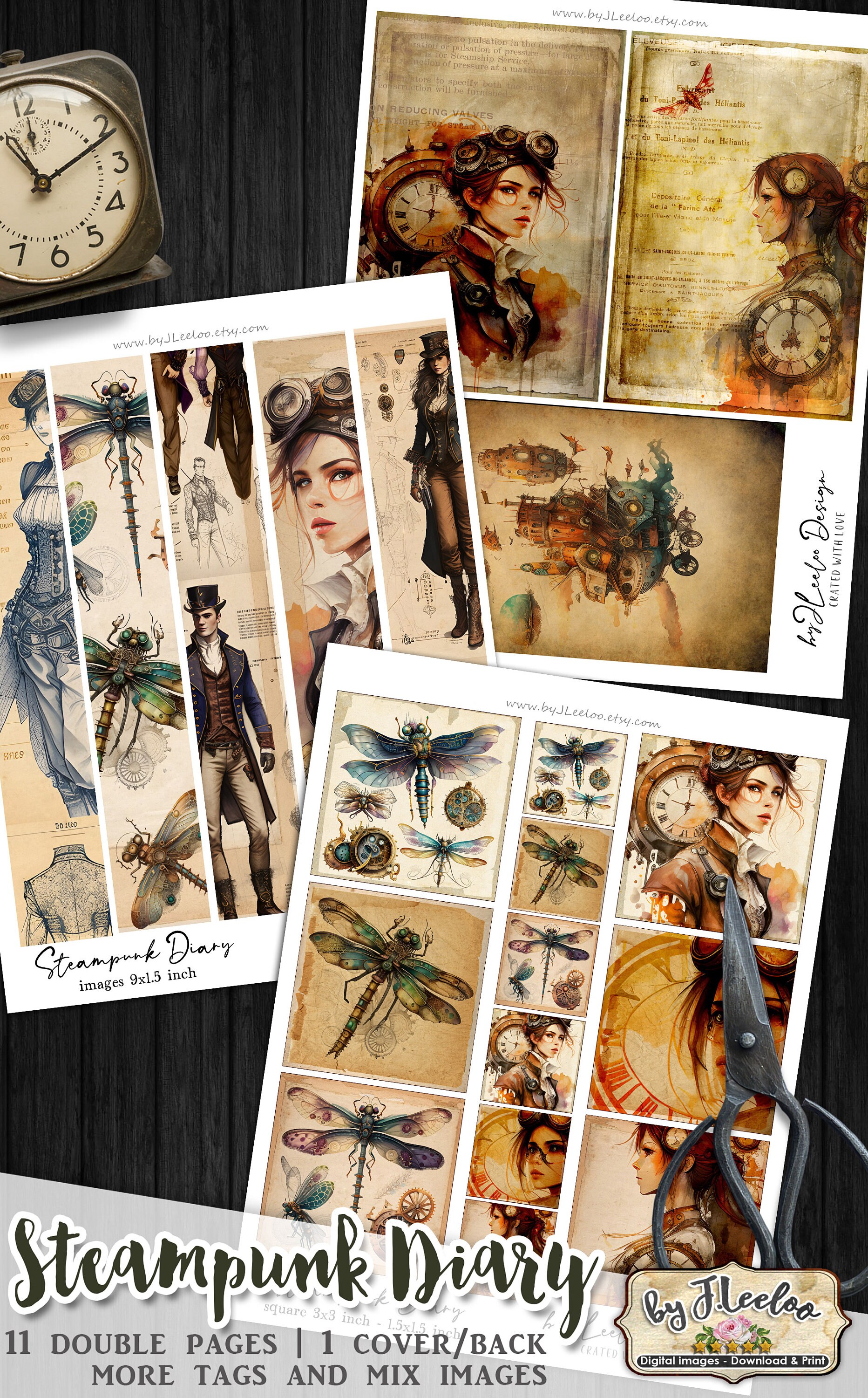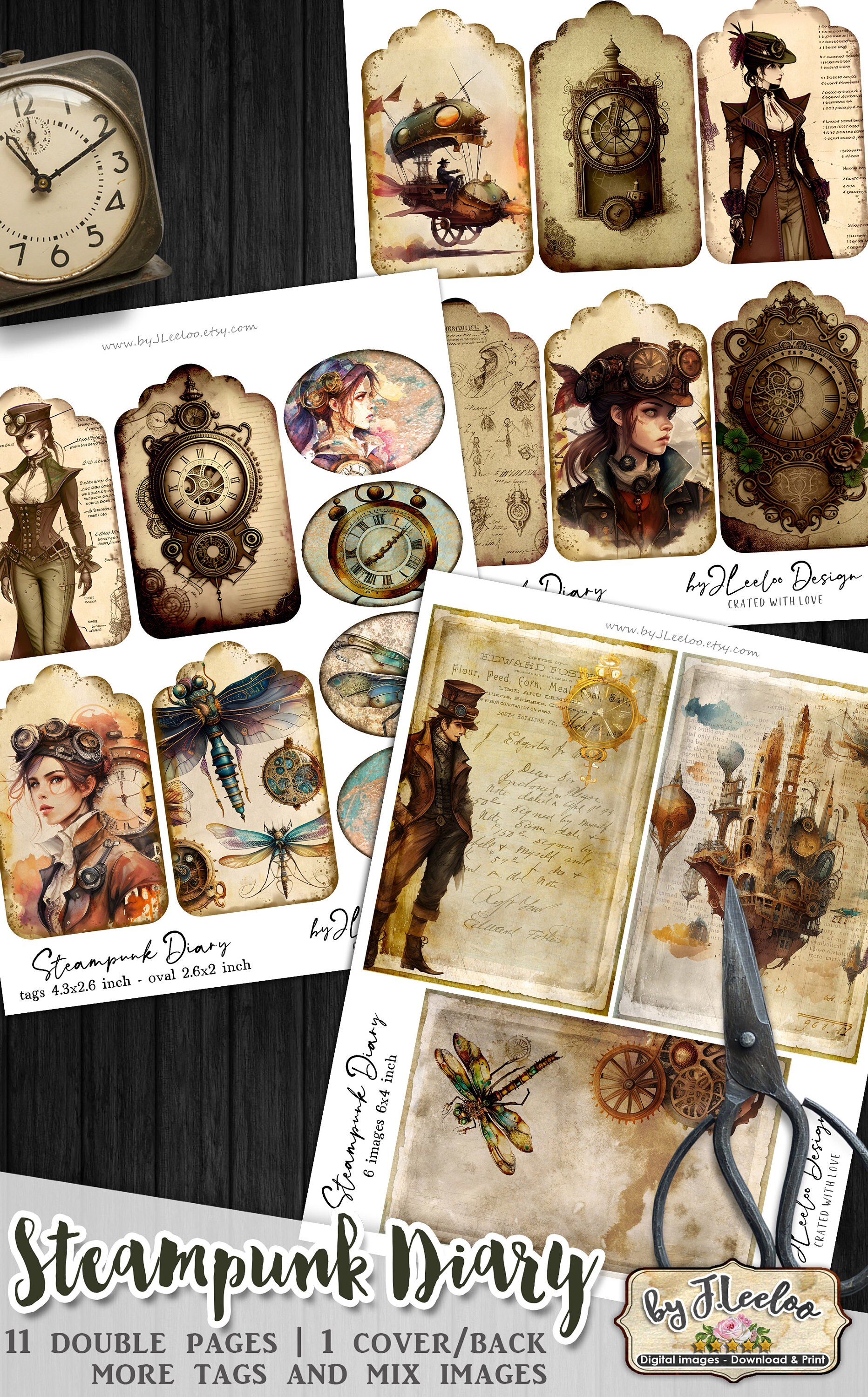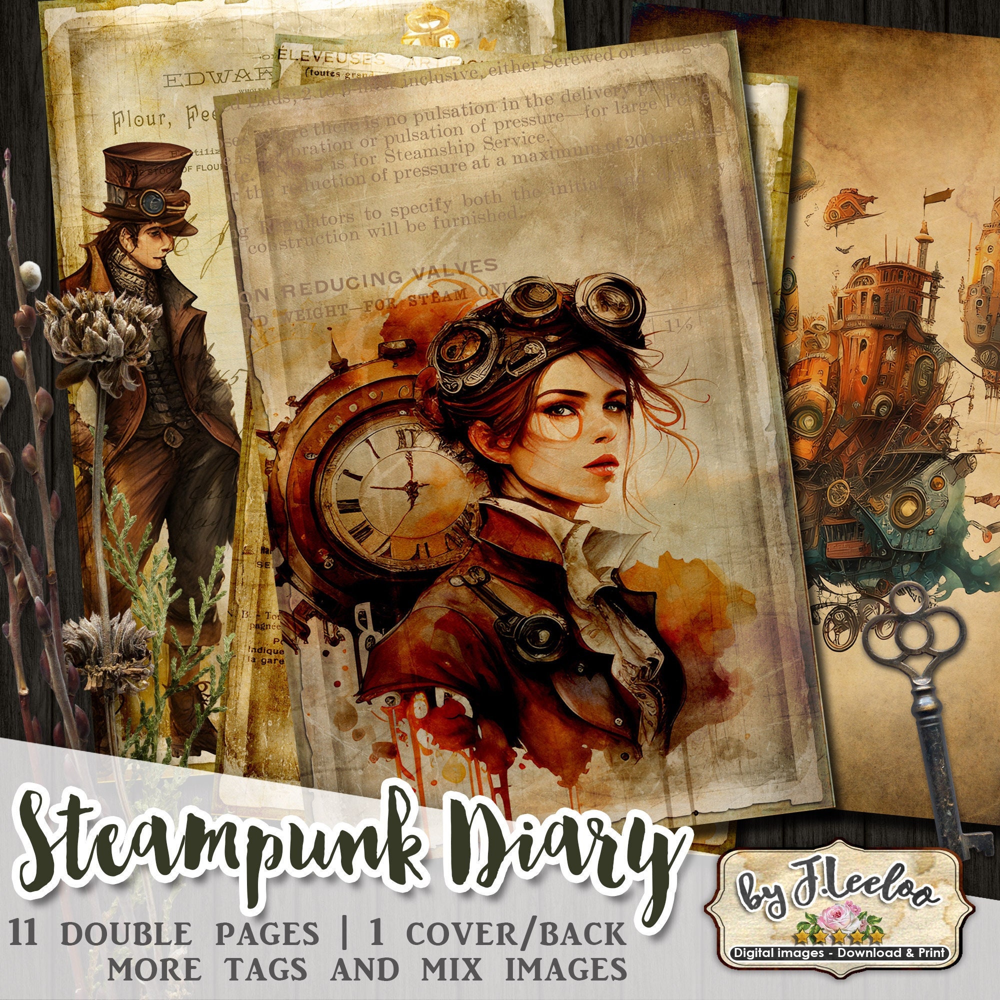 STEAMPUNK DIARY journal kit junk paper diy vintage cards tags cover square craft paper printable diary pp578