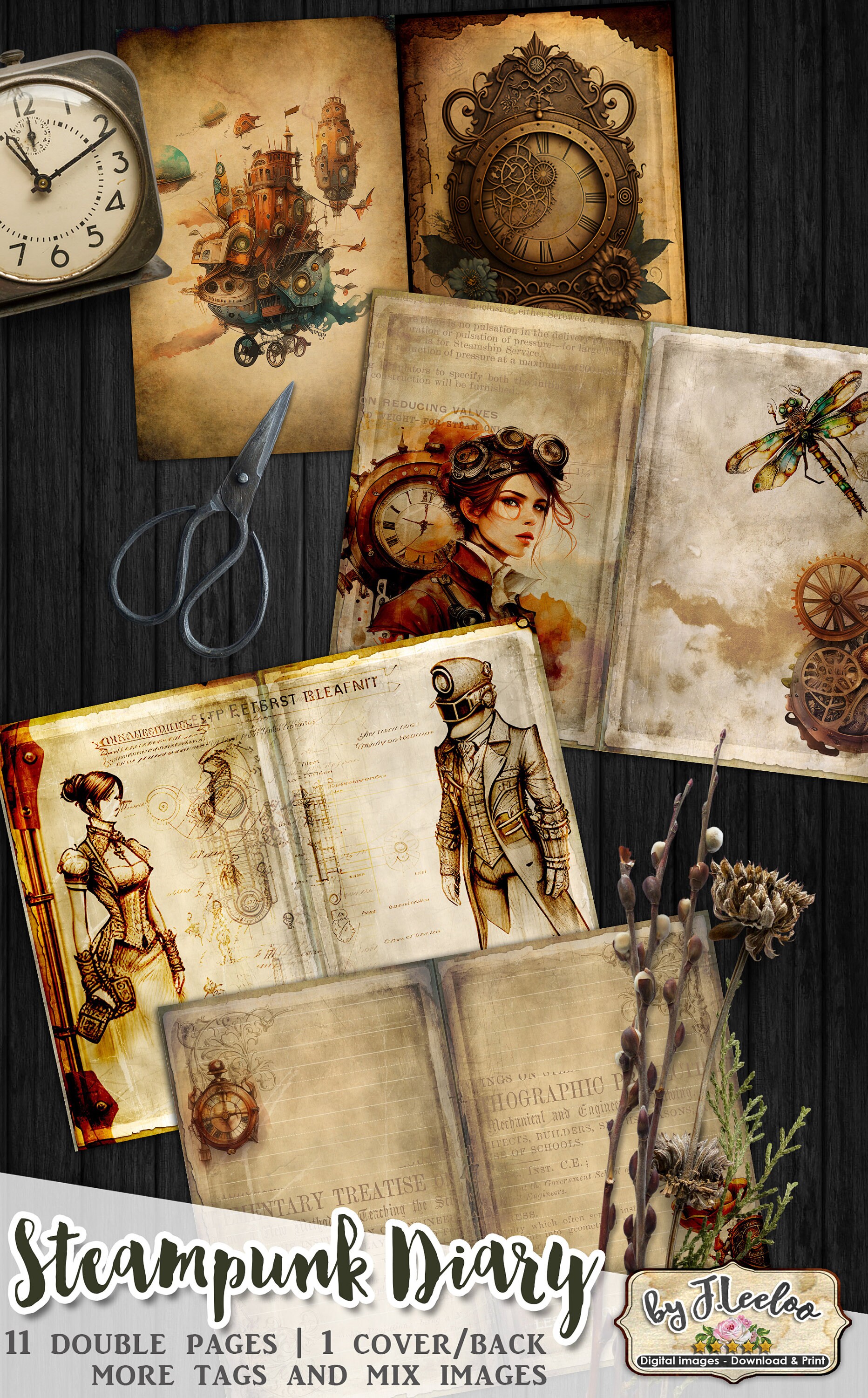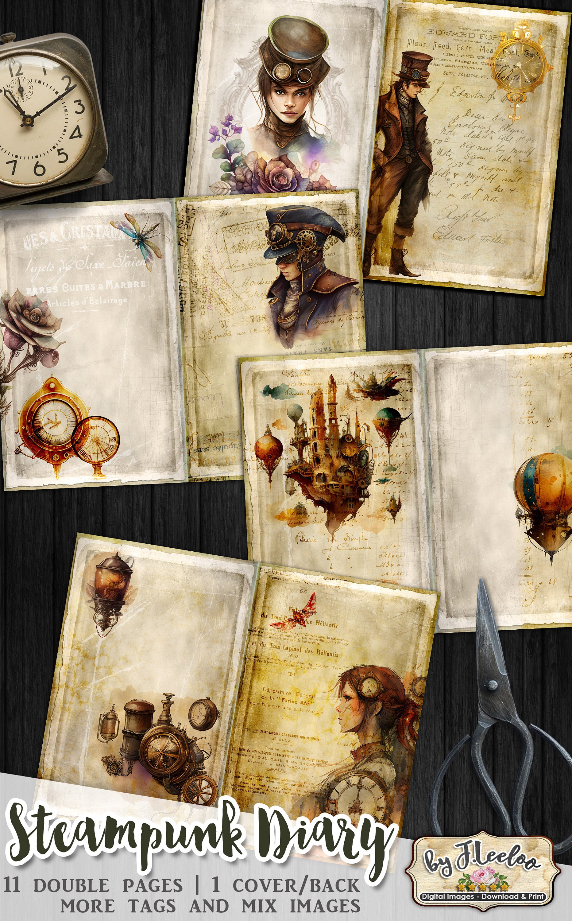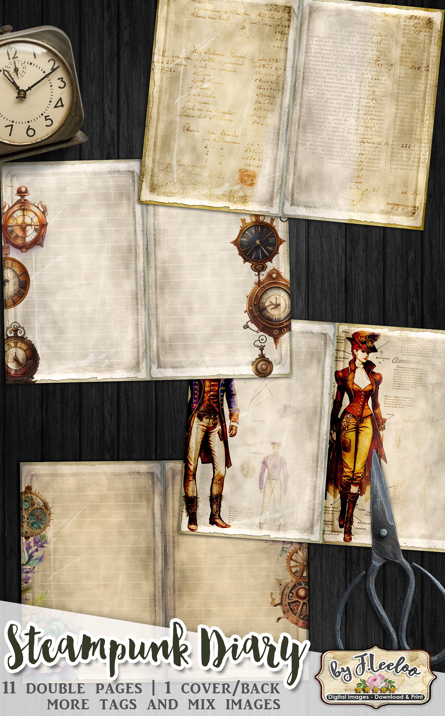 STEAMPUNK DIARY journal kit junk paper diy vintage cards tags cover square craft paper printable diary pp578