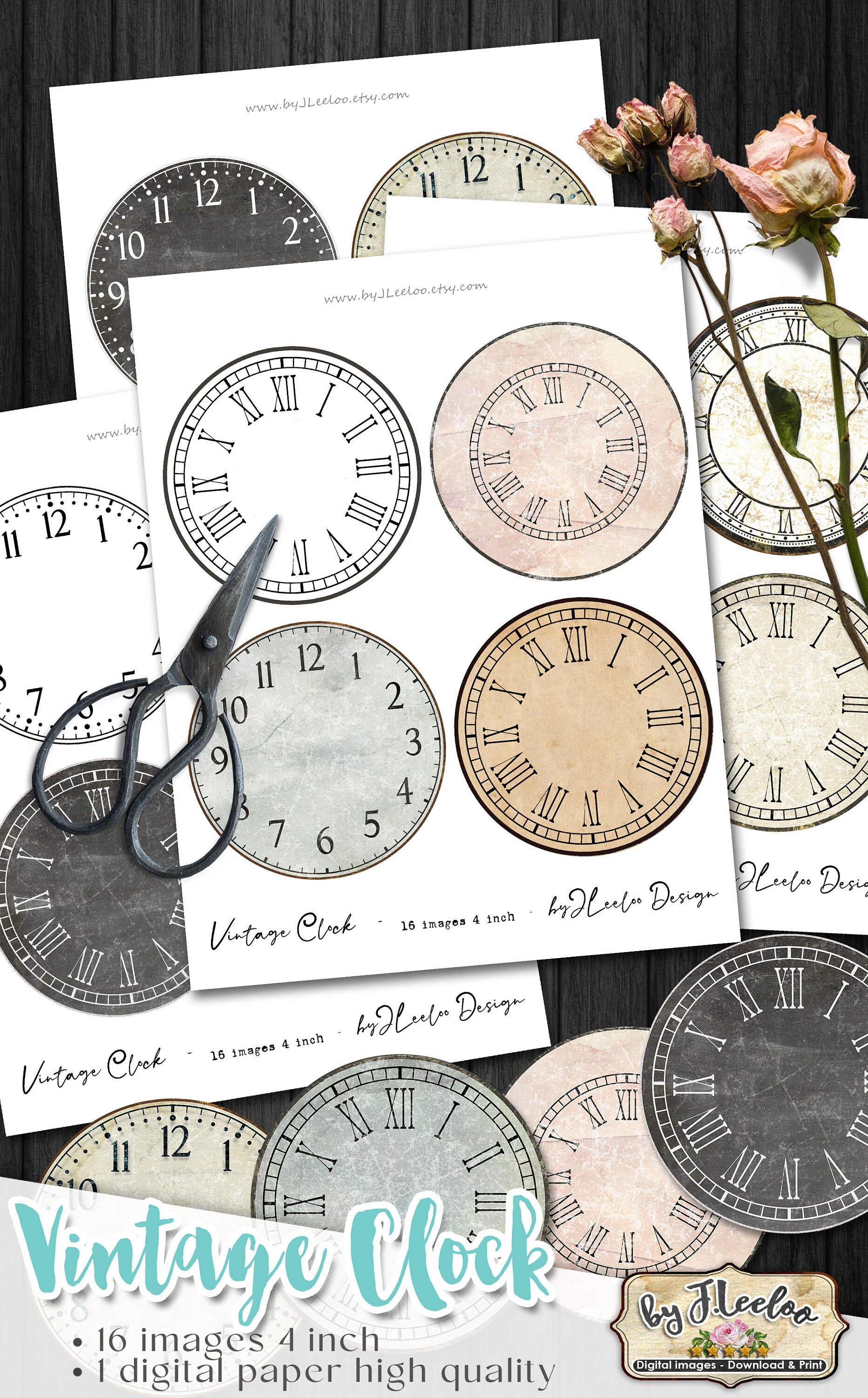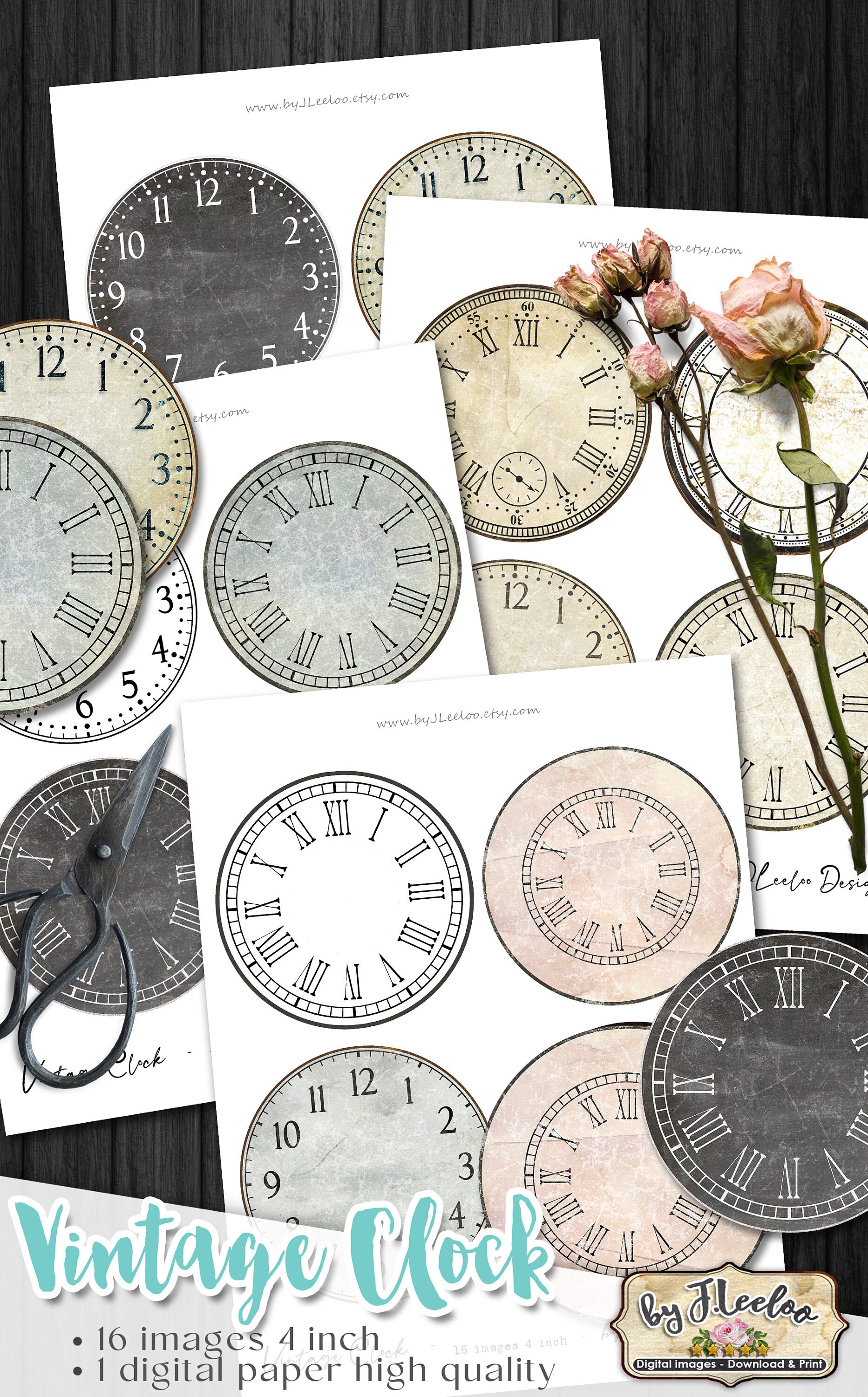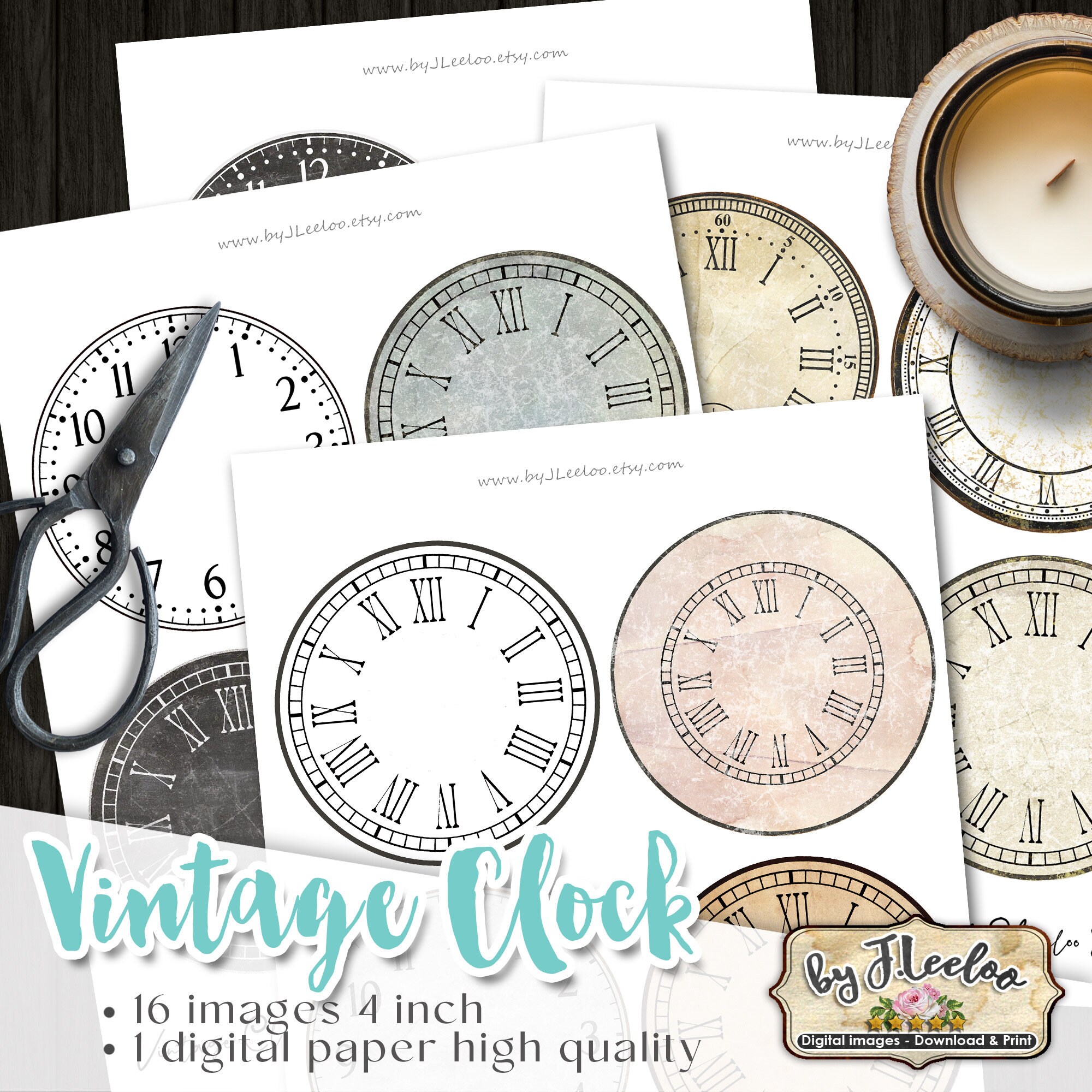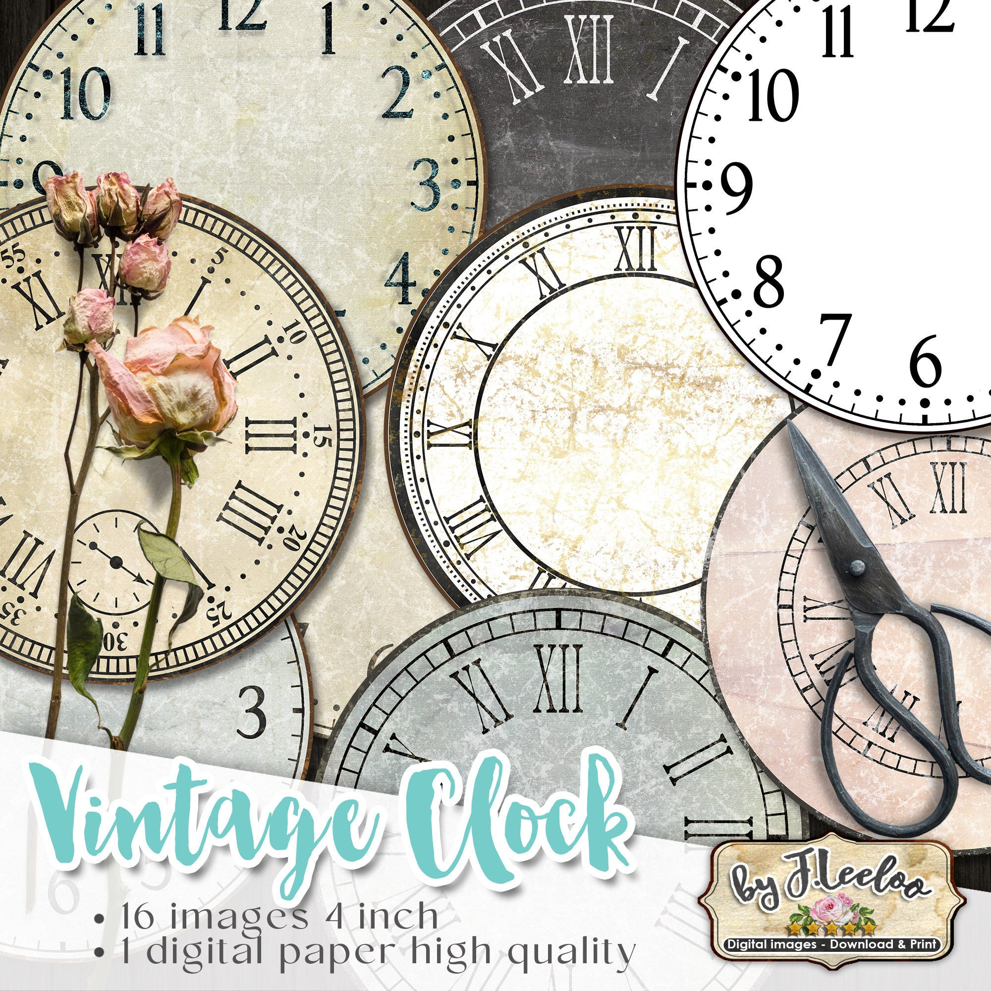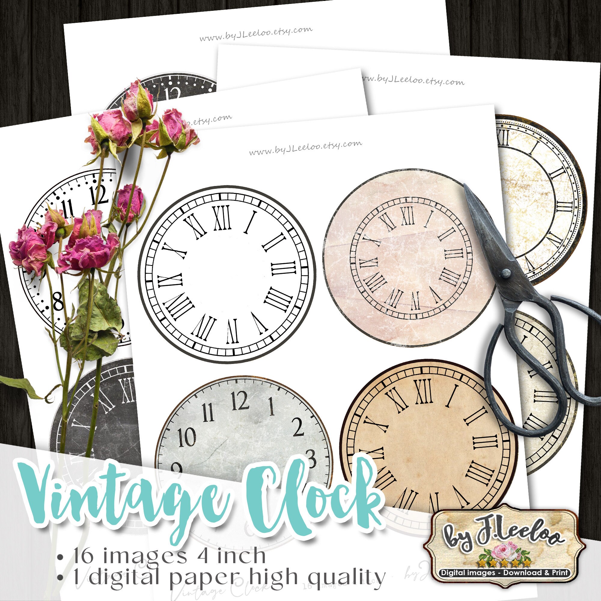 VINTAGE CLOCK Digital printable collage sheets - Clock face large images instant download ready to print for home decor, magnets, stickers, scrapbook and your others craft project.
