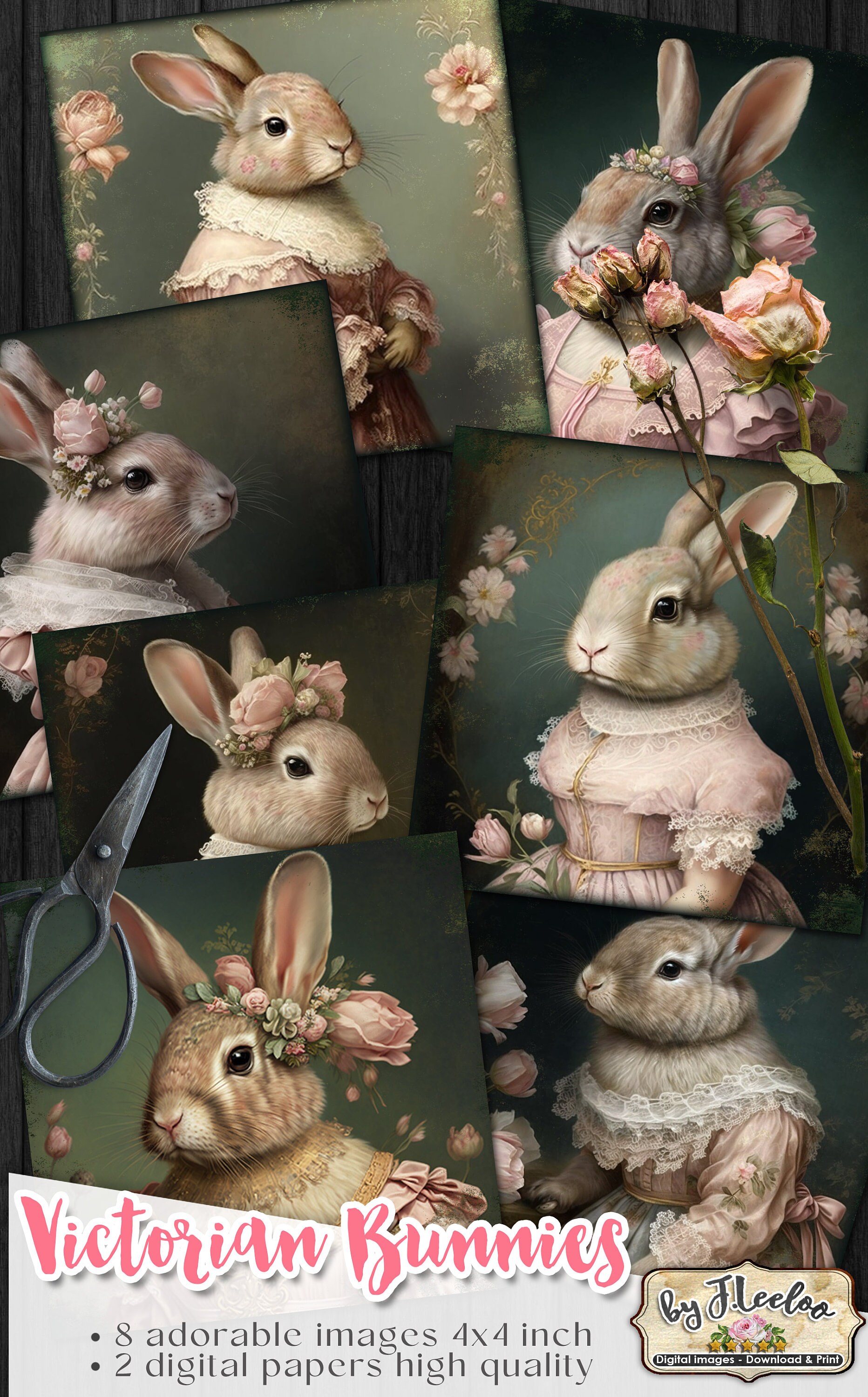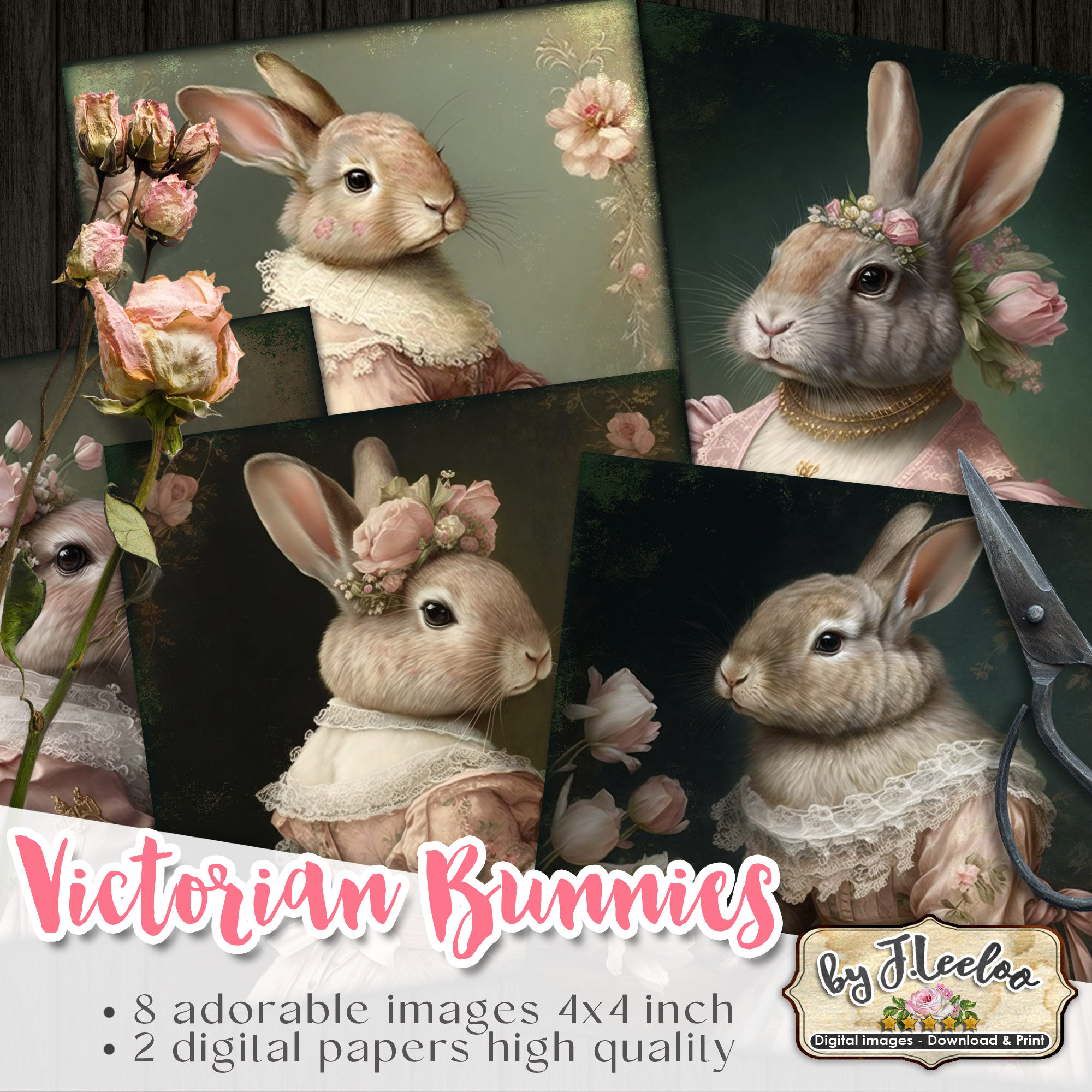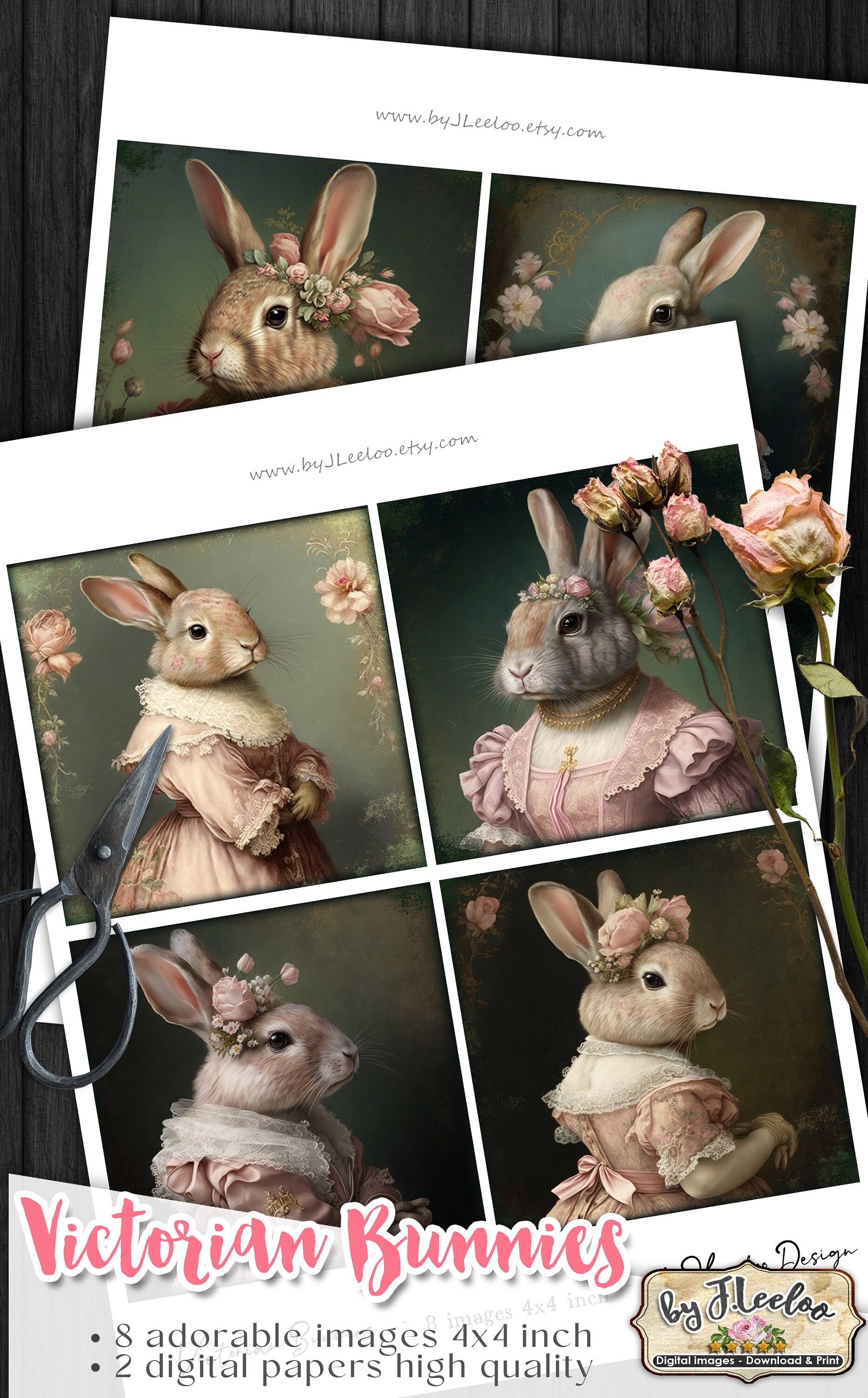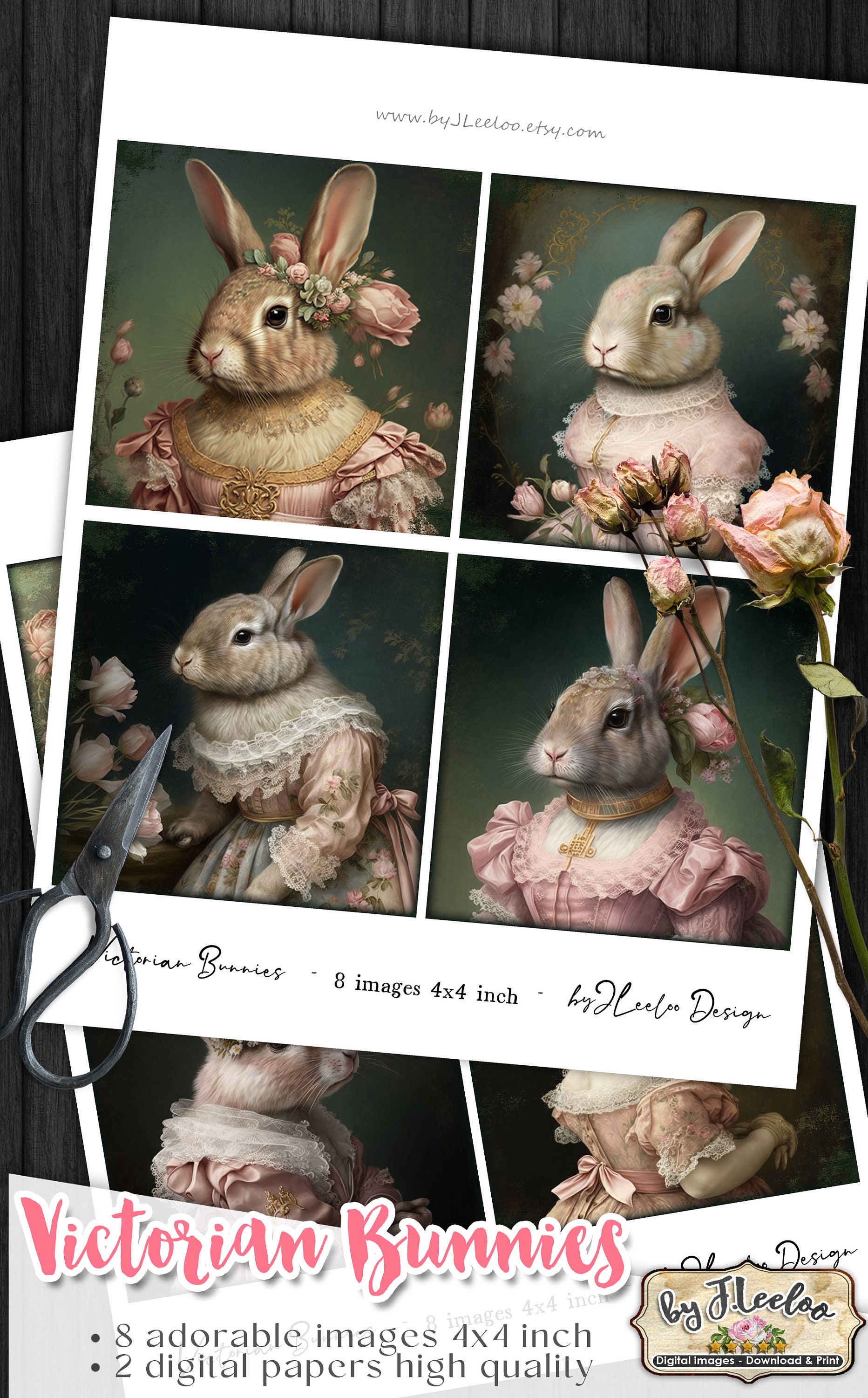 VICTORIAN BUNNIES 4x4 inch anthropomorphic in pink dress rabbit printable journal diy for coaster, thank you cards or hang tags, your jewelry making, resin pendants, rings, earrings and button, for magnets, stickers, scrapbook and your others craft project.