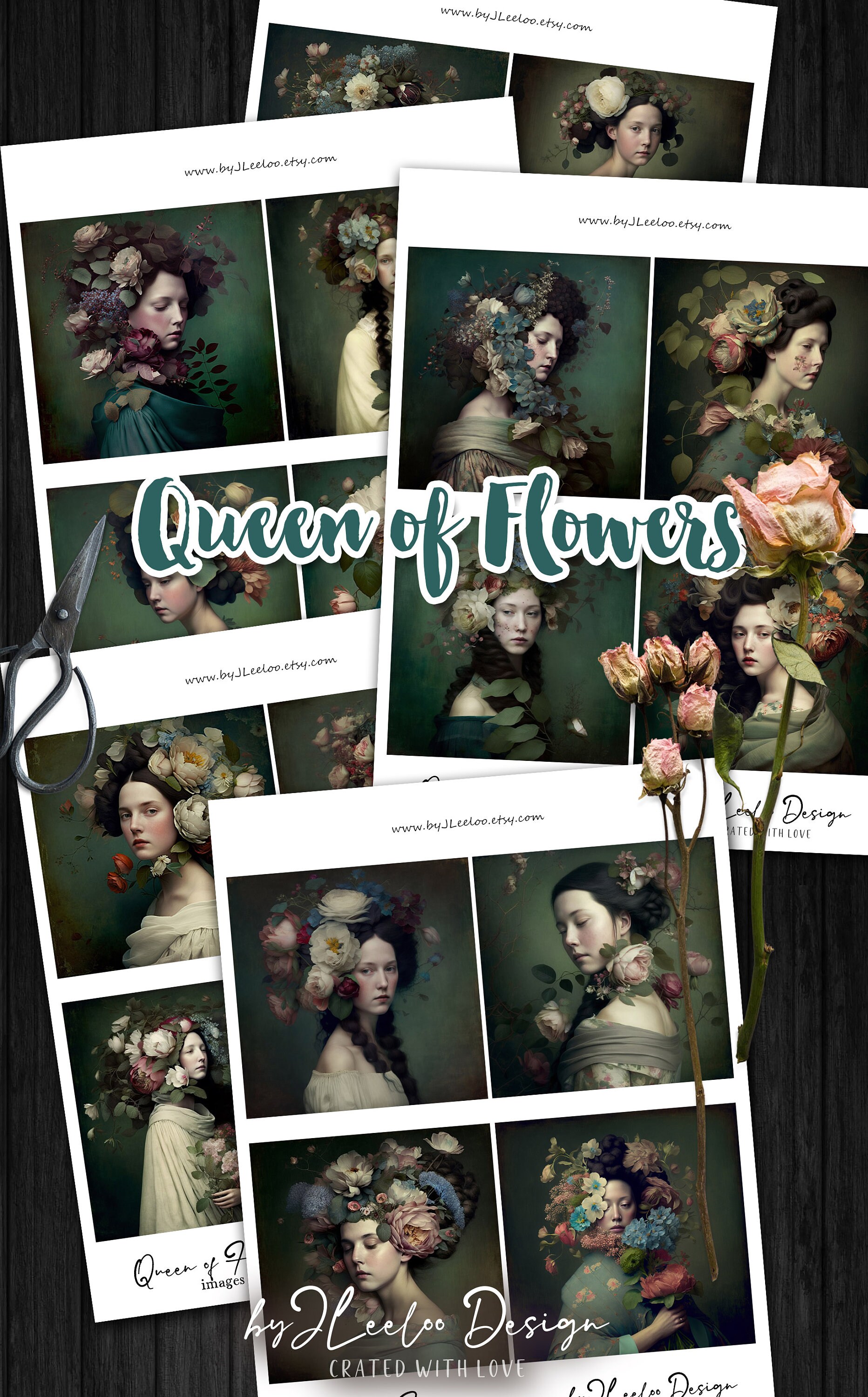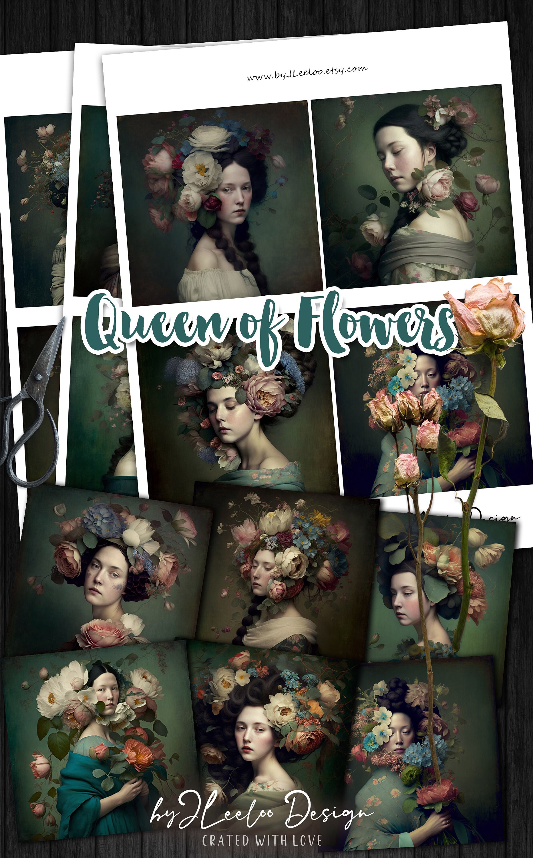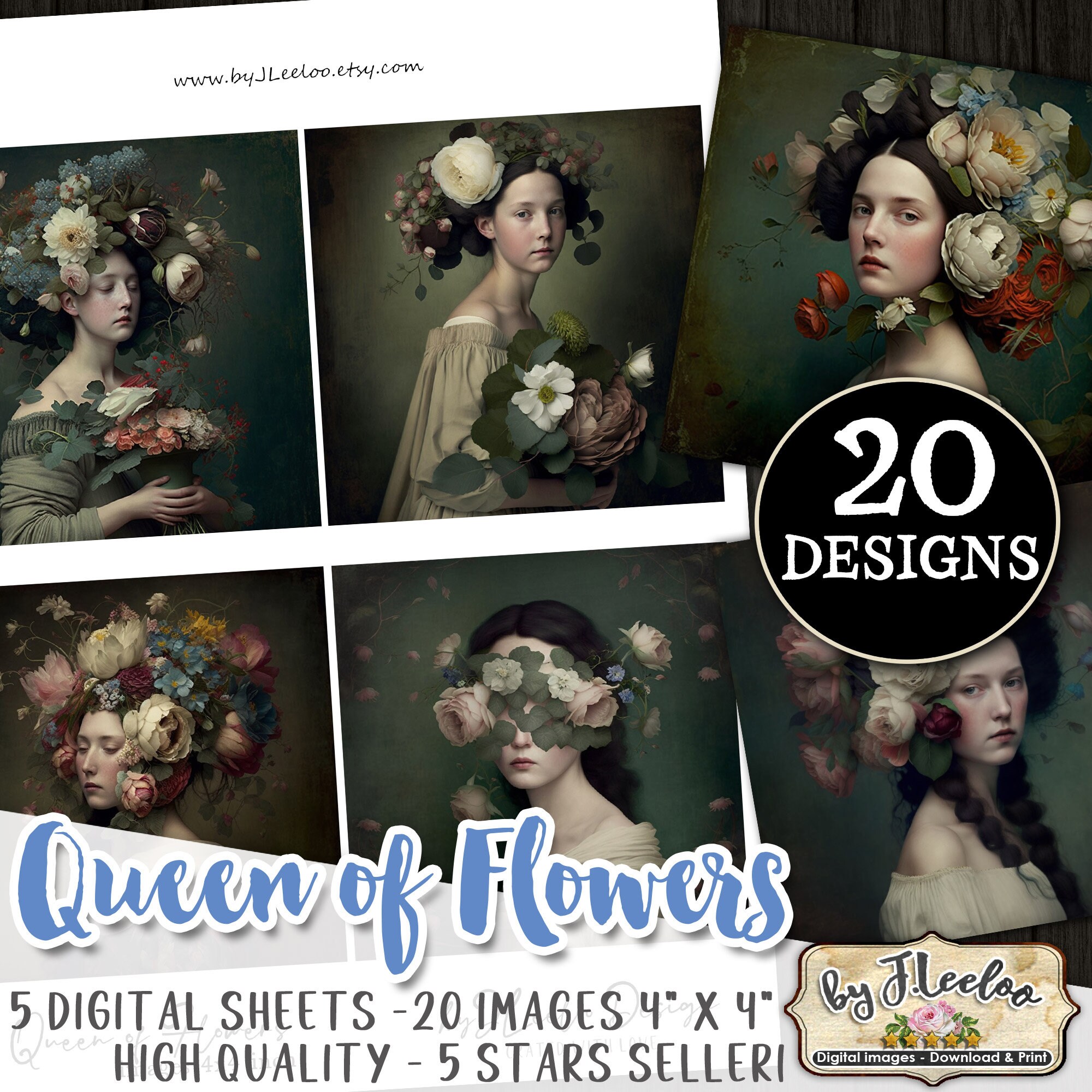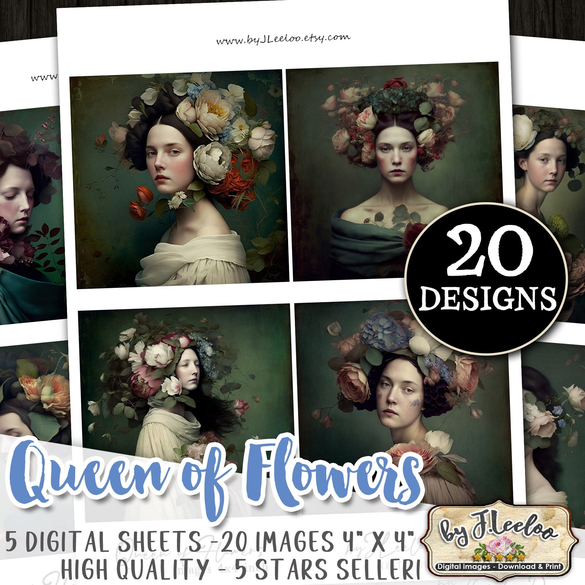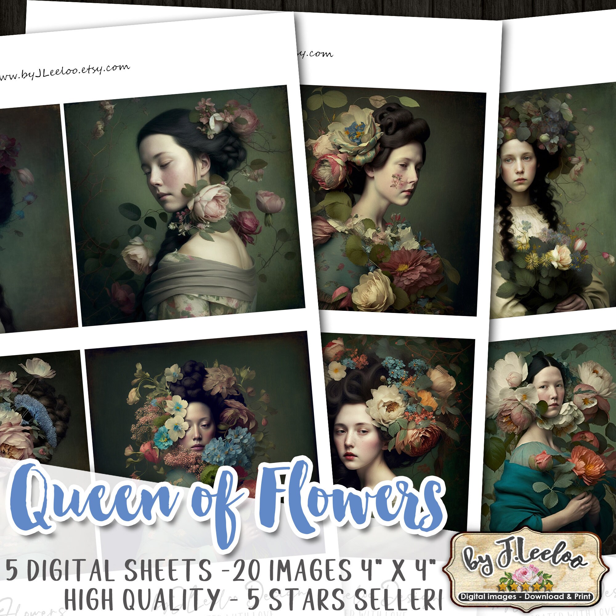 QUEEN of FLOWERS 4x4 inch 20 cards for coaster hang tag magnet journal DIY scrapbooking invitation | Botanical vintage documents | Digital cards for stickers, scrapbook and your others craft project.