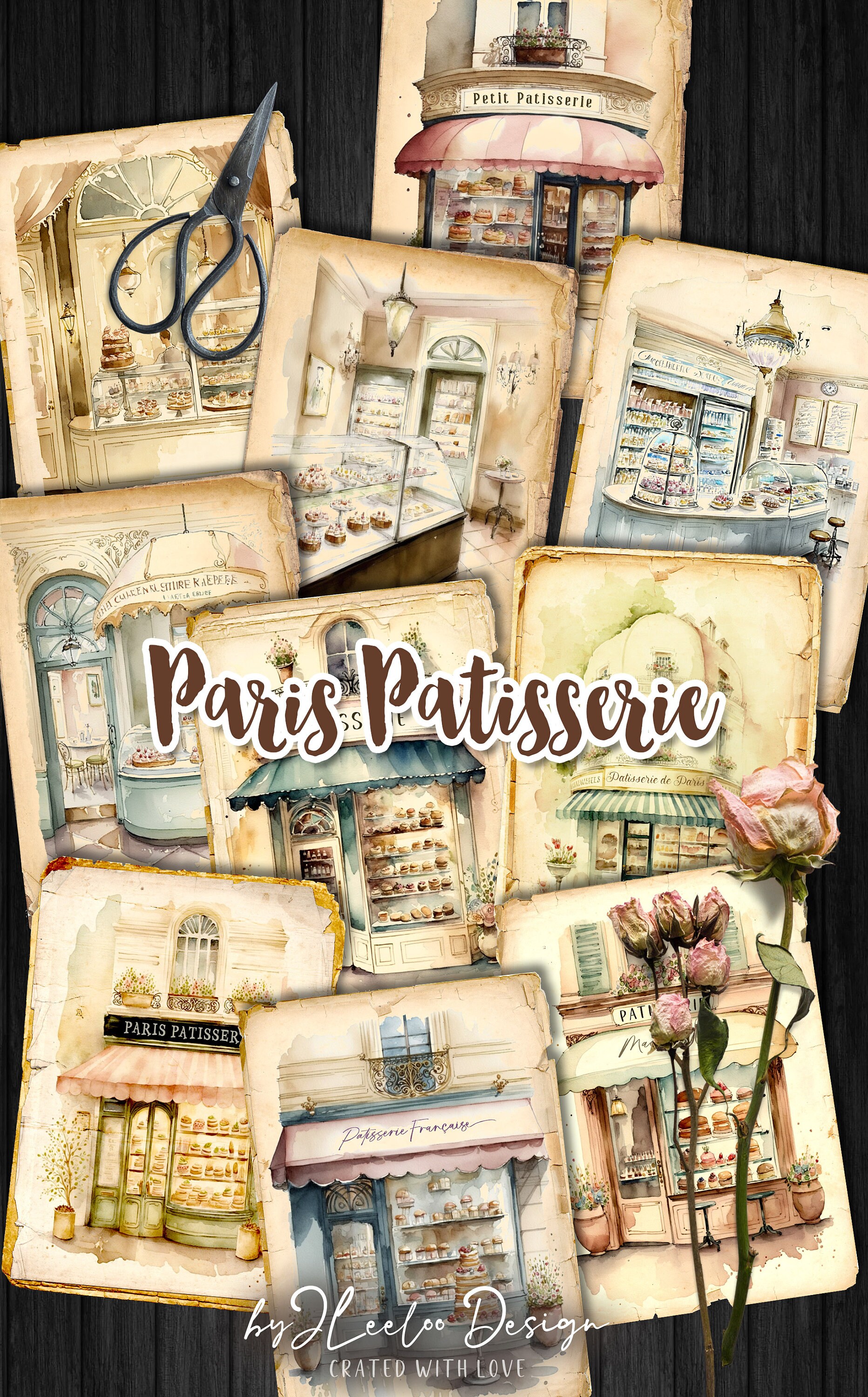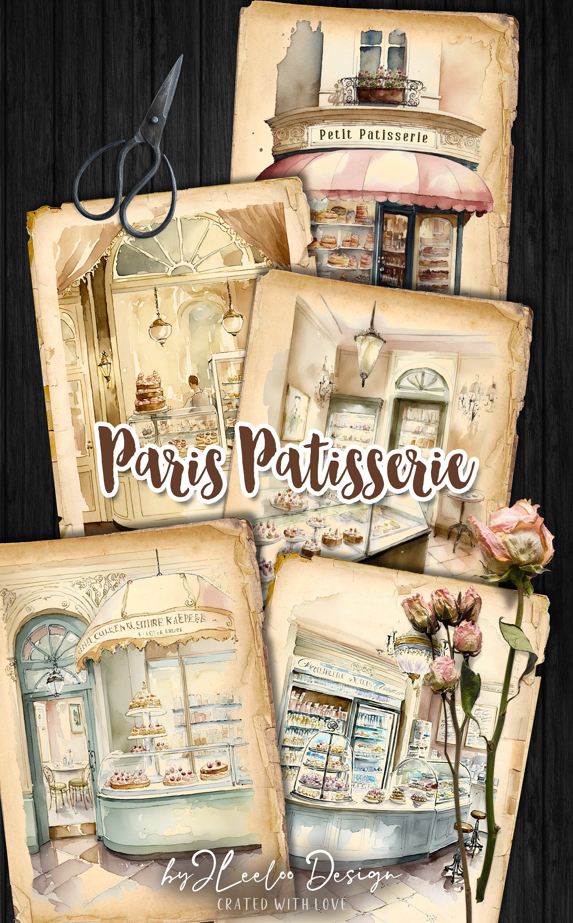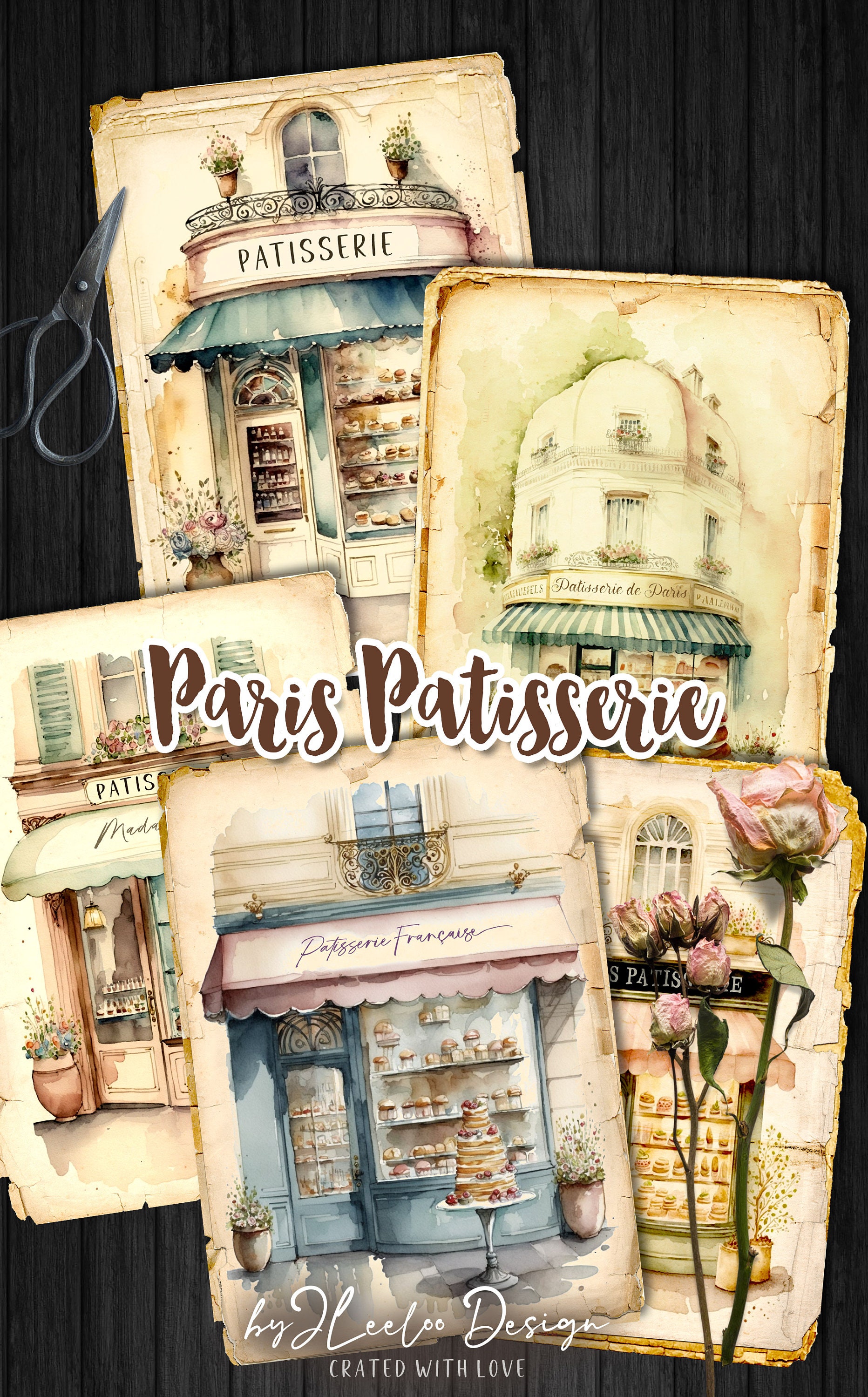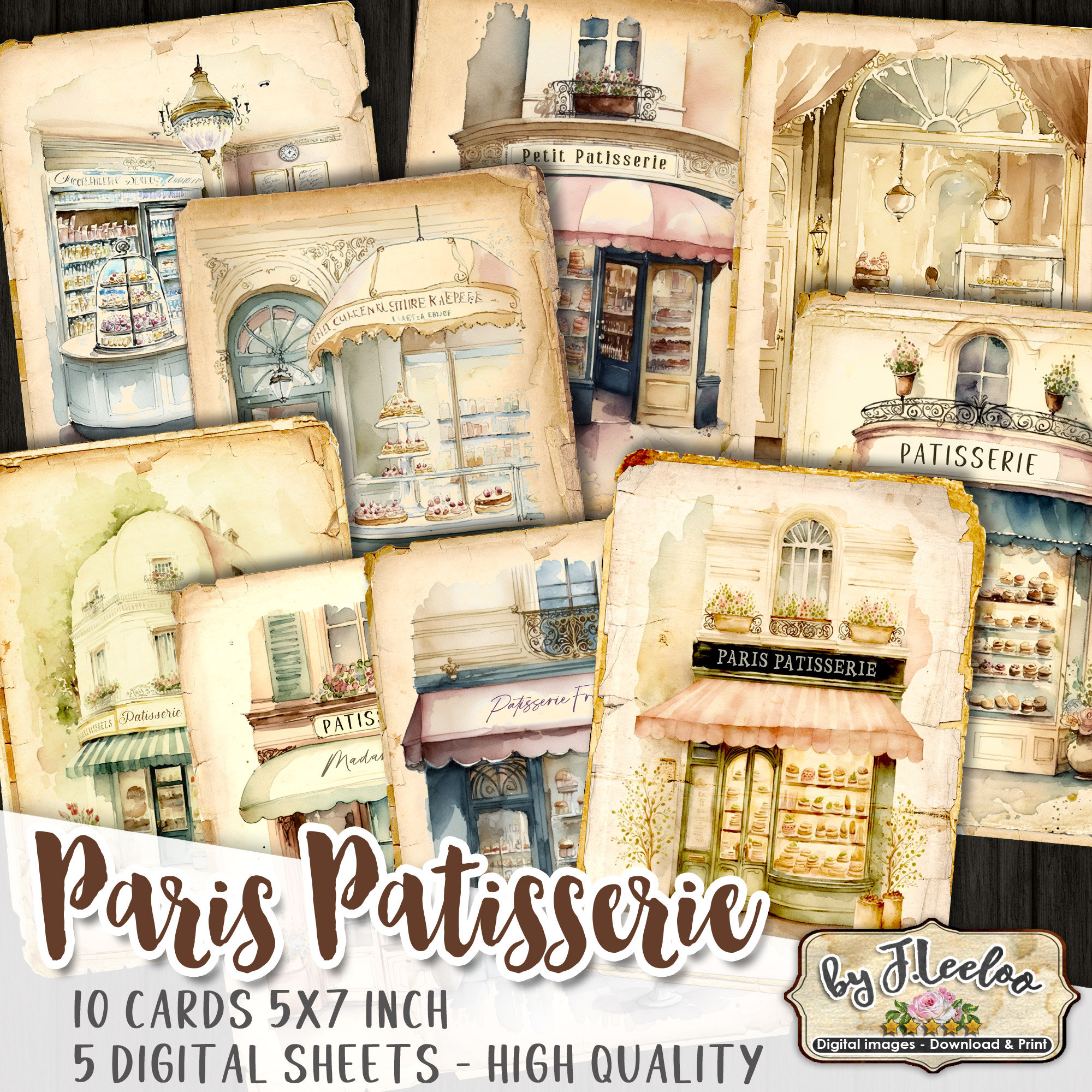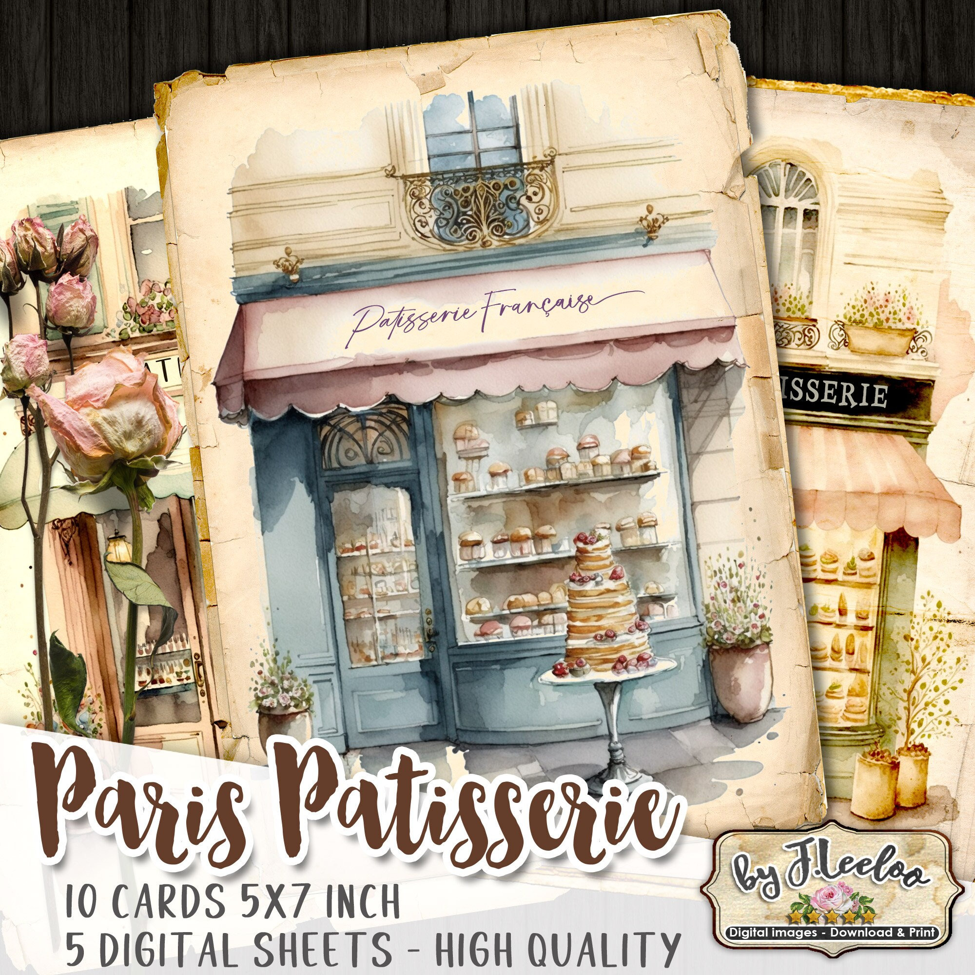 PARISIENNE PATISSERIE Cards 5x7 | Junk Journals Planner Diary | Watercolors Romantic Paris France | Supplies Scrapbooking Ephemera | pp592