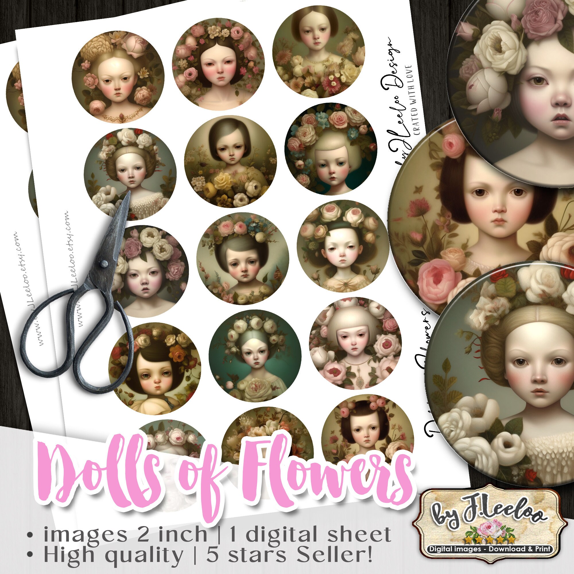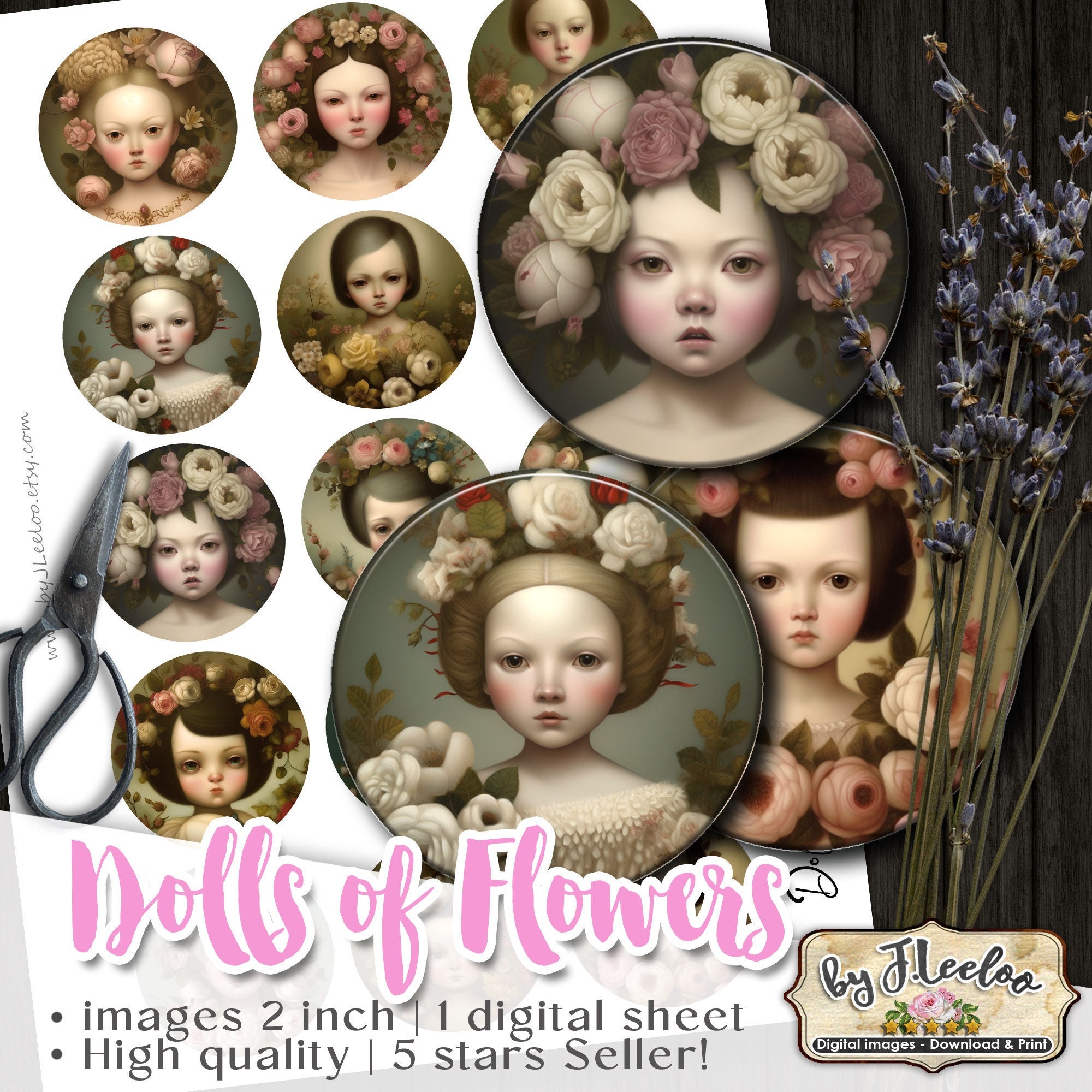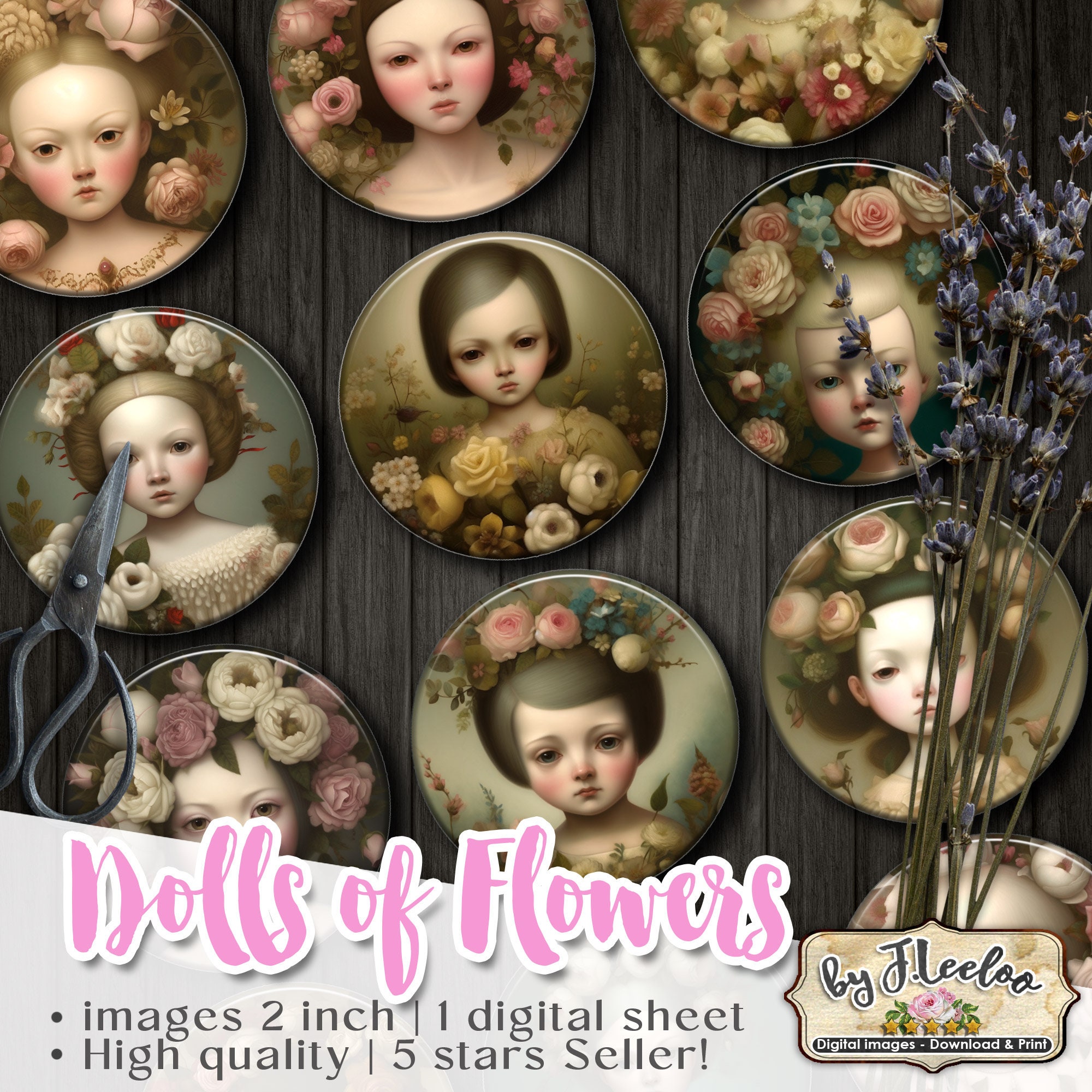 DOLLS of FLOWERS strange rounds pendants | romantic portrait | printable digital images | flower chic vintage | instant download tn641