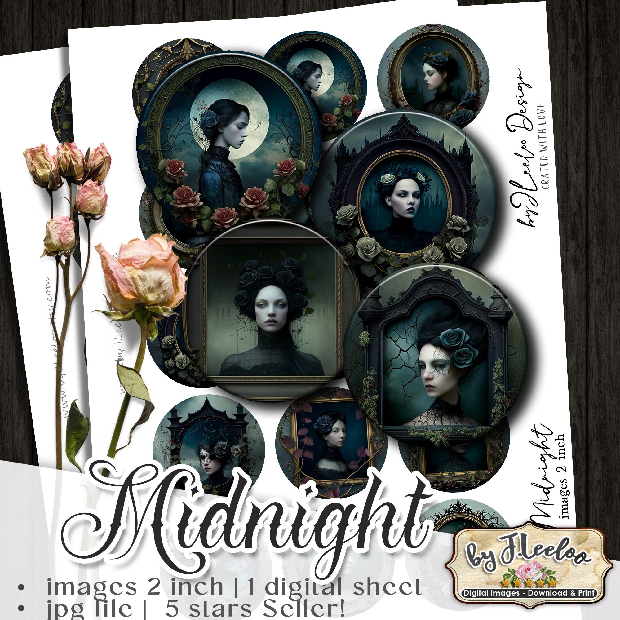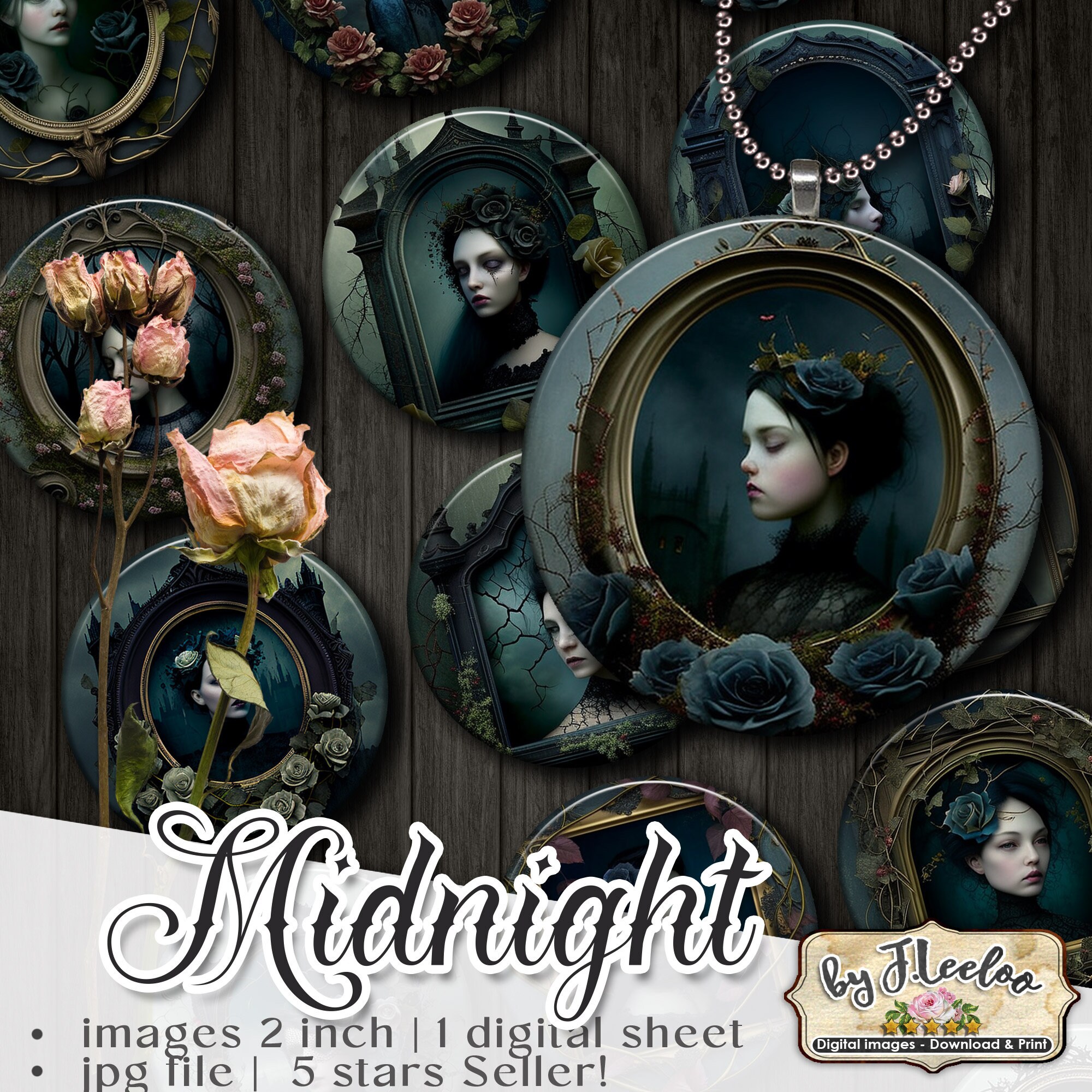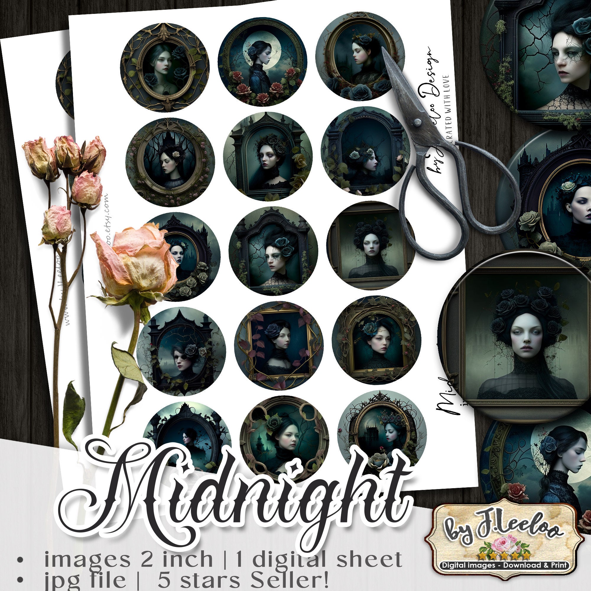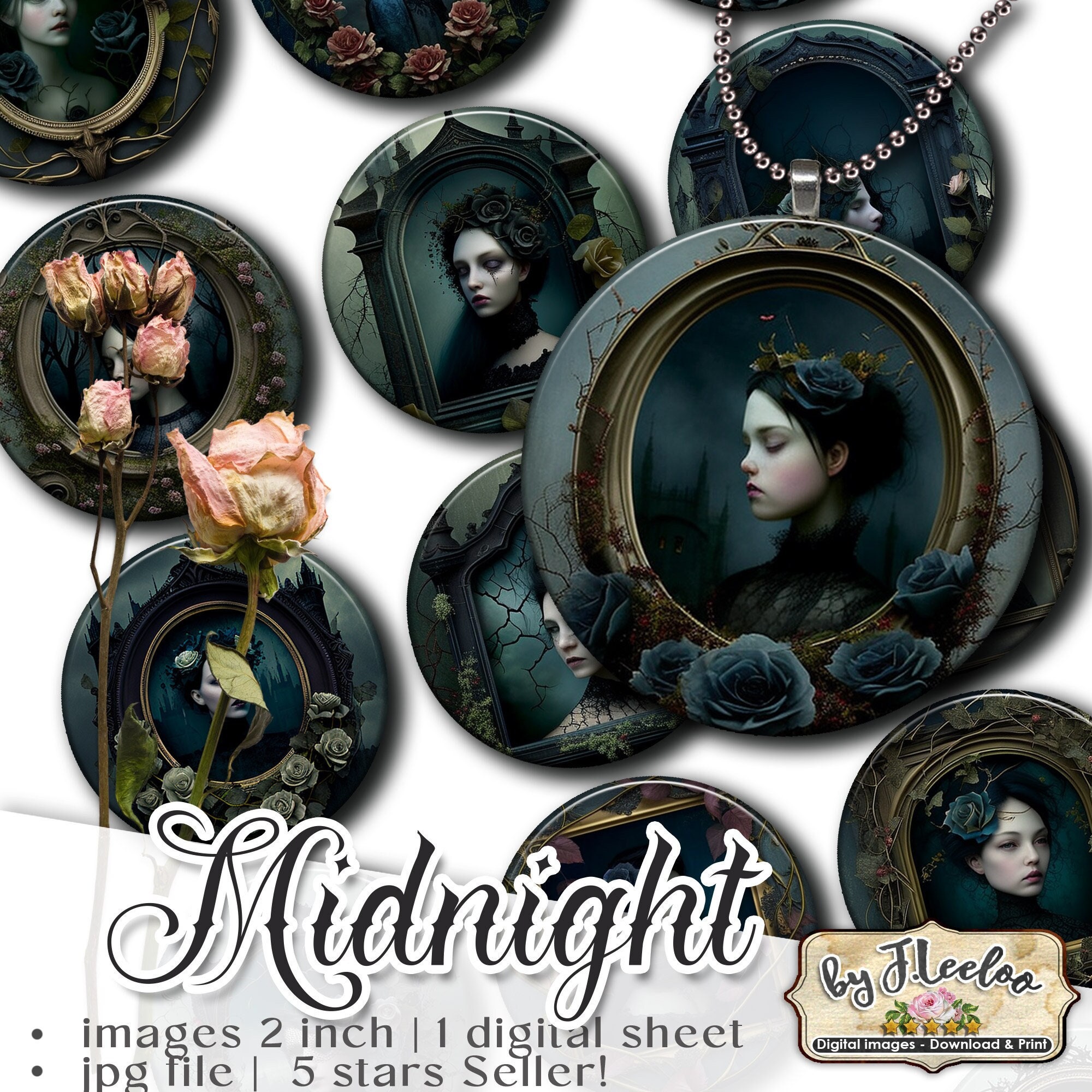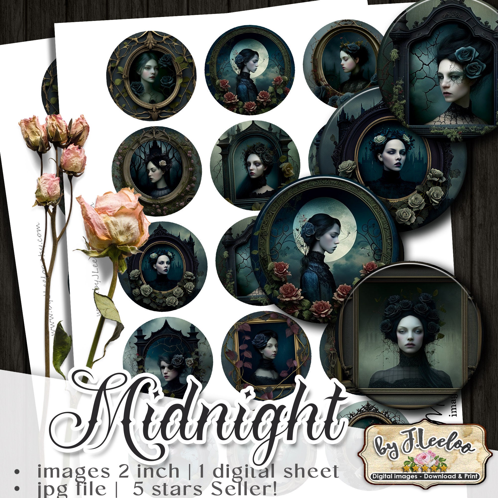 MIDNIGHT printable round pendants | gothic sheet digital images | melanconic woman | dark flower vintage | instant download