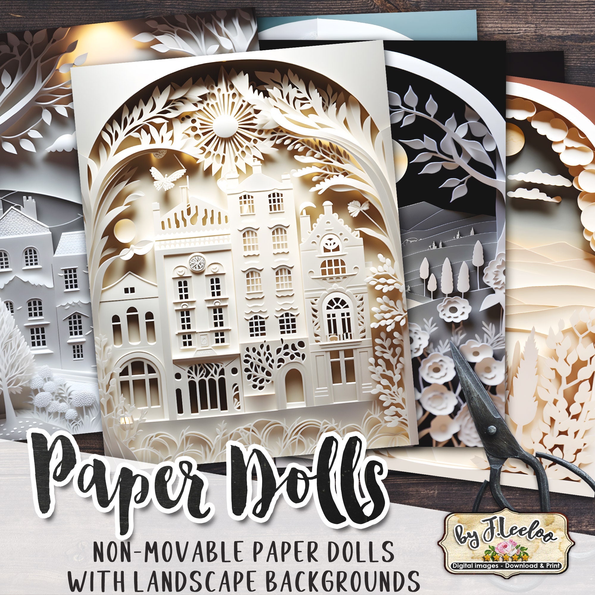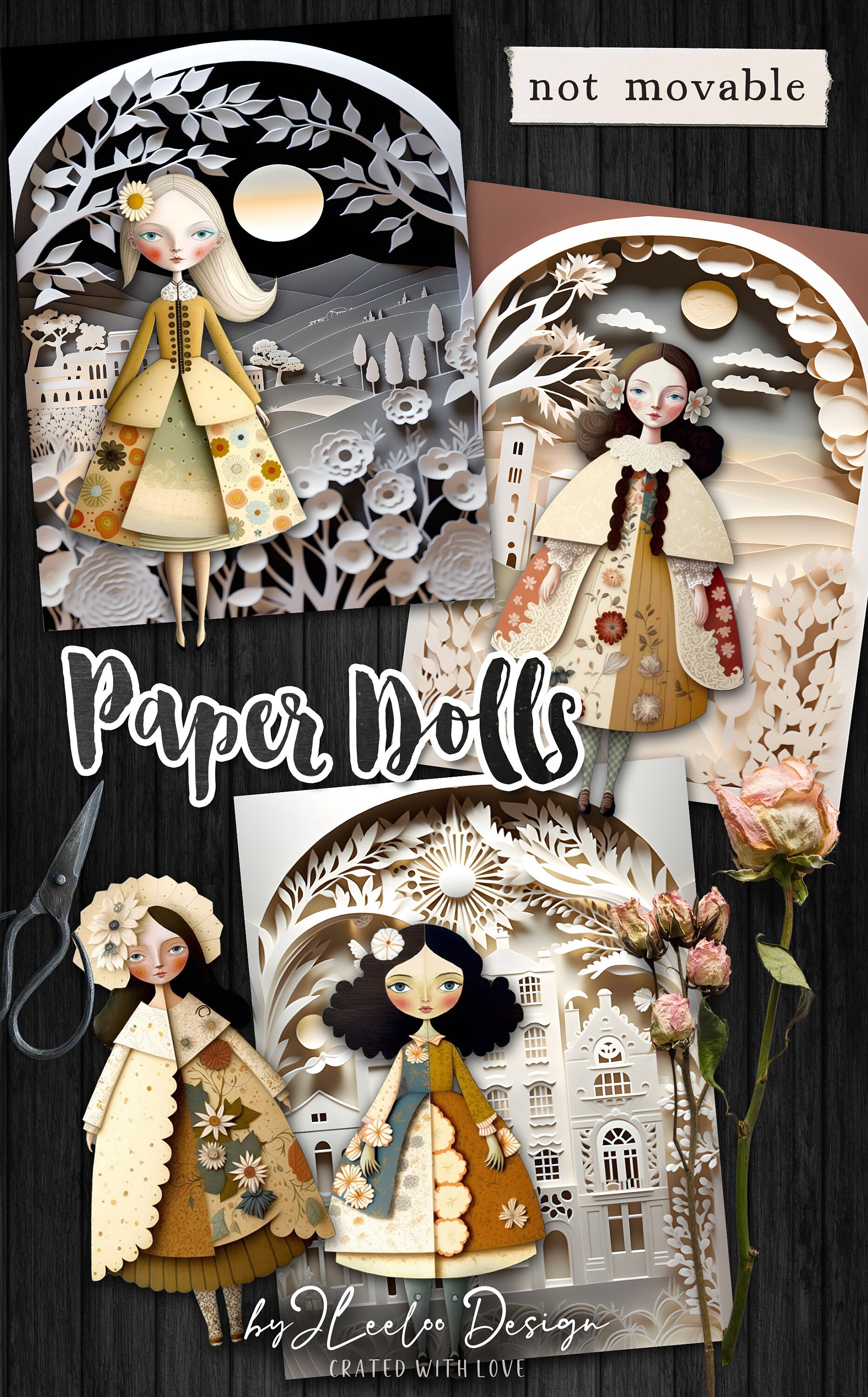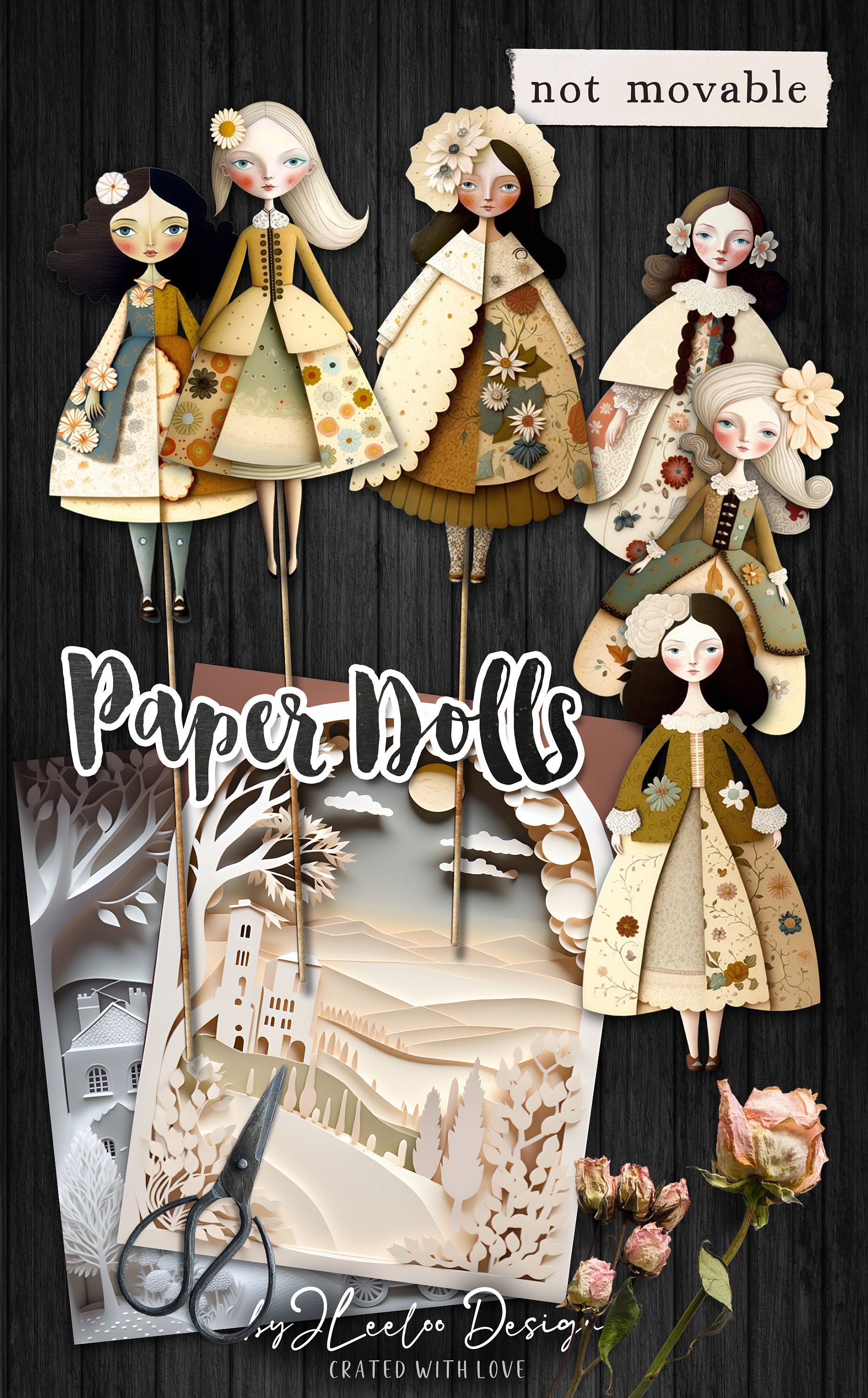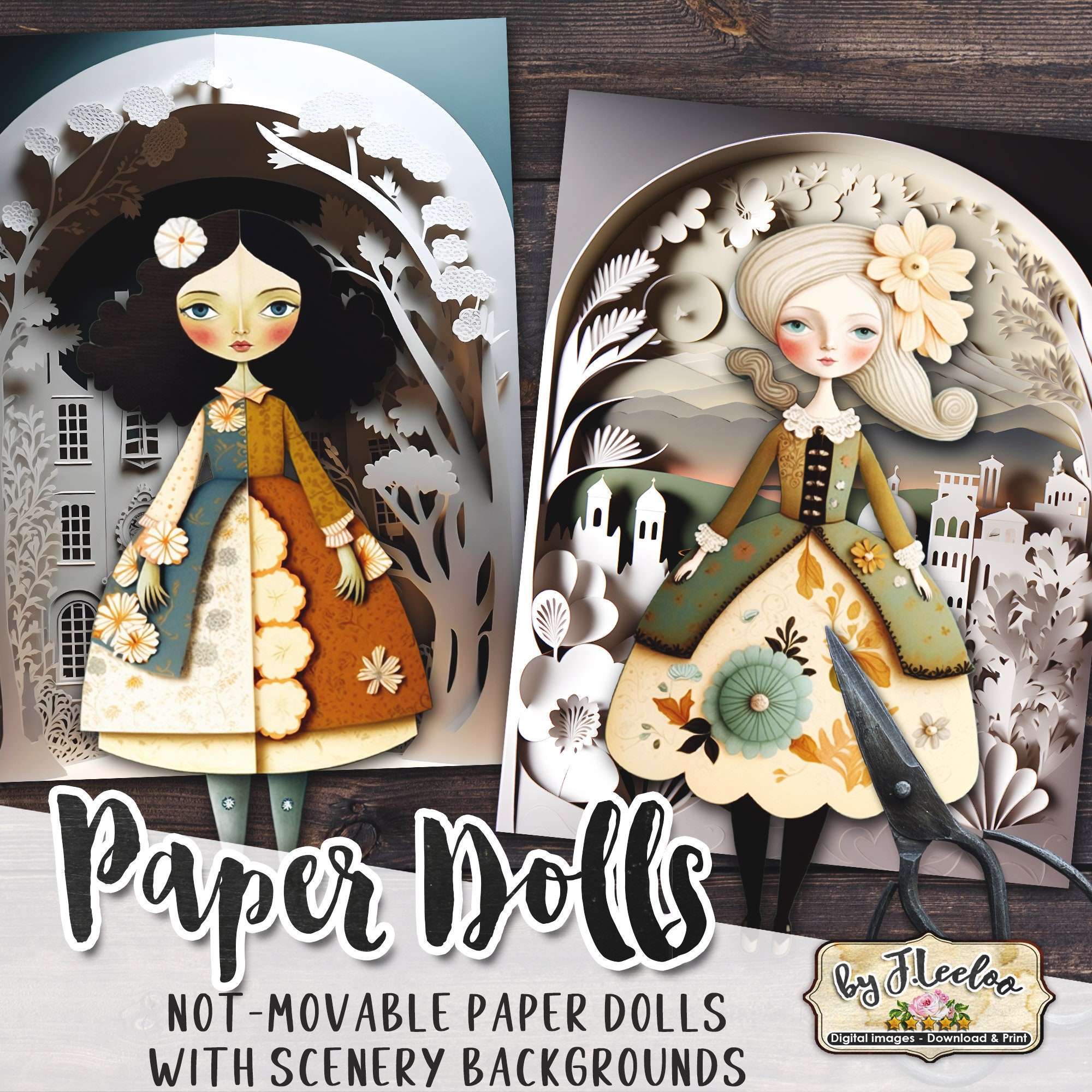 Paper dolls (not movable) with sceneries: perfect to use as junk journal ephemera, scrapbooking, collages, and more!