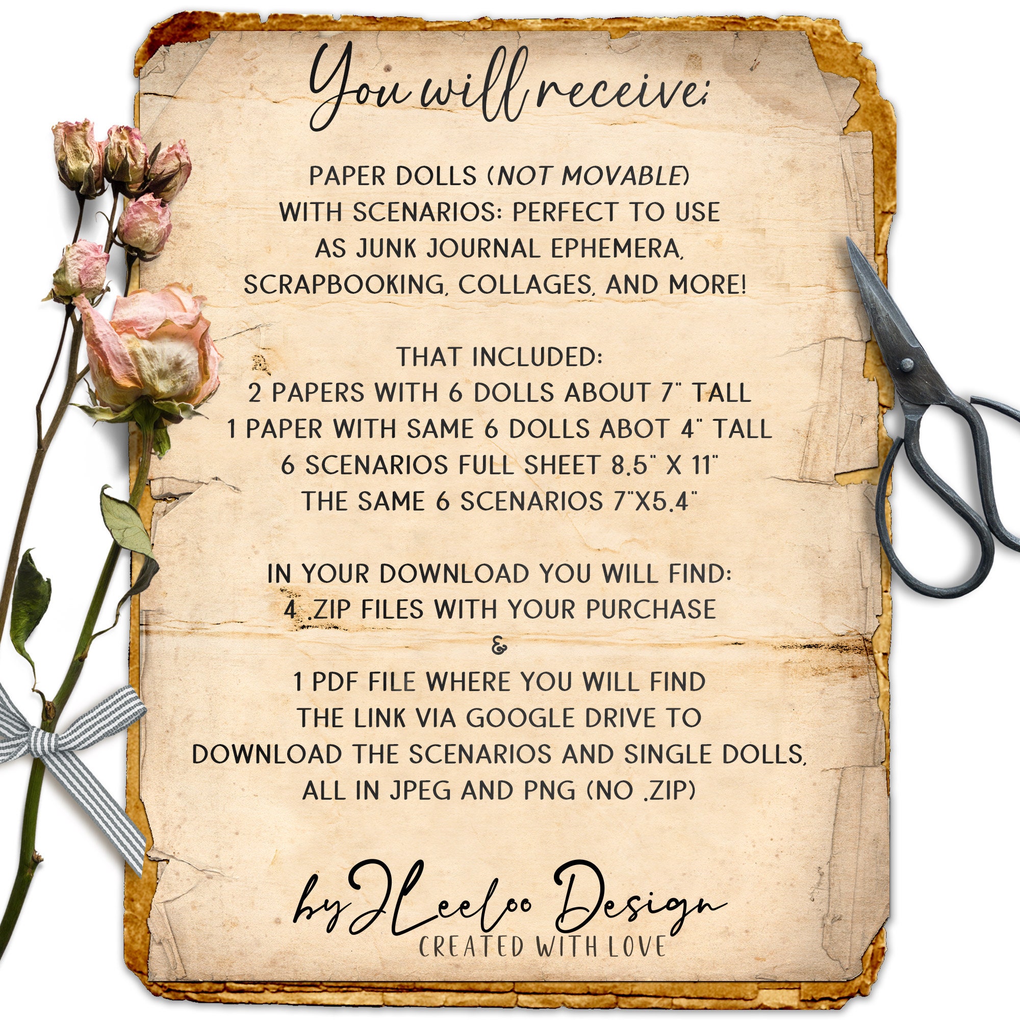 1 Pdf file where you will find the link via Google Drive to download the sceneries and single dolls, all in jpeg and png (No .zip)