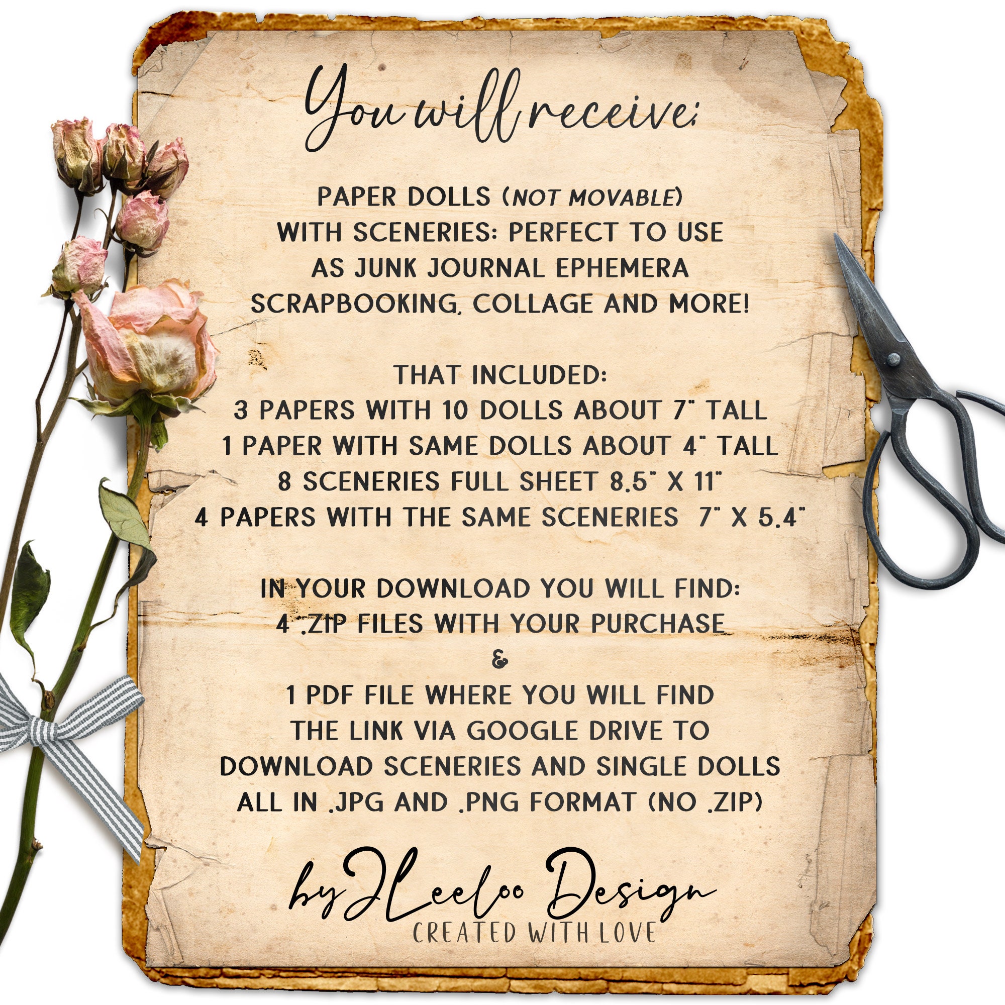1 Pdf file where you will find the link via Google Drive to download all the papers, the sceneries and single dolls, all in jpeg and png (No .zip)