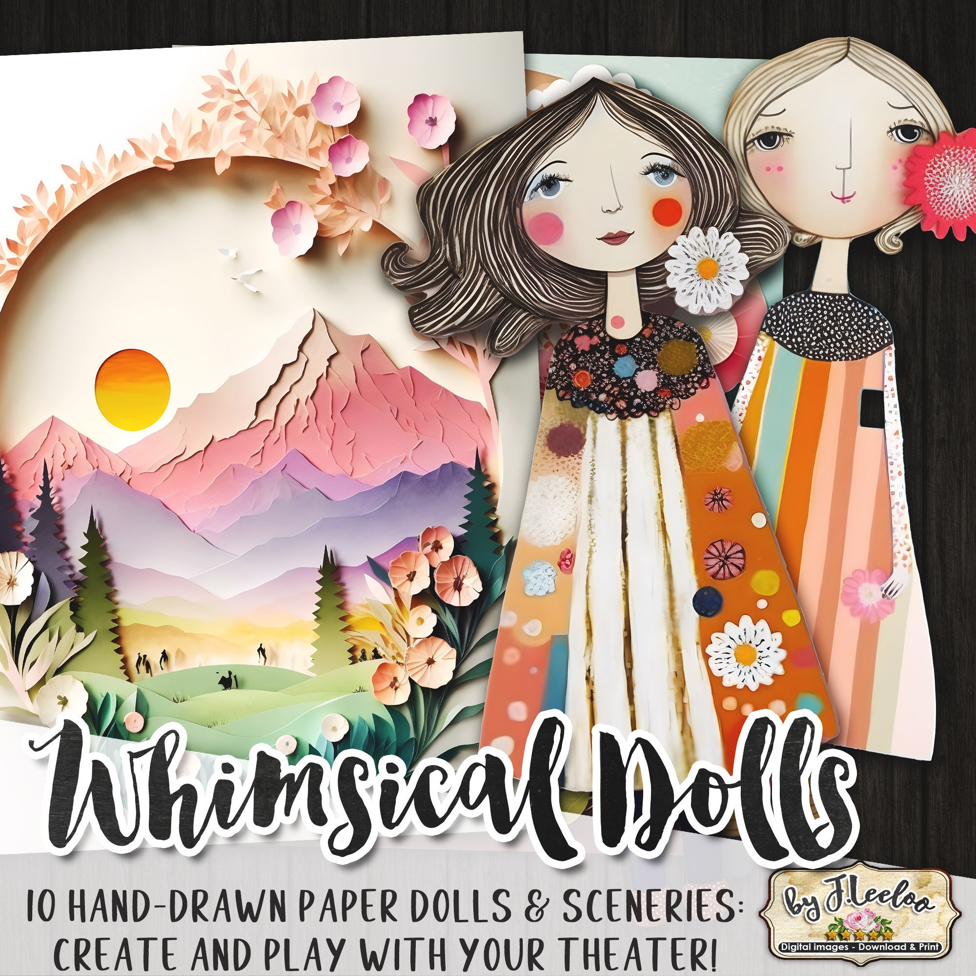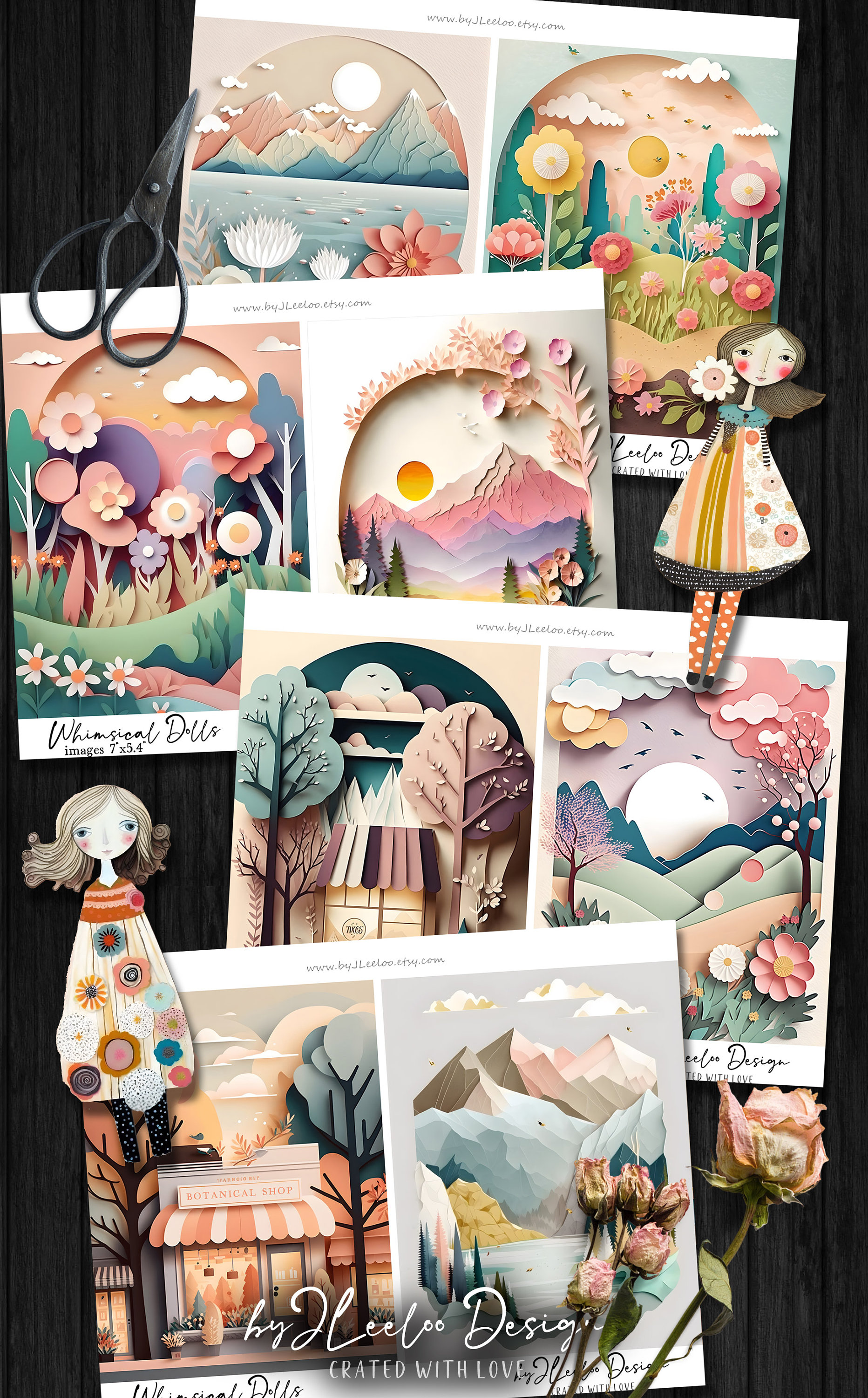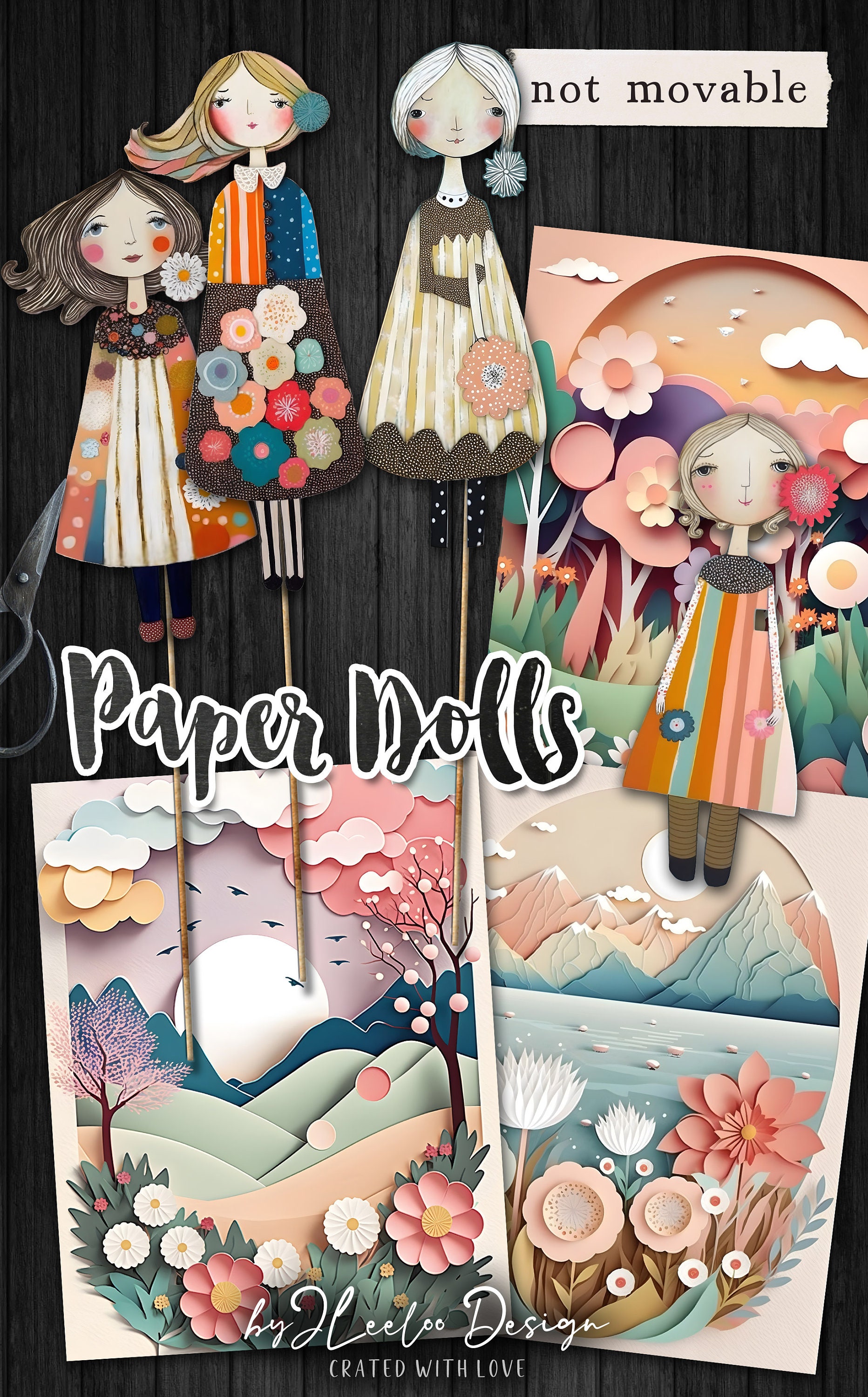 WHIMSICAL PAPER DOLLS and Sceneries printable kit junk journal cut off | Dolls journaling supplies Collage | fussy cut doll digital | pp595
