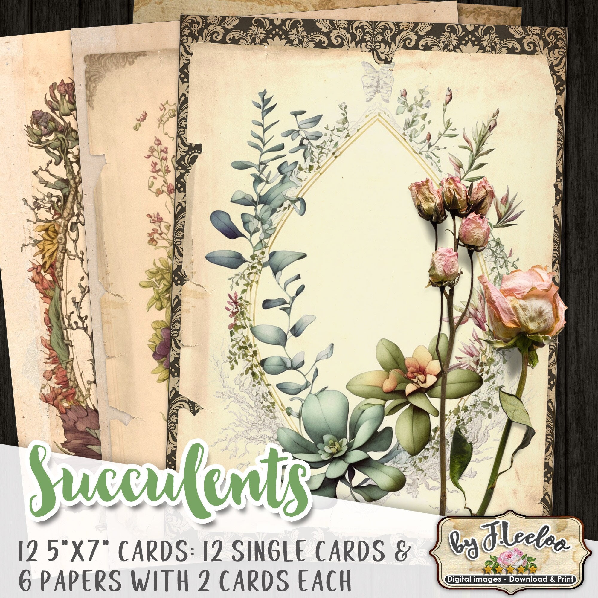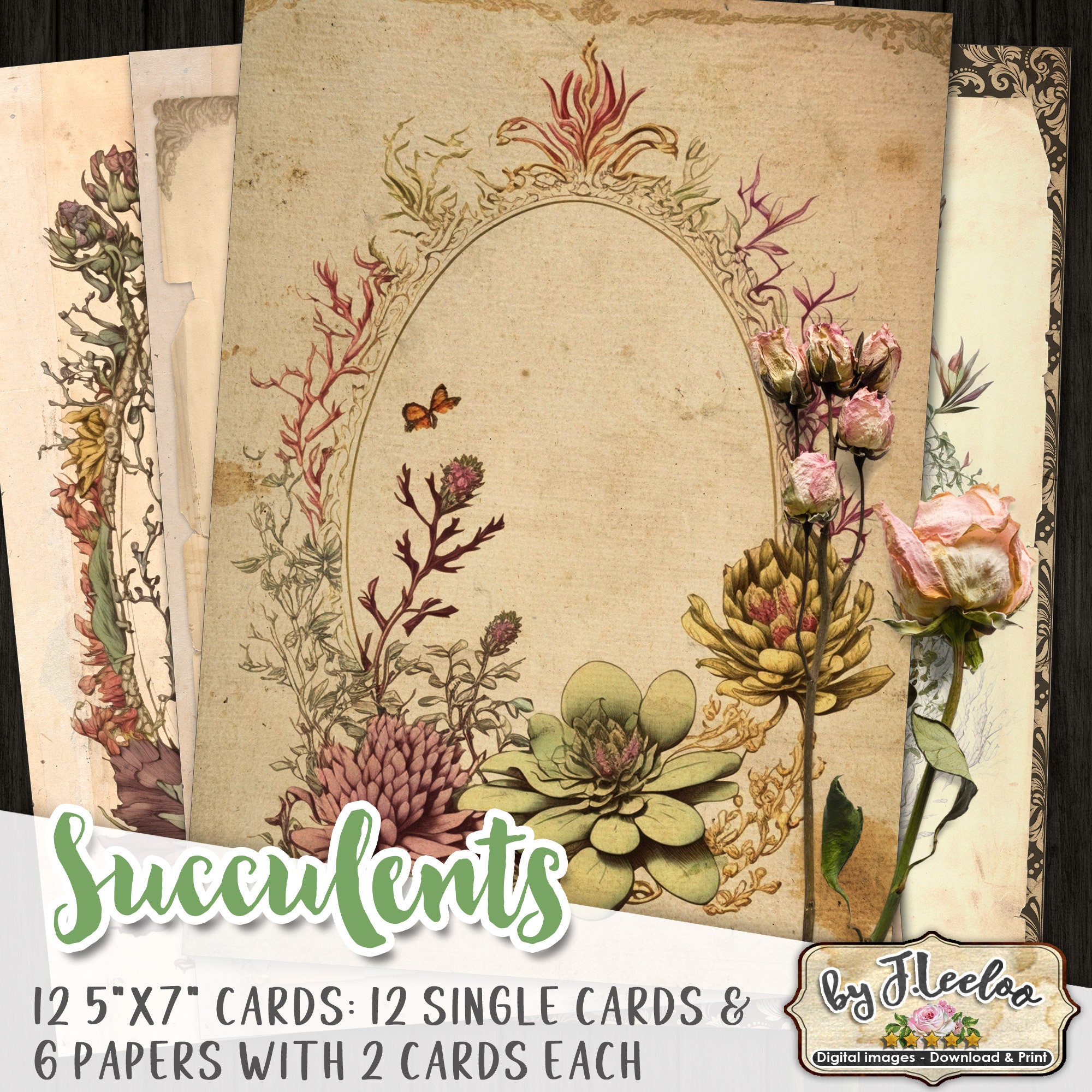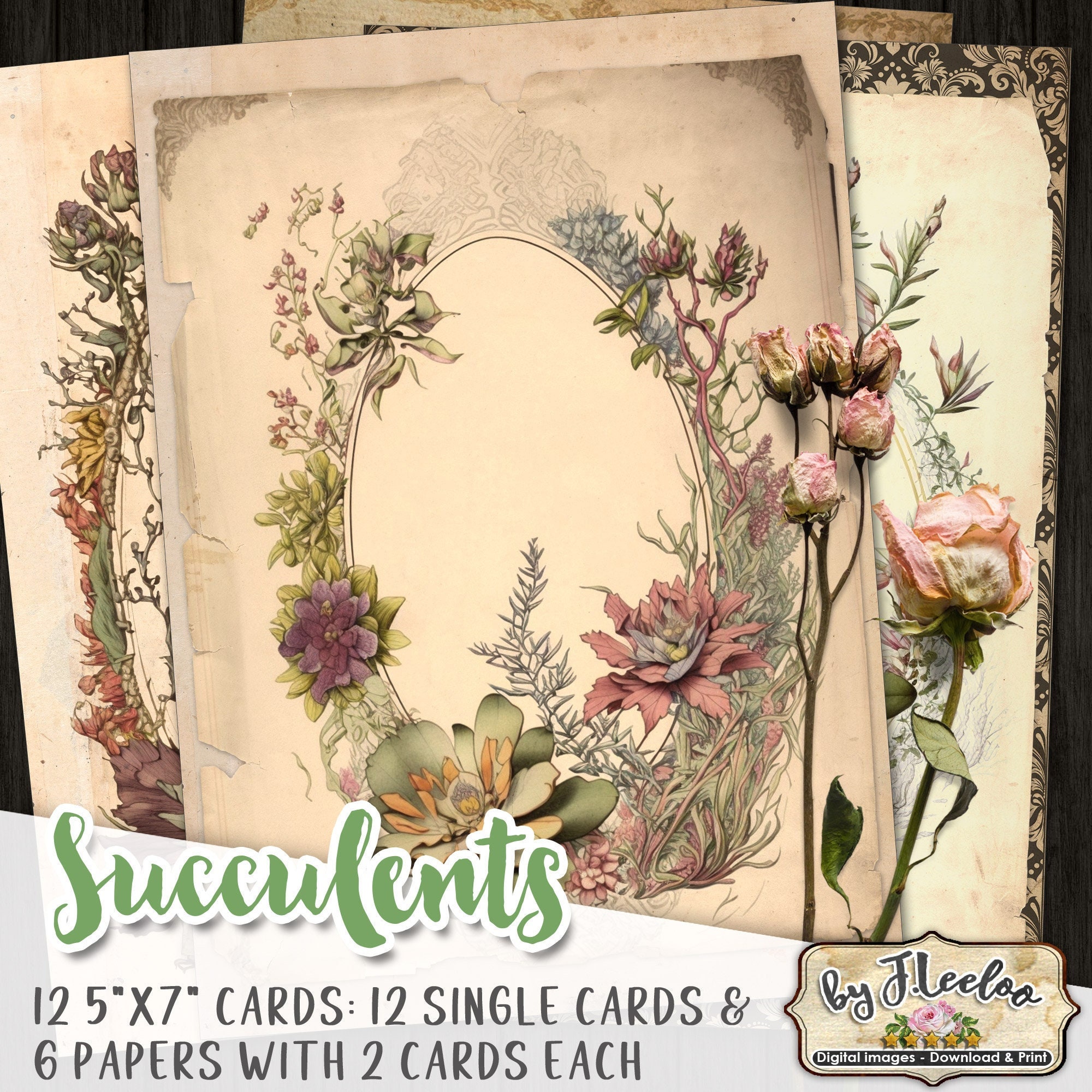 SUCCULENTS 12 frames Digital Vintage 5x7 Cards | floral backgrounds for Junk Journals | Grunge Floral Ephemera | Digital Floral Papers | Download for your crafting projects: scrapbook, background, diary, iron-on transfer, card making.... print it as many time as you want.