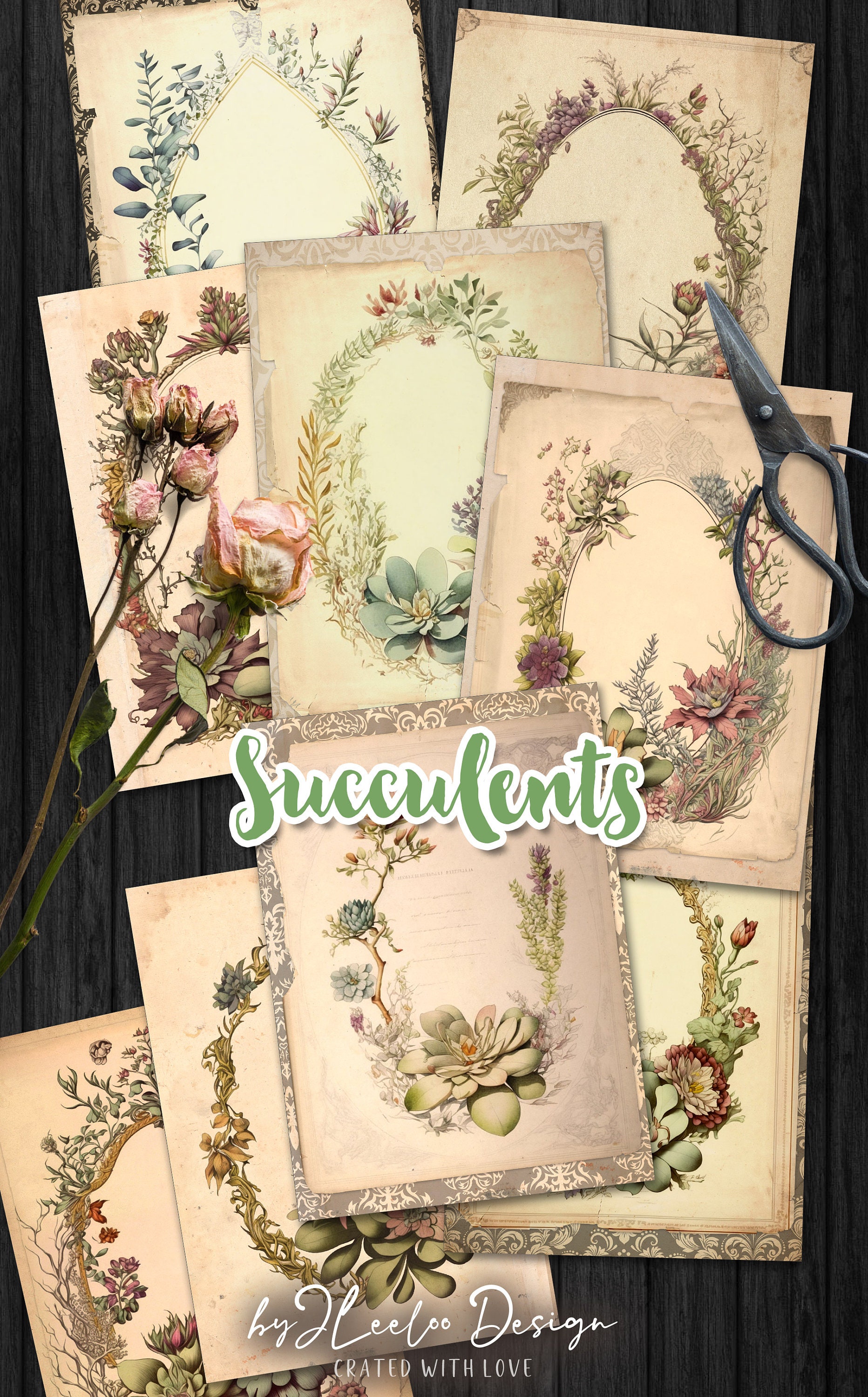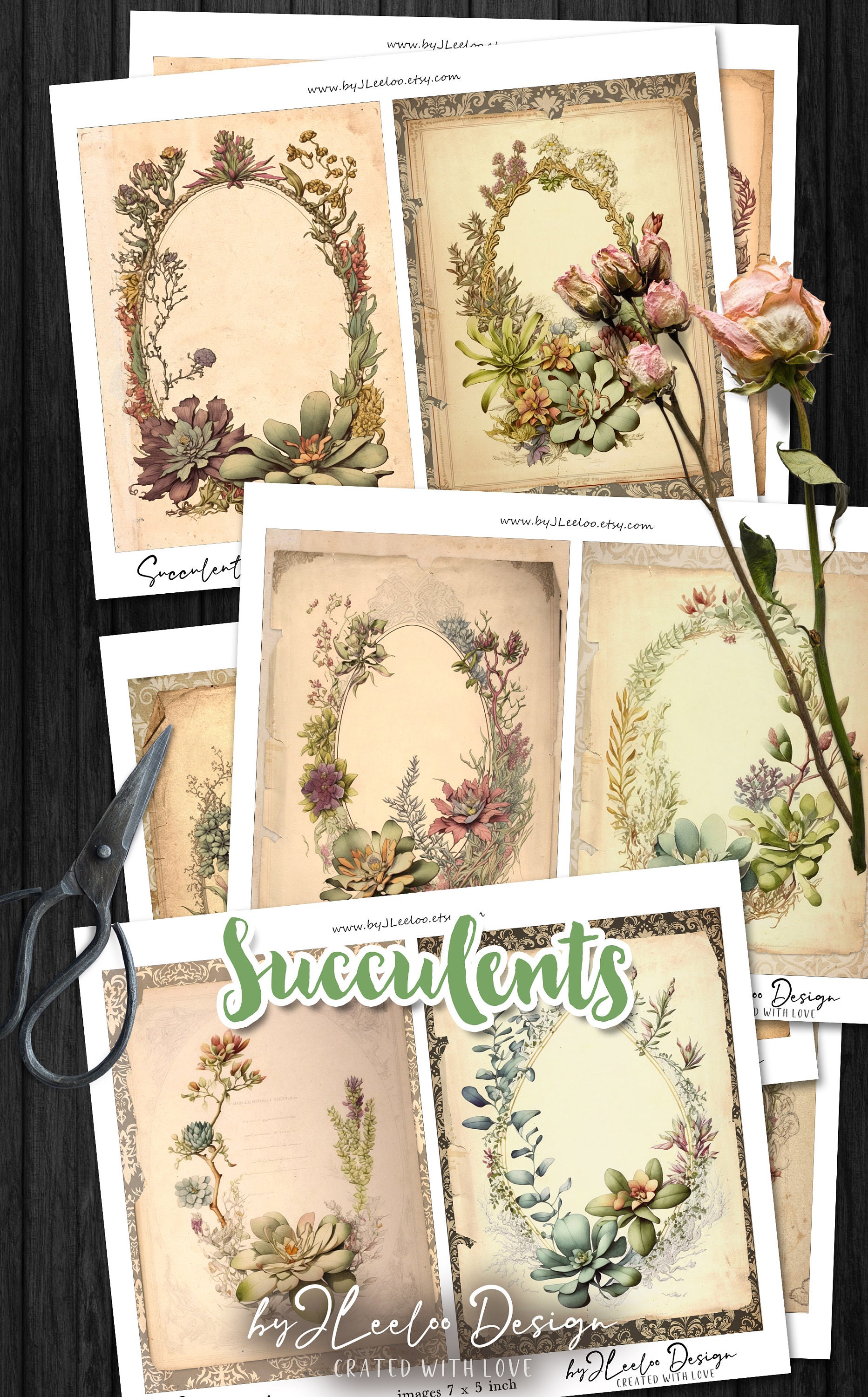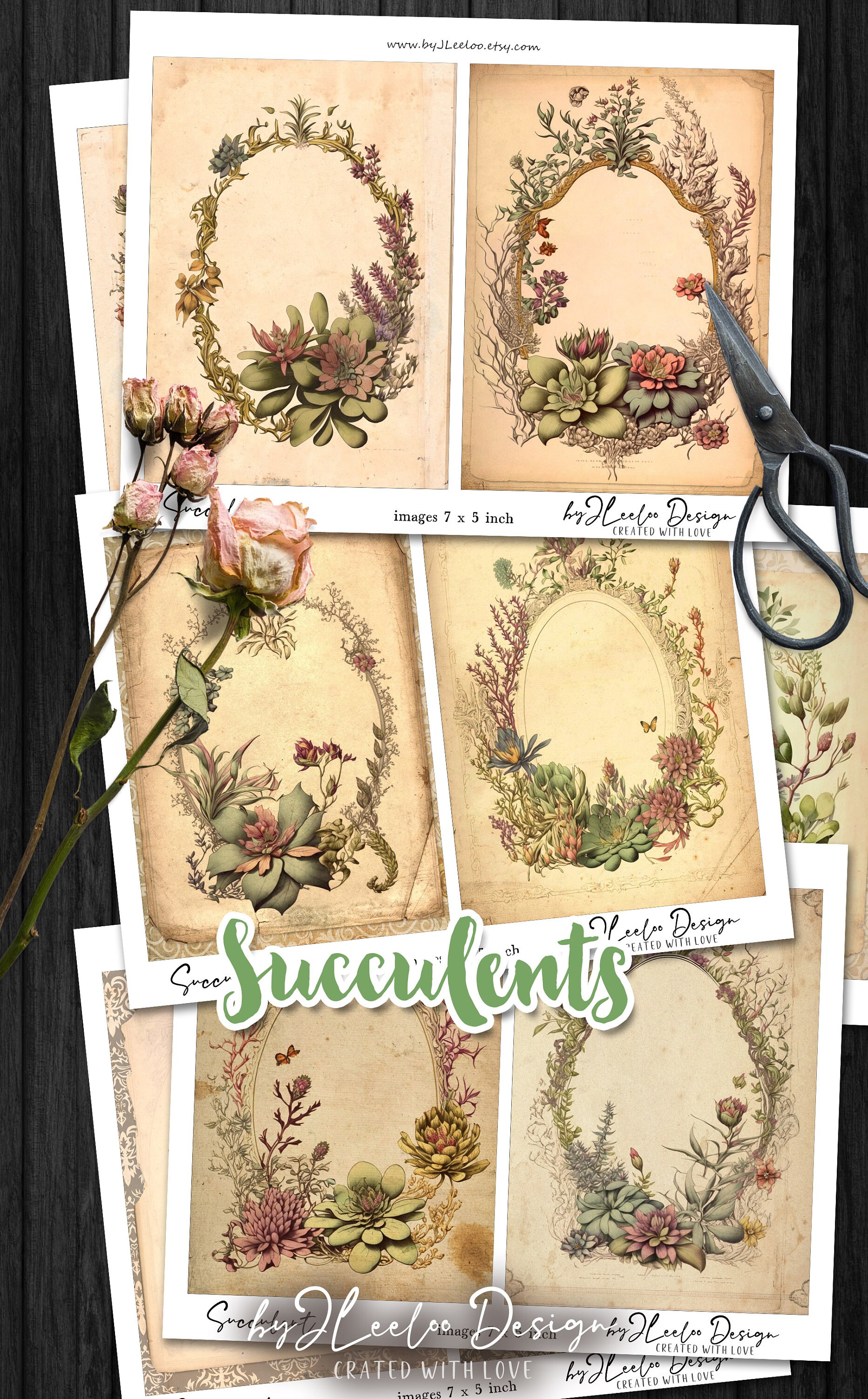 SUCCULENTS 12 frames Digital Vintage 5x7 Cards | floral backgrounds for Junk Journals | Grunge Floral Ephemera | Digital Floral Papers | Download for your crafting projects: scrapbook, background, diary, iron-on transfer, card making.... print it as many time as you want.