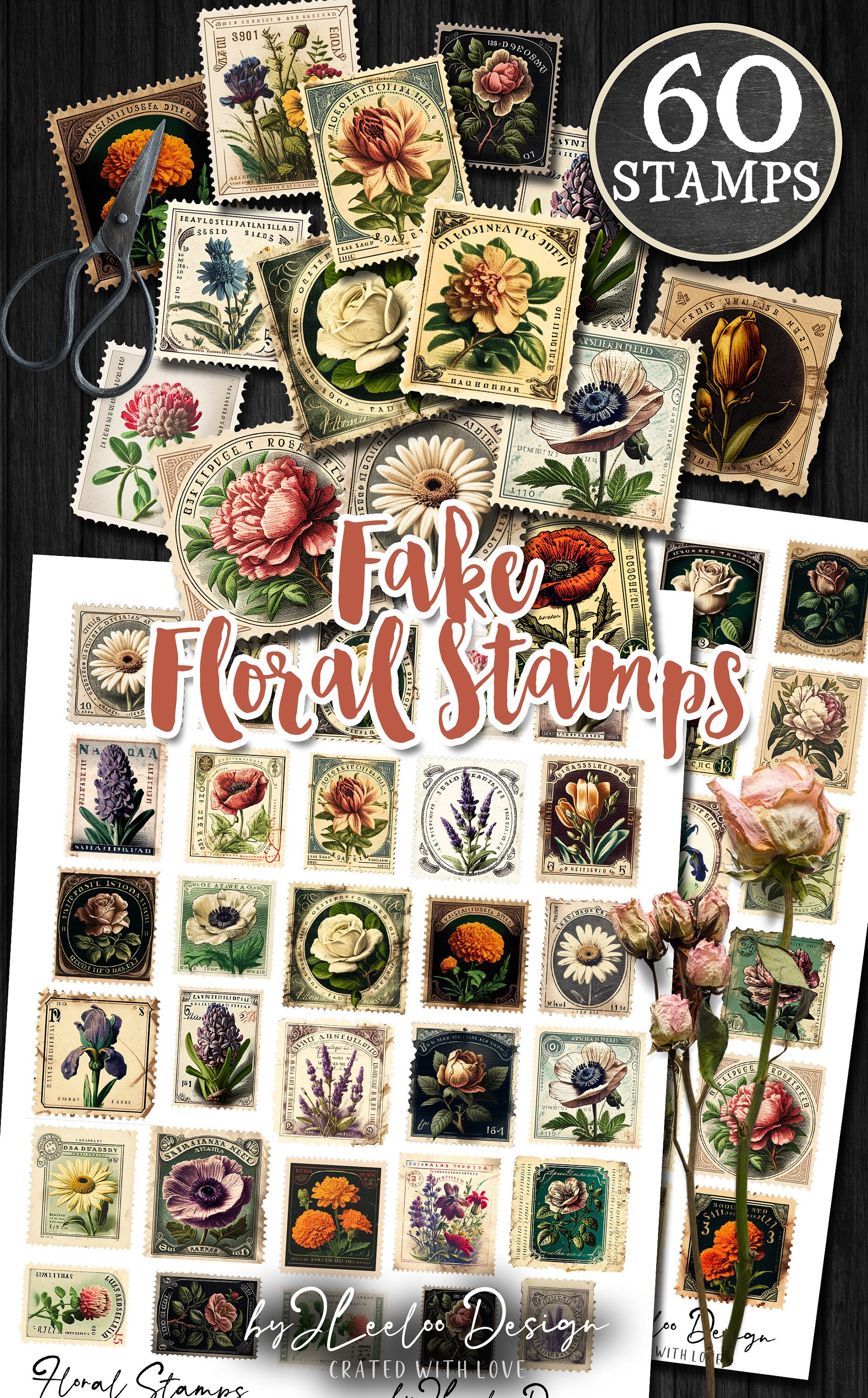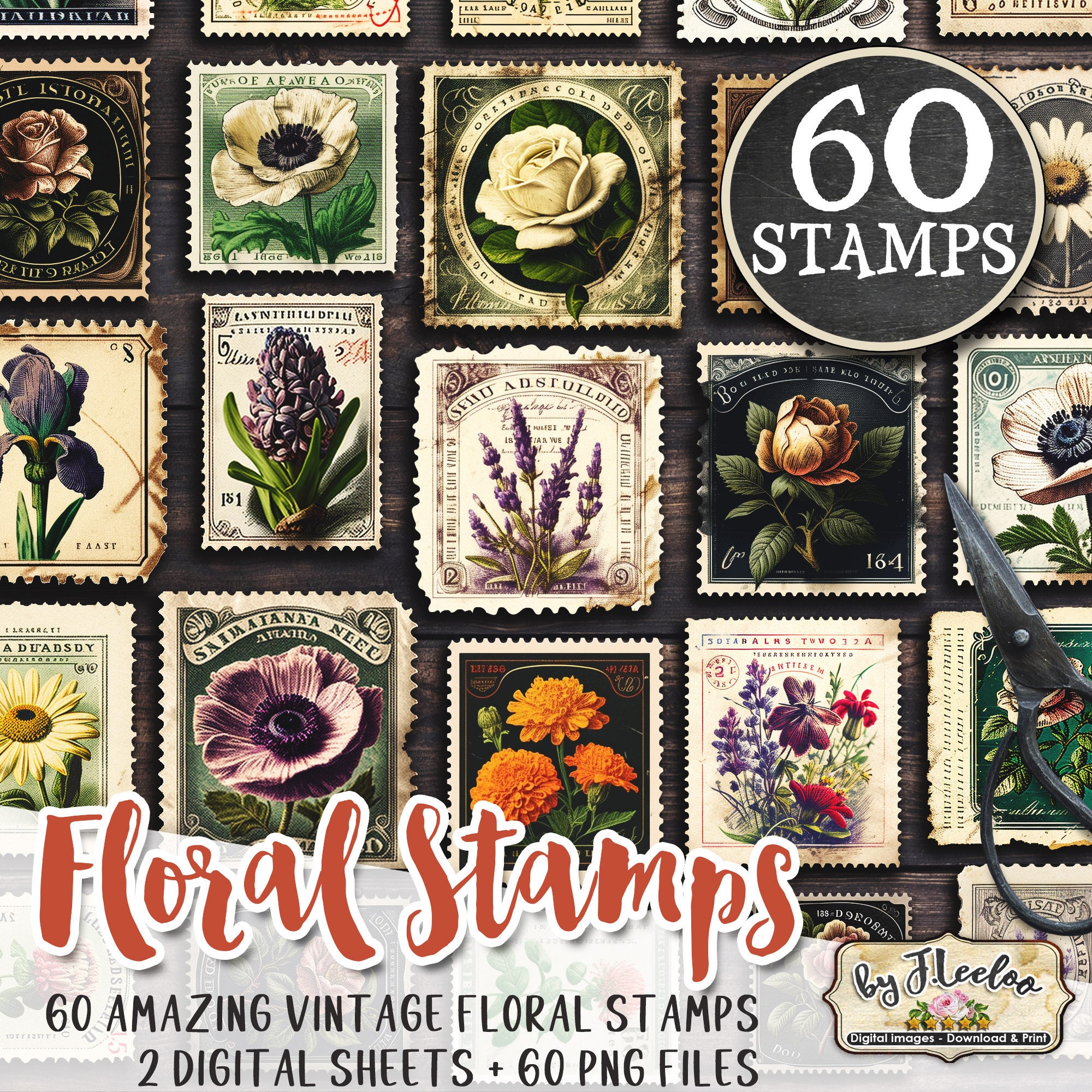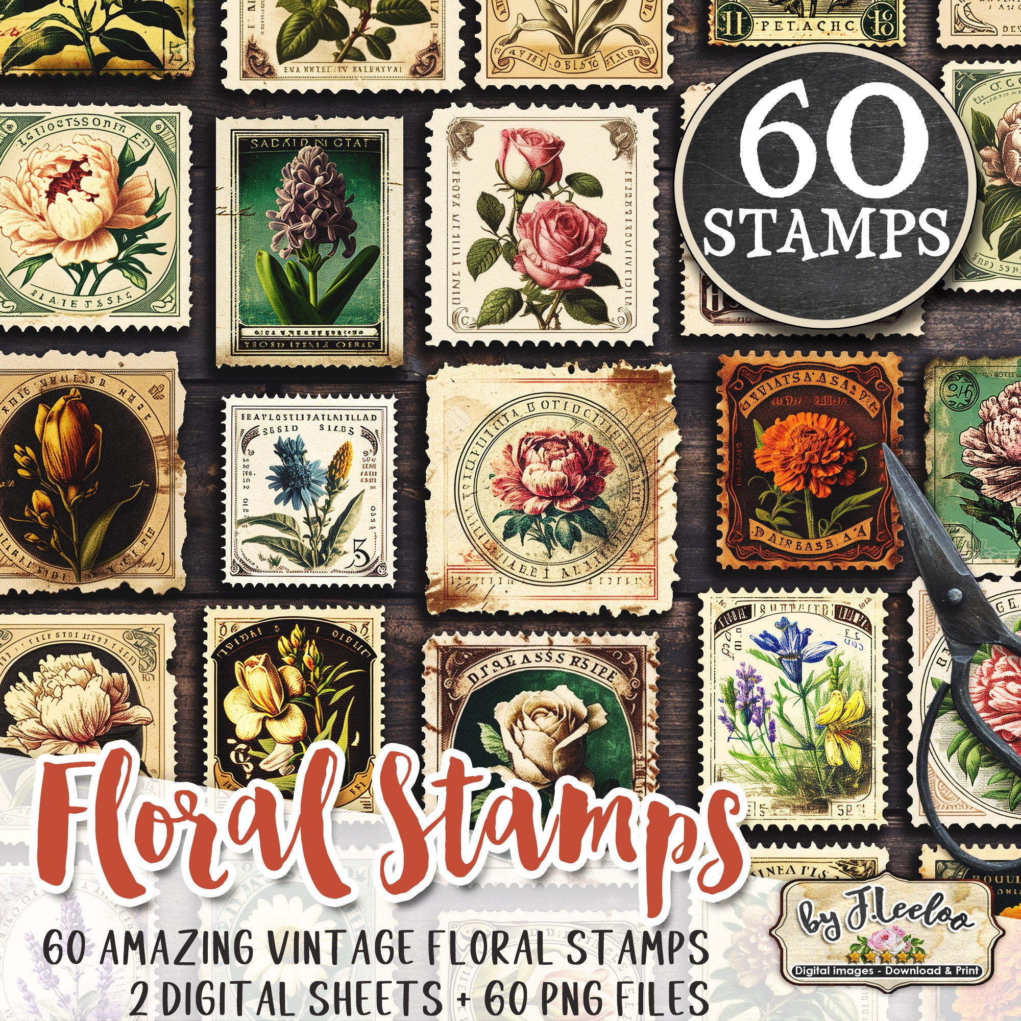 Fake FLORAL STAMPS postage Png printable | Junk Journal flower supplies | Botanical vintage ephemera instant download collage | cl138