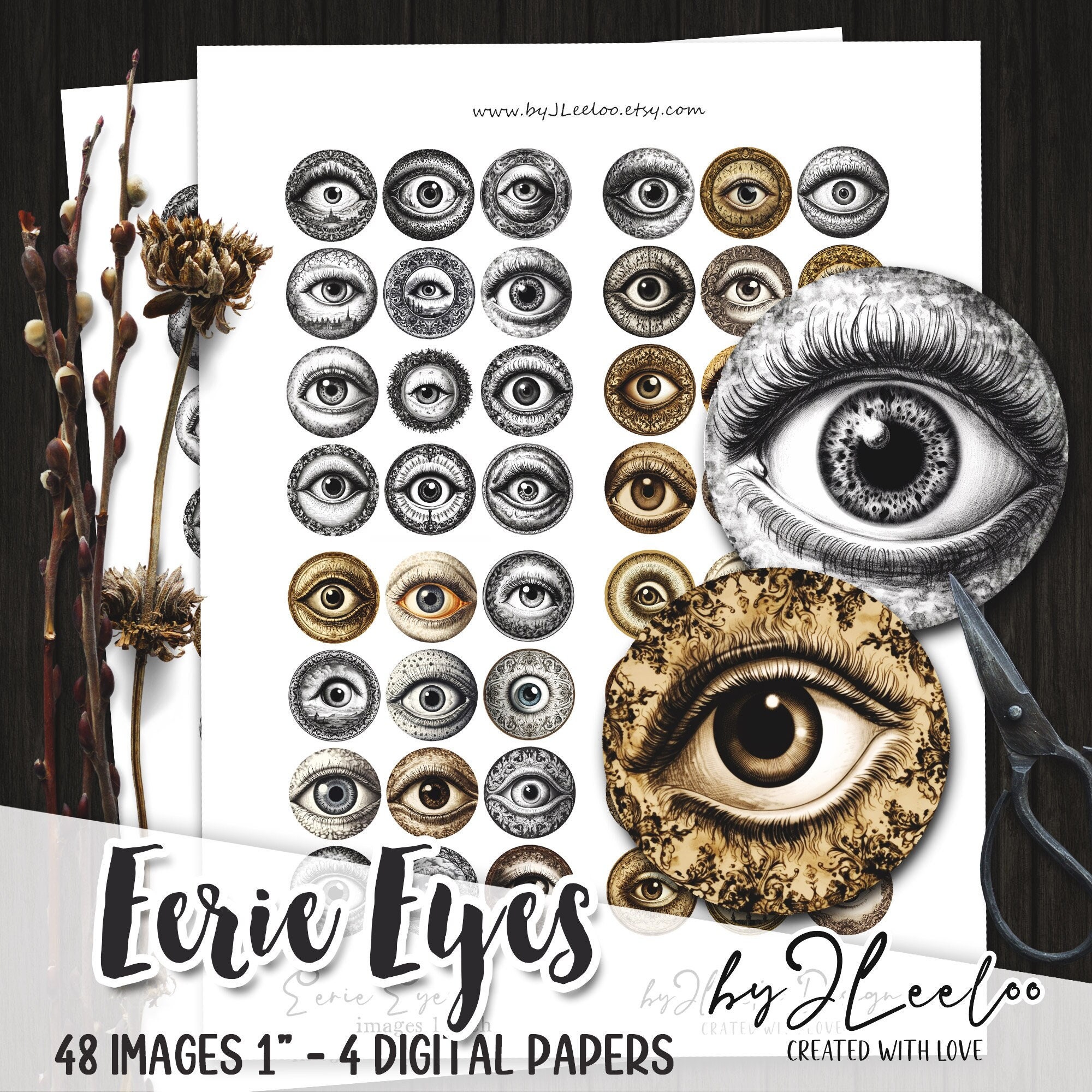 EERIE EYES 1 inch circle | Gothic Halloween supplies invitations pocket mirrors cupcake topper scrapbook magnets | Junk journal | tn657