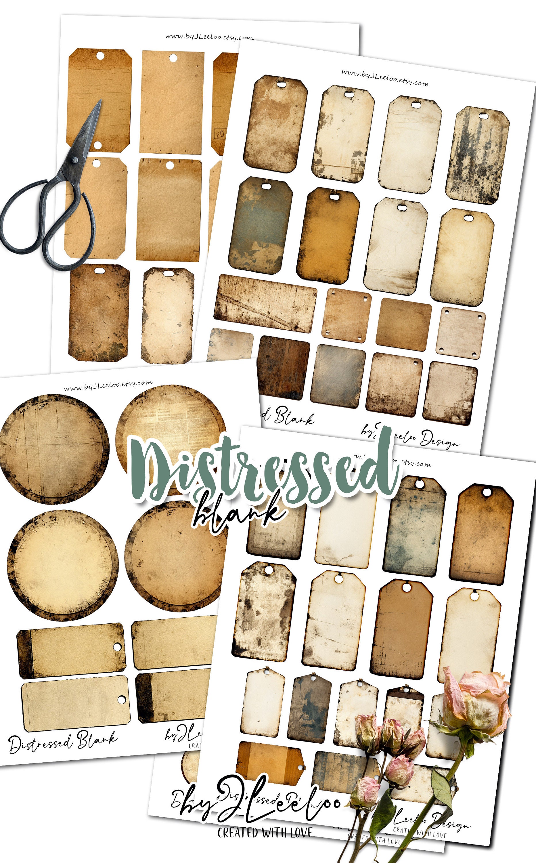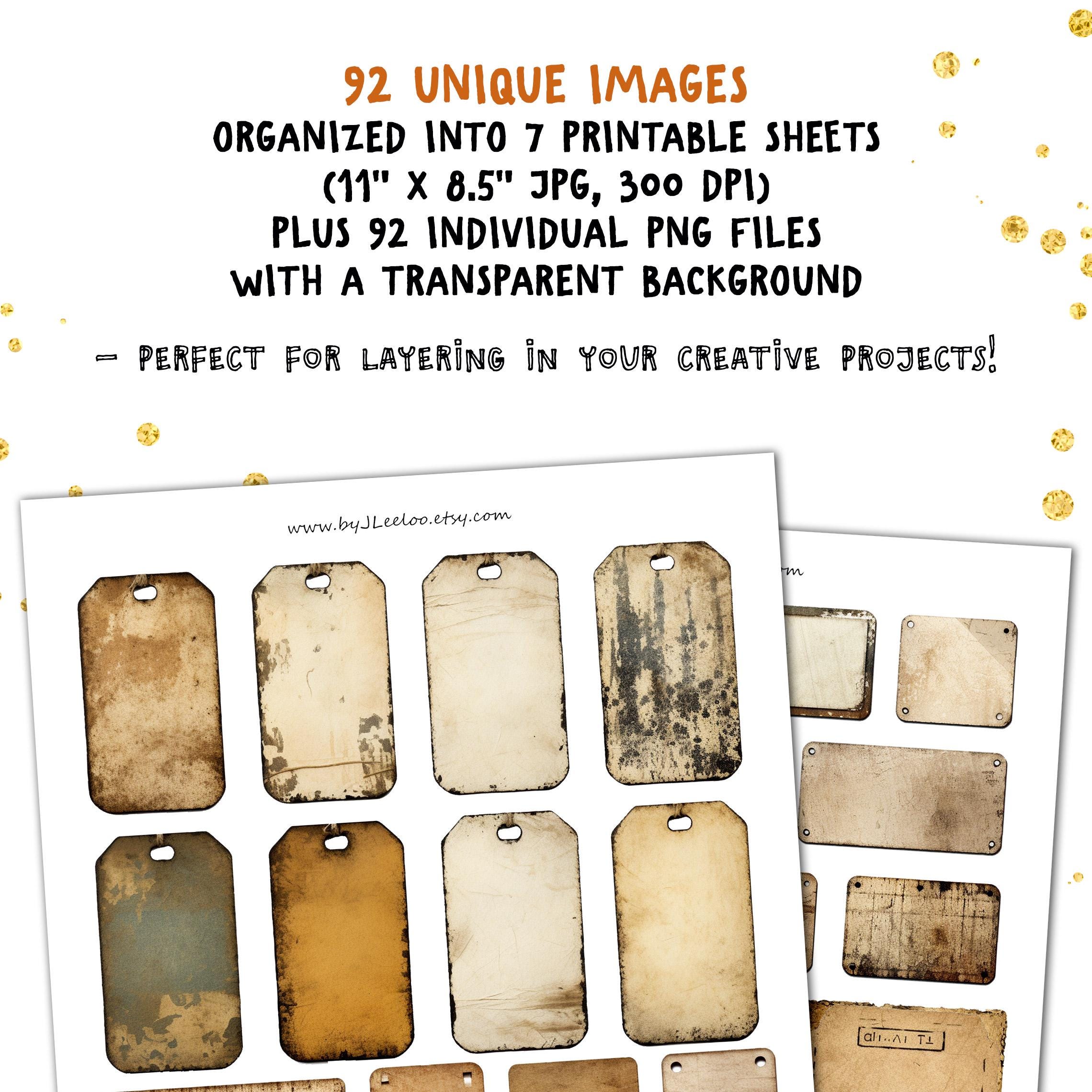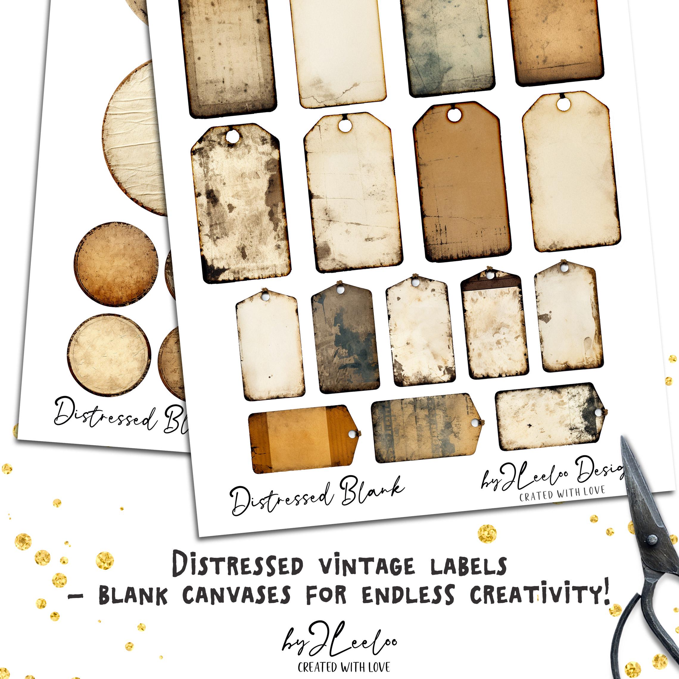This set of distressed, blank vintage labels and tags is like a treasure chest of creative possibilities – ready for you to stamp, handwrite, collage, or layer into your junk journals, scrapbooks, mixed media art, and more.