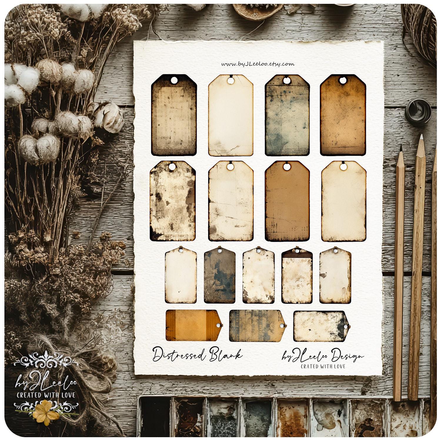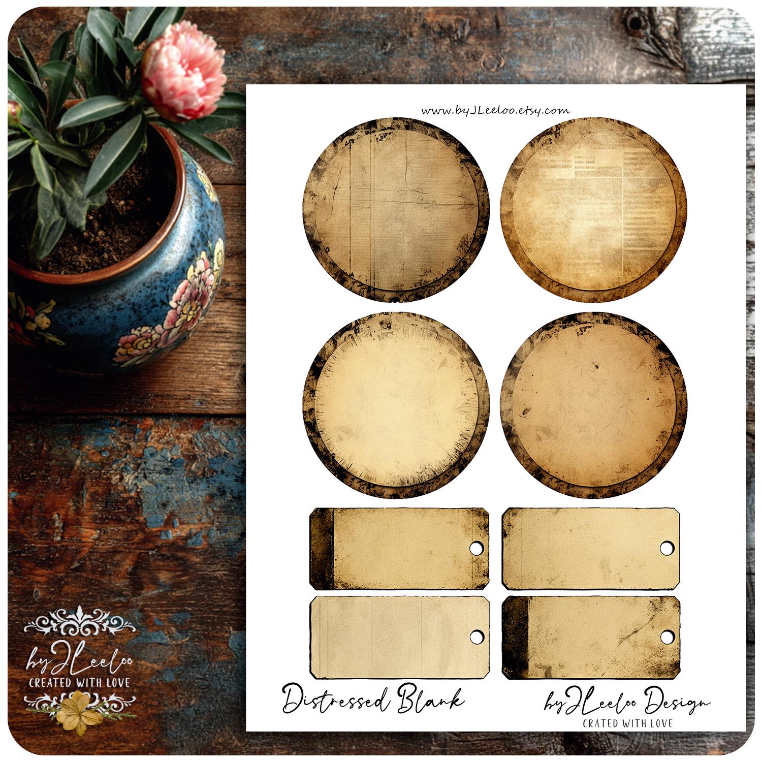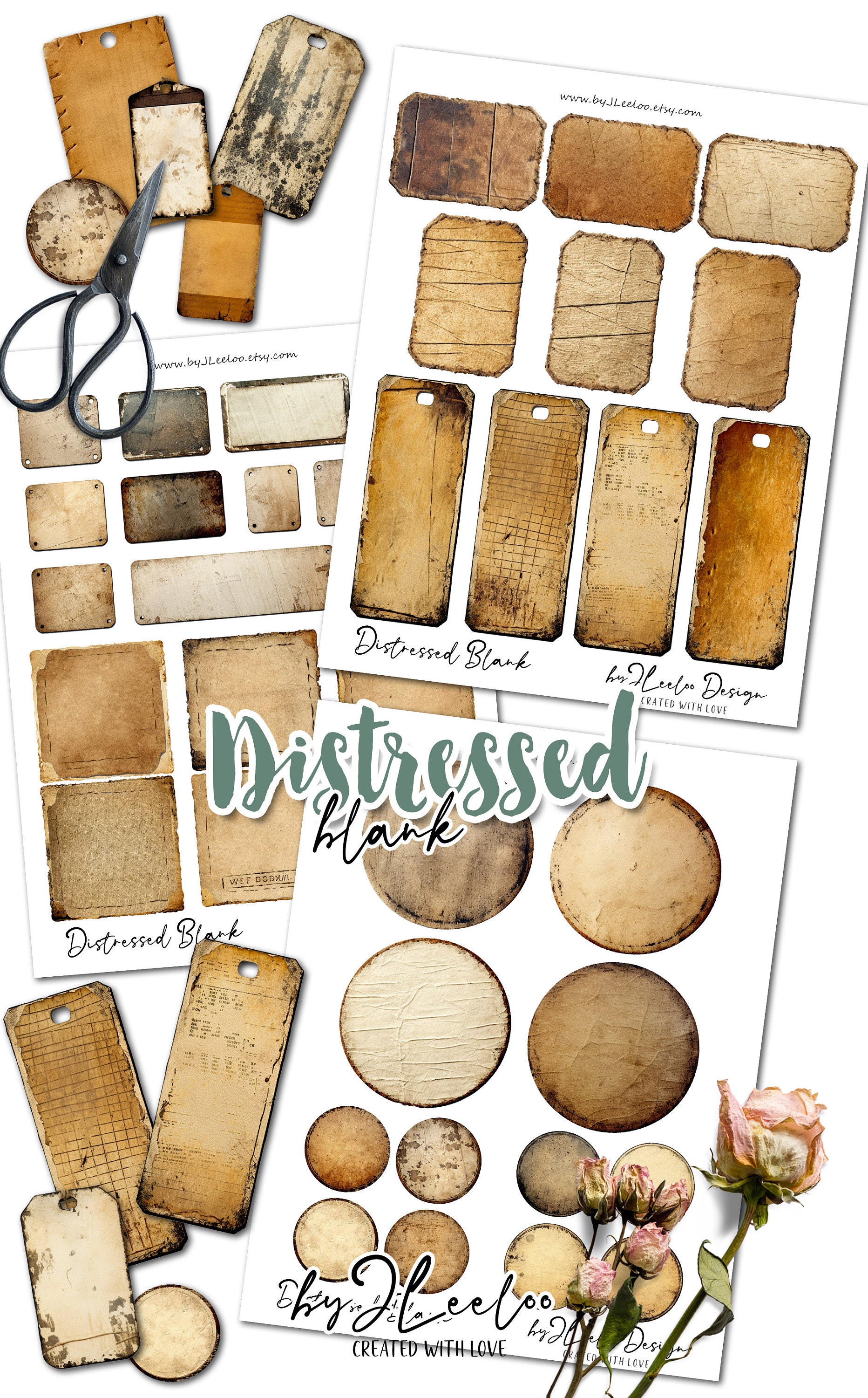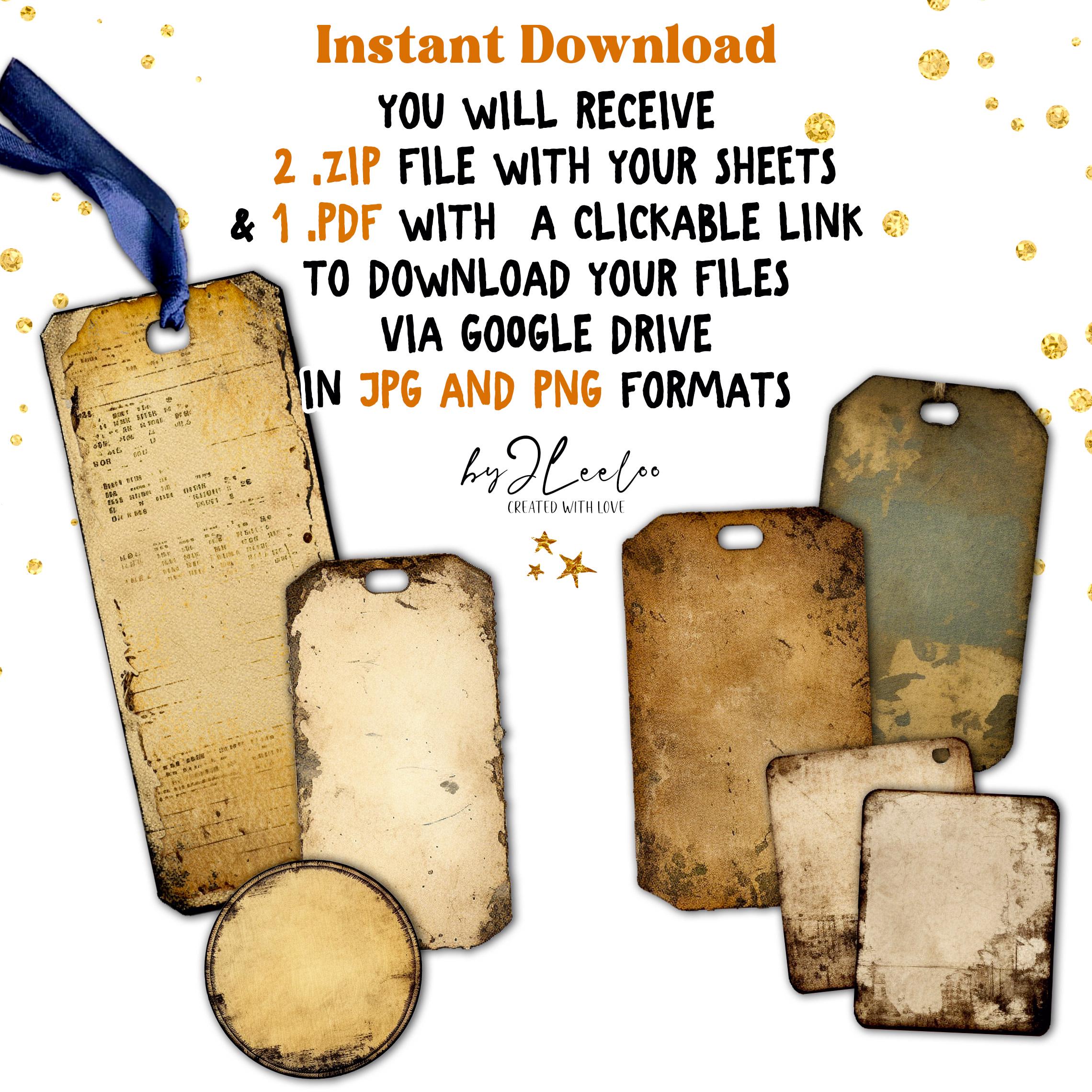 This set of distressed, blank vintage labels and tags is like a treasure chest of creative possibilities – ready for you to stamp, handwrite, collage, or layer into your junk journals, scrapbooks, mixed media art, and more.