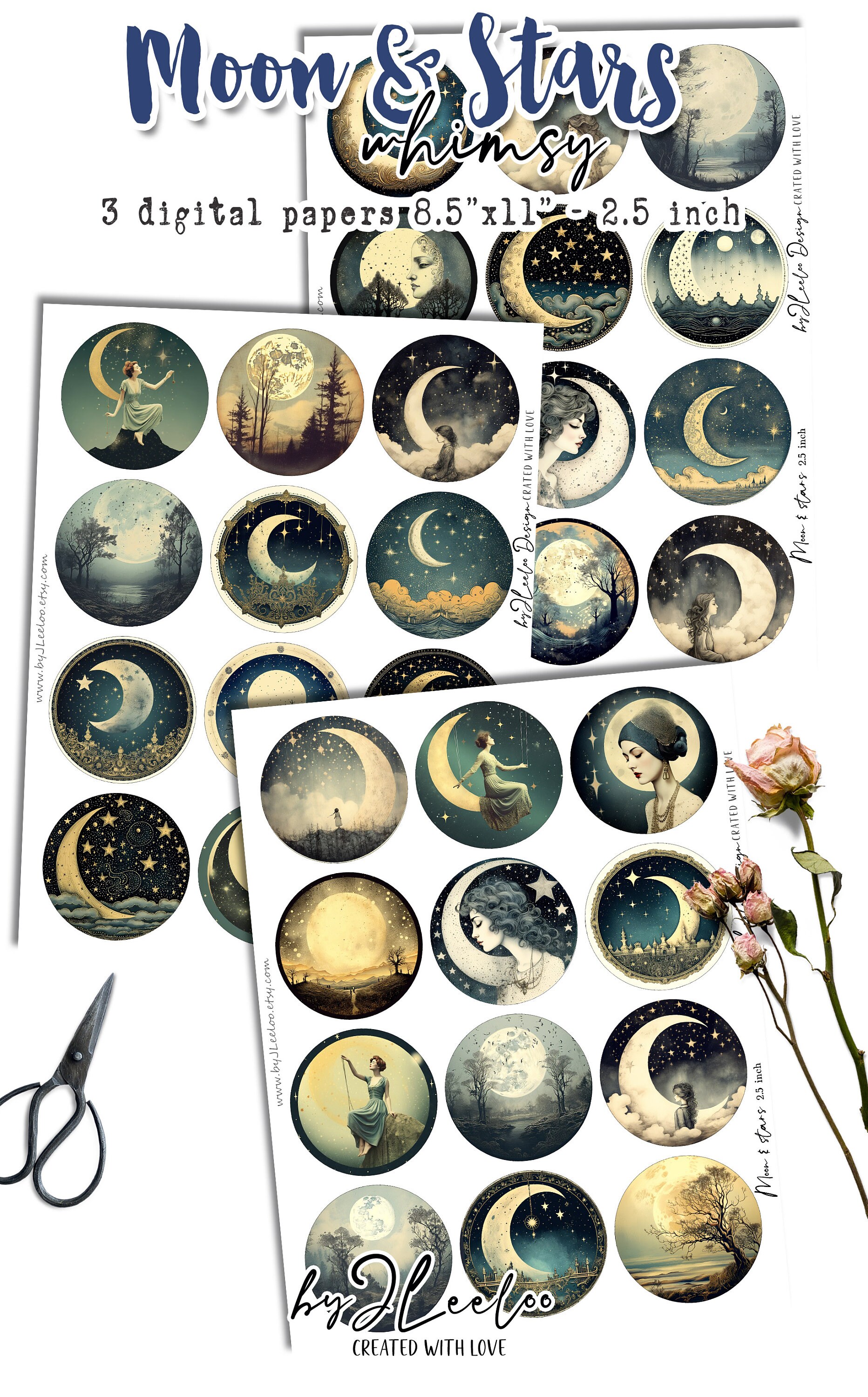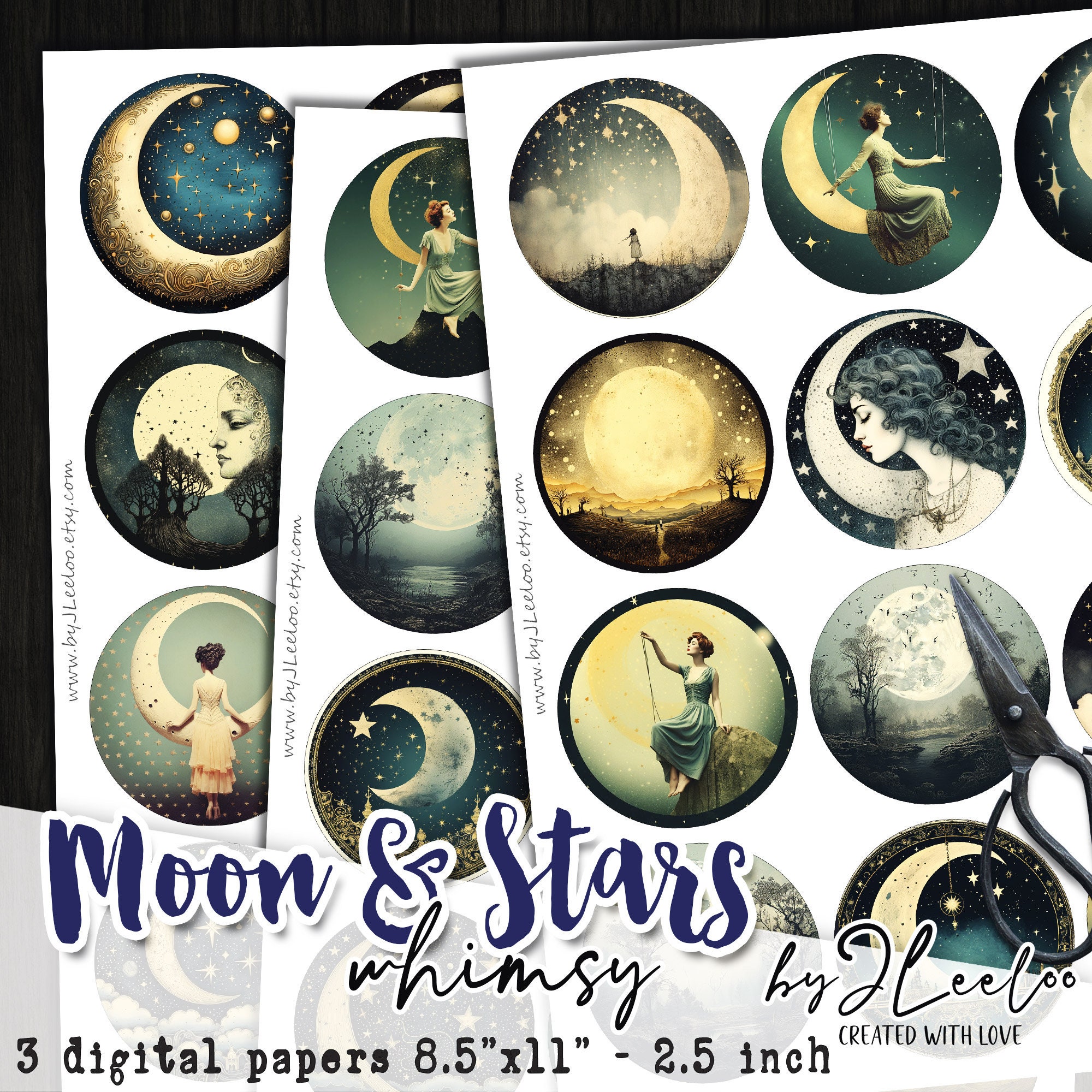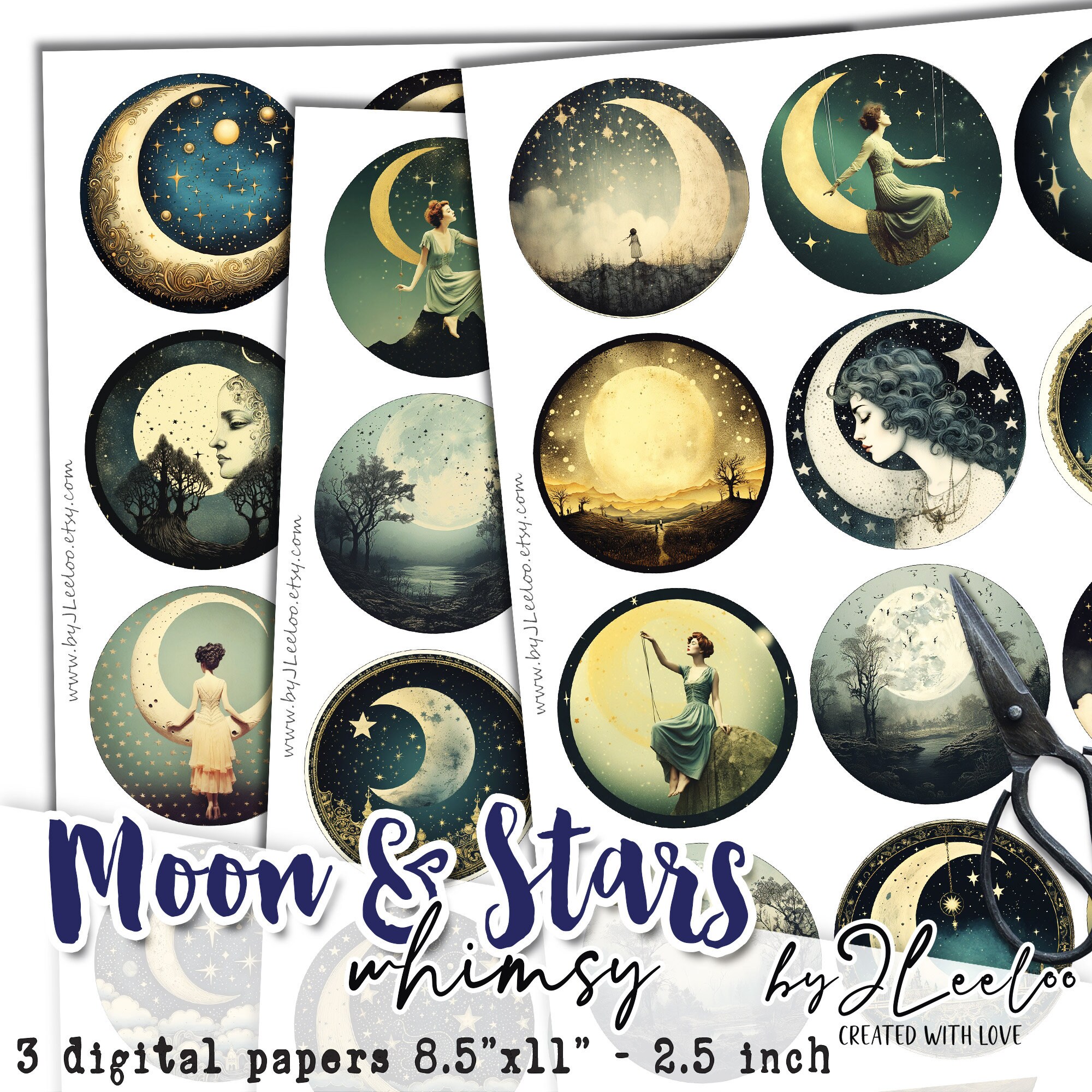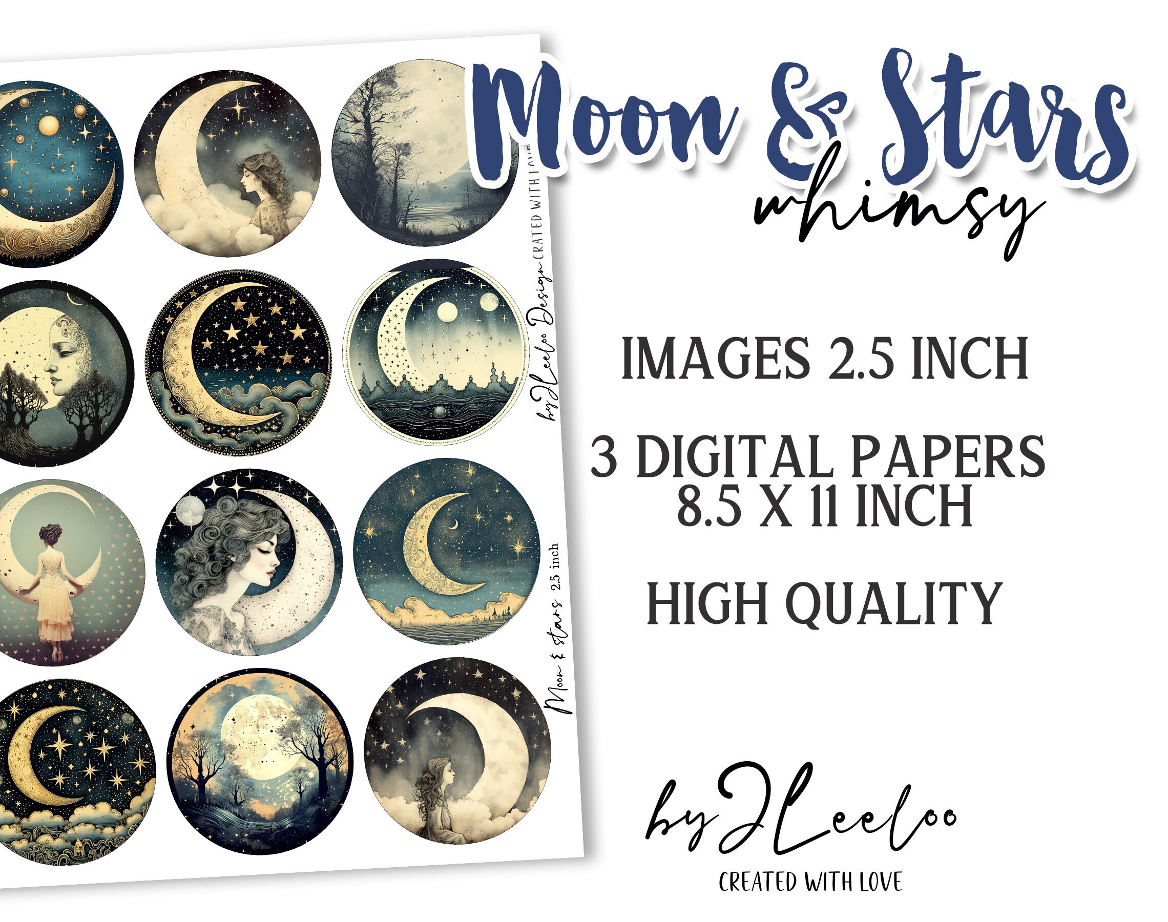MOON and STARS 2.5 inch circle printable bottle caps stickers for pendants pin badge magnets coaster graphic digital collage sheet | tn658