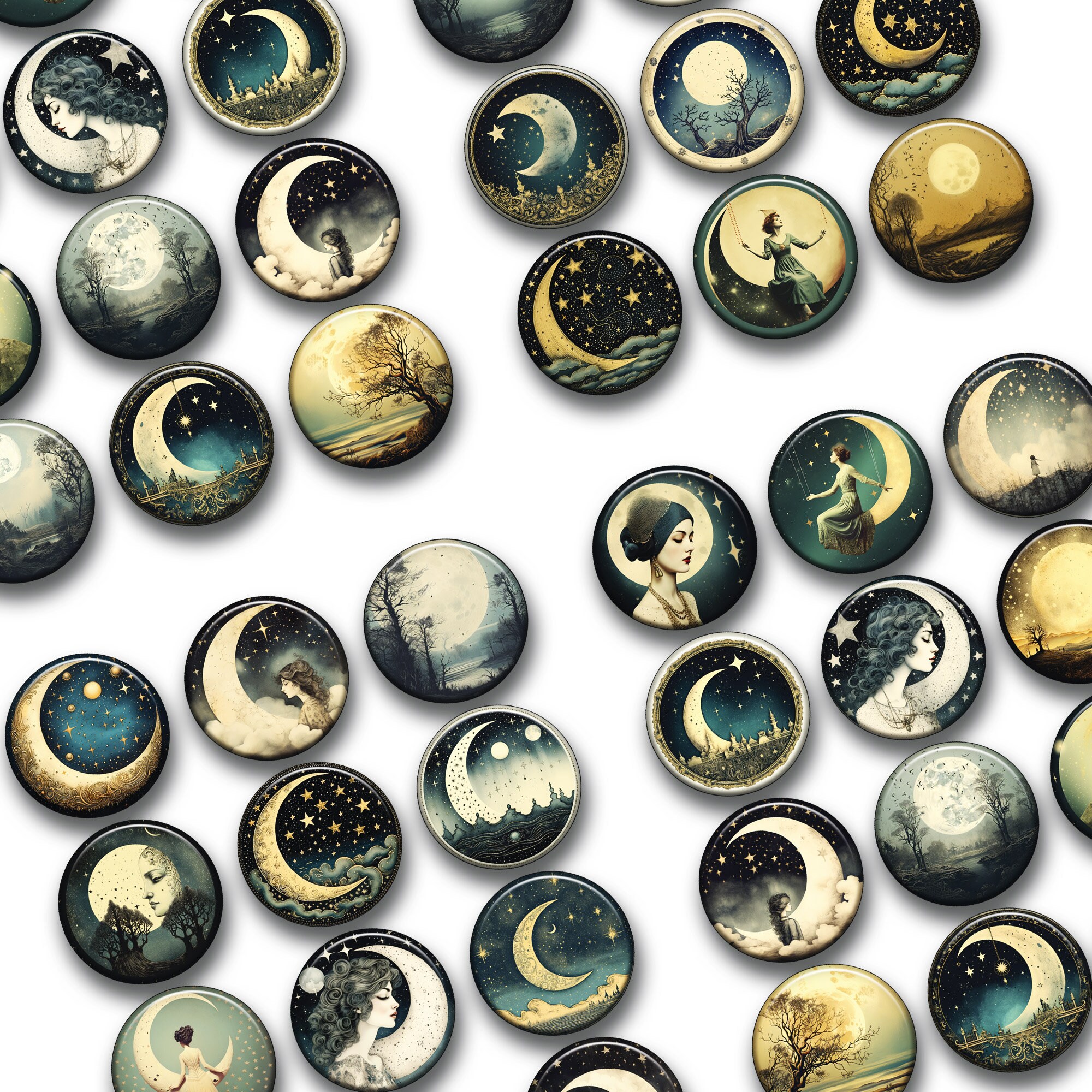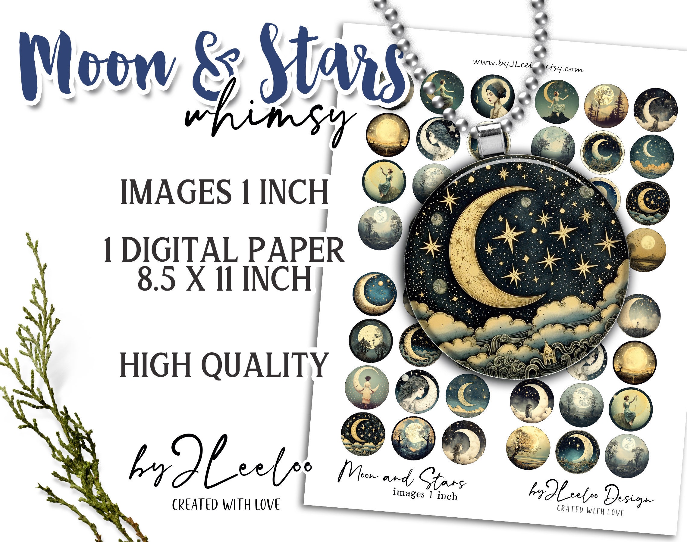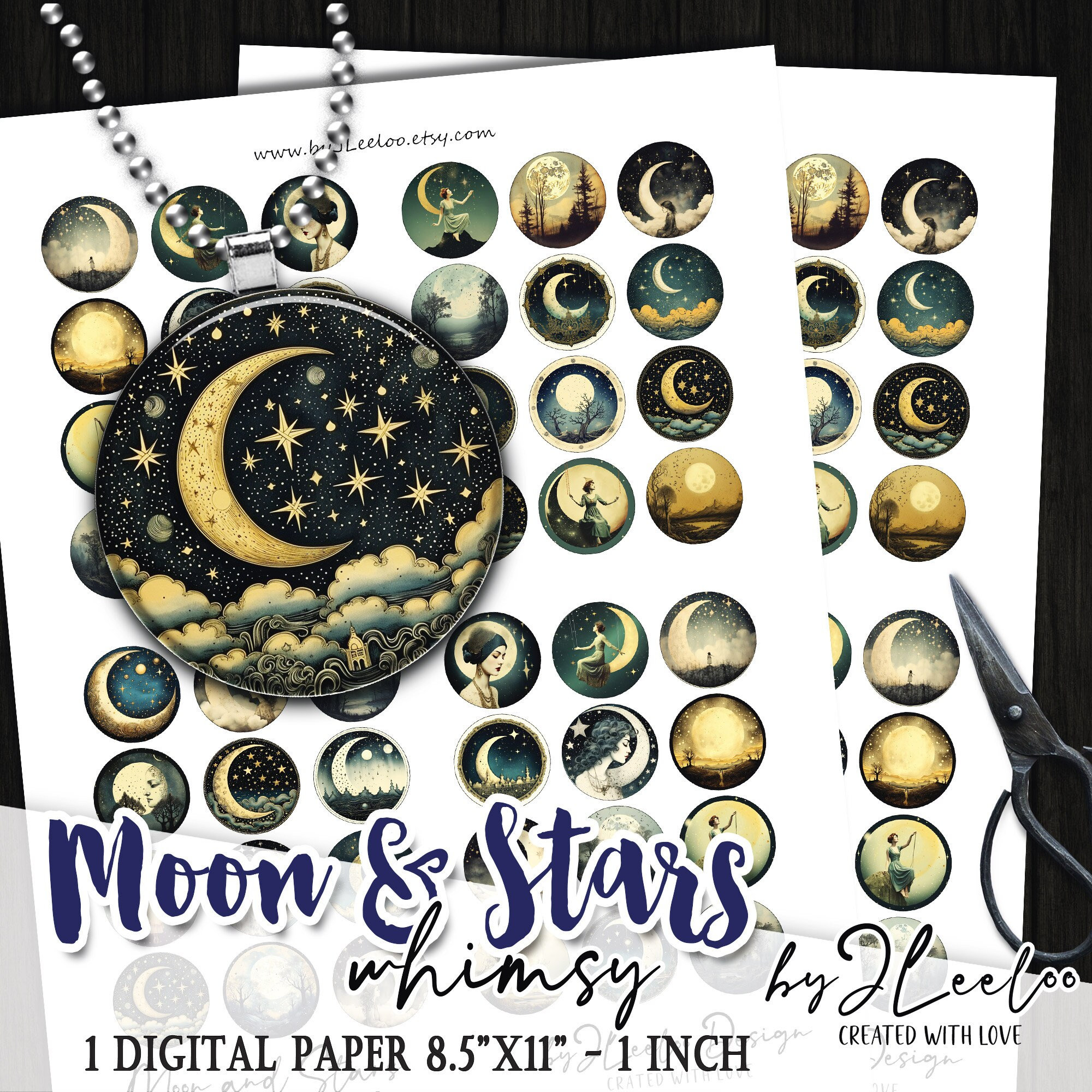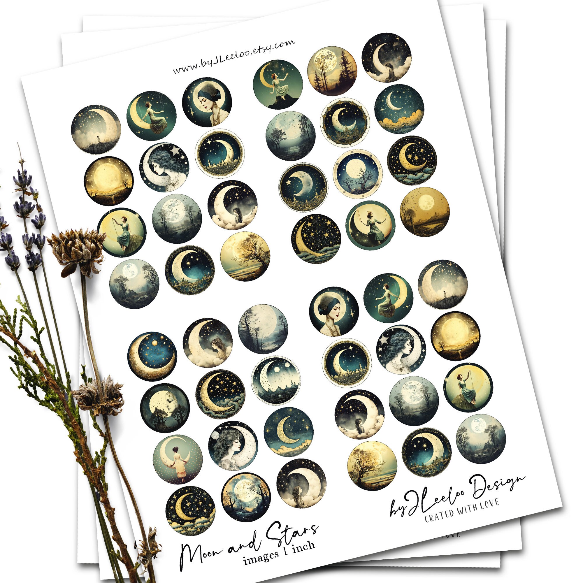 MOON and STARS 1 inch circle printable bottle caps stickers for pendants pin badge magnets coaster graphic digital collage sheet | tn658