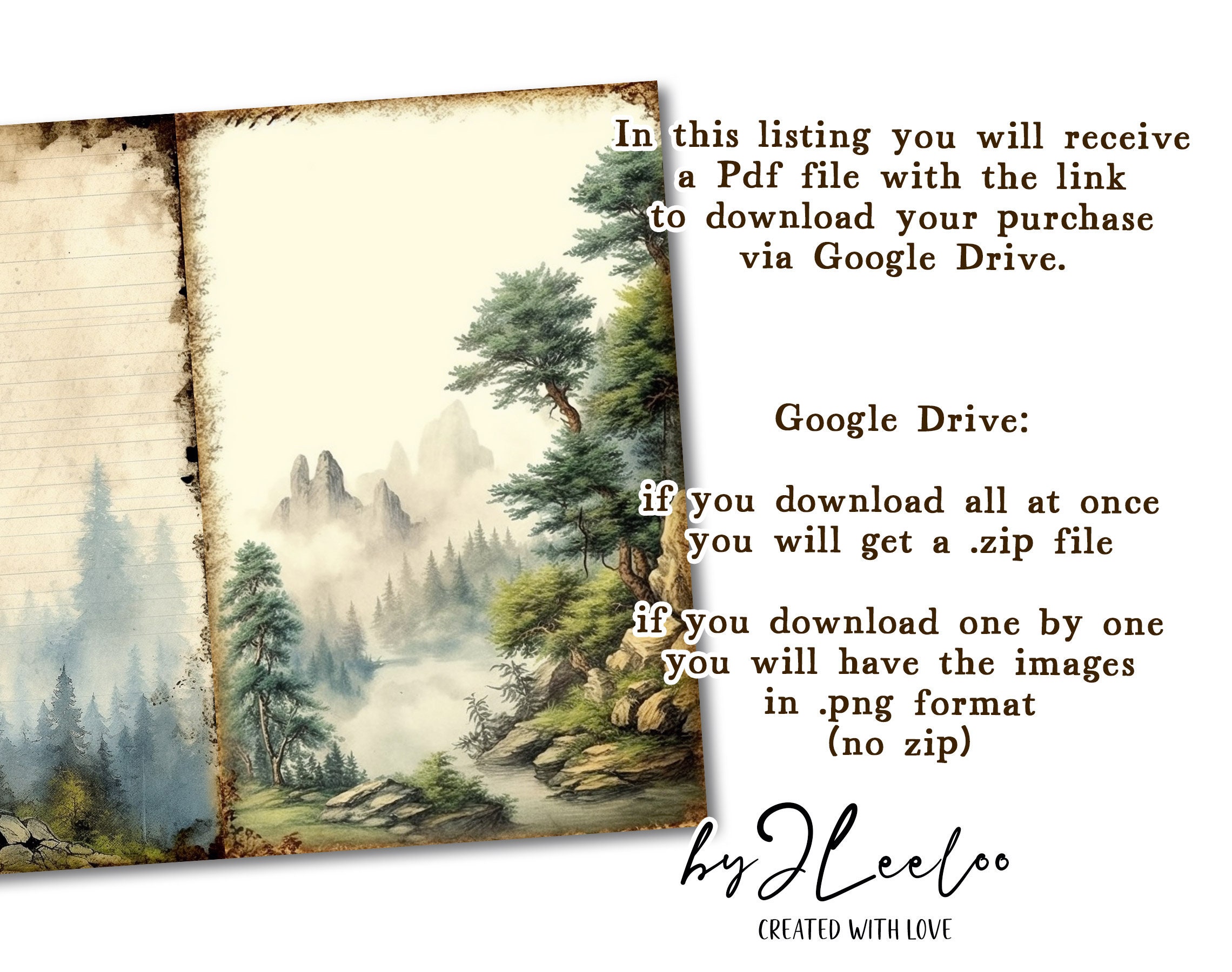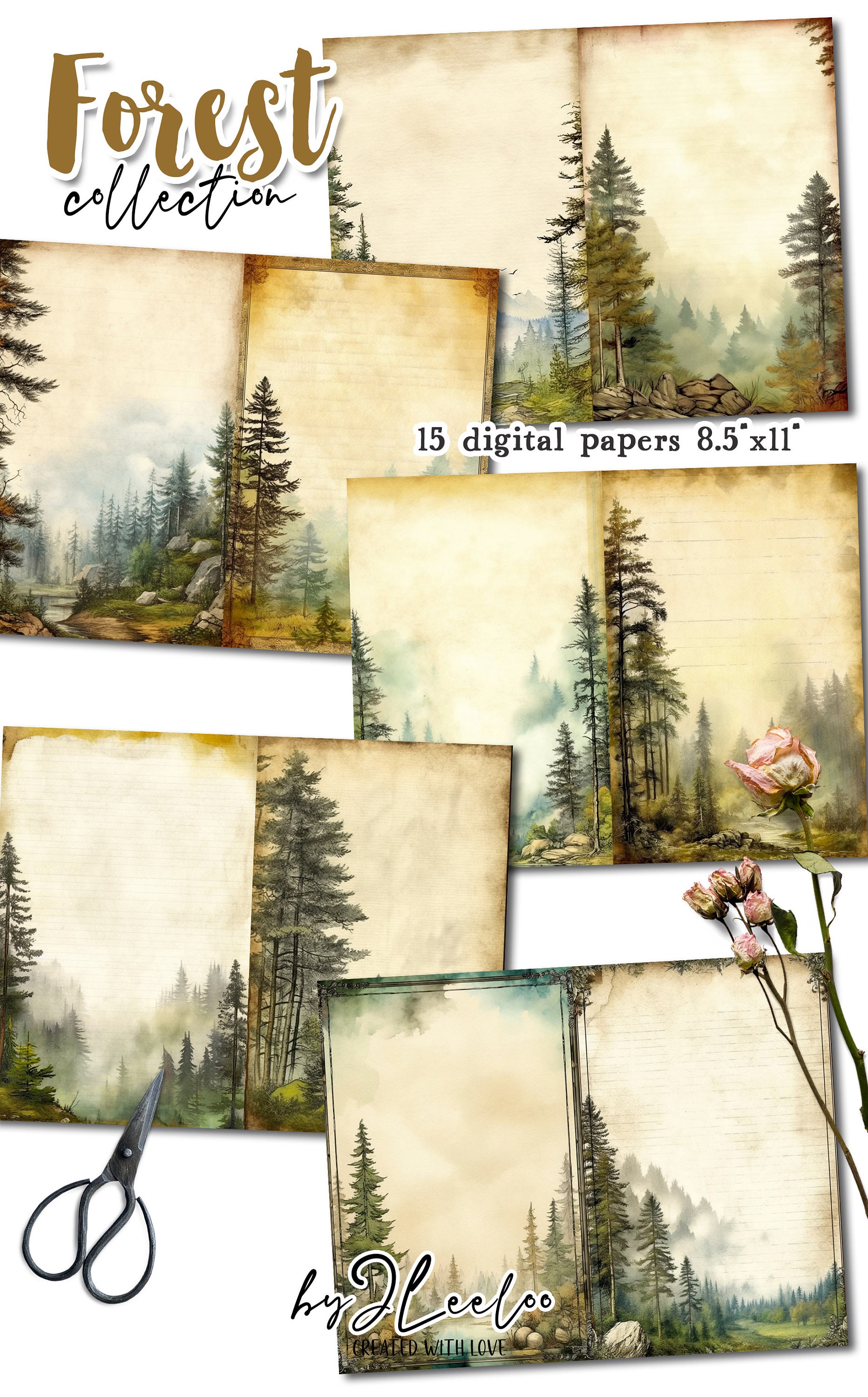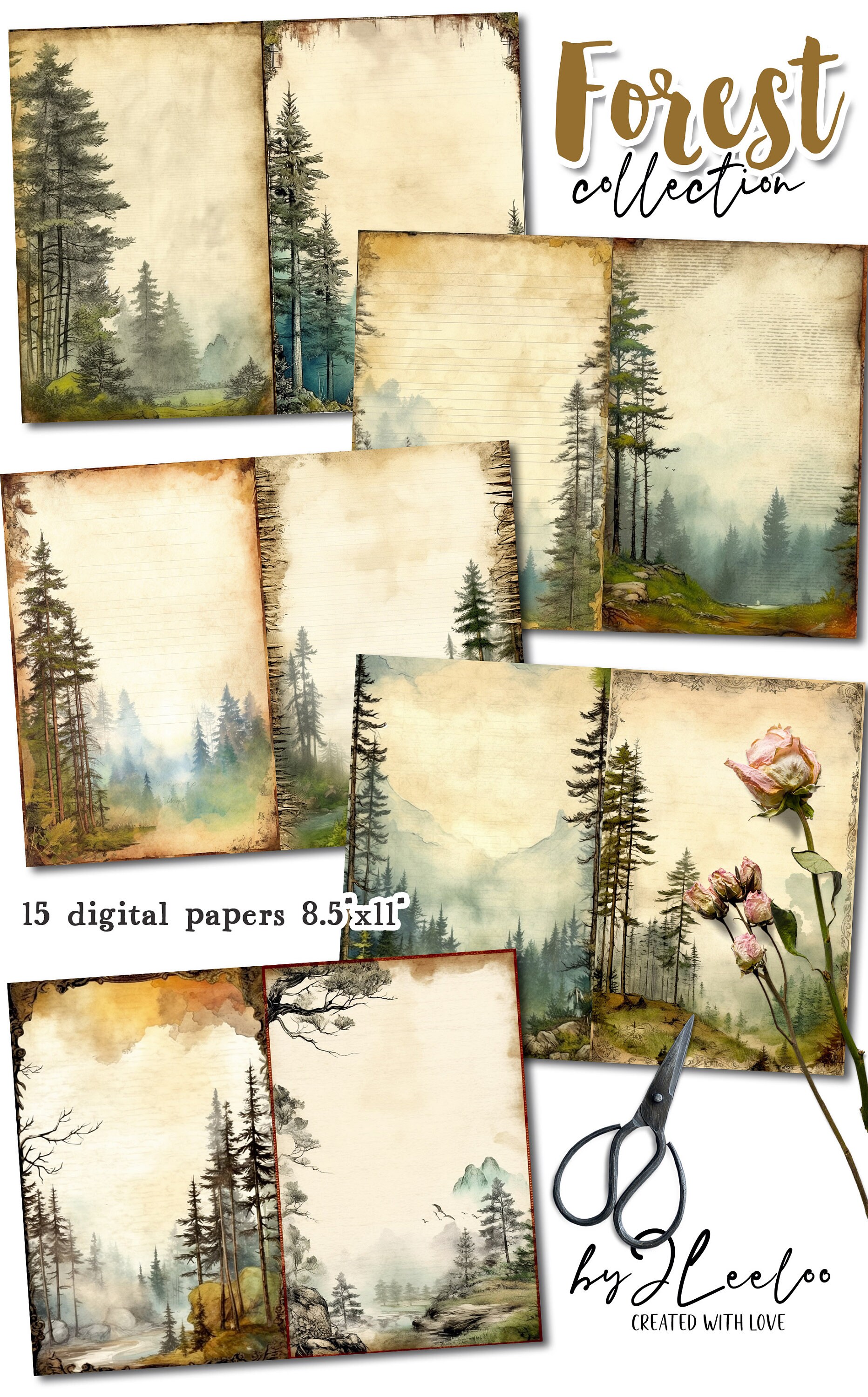 FOREST half pages printable for junk journal | watercolor forest scene | supplies card making woodland collage | vintage stationery | pp622