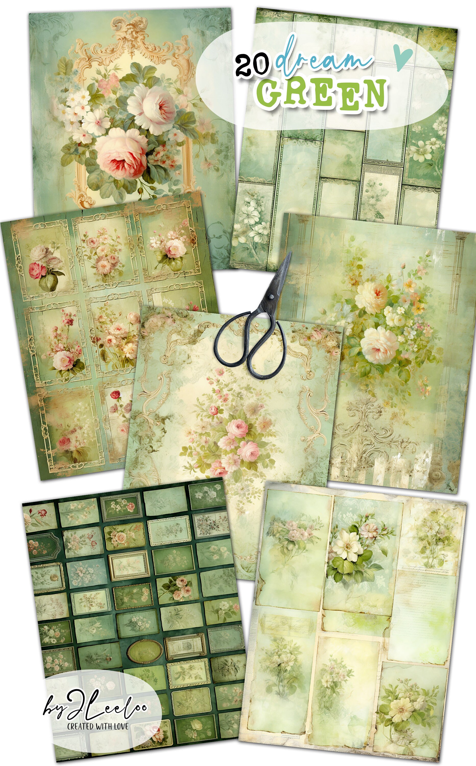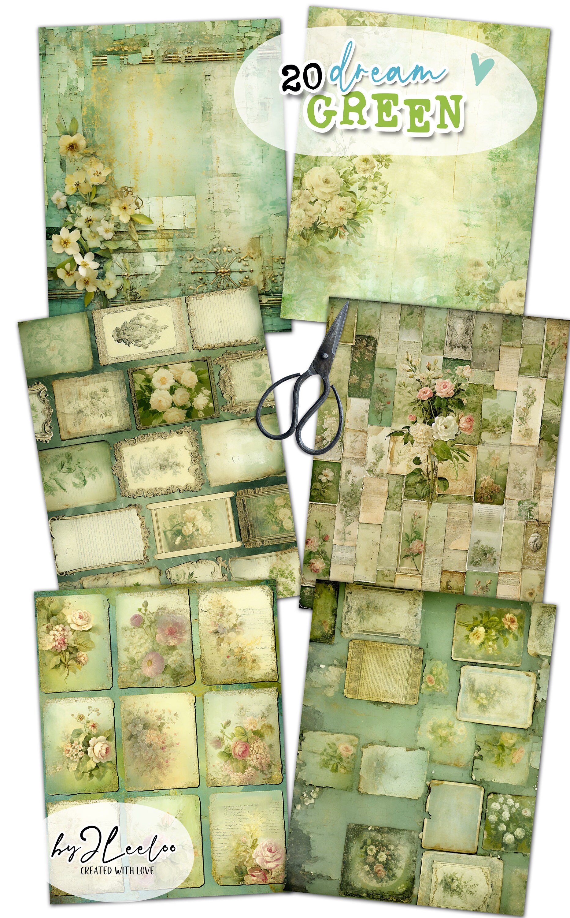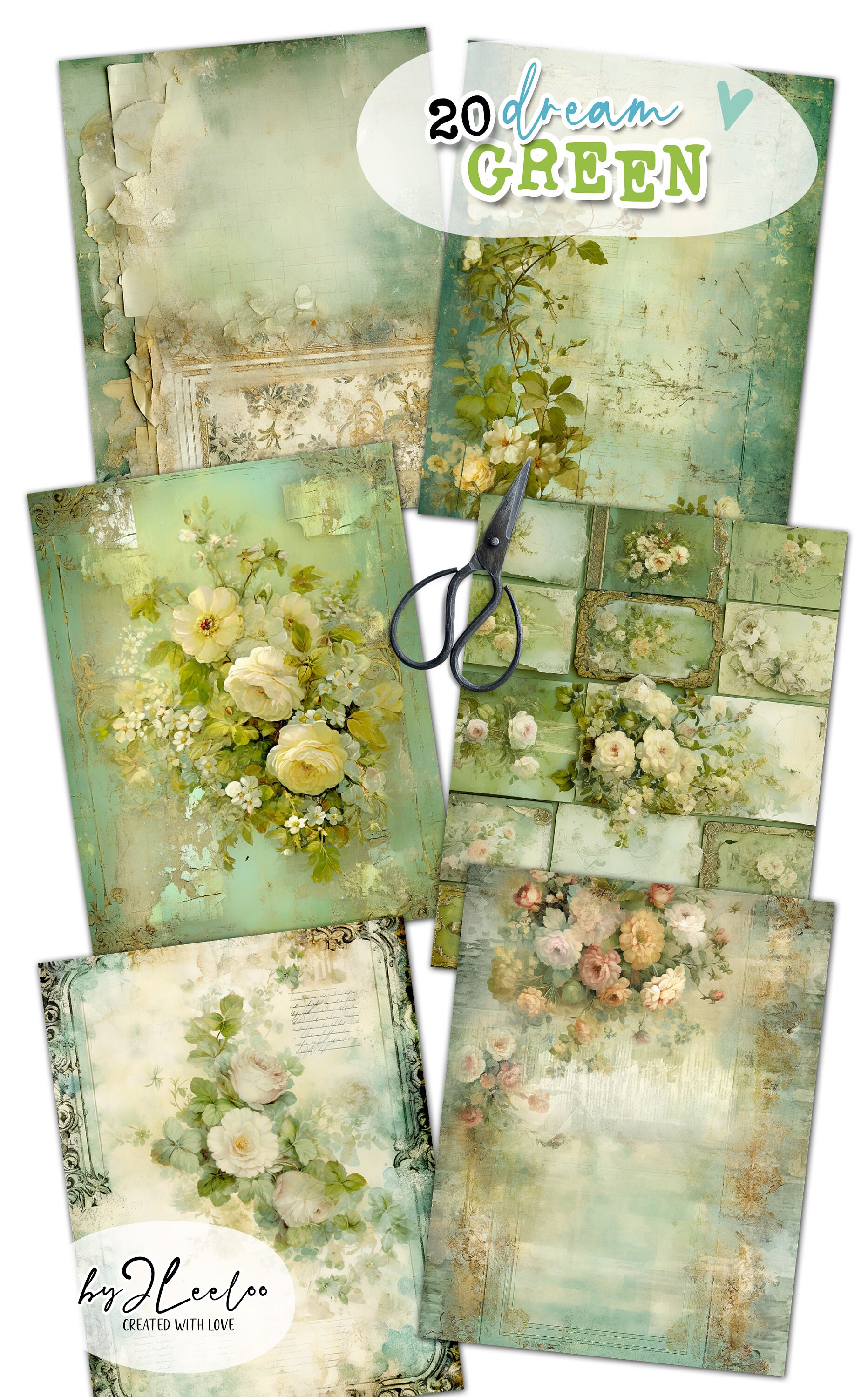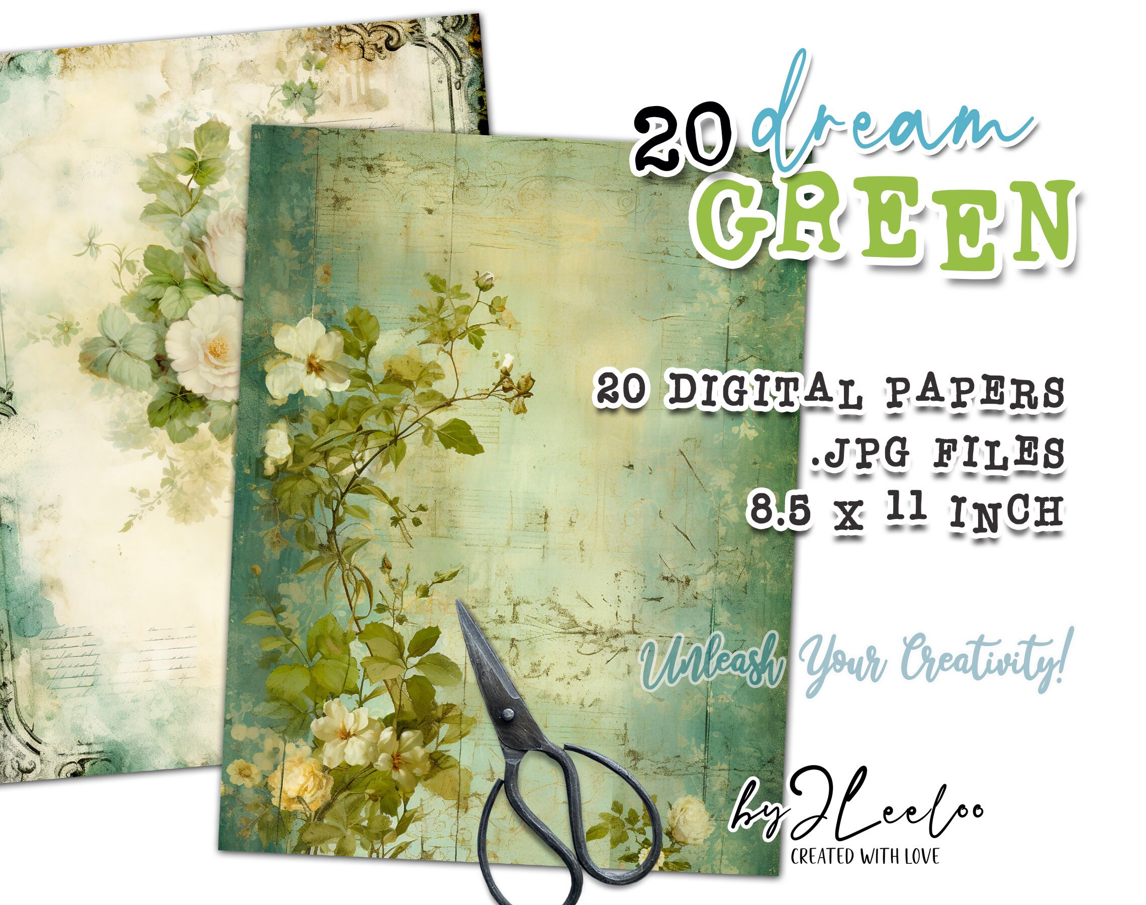 DREAM GREEN vintage shabby chic tattered papers | Romantic Junk Journal soft pages background | card making digital ephemera | pp640