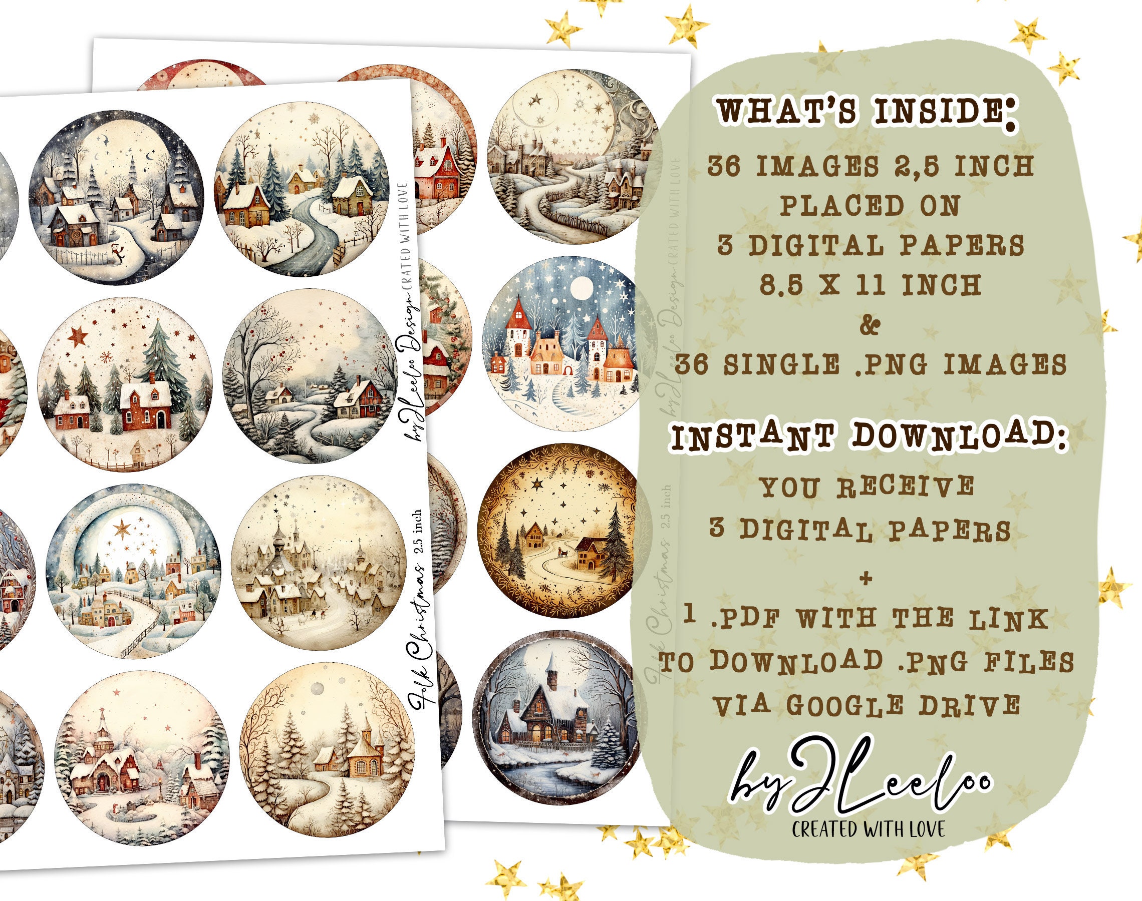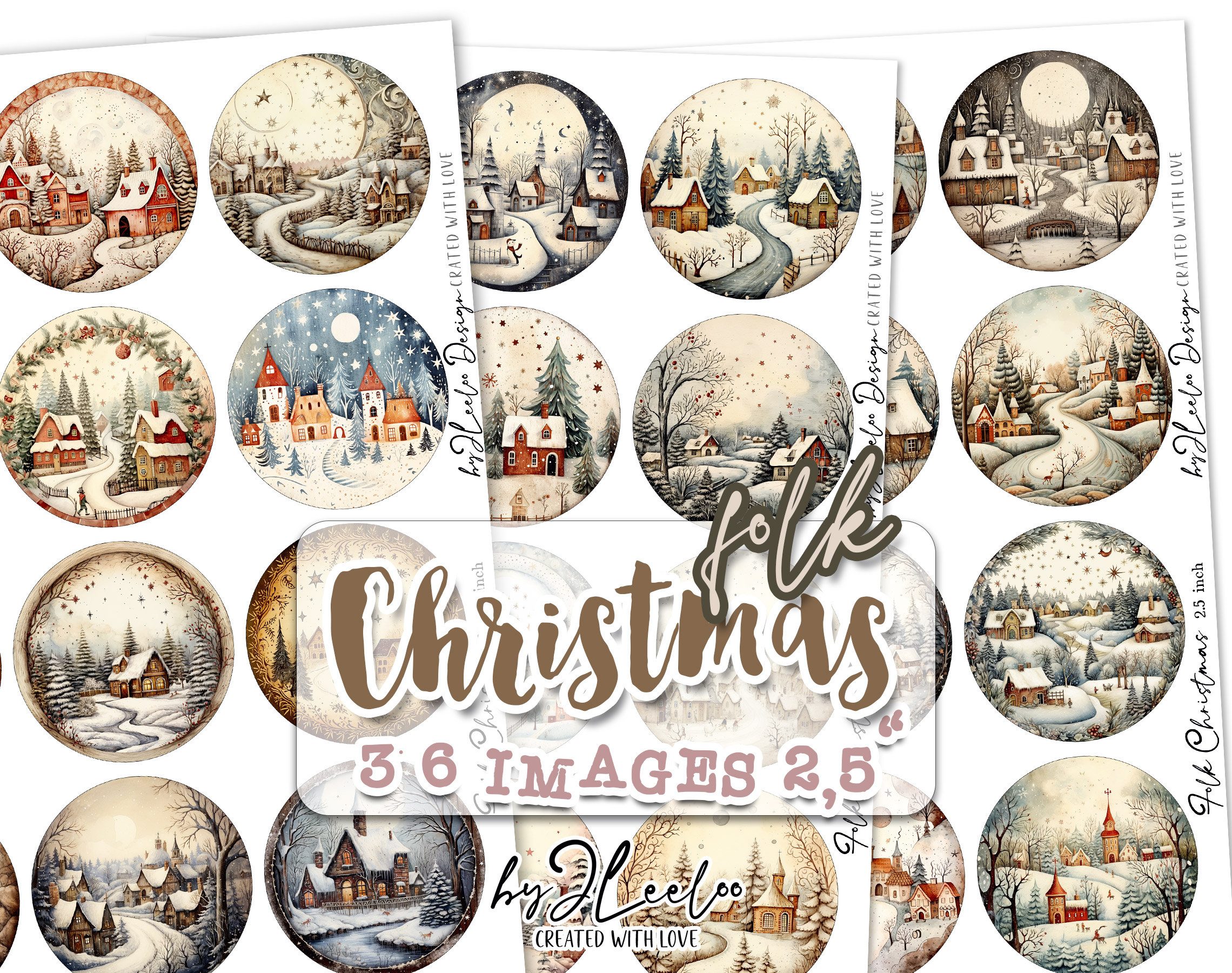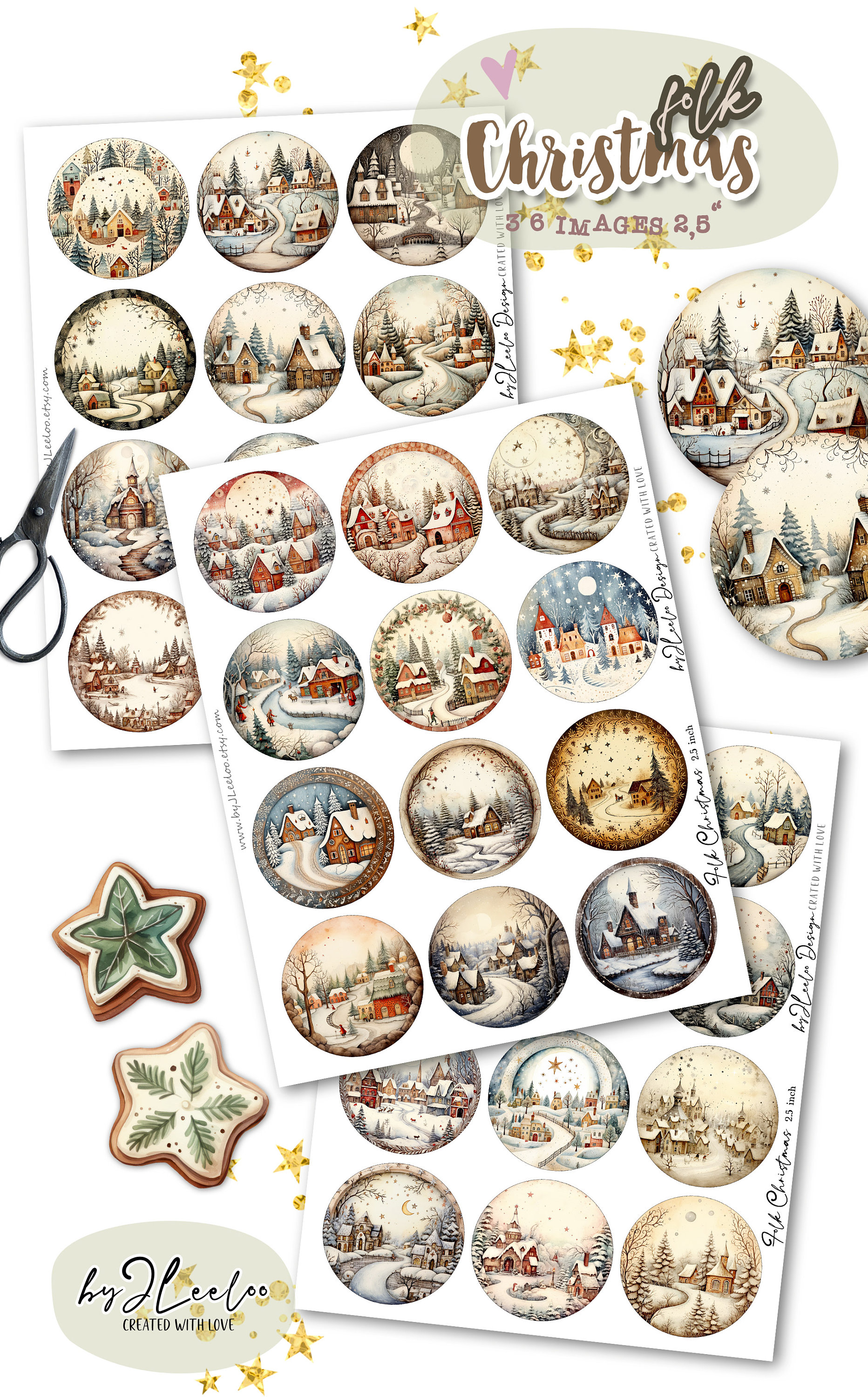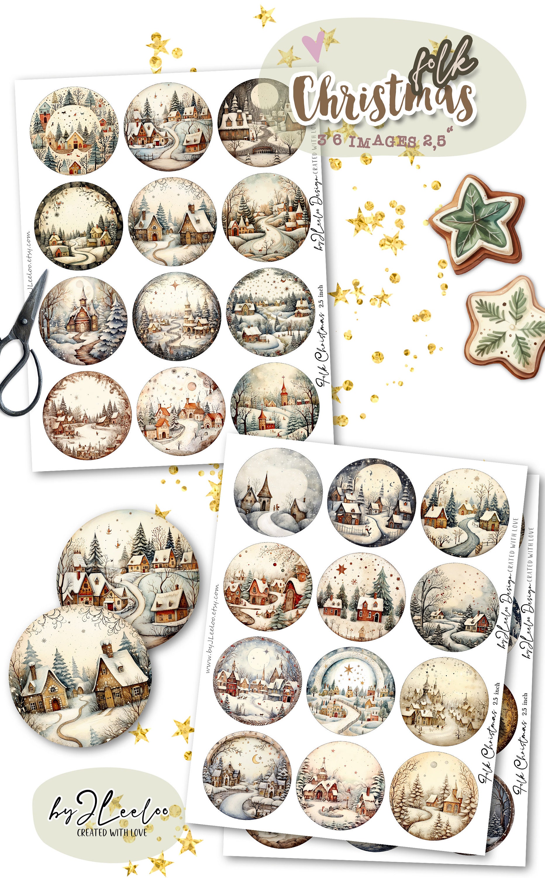 FOLK CHRISTMAS 2.5 inch circle | holidays drawing craft supplies | mirrors cupcake topper scrapbook magnets | Junk journal ephemera | tn673