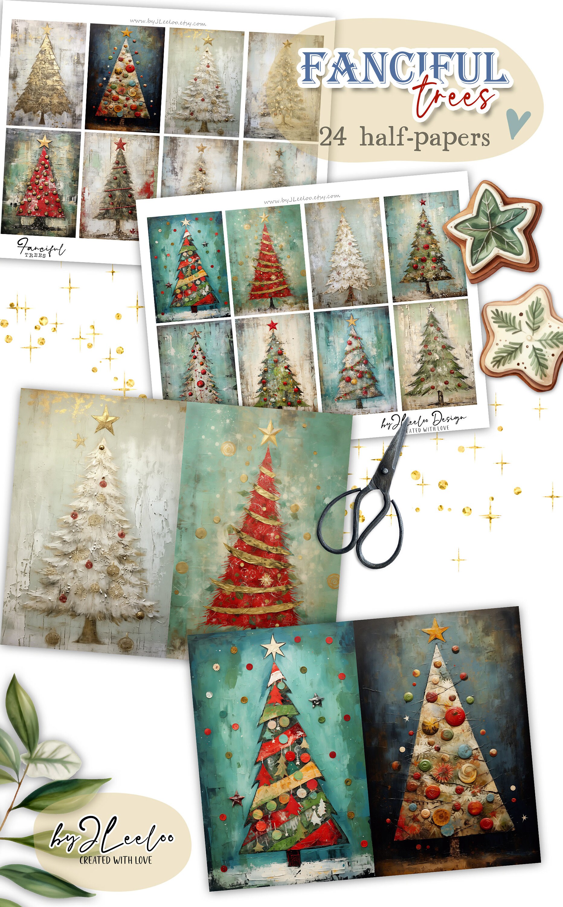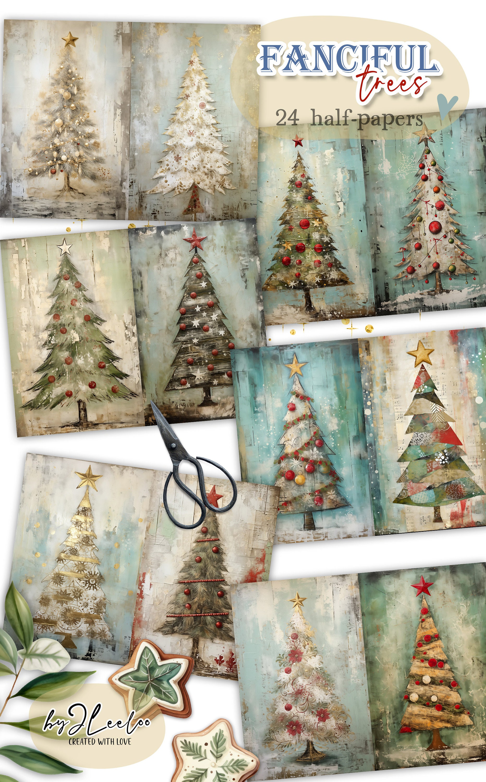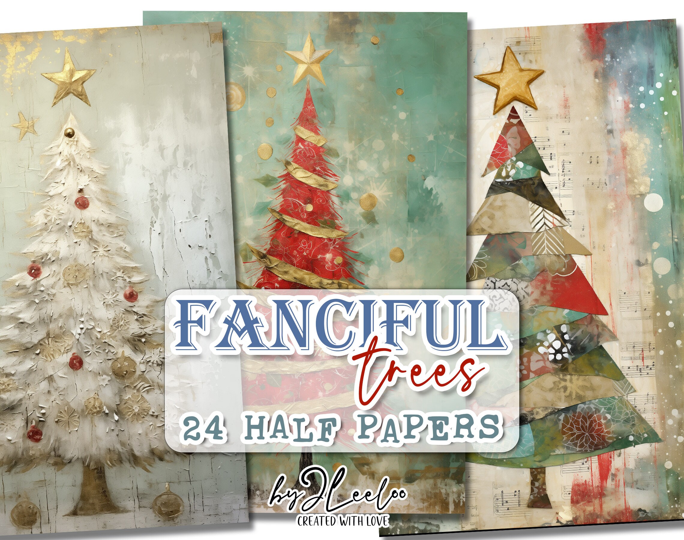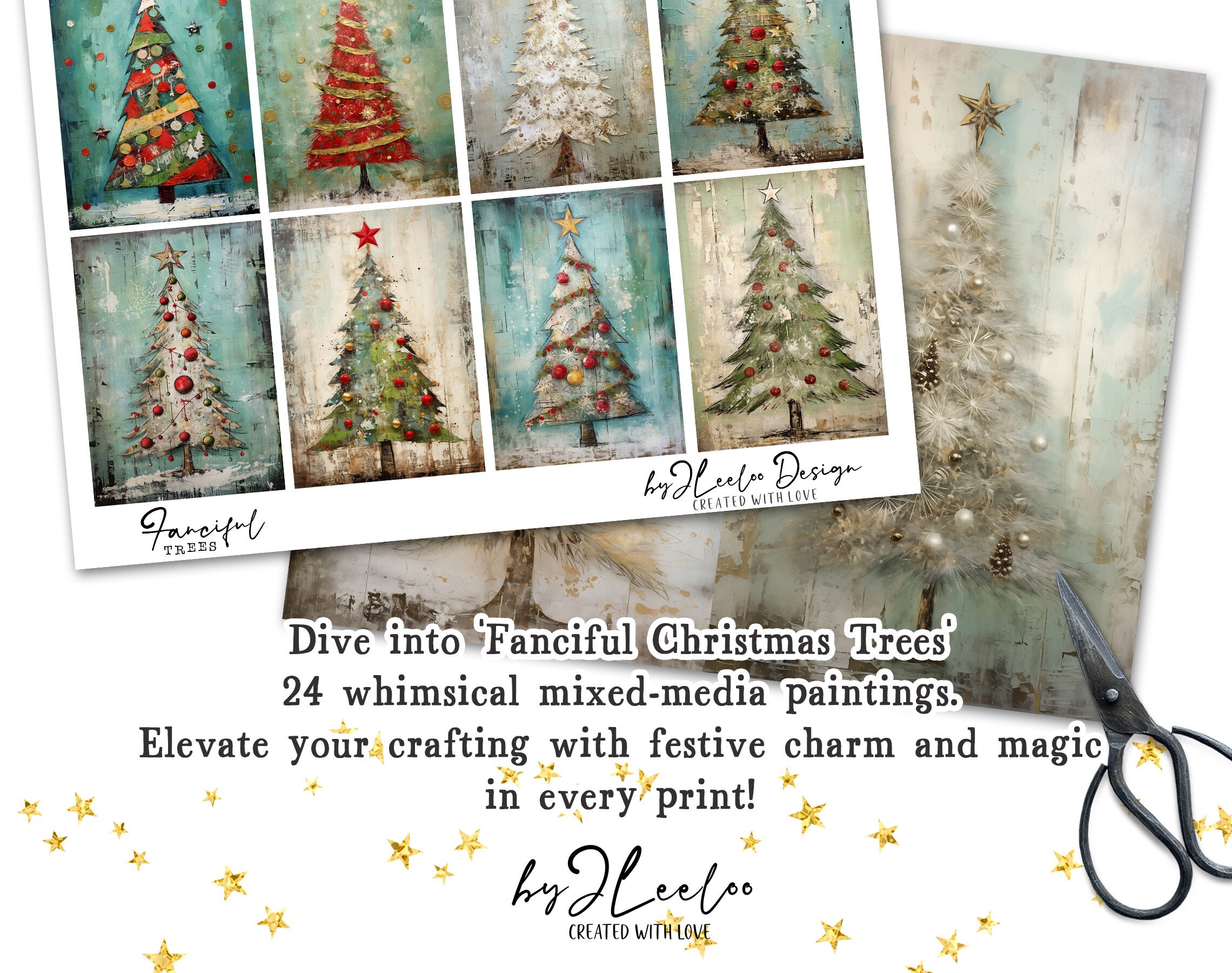 ๐Immerse yourself in the whimsical world of 'Quirky Christmas Trees'! Explore the magic of our printable sheets featuring 24 enchanting mixed-media texture paintings of Christmas trees. With fabric textures, distressed elements, gold details, and lace accents in a shabby chic style, each image is a unique masterpiece.