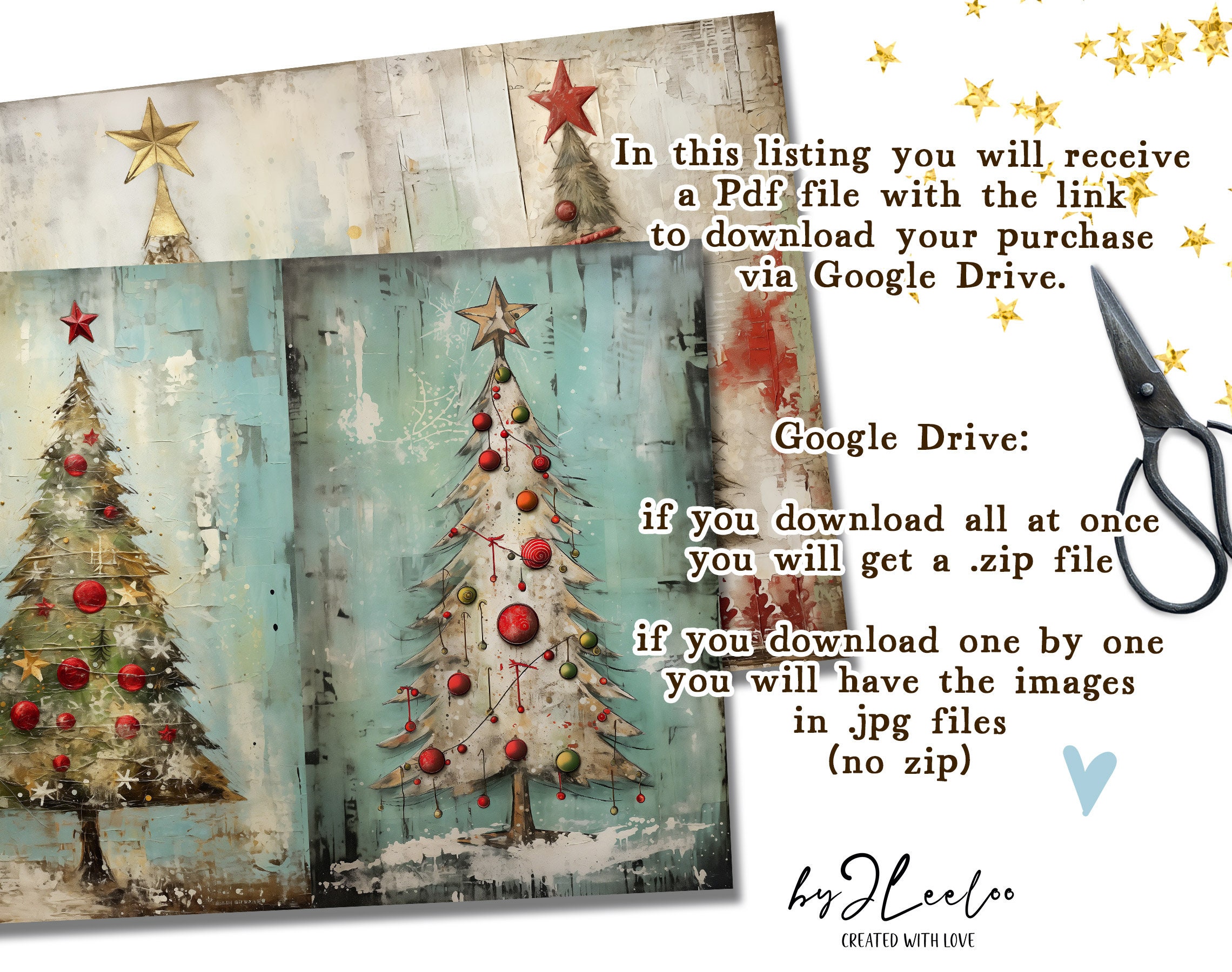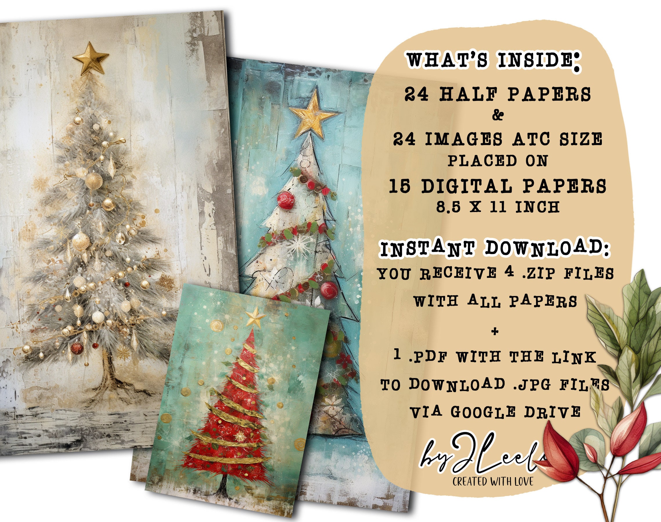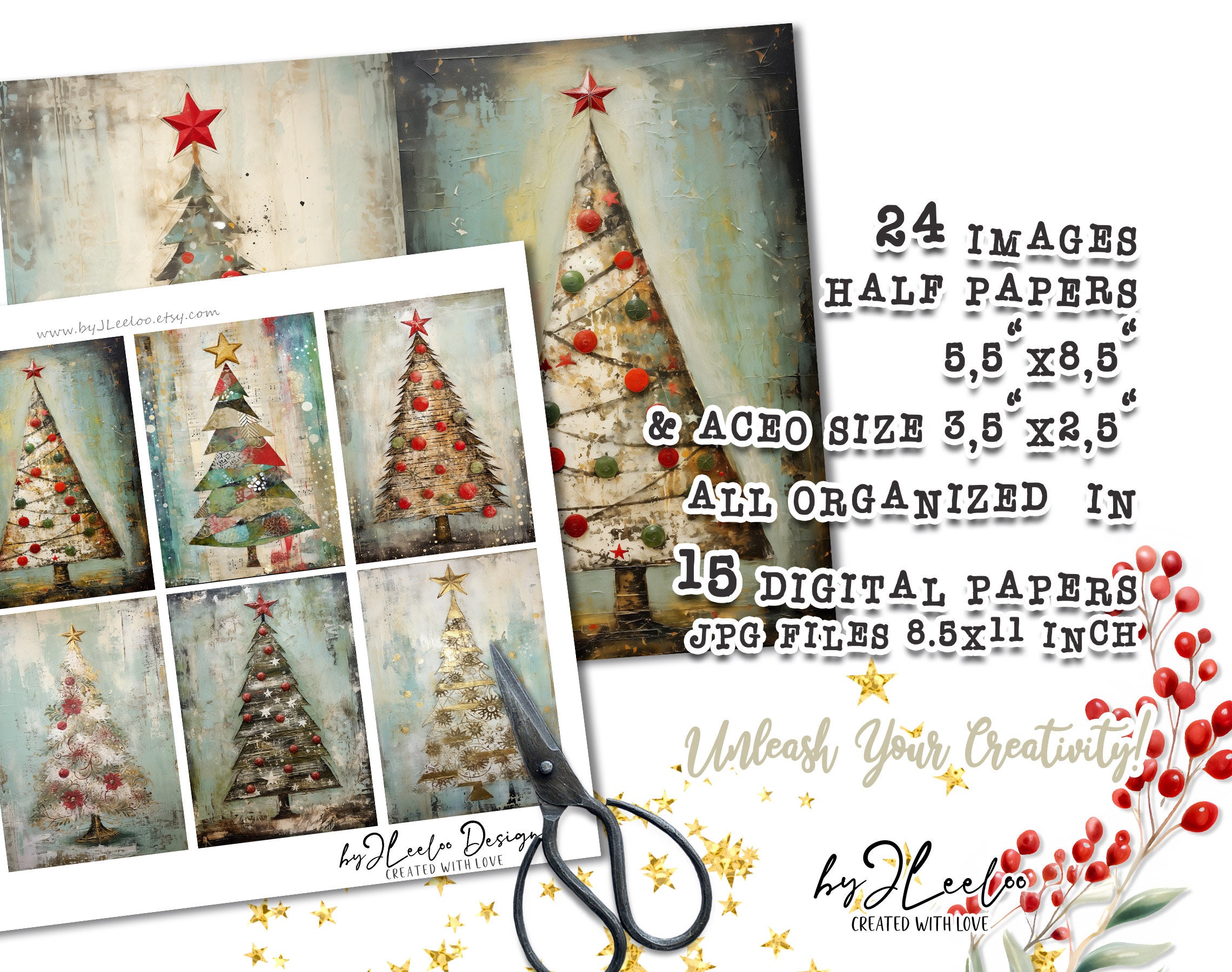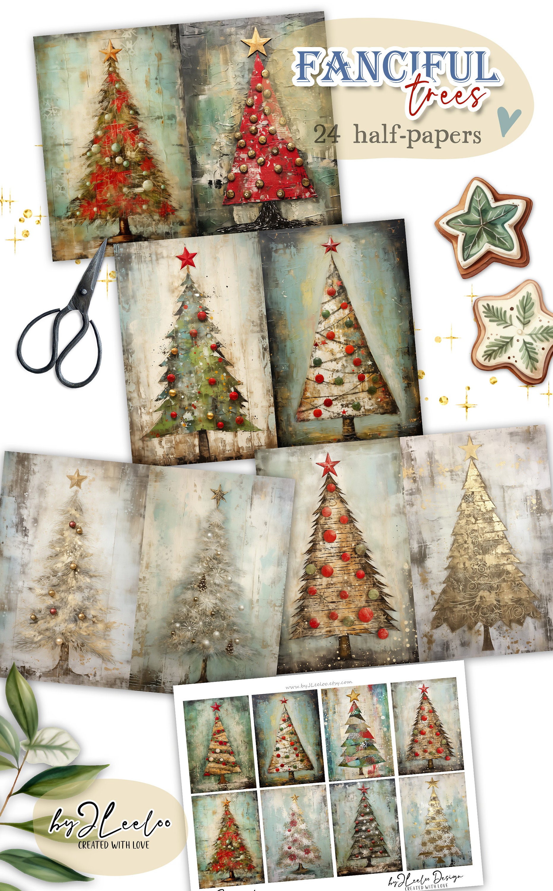 ๐Immerse yourself in the whimsical world of 'Quirky Christmas Trees'! Explore the magic of our printable sheets featuring 24 enchanting mixed-media texture paintings of Christmas trees. With fabric textures, distressed elements, gold details, and lace accents in a shabby chic style, each image is a unique masterpiece.