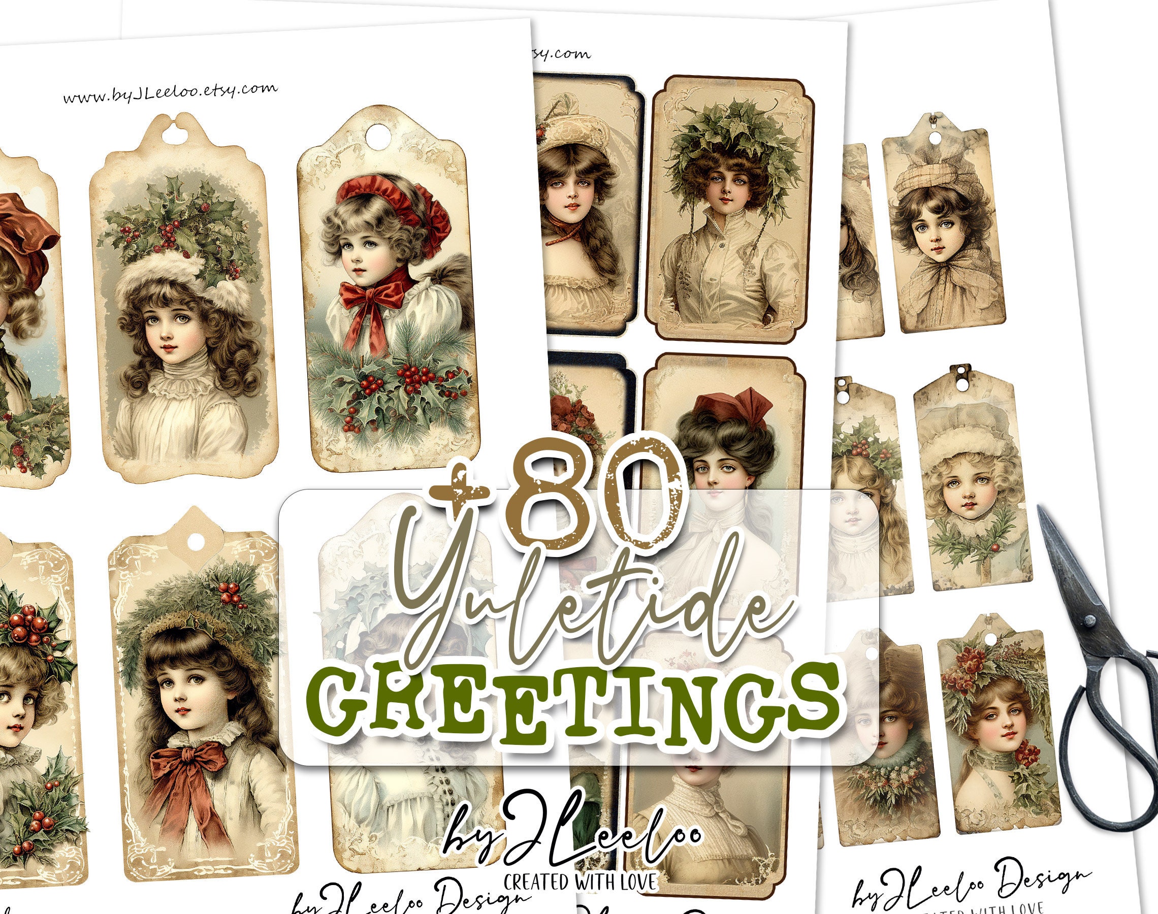 YULETIDE GREETINGS labels printable Christmas supplies | tags vintage ephemera junk journal | Holidays images digital collage sheet | tl266