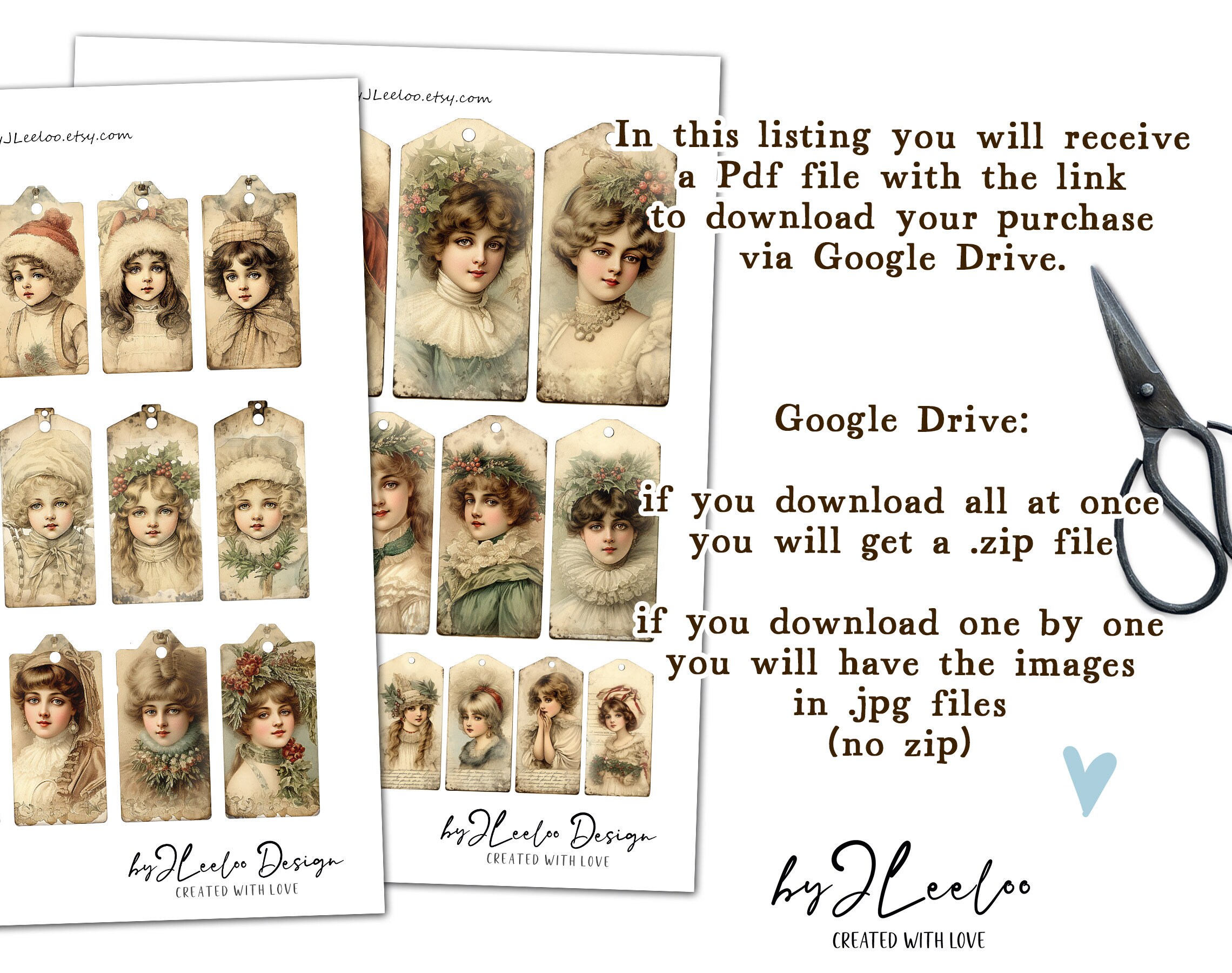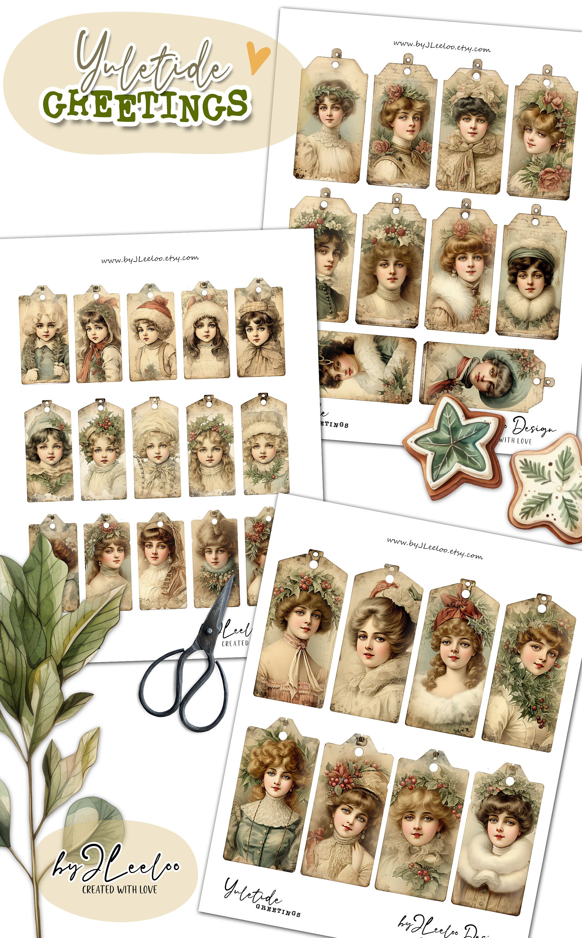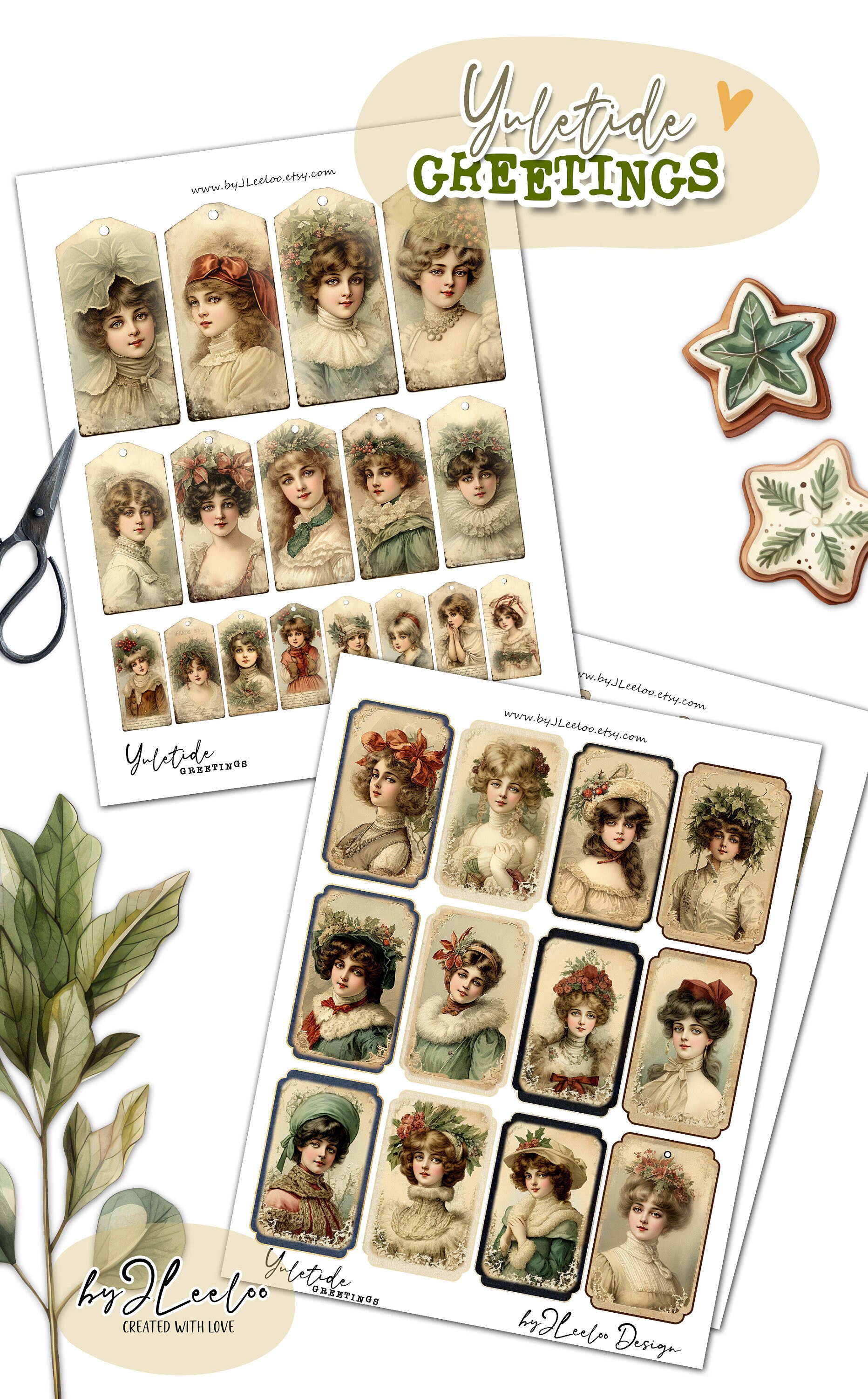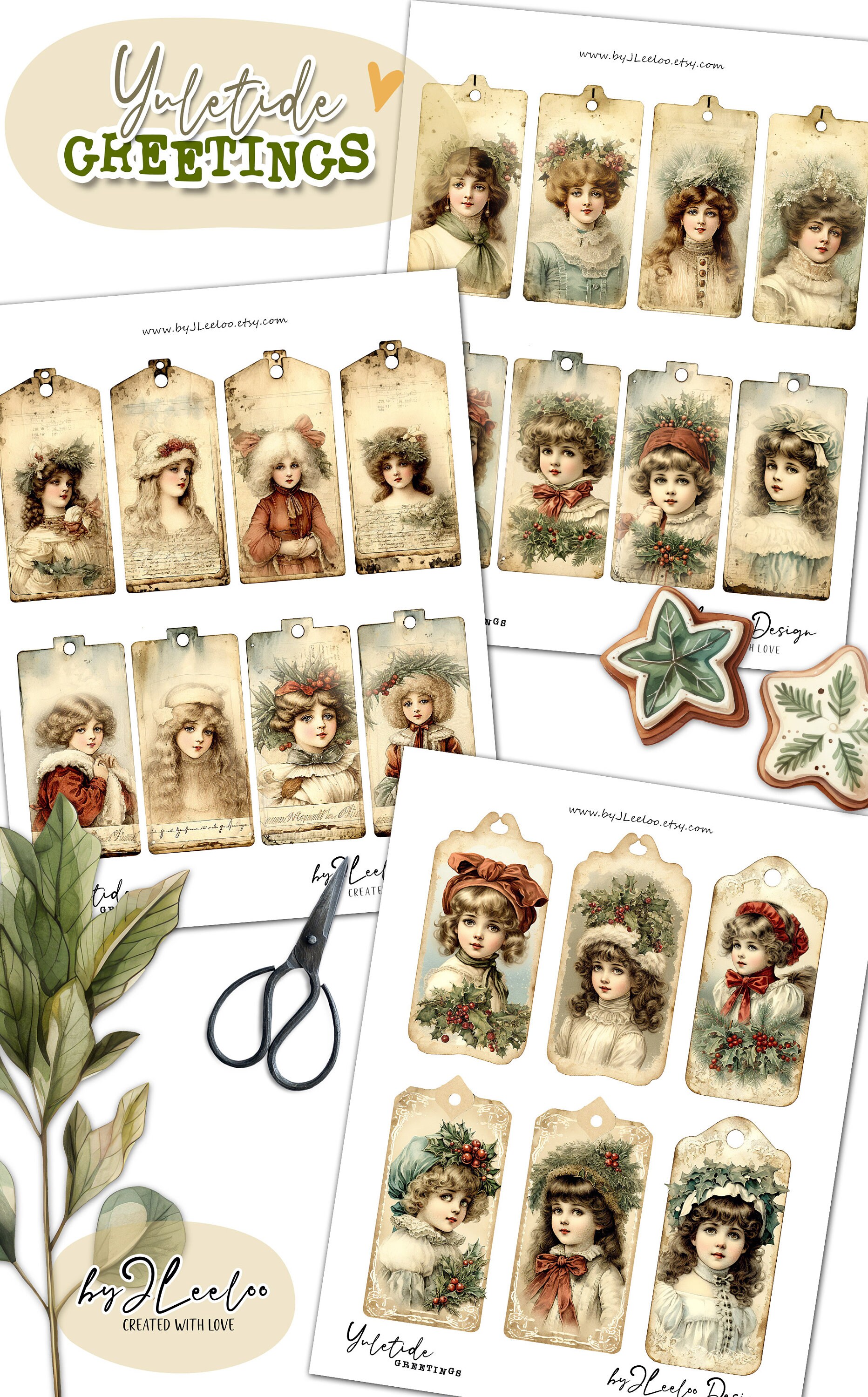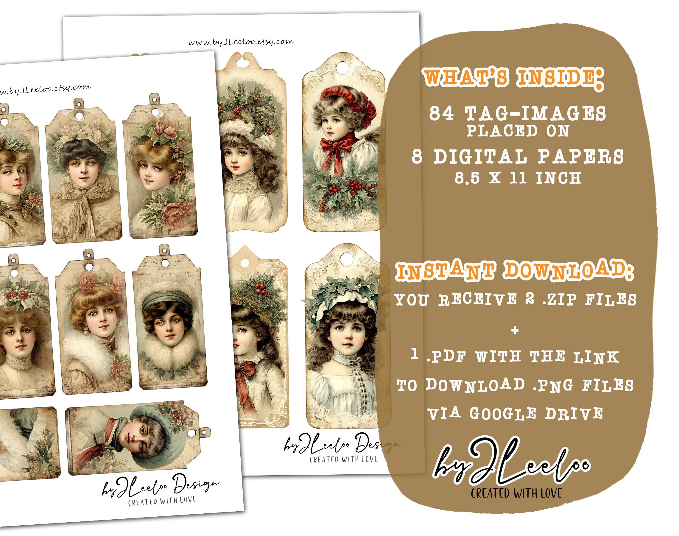 Dive into the charm of a bygone era with our exquisite collection of over 80 vintage tags featuring women and children in early 1900s Christmas style. These delightful images are meticulously curated and beautifully presented across 8 digital sheets sized at 8.5 x 11 inches. Explore the nostalgic world of yesteryears through our unique designs, encapsulating the essence of vintage Christmas.