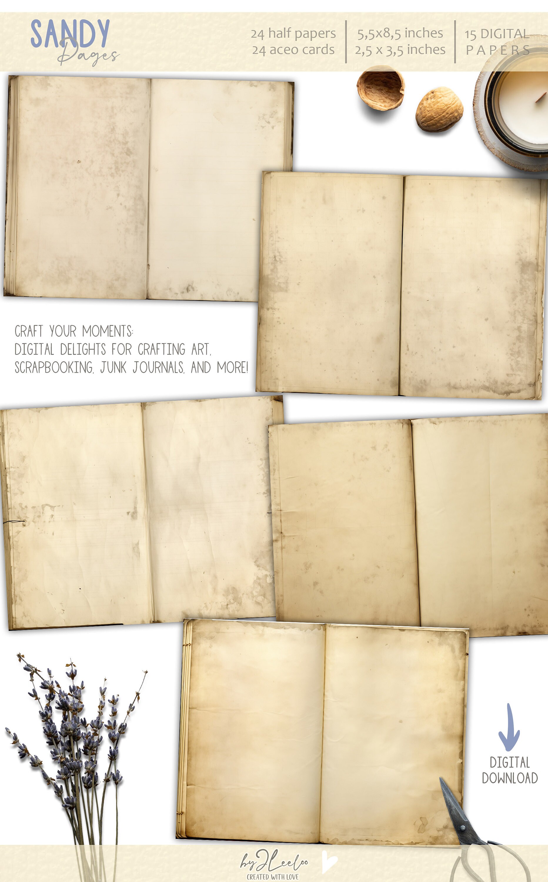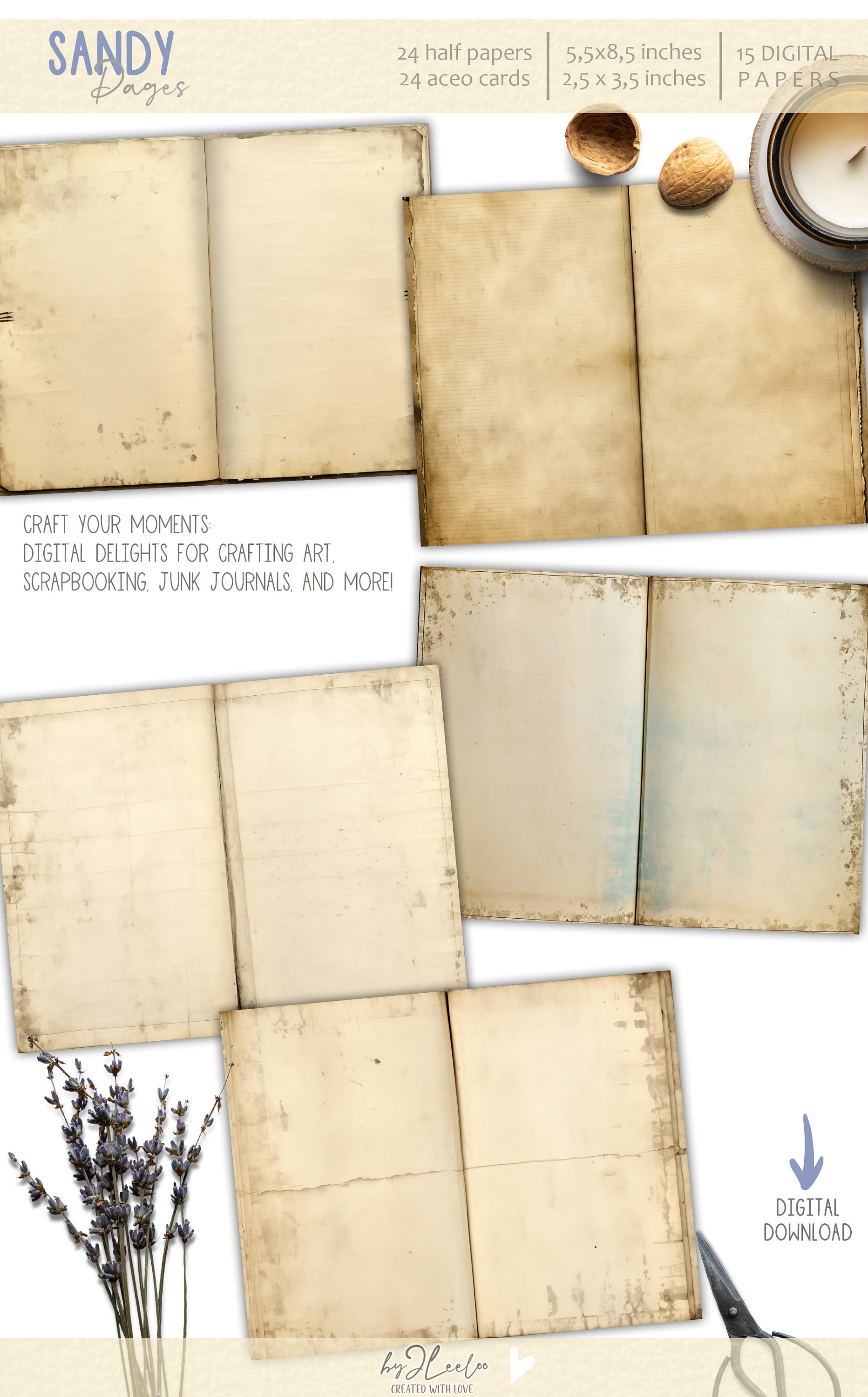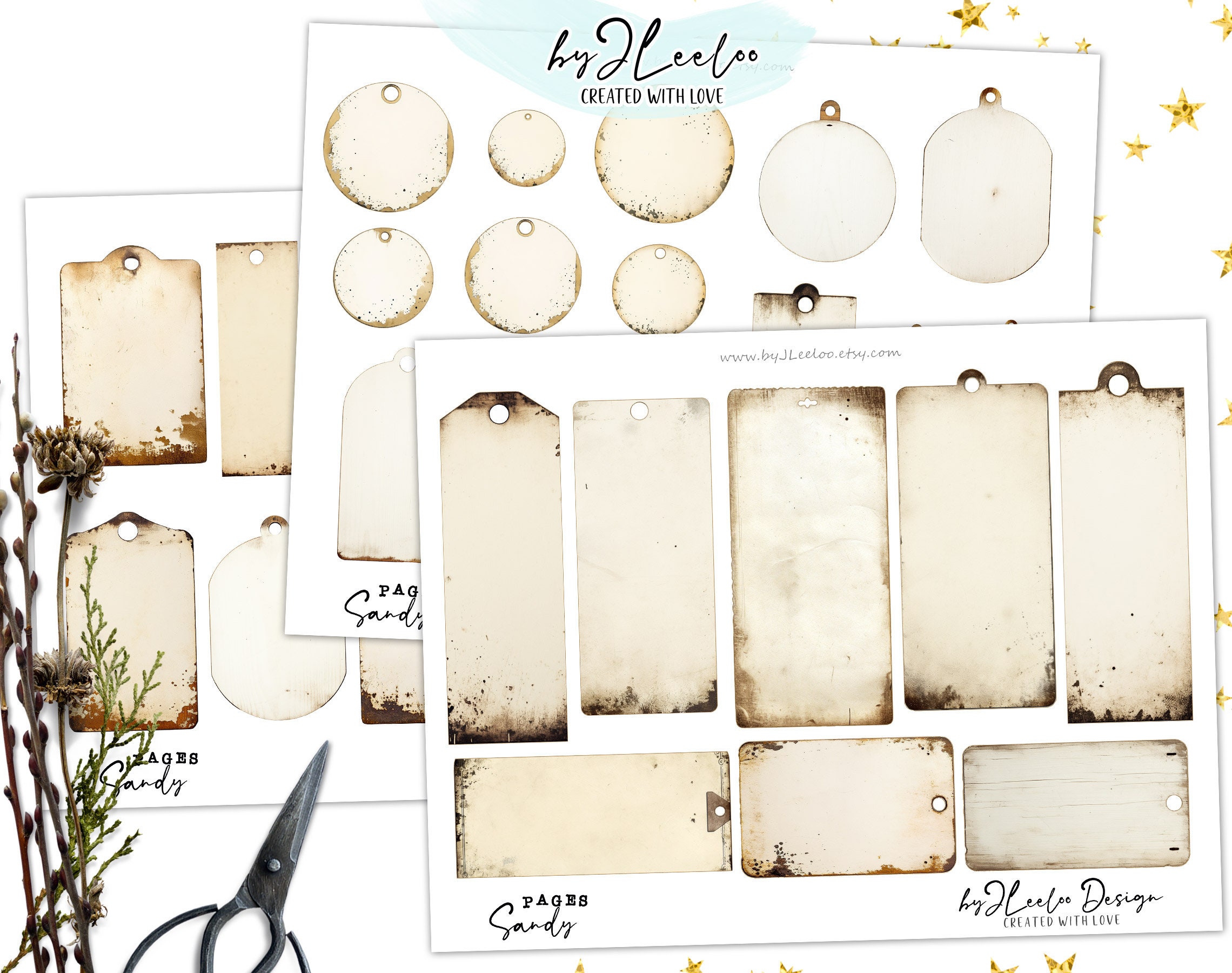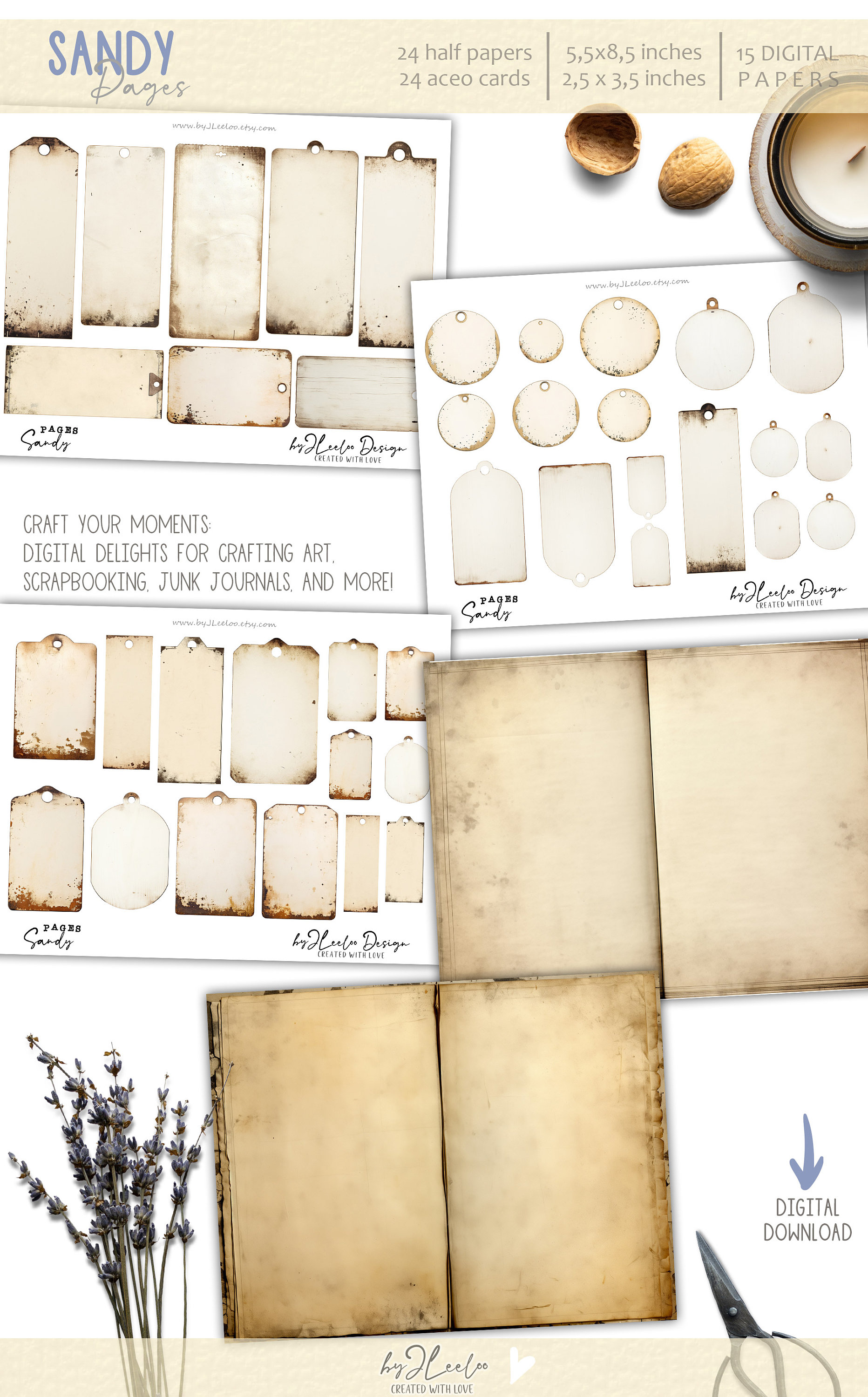SANDY PAGES junk journal printable | blank half pages and tags Mixed Media supplies | Distressed vintage paper card making collage diary | pp675