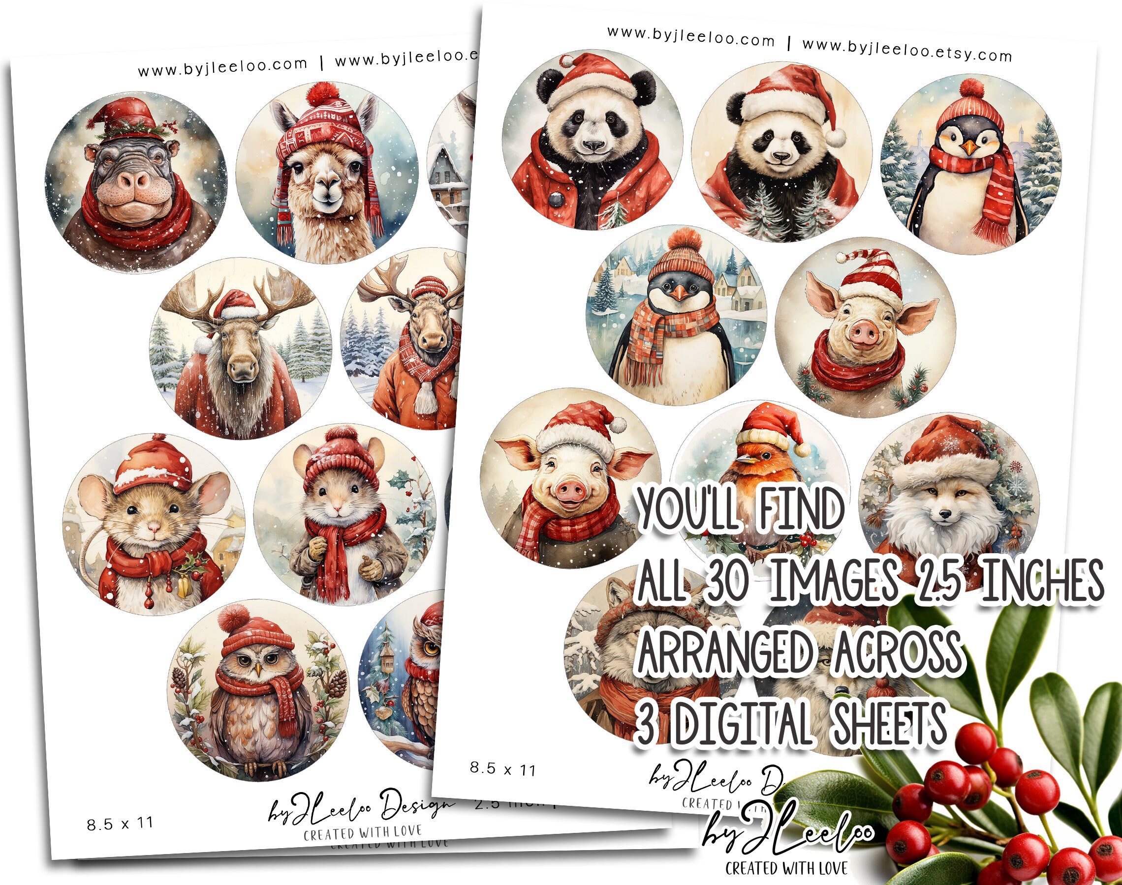 Charming Holiday Treasures: Round illustrations showcasing delightful animals adorned in red Santa Claus hats and scarves, set in a Christmas snowscape radiating a festive atmosphere reminiscent the cottagepunk!